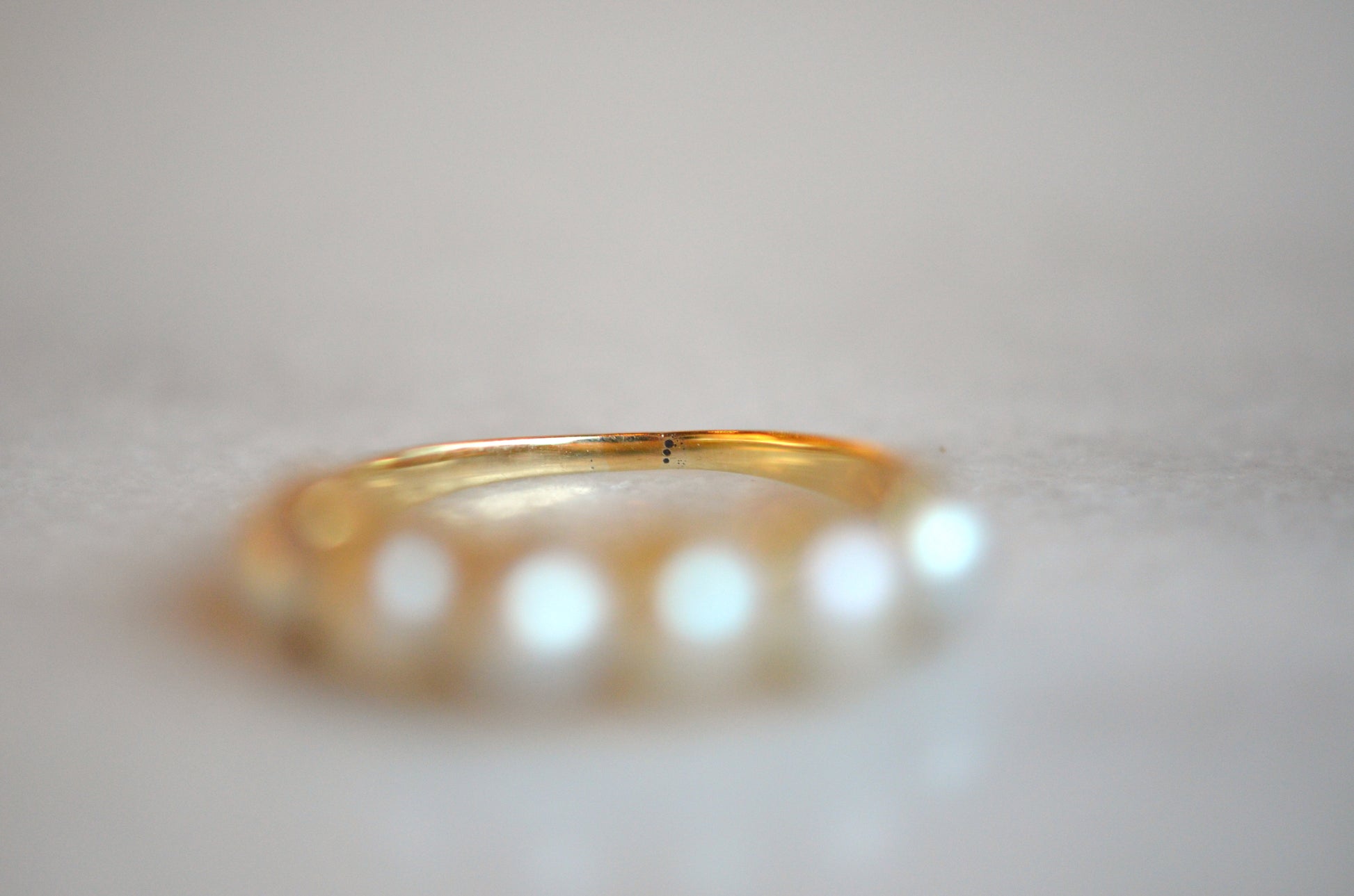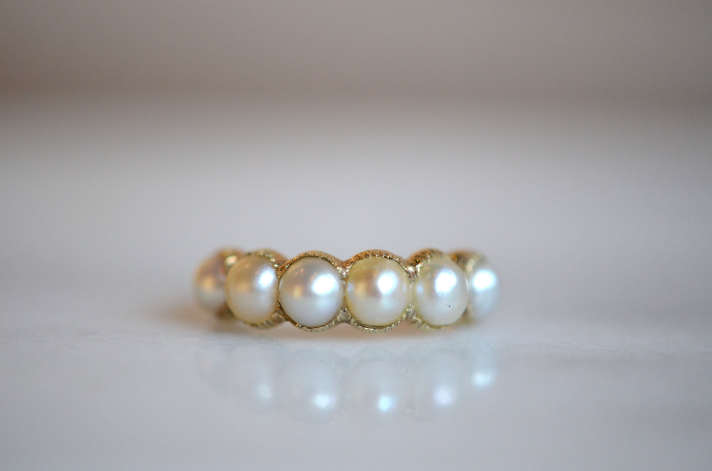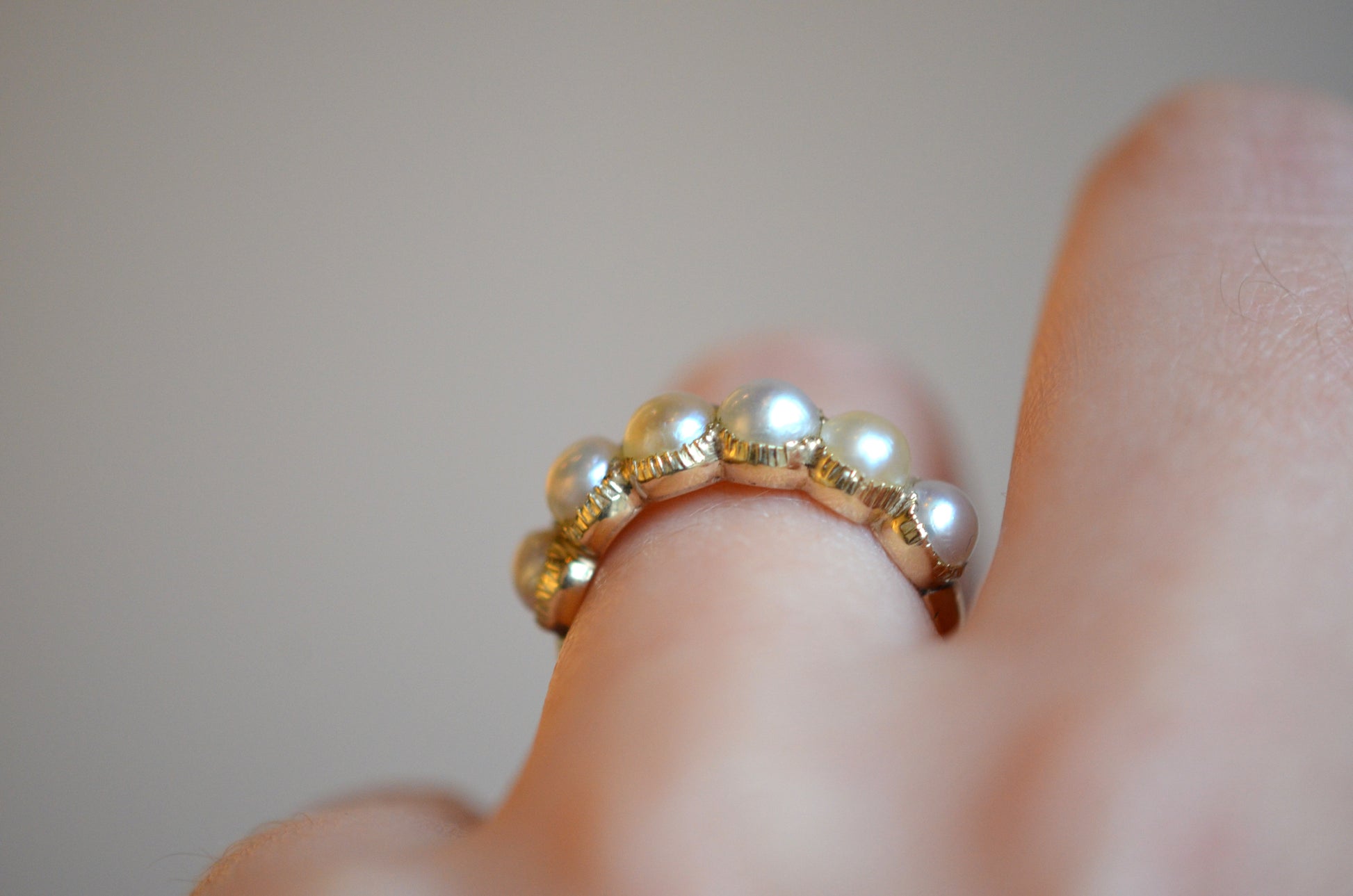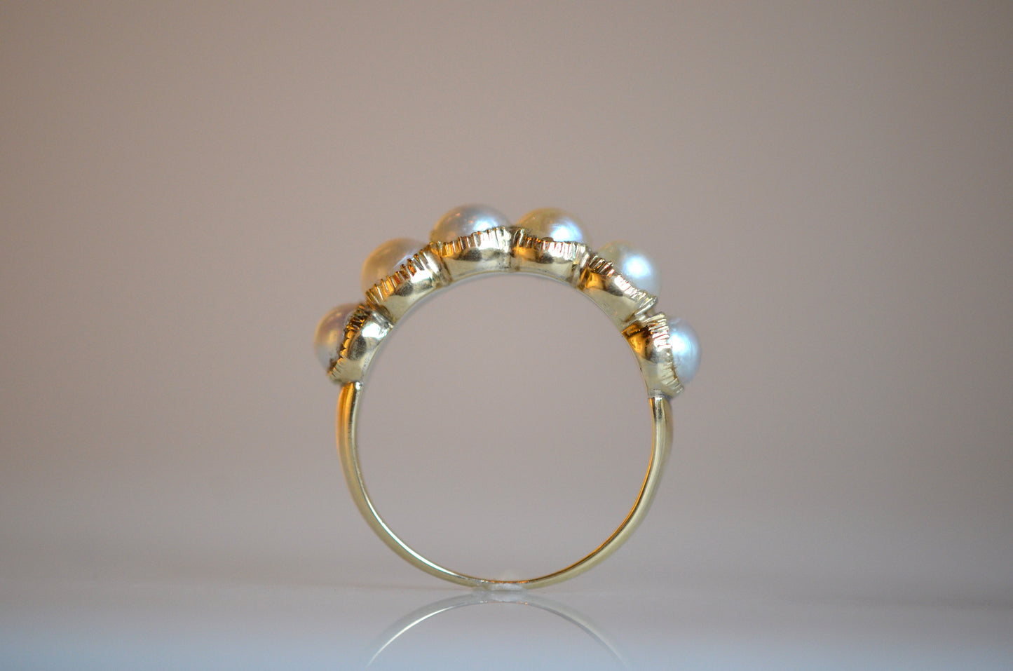 We absolutely adore this gorgeous and elegant ring. Six luminous pearls of a generous size are set in crimped demi-bezel settings of soft yellow gold, on a slim and smooth band. The finger coverage is just right, spanning the entire width right up until where your next finger can snuggle up closely and comfortably.