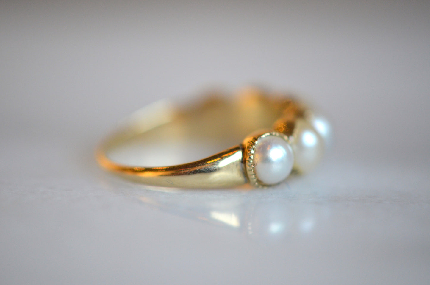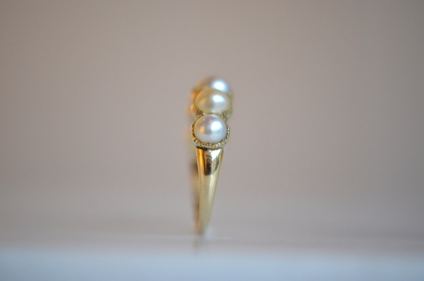 • Rise off finger is 4mm, width through pearls is 5.7mm, span of pearls is 19mm straight across; band is 3.8mm wide and 2.4mm thick at shoulders and 1mm wide and 0.6mm thick at back