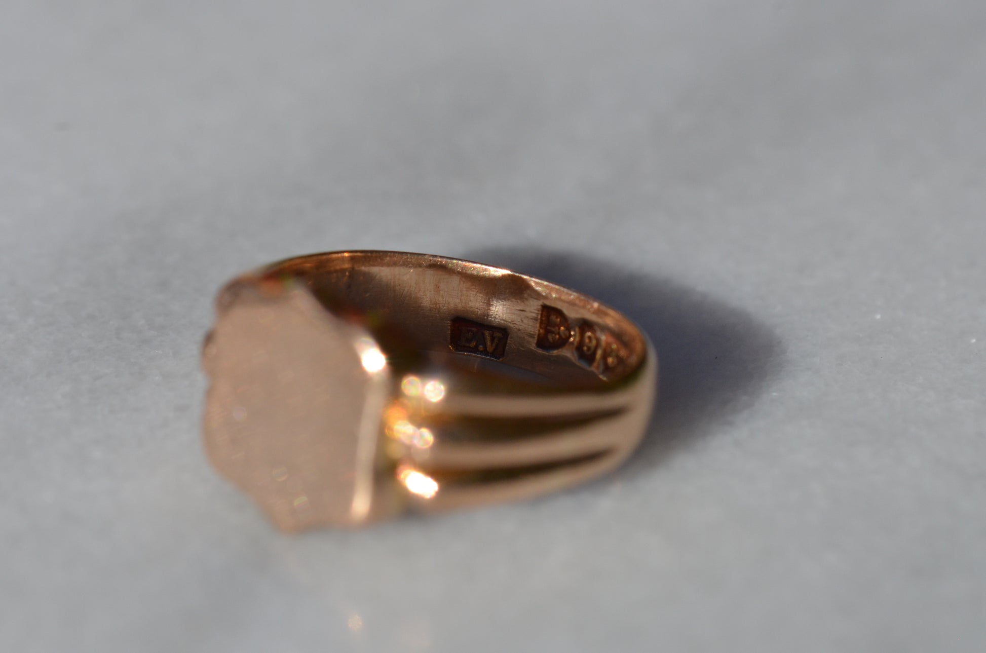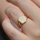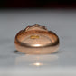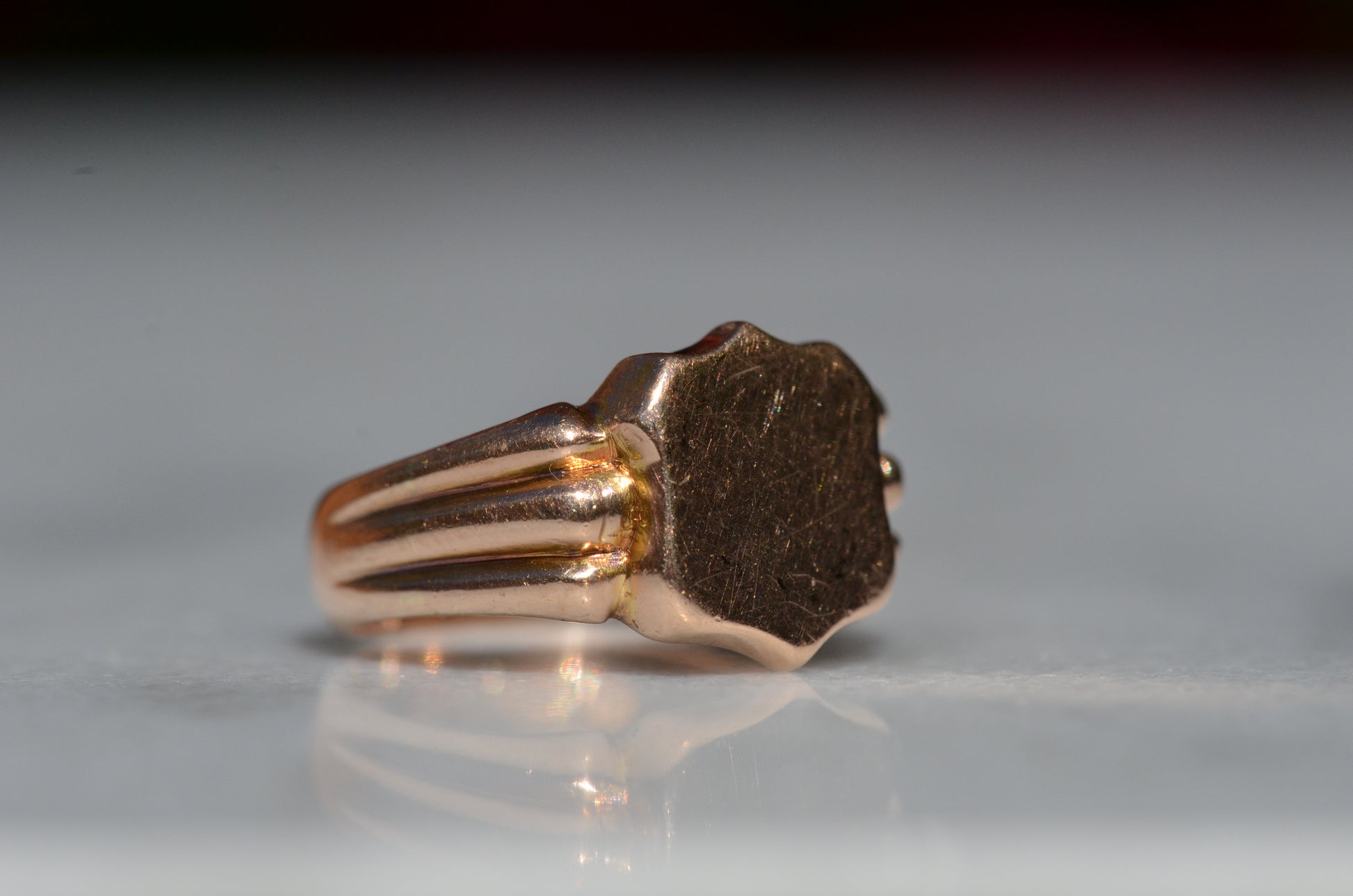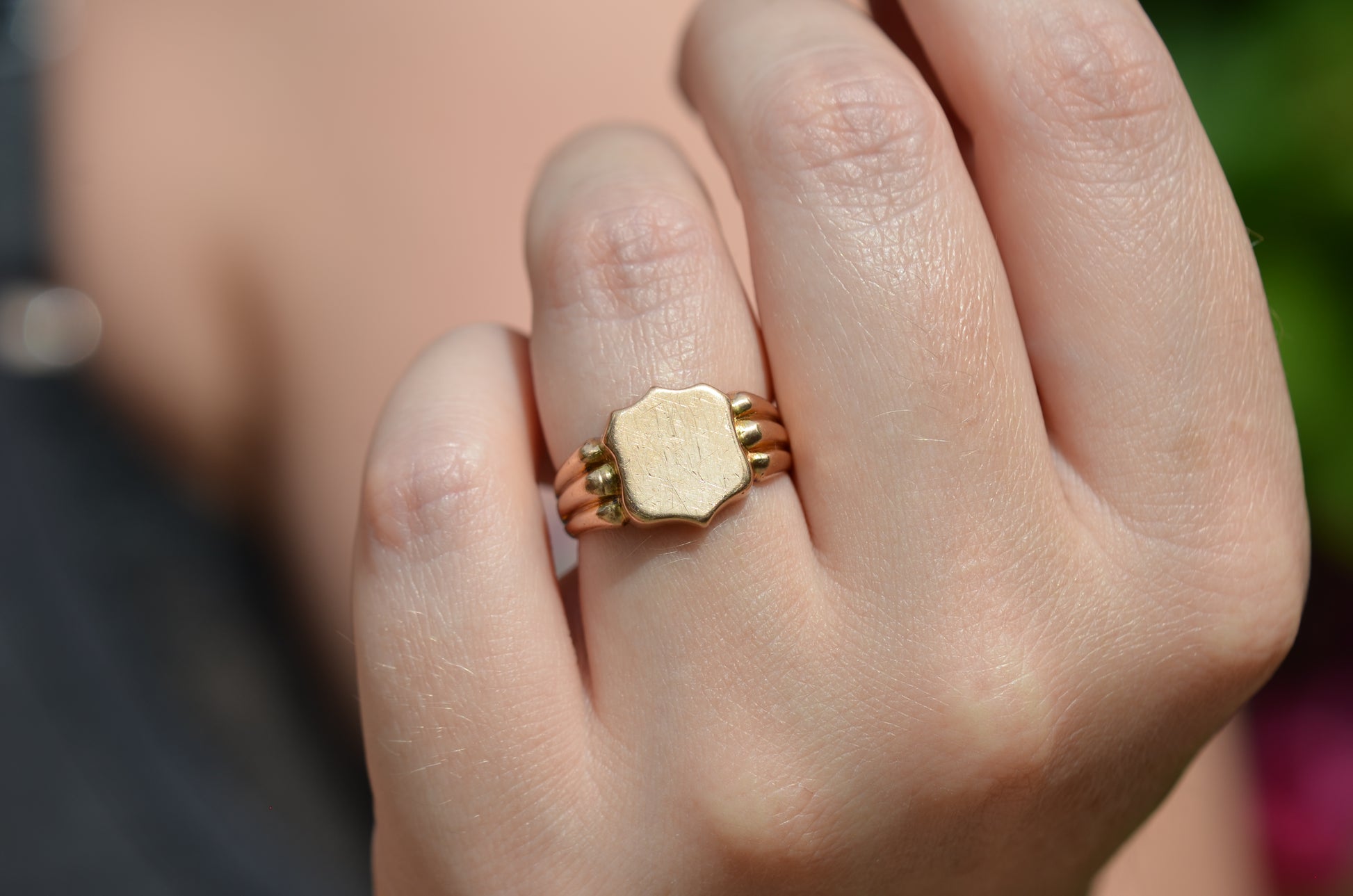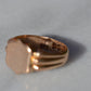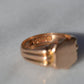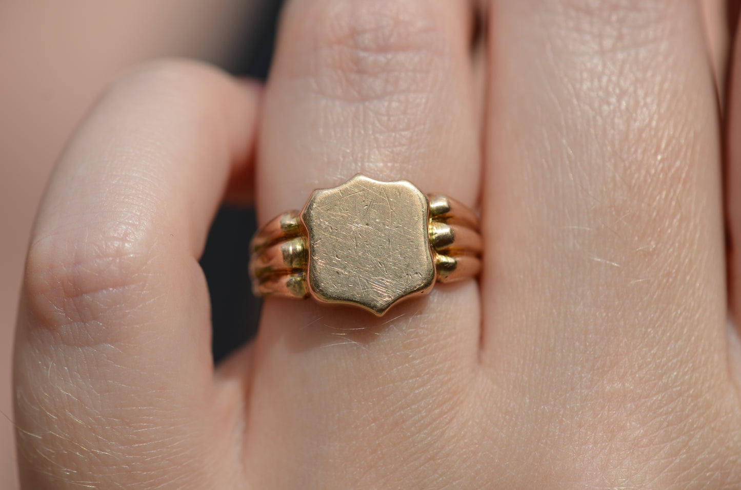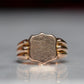 A gorgeous turn of the century signet in a style that feels timeless despite nods to the era, with lovely flared shoulders and a smooth blank slate of a face. Often our blank signets come to us either pristine (and younger) or deeply worn with the faintest trace of past engraving - this wonderful piece is a sort of middle ground: while worn and loved with a soft patina that speaks to its age, it maintains a full figure without the thinning or other body wear so common in a ring of over 120 years.