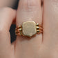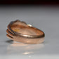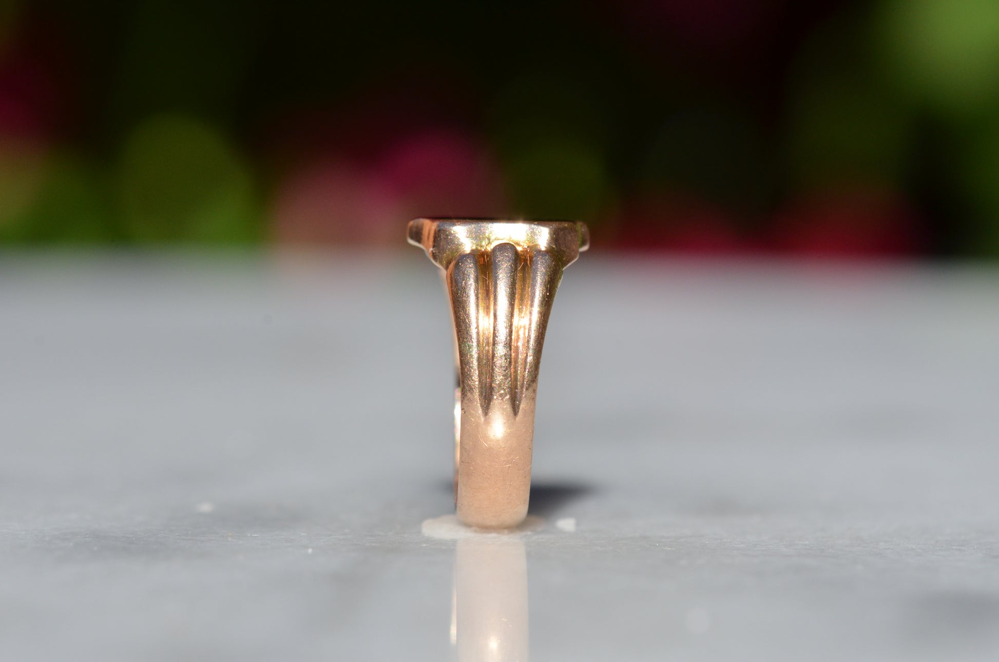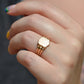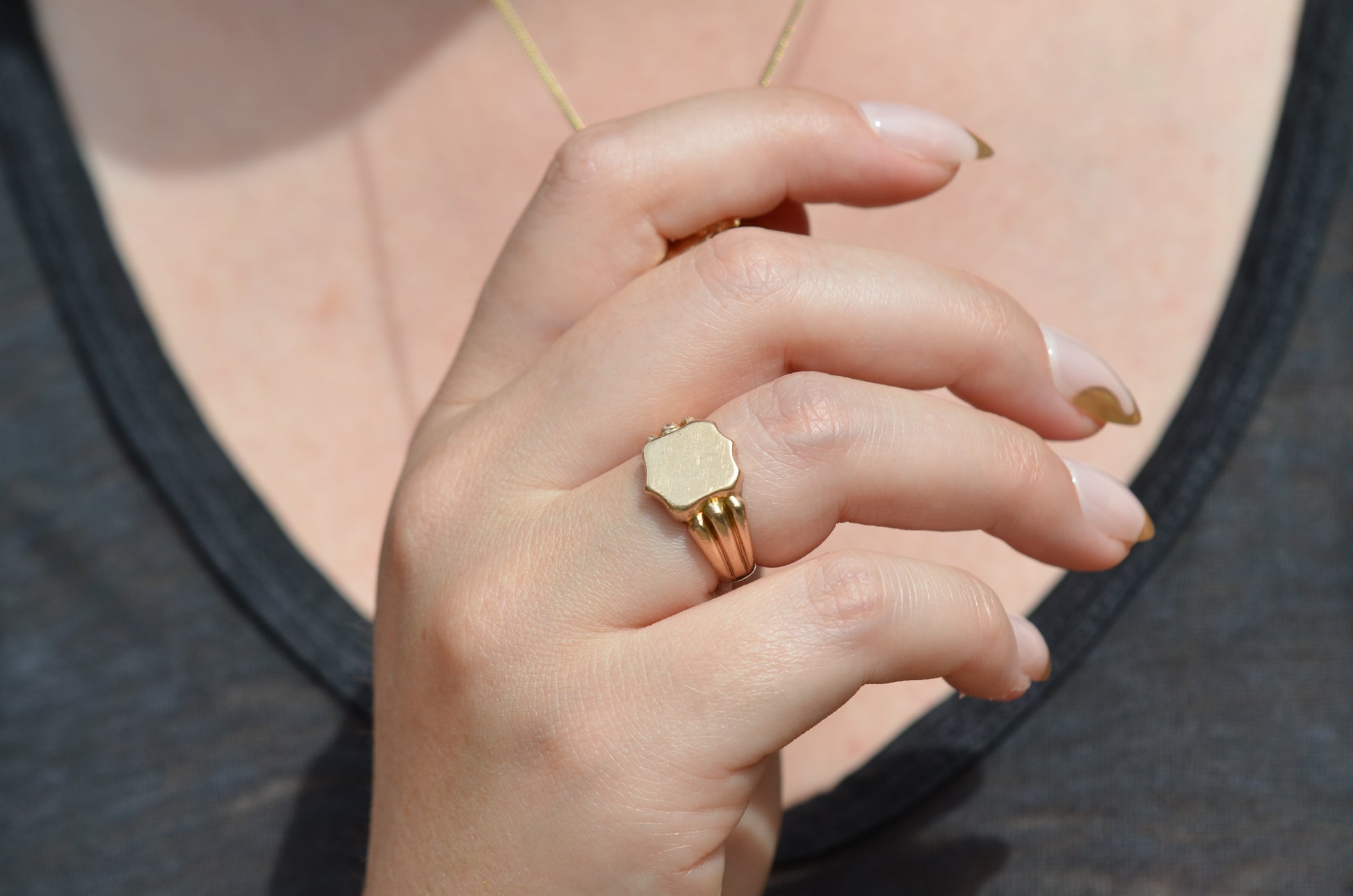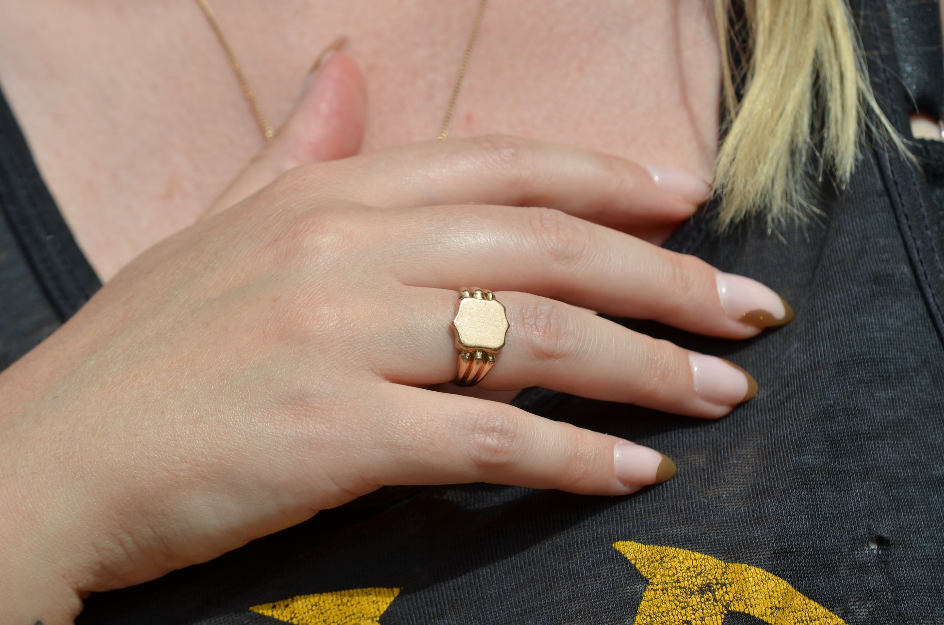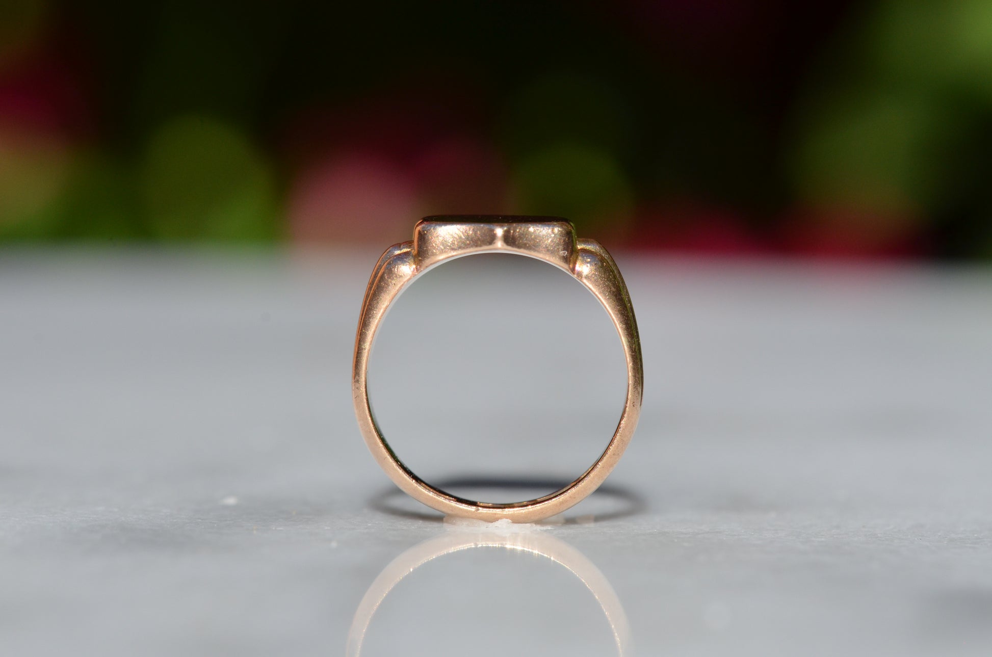A gorgeous turn of the century signet in a style that feels timeless despite nods to the era, with lovely flared shoulders and a smooth blank slate of a face. Often our blank signets come to us either pristine (and younger) or deeply worn with the faintest trace of past engraving - this wonderful piece is a sort of middle ground: while worn and loved with a soft patina that speaks to its age, it maintains a full figure without the thinning or other body wear so common in a ring of over 120 years.