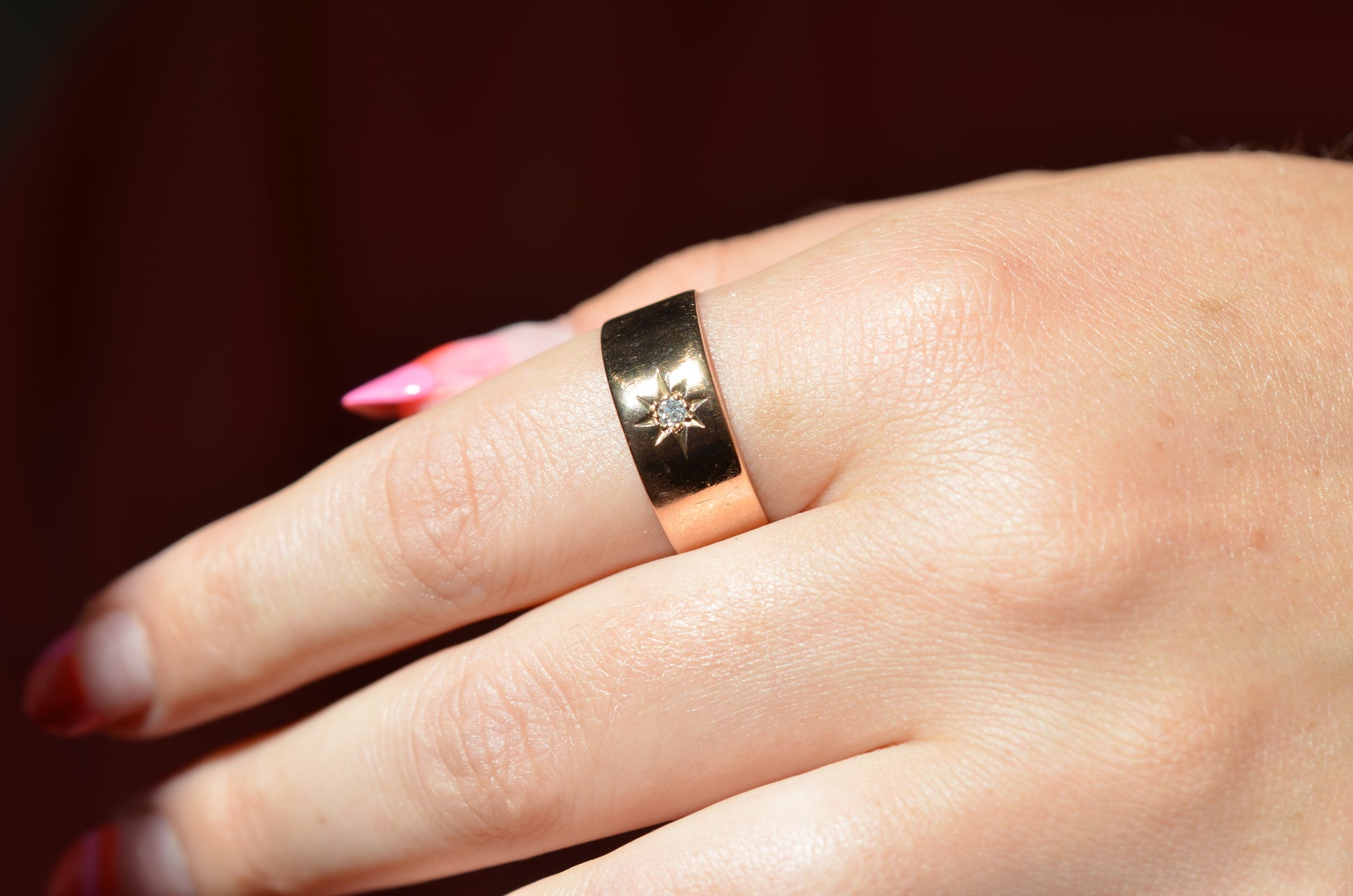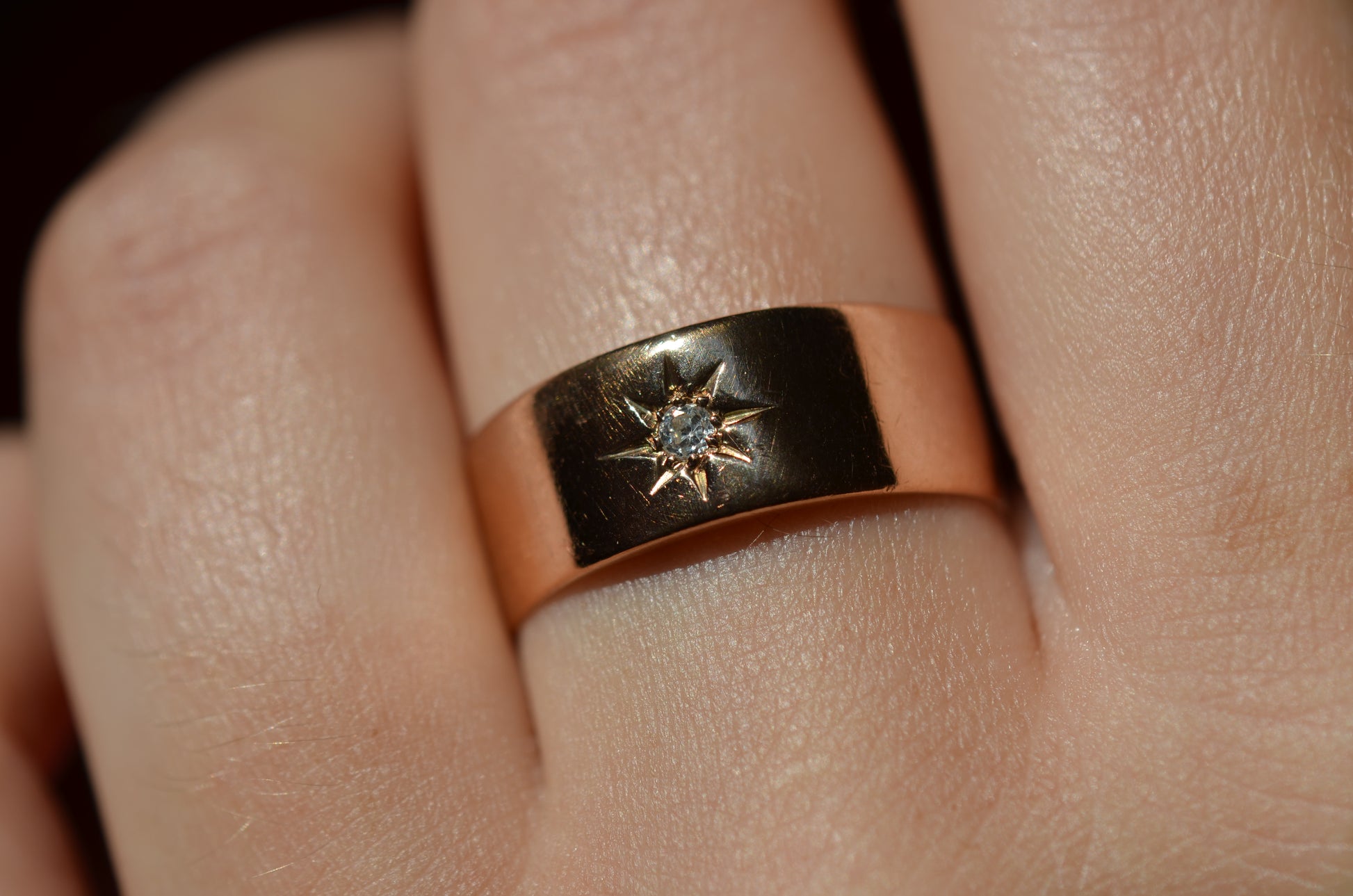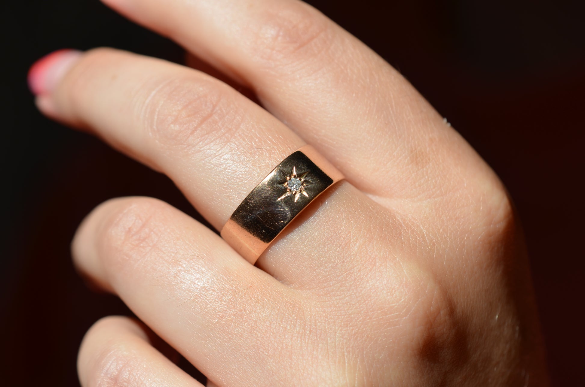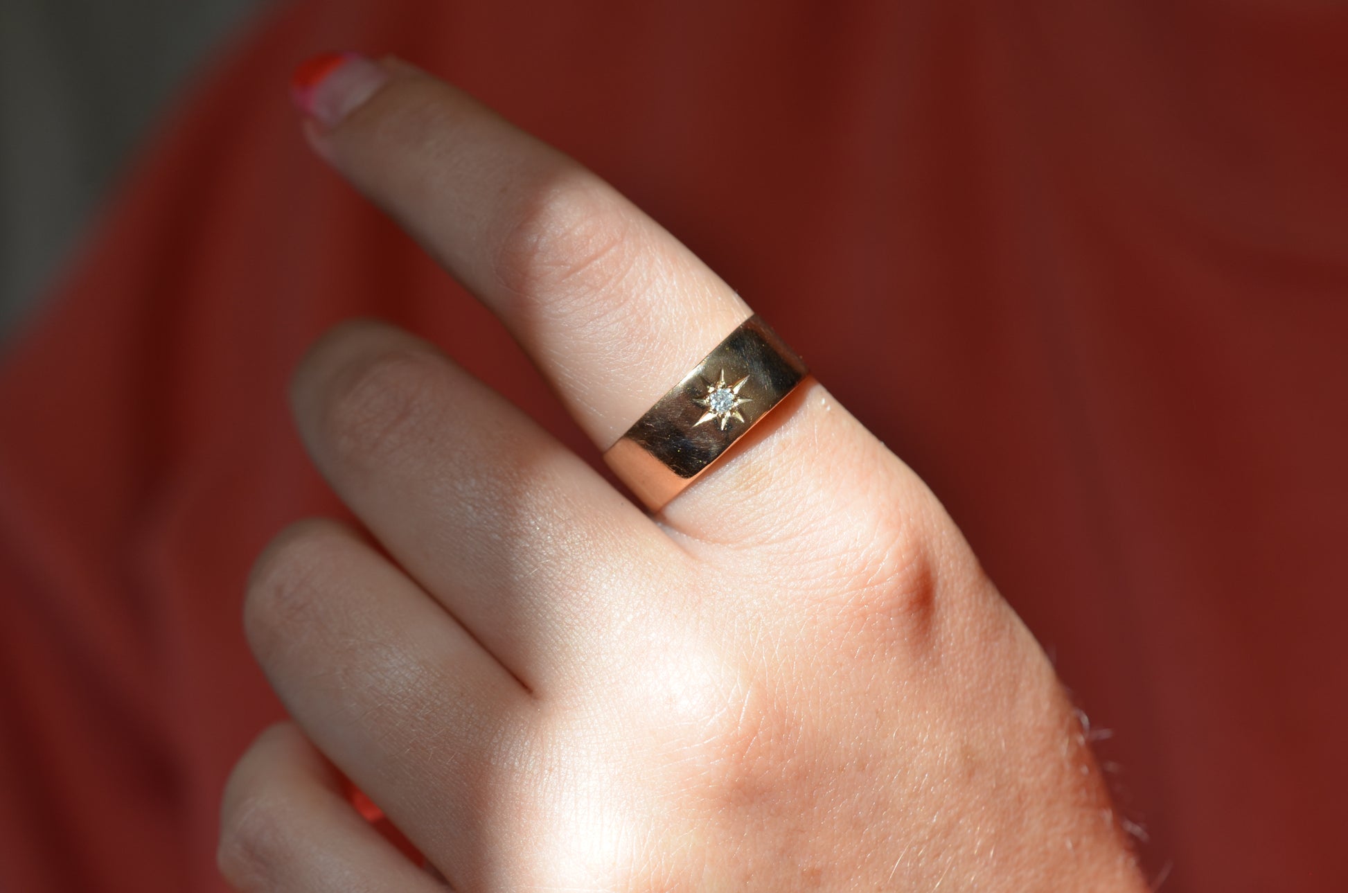 Luscious and weighty, with a bright sparkling diamond within a crisp star setting flush into the ring - this piece is an absolute dream! Wide across but slim between the fingers, this cigar-style ring is so comfortable you'll forget you're wearing it, until the sun catches the sea of rosy gold and rainbows flashing from the old European cut diamond. Absolutely ideal as a statement piece, an everyday power stacker, or even a unique and unconventional engagement ring for her, him, or them.