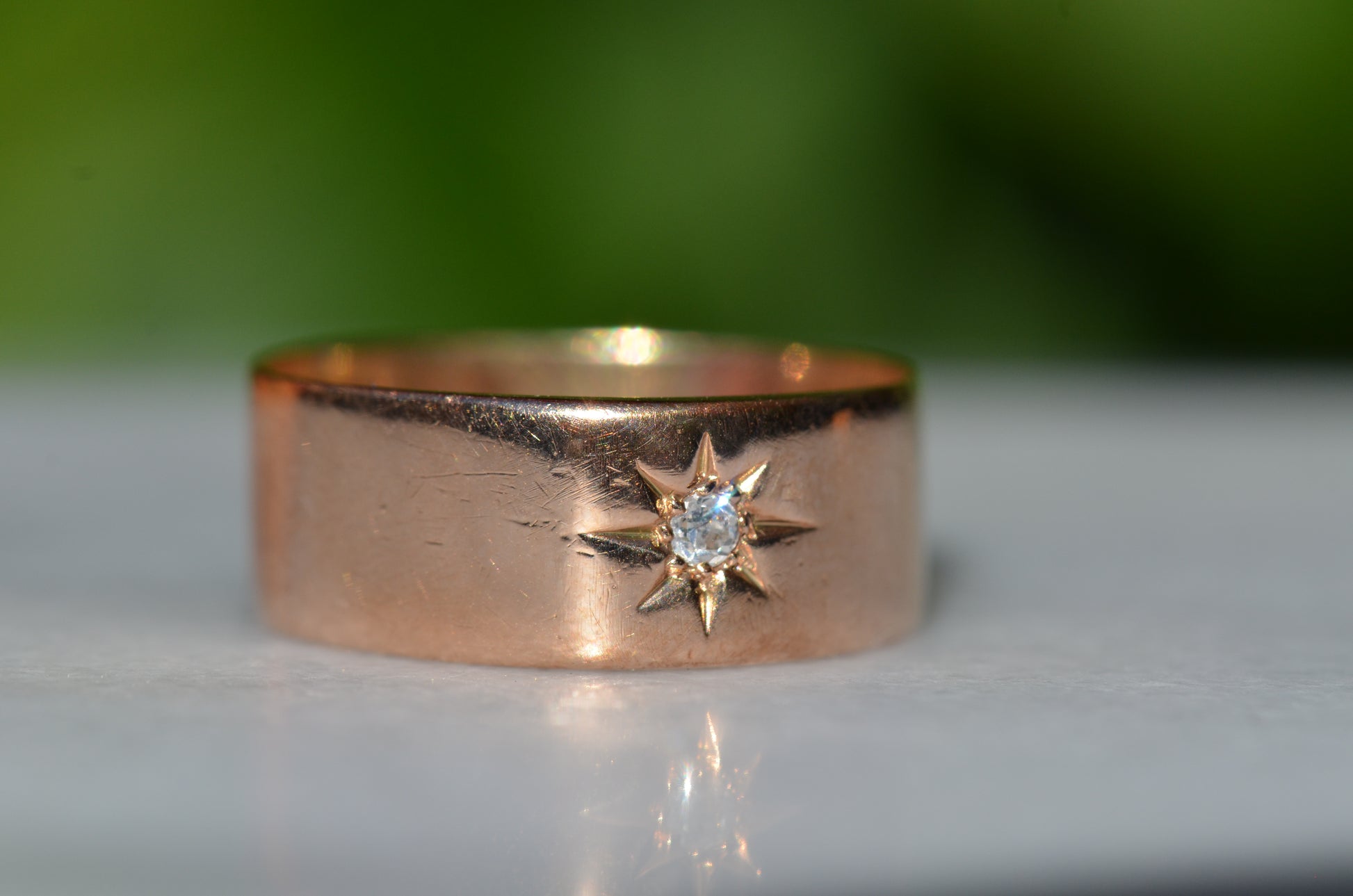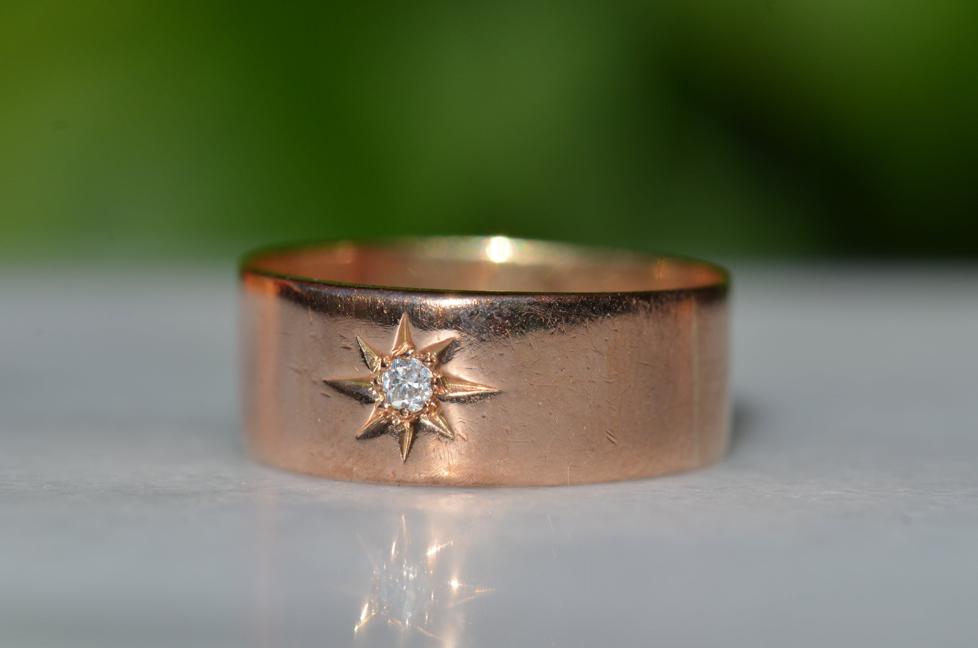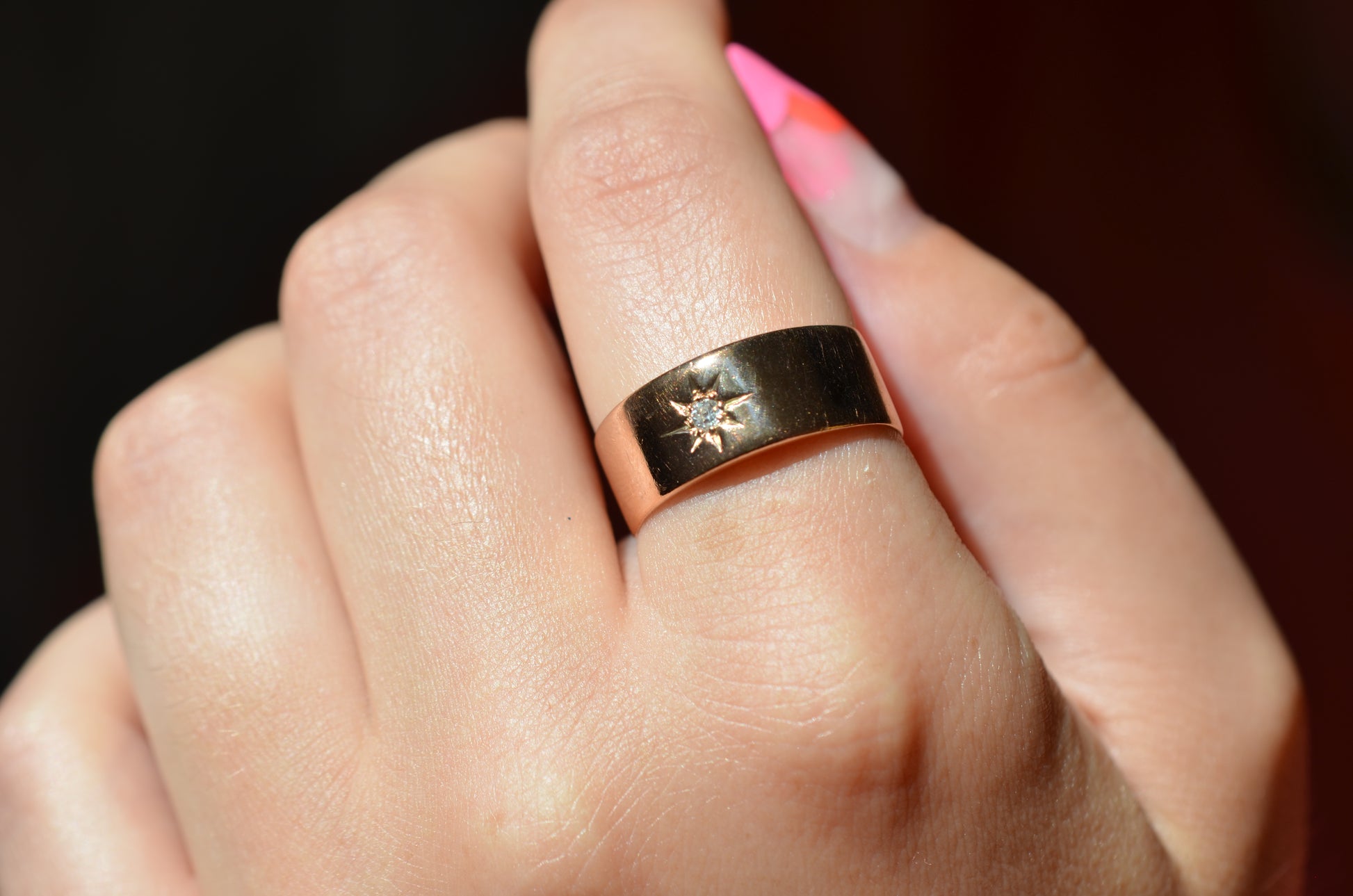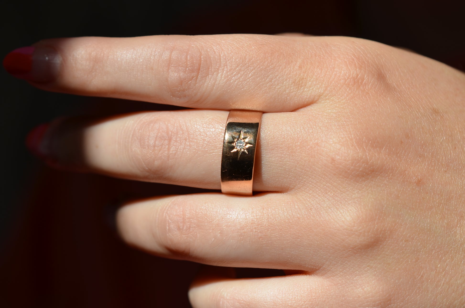 Luscious and weighty, with a bright sparkling diamond within a crisp star setting flush into the ring - this piece is an absolute dream! Wide across but slim between the fingers, this cigar-style ring is so comfortable you'll forget you're wearing it, until the sun catches the sea of rosy gold and rainbows flashing from the old European cut diamond. Absolutely ideal as a statement piece, an everyday power stacker, or even a unique and unconventional engagement ring for her, him, or them.