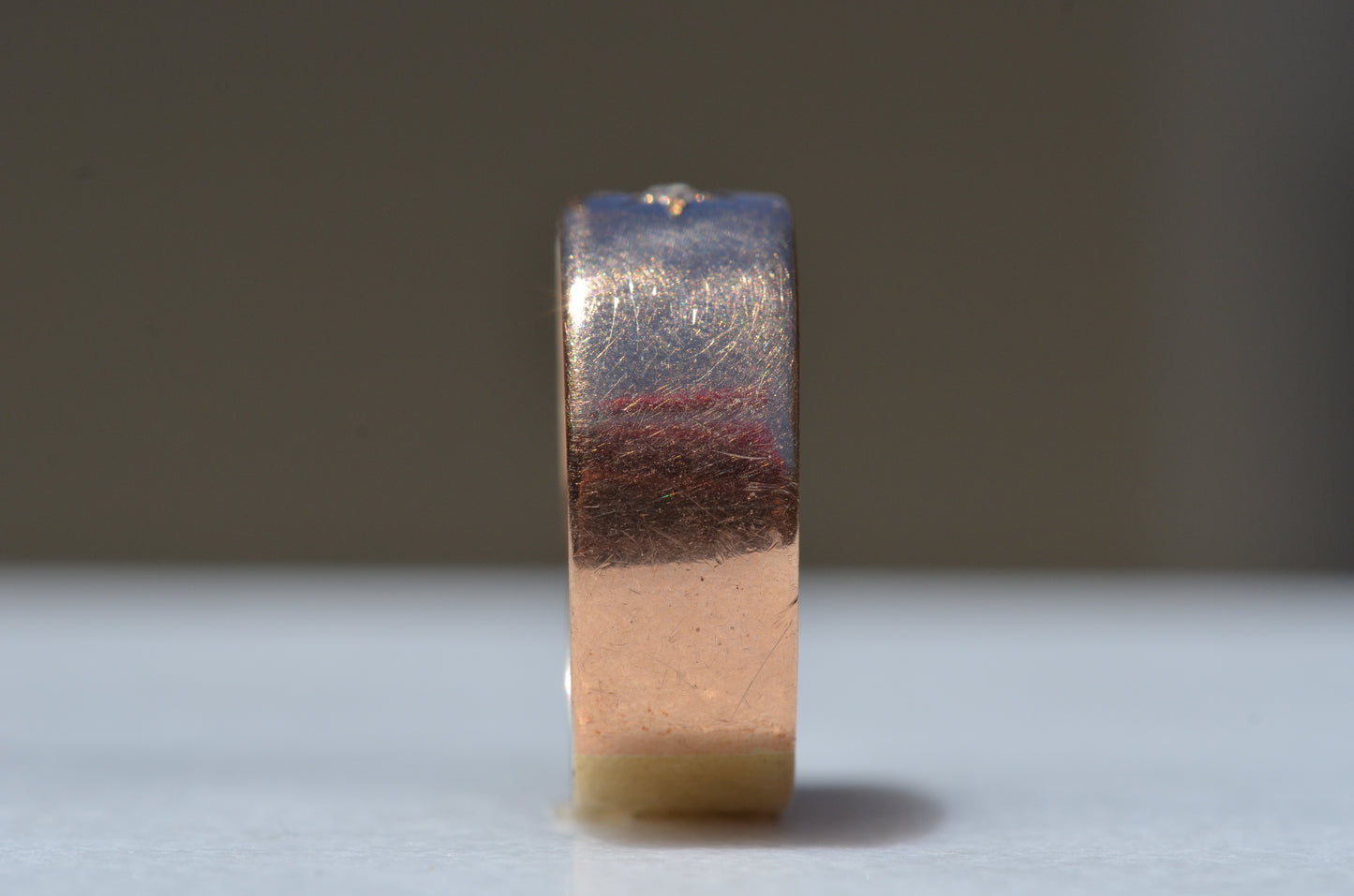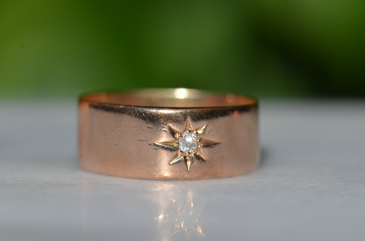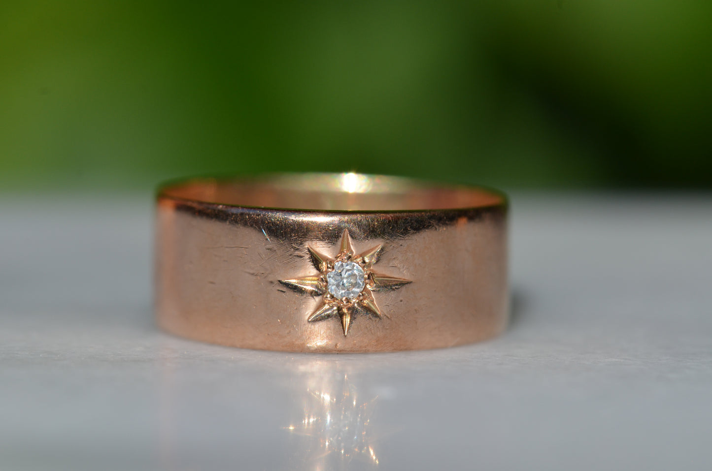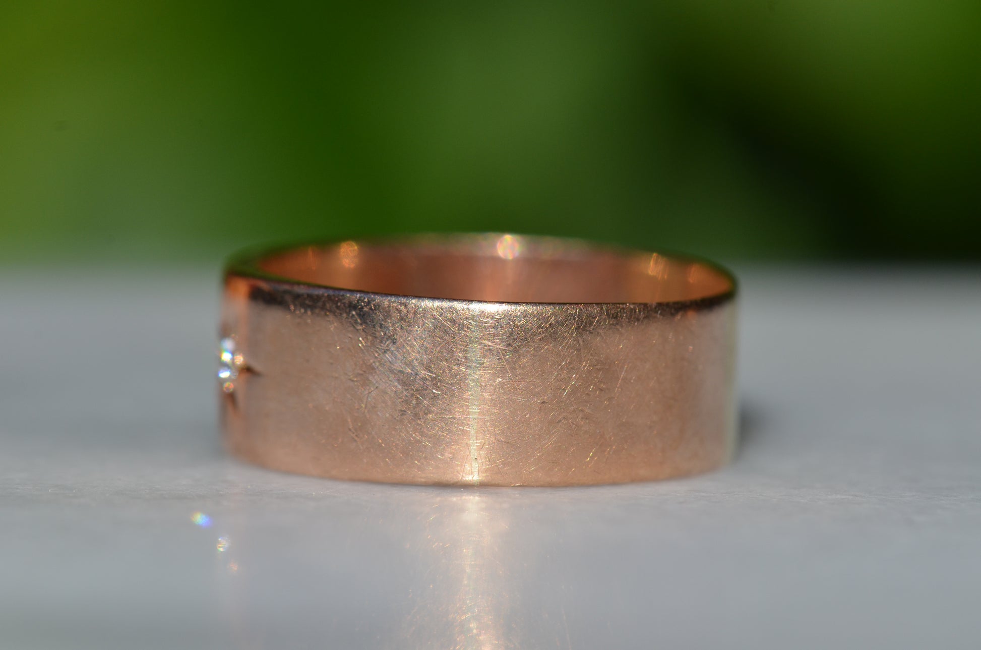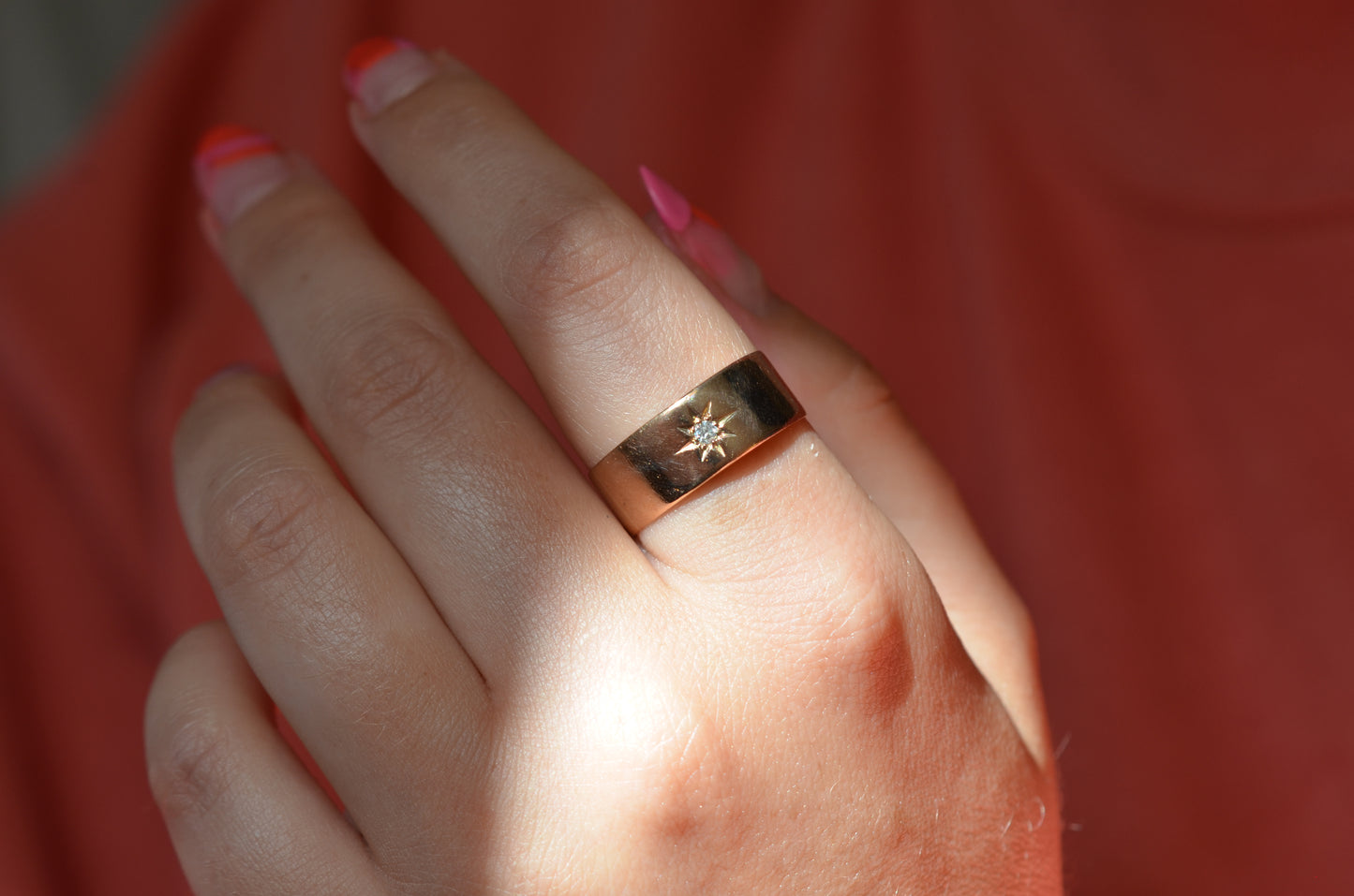 Luscious and weighty, with a bright sparkling diamond within a crisp star setting flush into the ring - this piece is an absolute dream! Wide across but slim between the fingers, this cigar-style ring is so comfortable you'll forget you're wearing it, until the sun catches the sea of rosy gold and rainbows flashing from the old European cut diamond. Absolutely ideal as a statement piece, an everyday power stacker, or even a unique and unconventional engagement ring for her, him, or them.