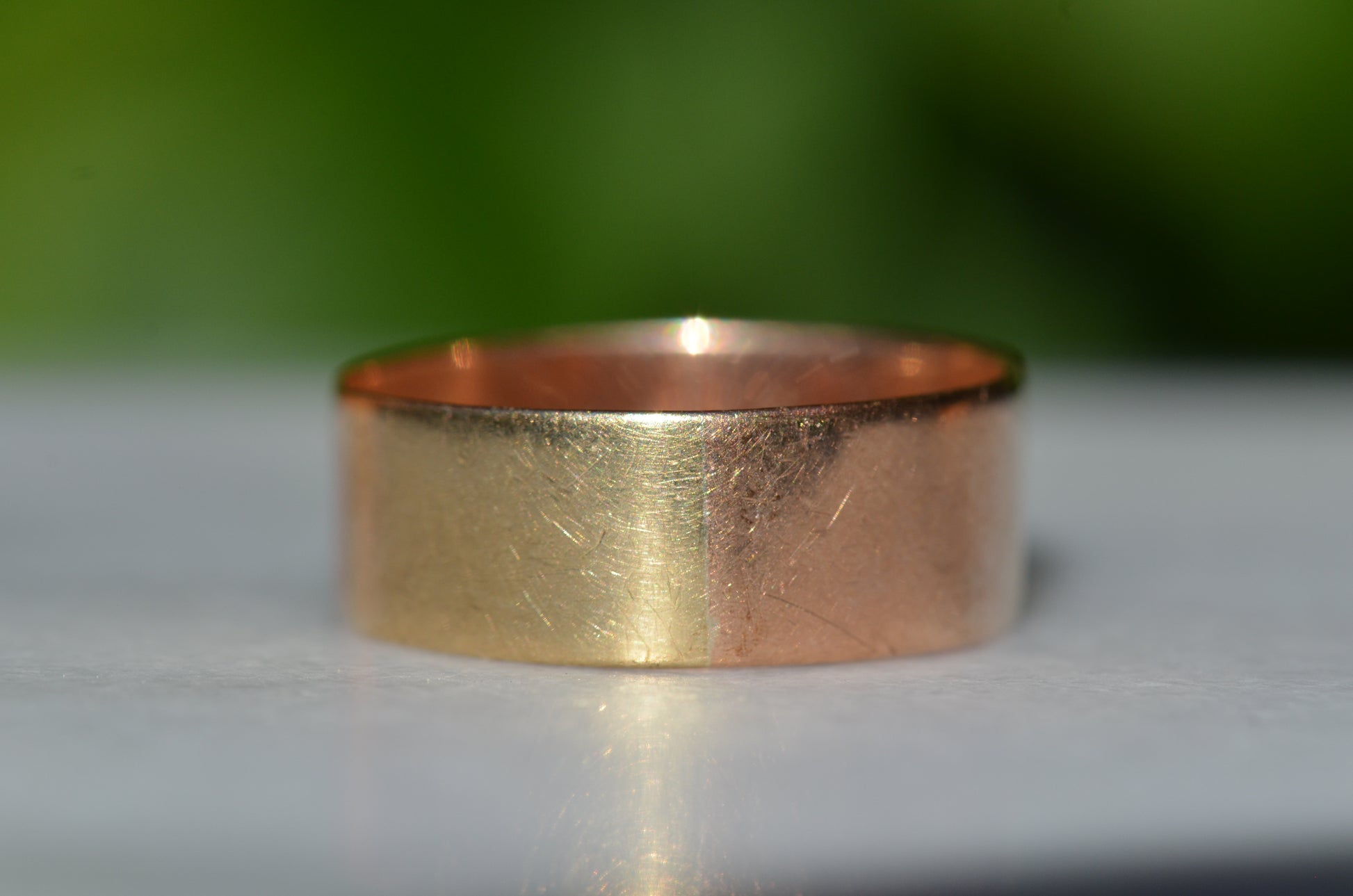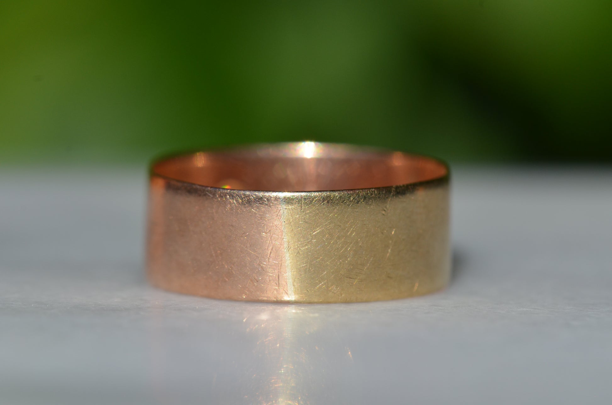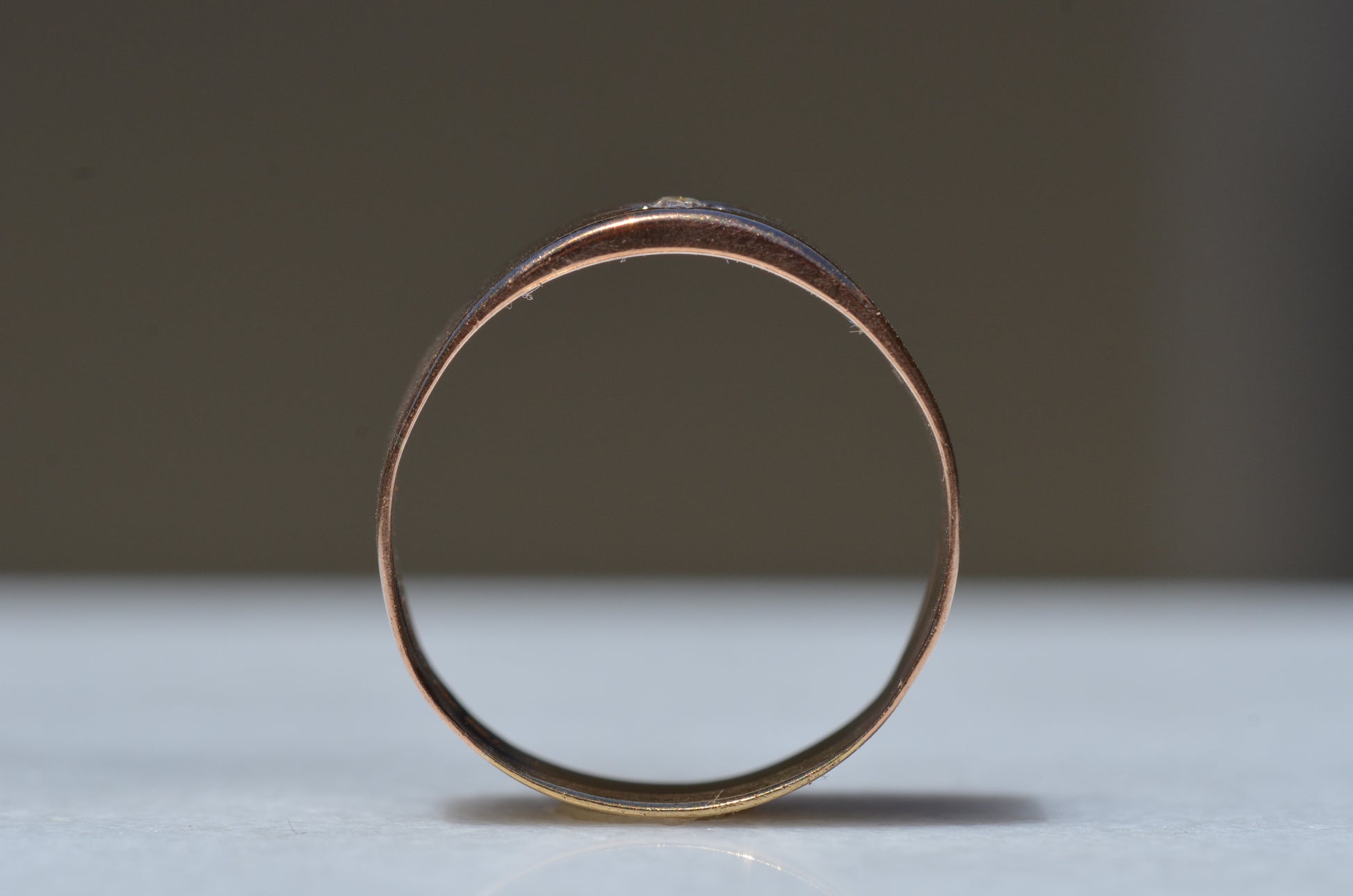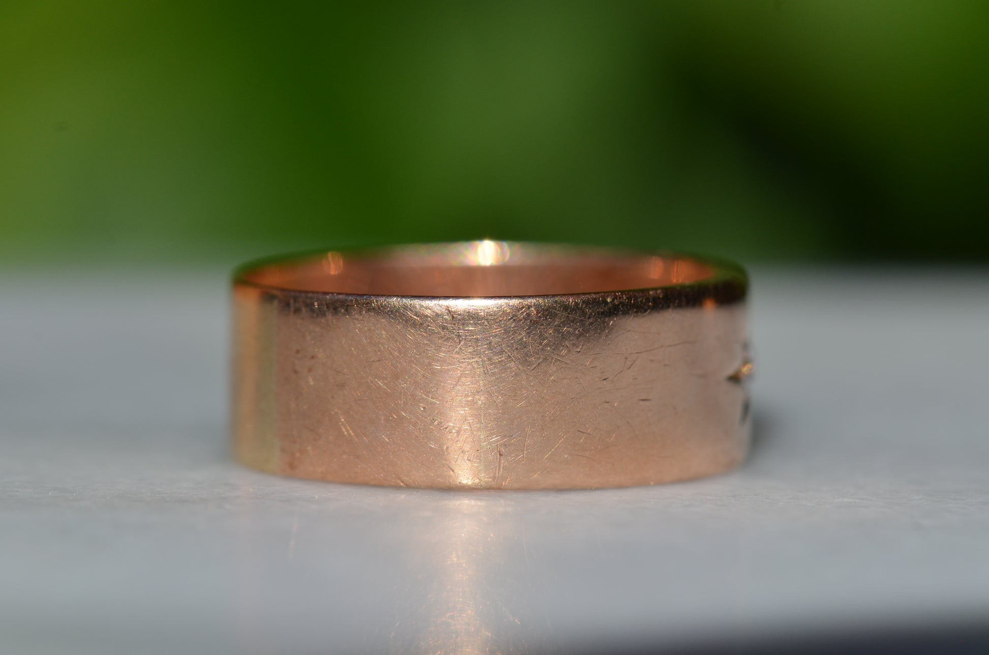 Luscious and weighty, with a bright sparkling diamond within a crisp star setting flush into the ring - this piece is an absolute dream! Wide across but slim between the fingers, this cigar-style ring is so comfortable you'll forget you're wearing it, until the sun catches the sea of rosy gold and rainbows flashing from the old European cut diamond. Absolutely ideal as a statement piece, an everyday power stacker, or even a unique and unconventional engagement ring for her, him, or them.
