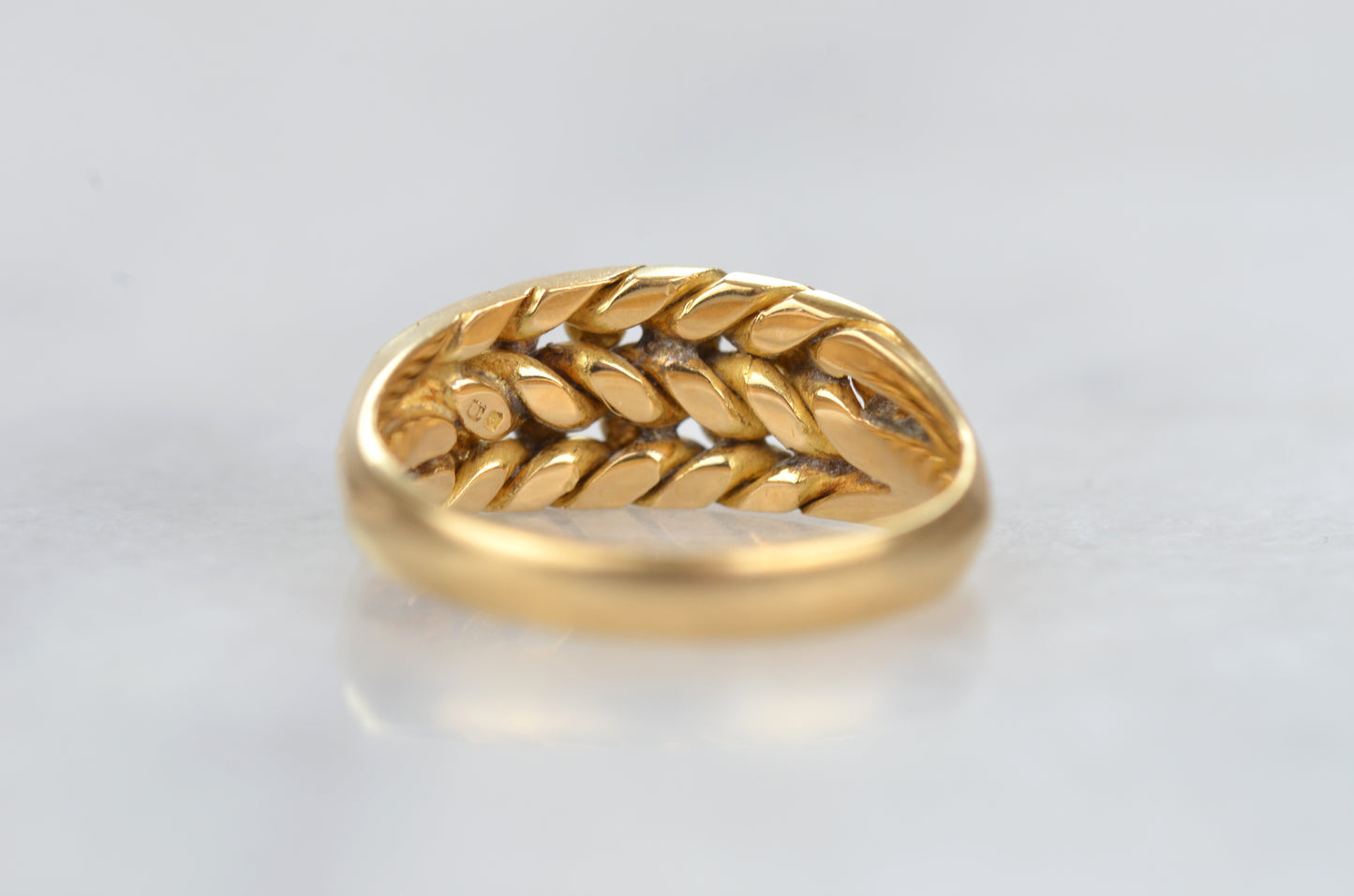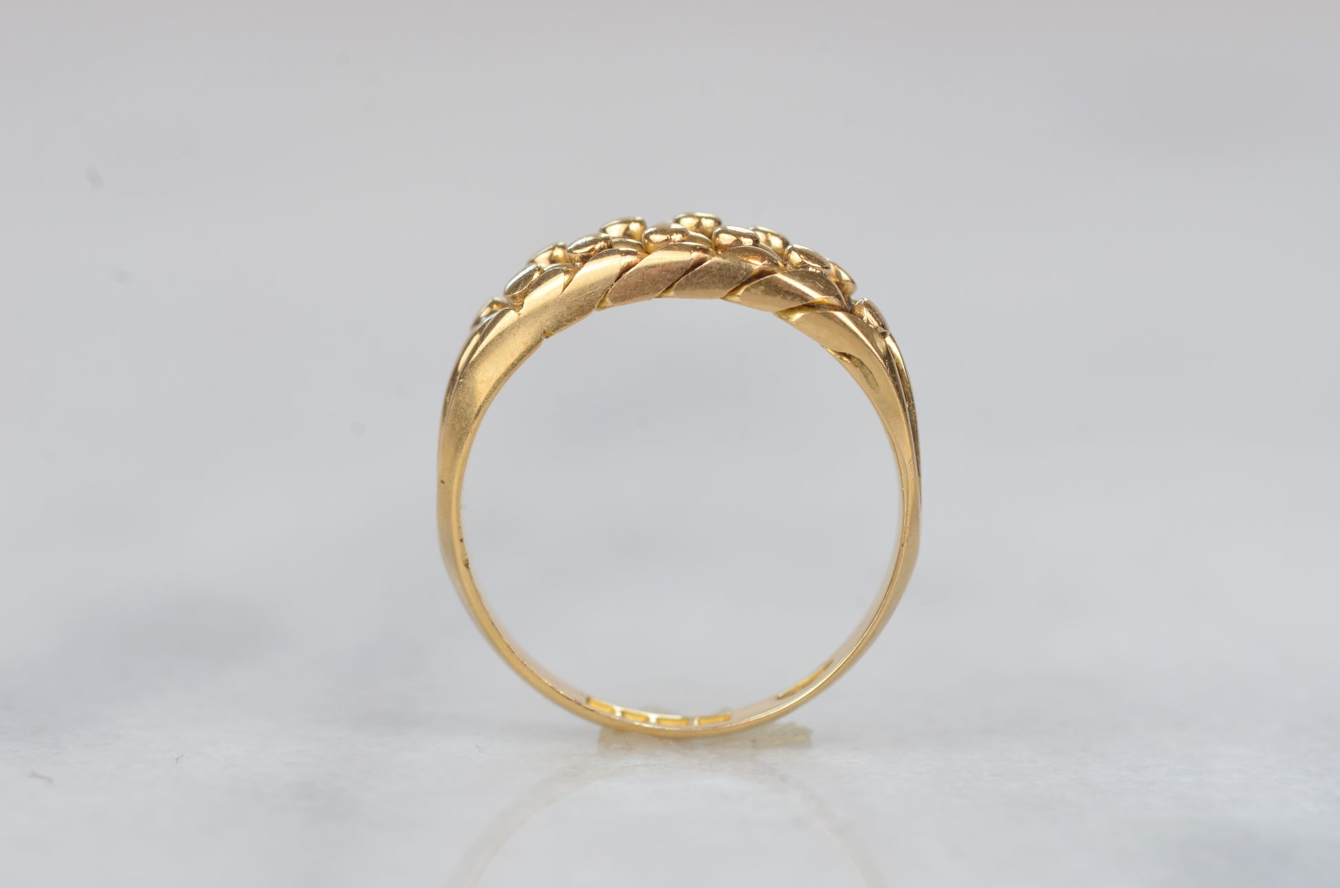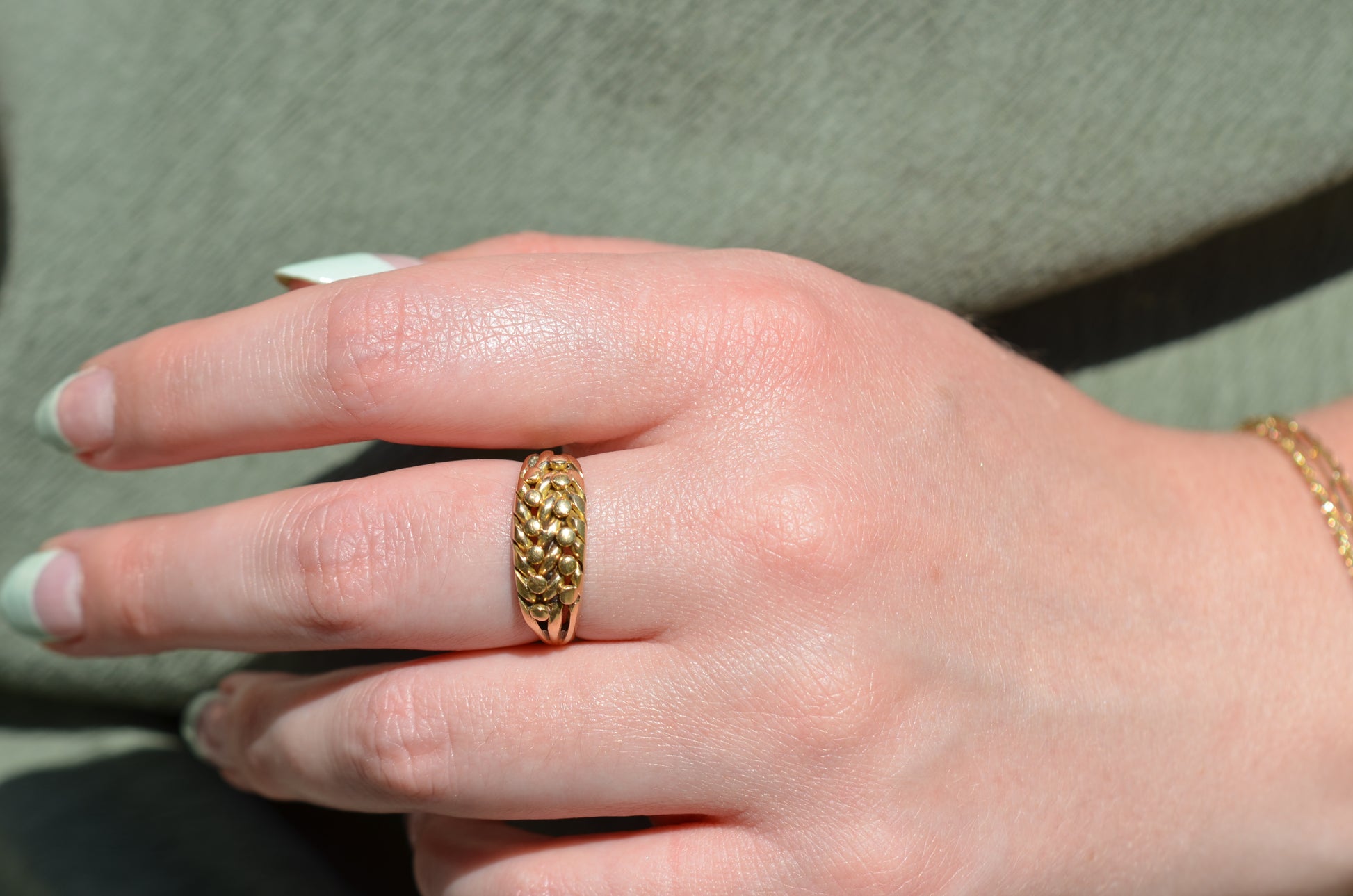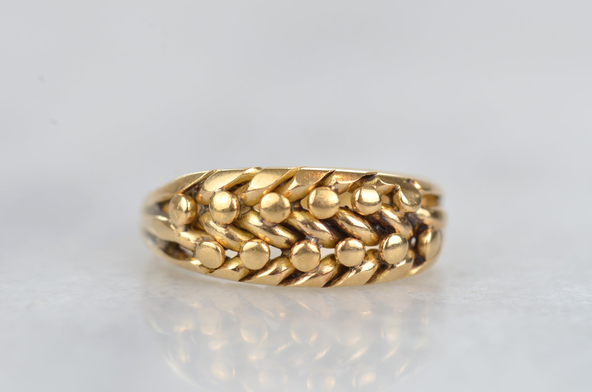 A beloved Victorian style, that itself took cues from further antiquity, this gold band is styled as what is typically known as a "keeper" ring. It's debated whether the name and function comes from a practice of giving the simple, though often woven, gold bands as a pre-betrothal ring to indicate your intended is a keeper, or as a less-expensive ring worn on top of the betrothal ring to keep it in place - either way, the keeper ring generally came to be what we now consider the wedding band. The woven or braided style harkens back to early, pre-goldsmithing rings, made of woven reeds or leathers. While the style is no longer among the most popular as a wedding band, they're detailed enough to wear alone or a beautiful touch of texture and depth in a ring stack.