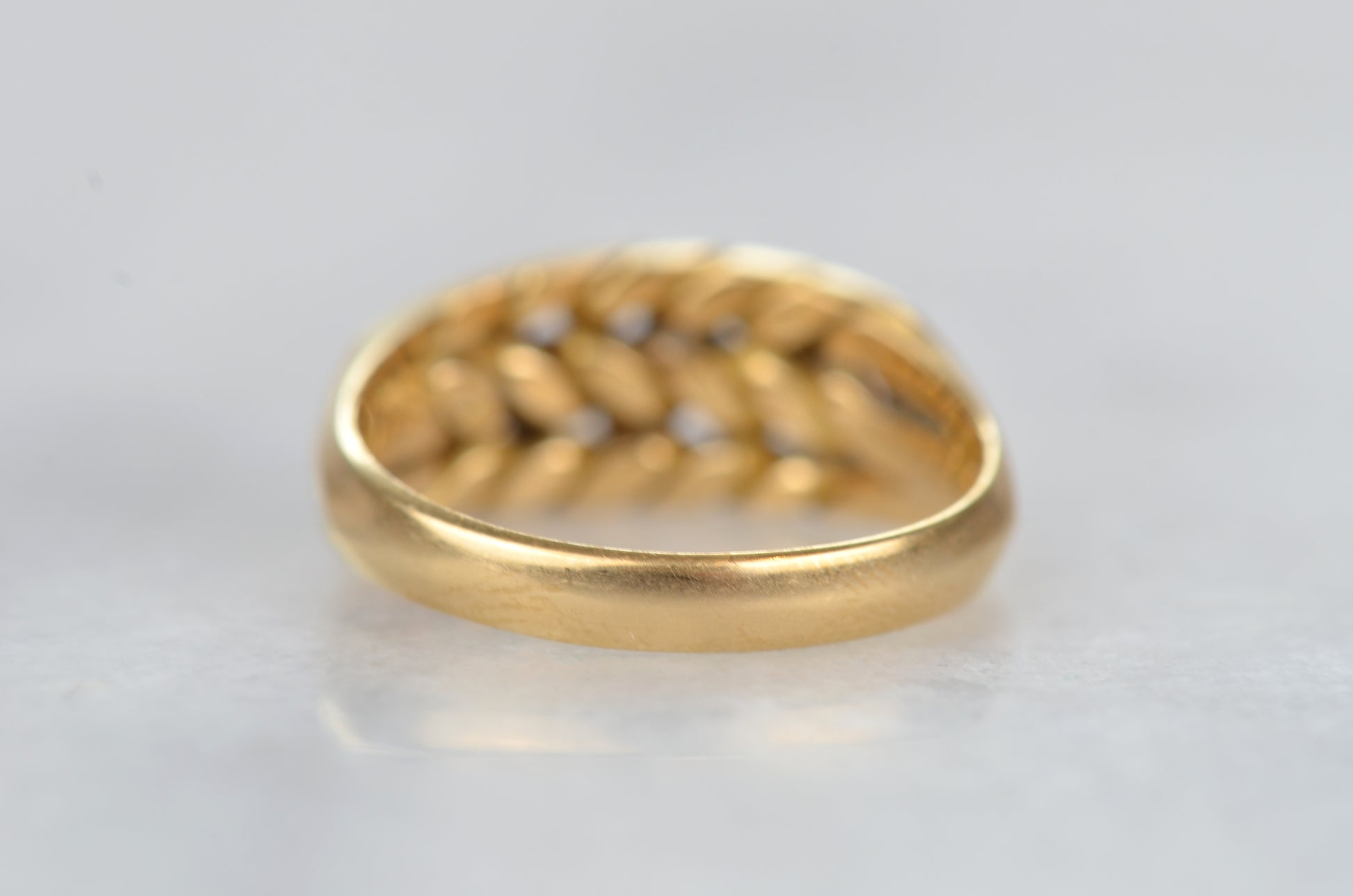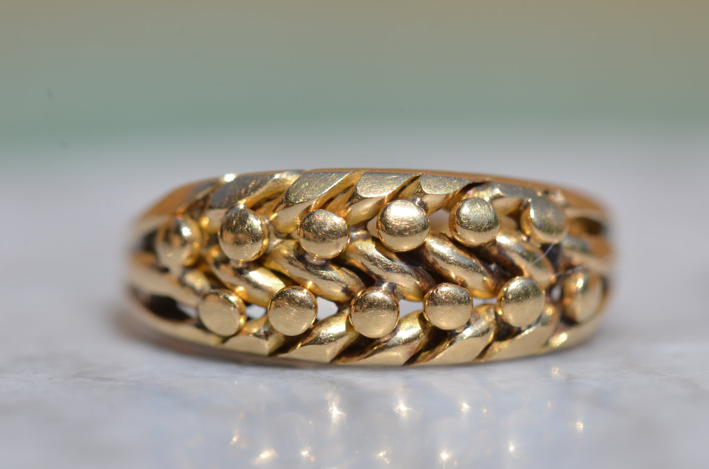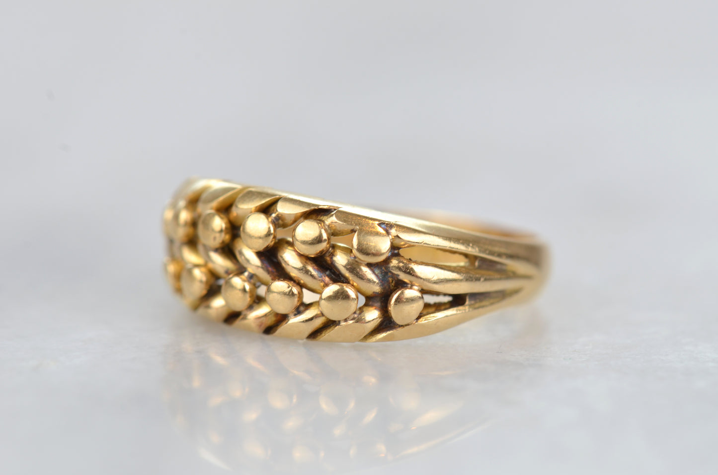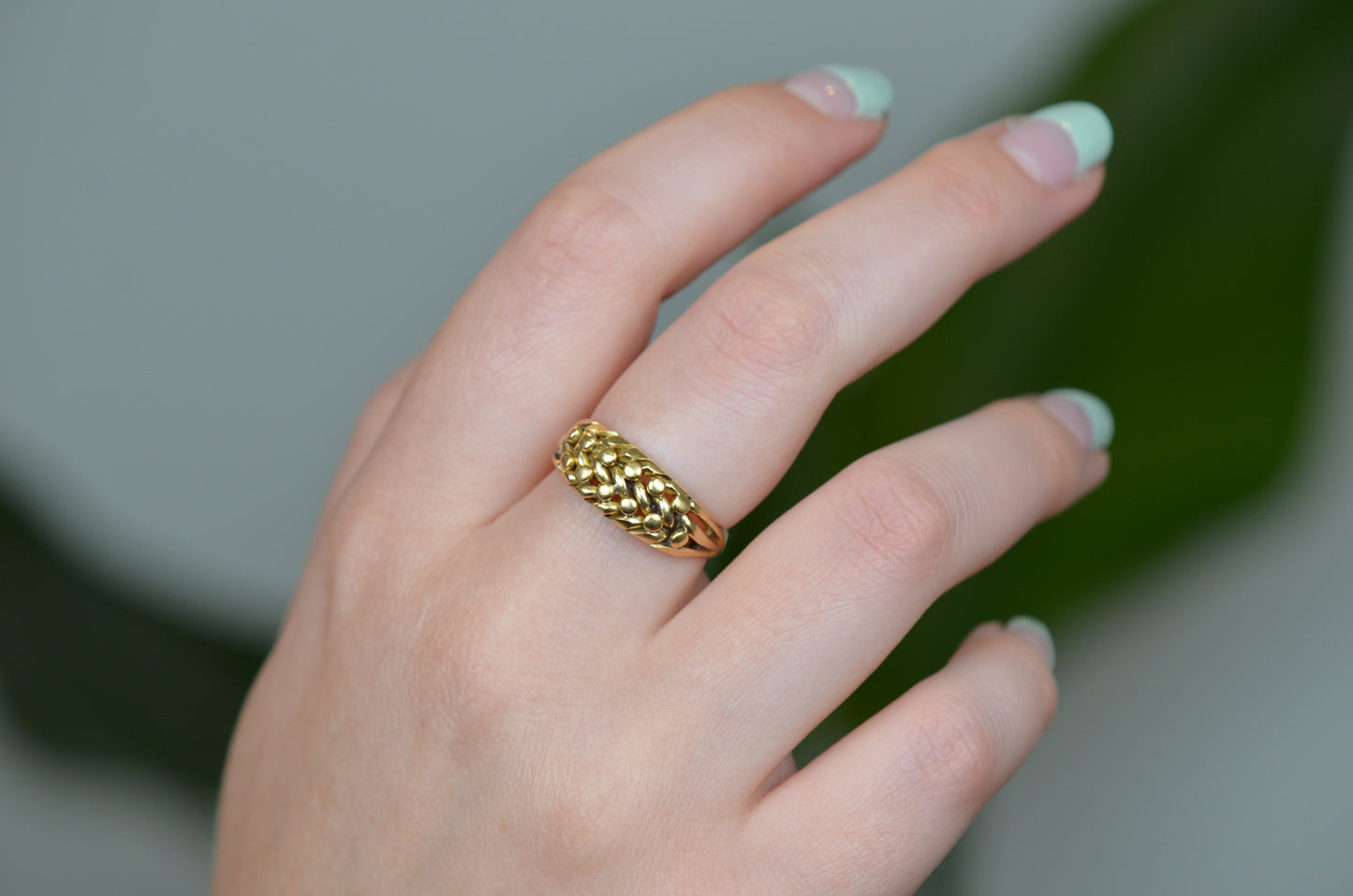 A beloved Victorian style, that itself took cues from further antiquity, this gold band is styled as what is typically known as a "keeper" ring. It's debated whether the name and function comes from a practice of giving the simple, though often woven, gold bands as a pre-betrothal ring to indicate your intended is a keeper, or as a less-expensive ring worn on top of the betrothal ring to keep it in place - either way, the keeper ring generally came to be what we now consider the wedding band. The woven or braided style harkens back to early, pre-goldsmithing rings, made of woven reeds or leathers. While the style is no longer among the most popular as a wedding band, they're detailed enough to wear alone or a beautiful touch of texture and depth in a ring stack.