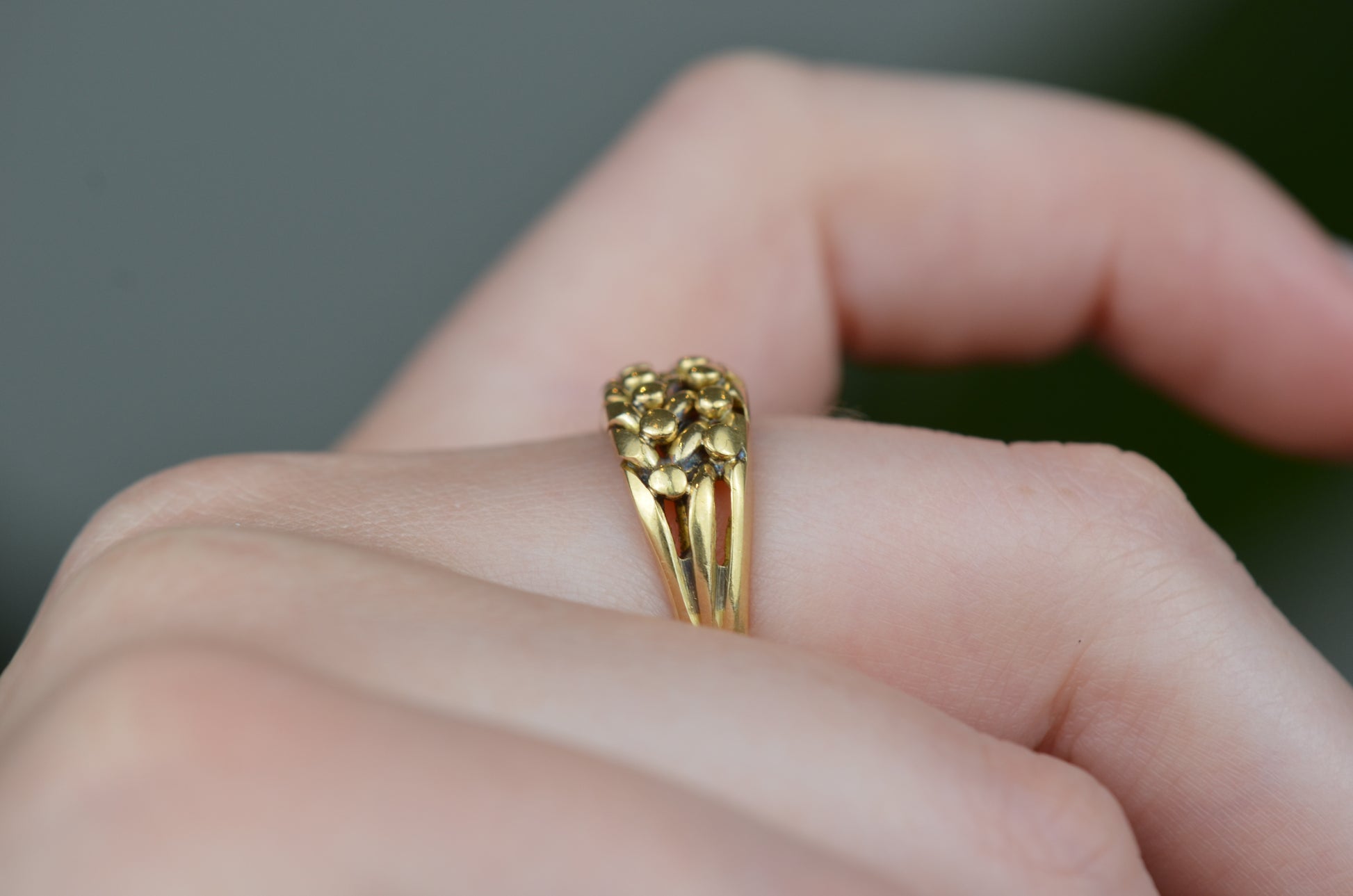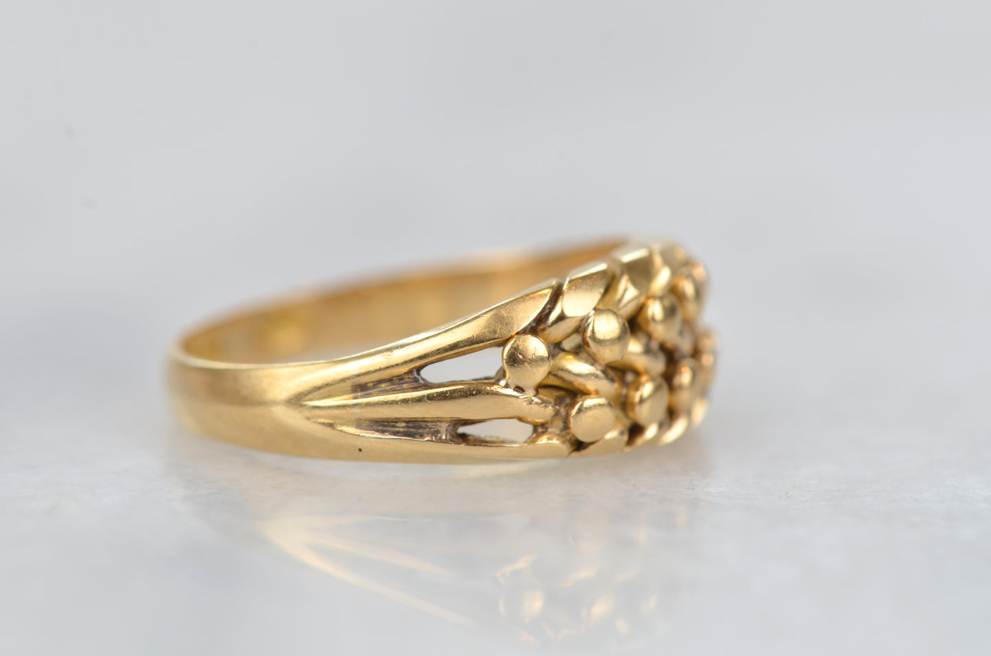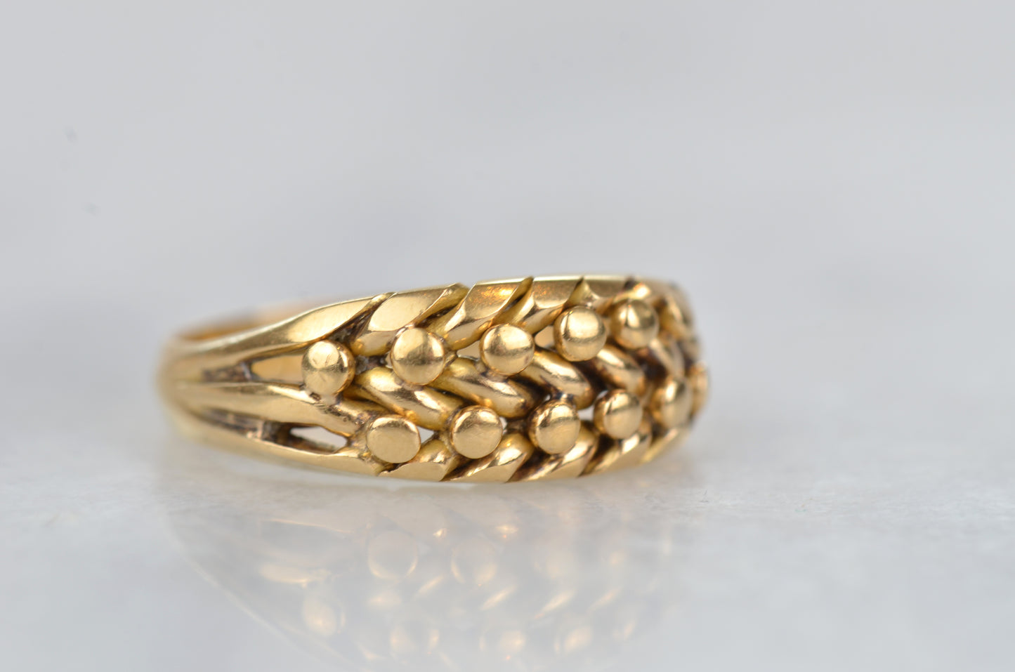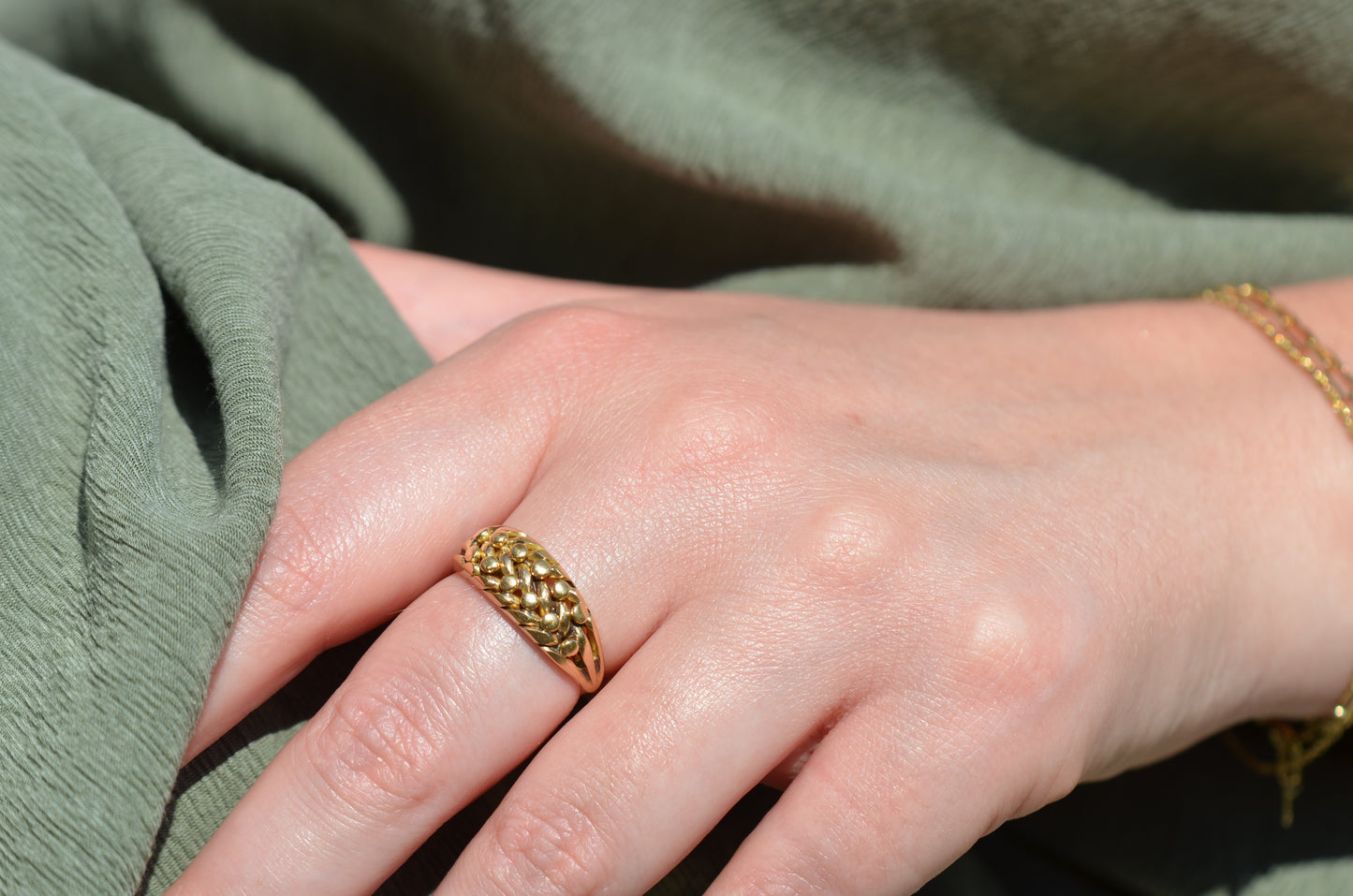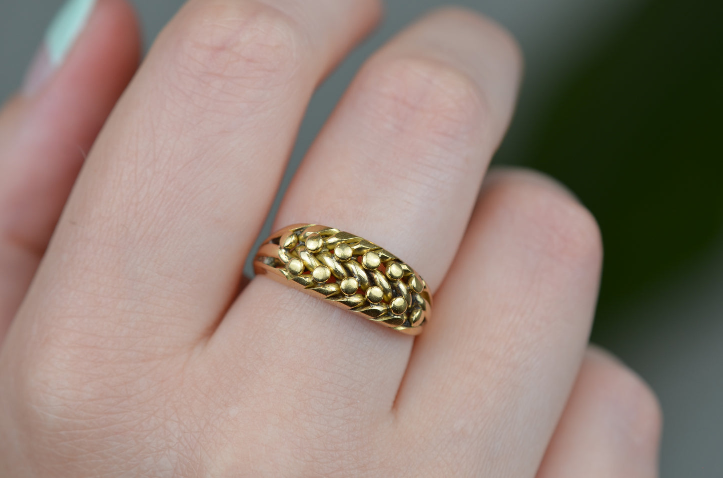 A beloved Victorian style, that itself took cues from further antiquity, this gold band is styled as what is typically known as a "keeper" ring. It's debated whether the name and function comes from a practice of giving the simple, though often woven, gold bands as a pre-betrothal ring to indicate your intended is a keeper, or as a less-expensive ring worn on top of the betrothal ring to keep it in place - either way, the keeper ring generally came to be what we now consider the wedding band. The woven or braided style harkens back to early, pre-goldsmithing rings, made of woven reeds or leathers. While the style is no longer among the most popular as a wedding band, they're detailed enough to wear alone or a beautiful touch of texture and depth in a ring stack.