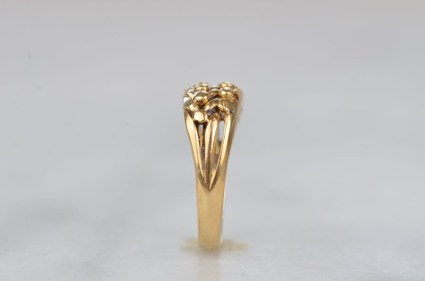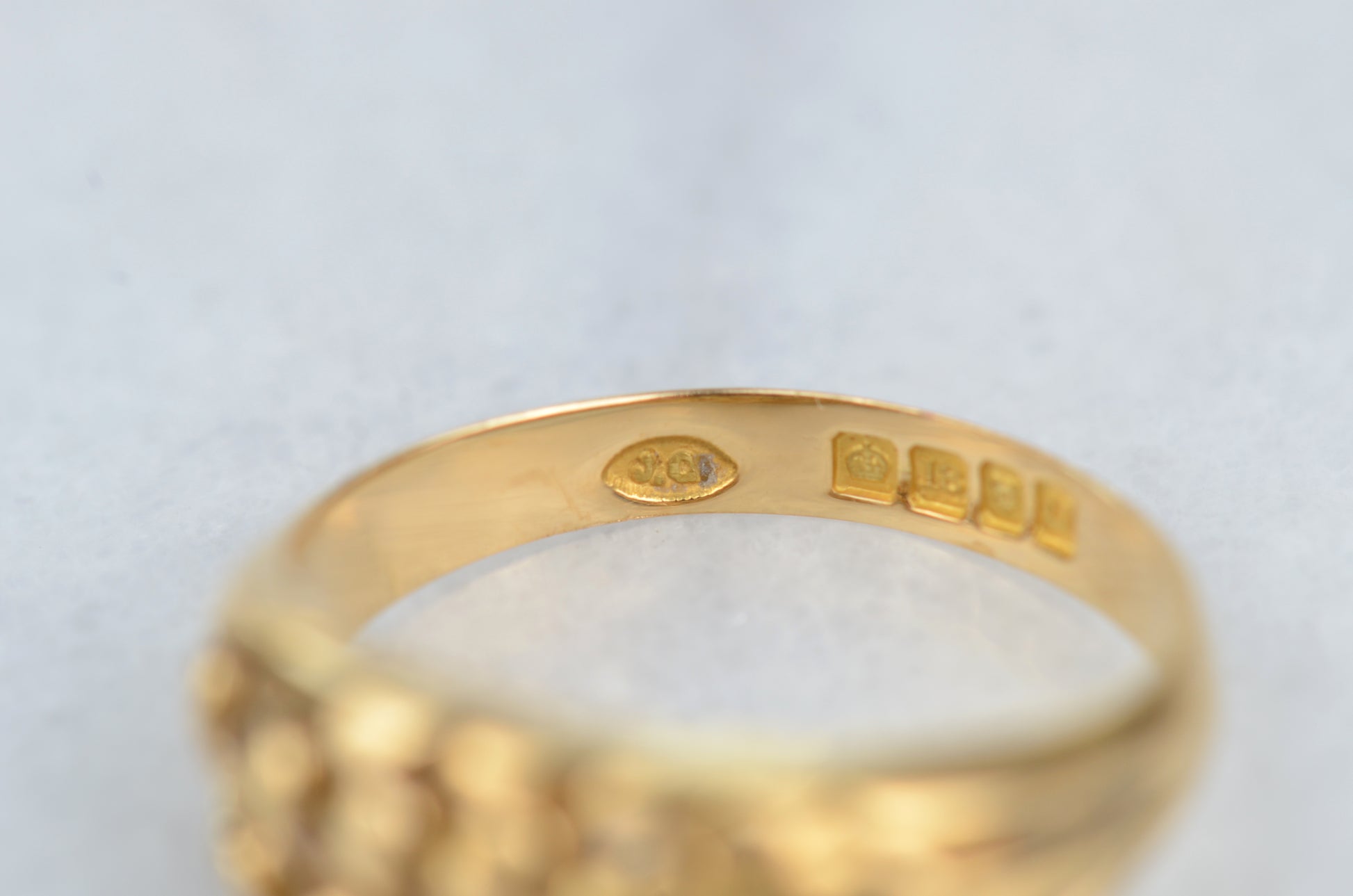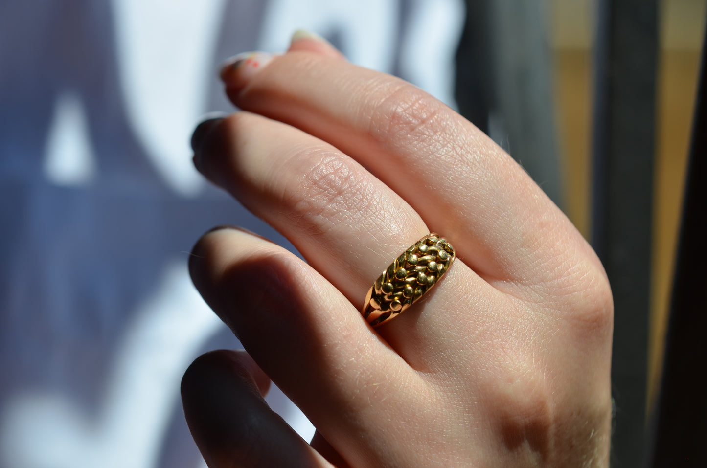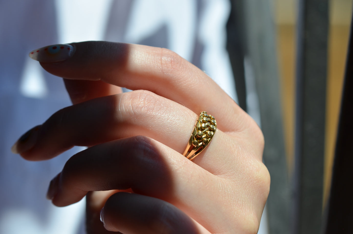 A beloved Victorian style, that itself took cues from further antiquity, this gold band is styled as what is typically known as a "keeper" ring. It's debated whether the name and function comes from a practice of giving the simple, though often woven, gold bands as a pre-betrothal ring to indicate your intended is a keeper, or as a less-expensive ring worn on top of the betrothal ring to keep it in place - either way, the keeper ring generally came to be what we now consider the wedding band. The woven or braided style harkens back to early, pre-goldsmithing rings, made of woven reeds or leathers. While the style is no longer among the most popular as a wedding band, they're detailed enough to wear alone or a beautiful touch of texture and depth in a ring stack.