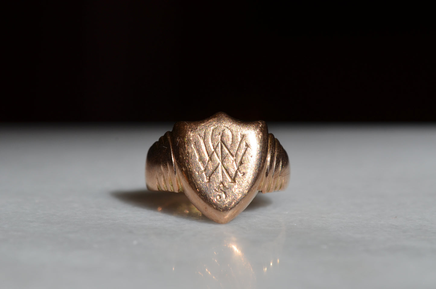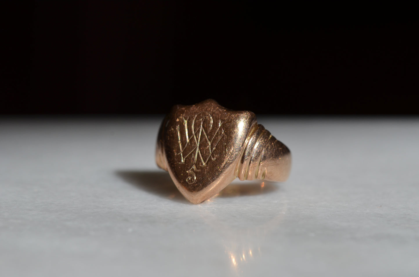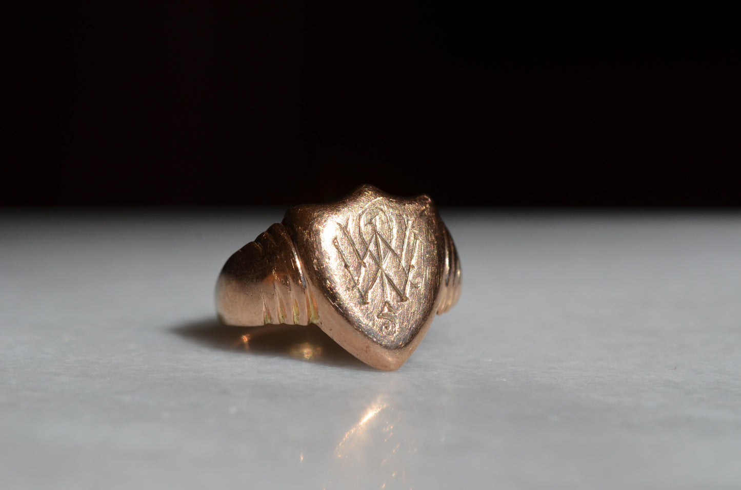 Very good antique condition with wear in line with age and use, including evidence of past resizing and warm rosy patina. Engraved with letters WWS, possibly also with an I. c1910. Originally manufactured in the UK.
