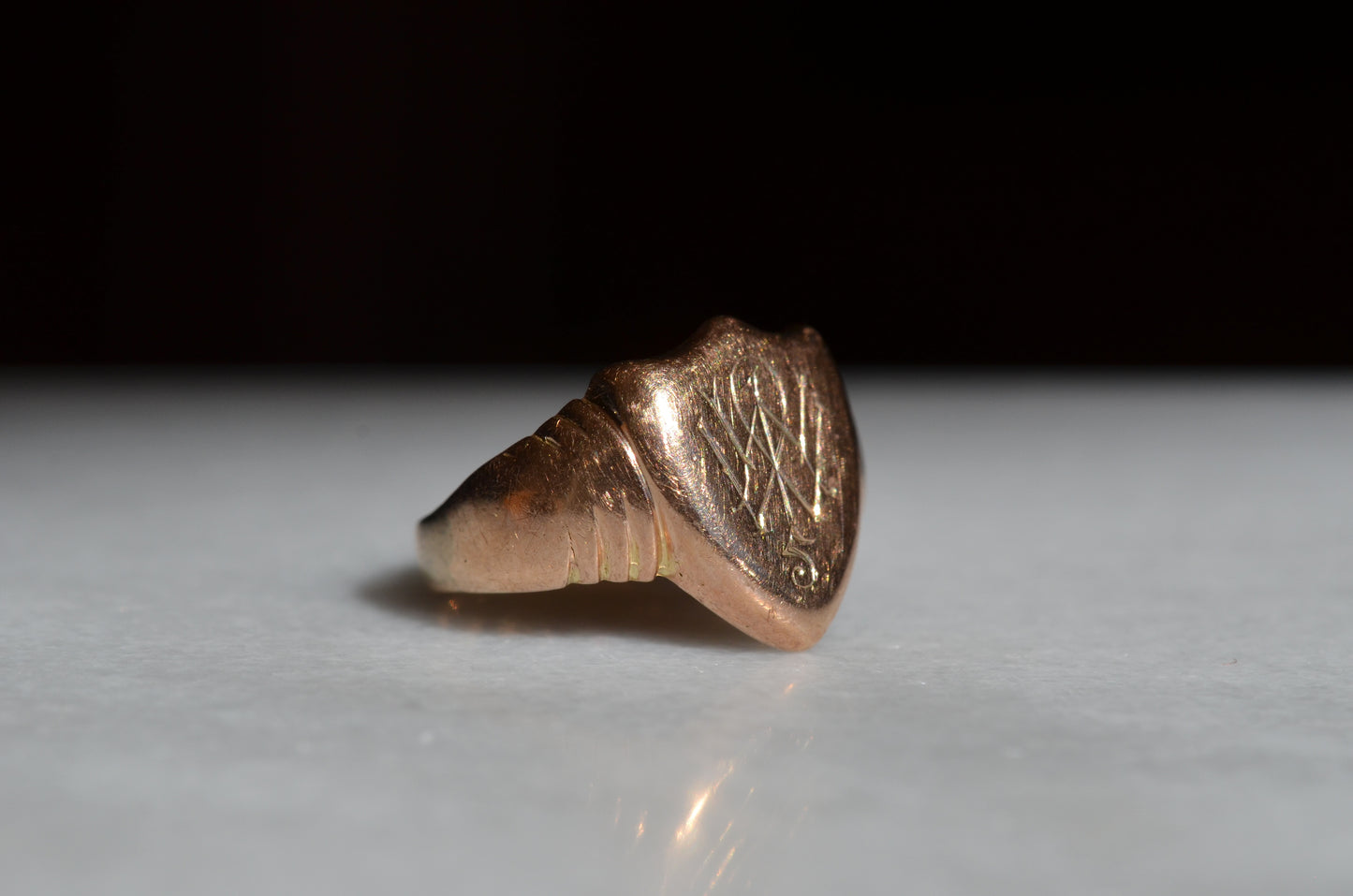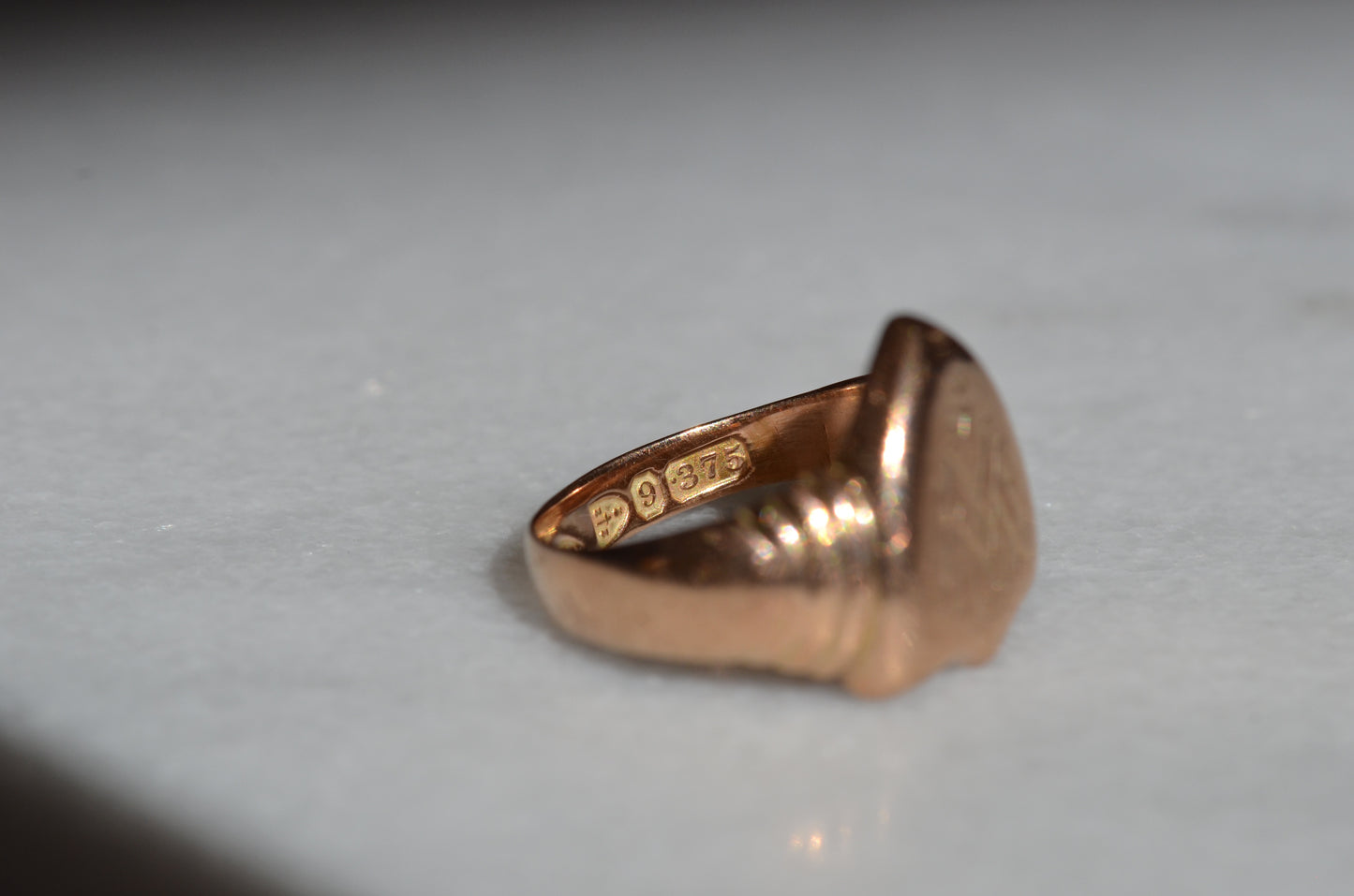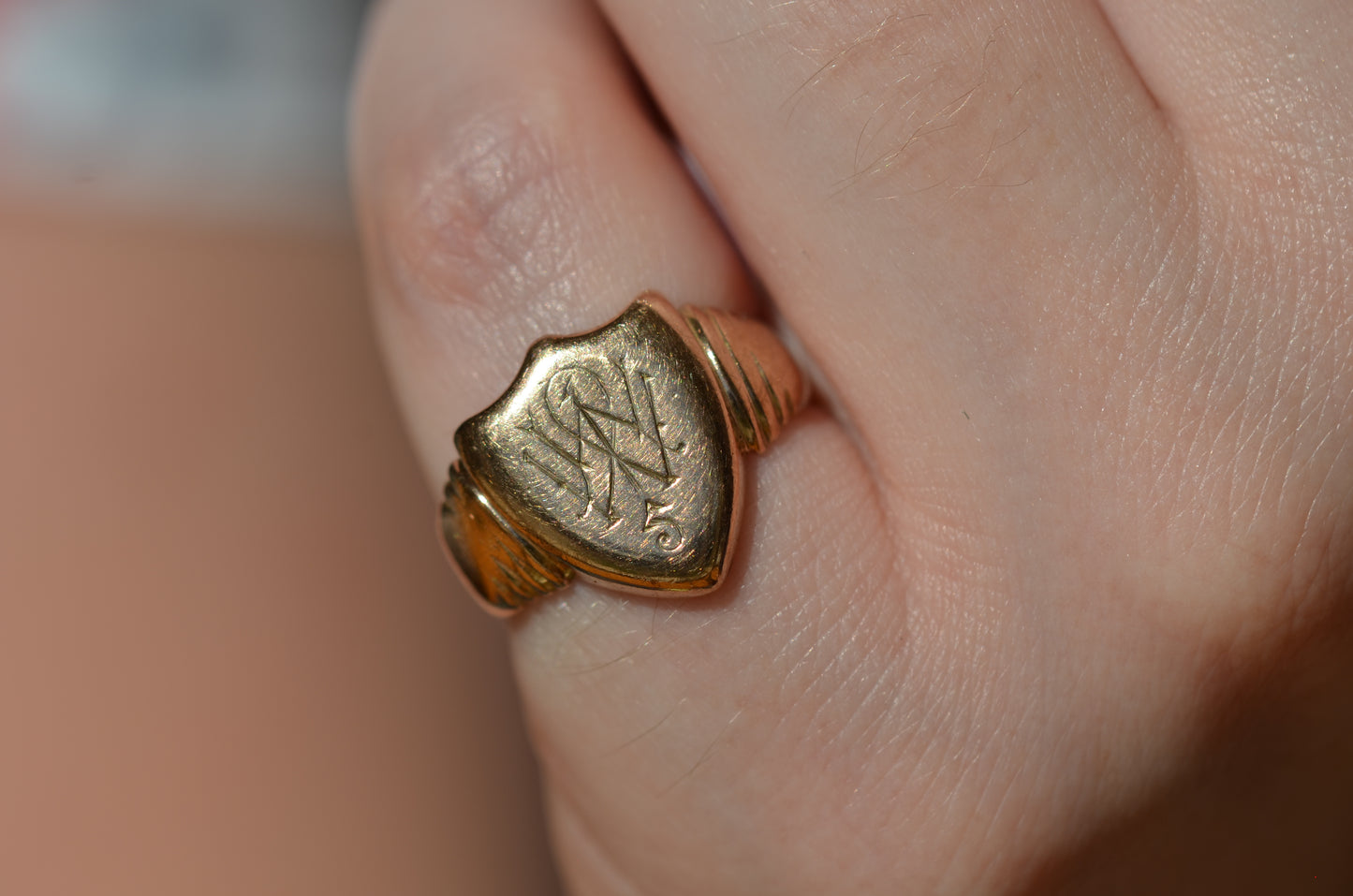 Very good antique condition with wear in line with age and use, including evidence of past resizing and warm rosy patina. Engraved with letters WWS, possibly also with an I. c1910. Originally manufactured in the UK.