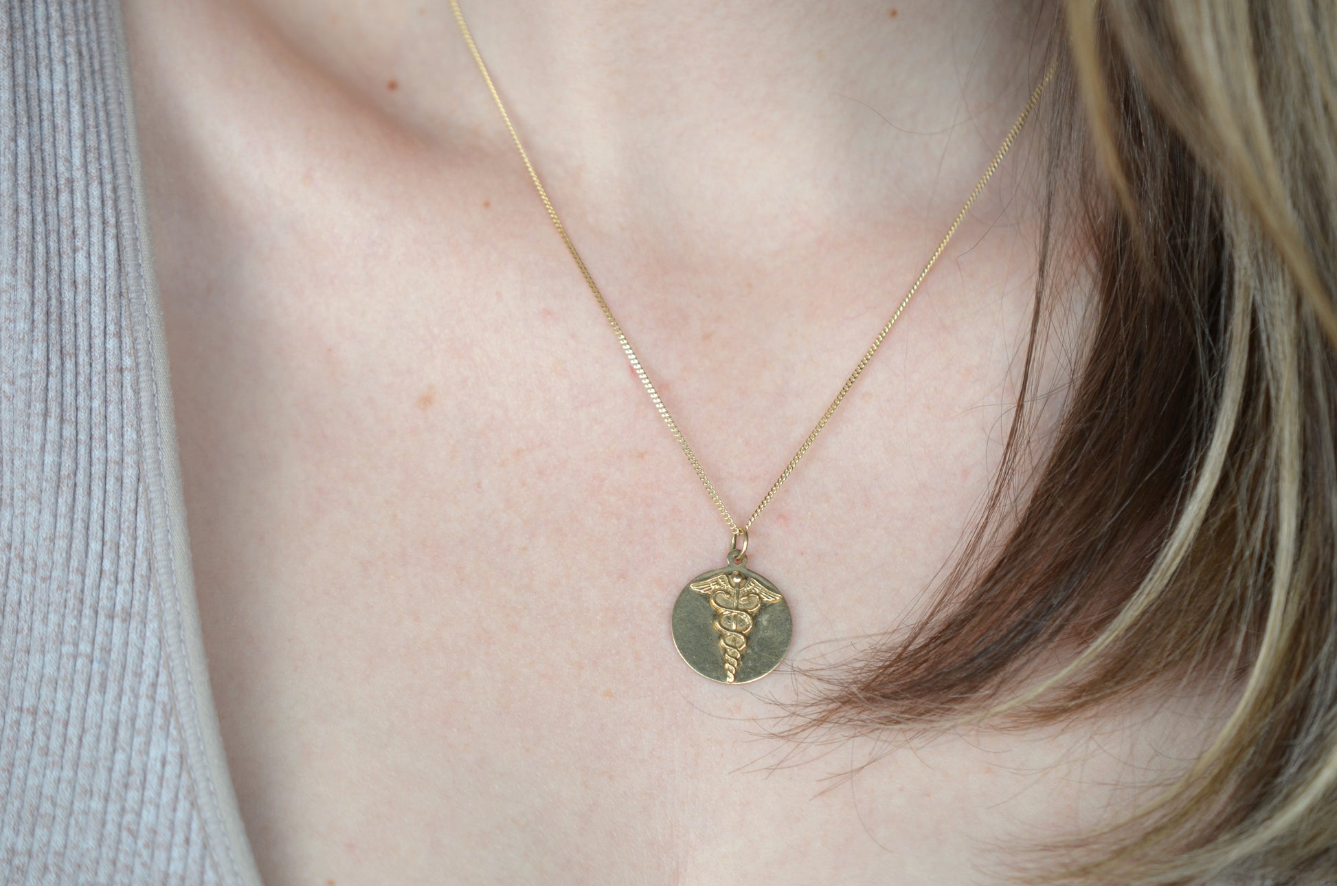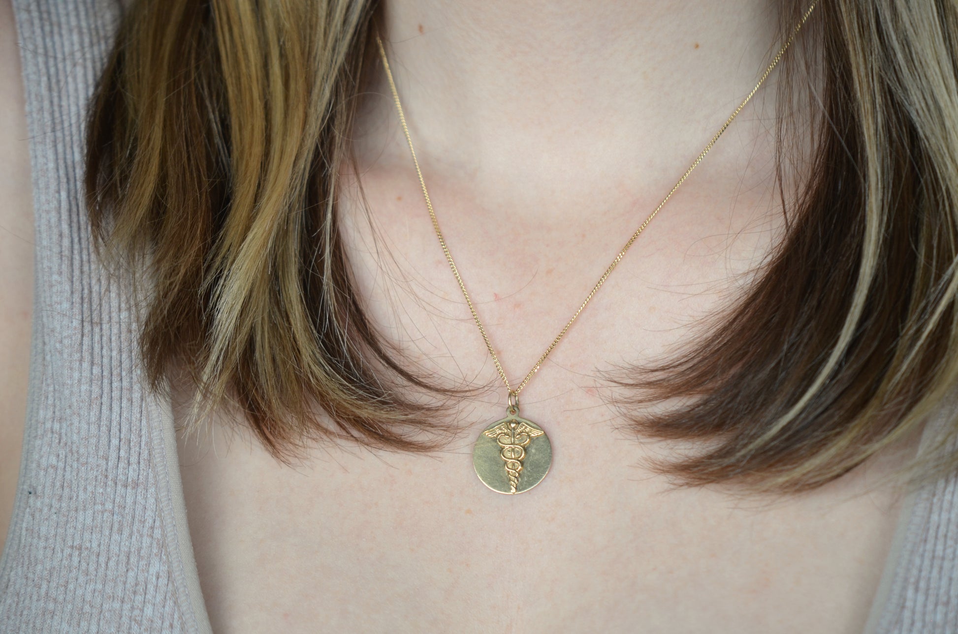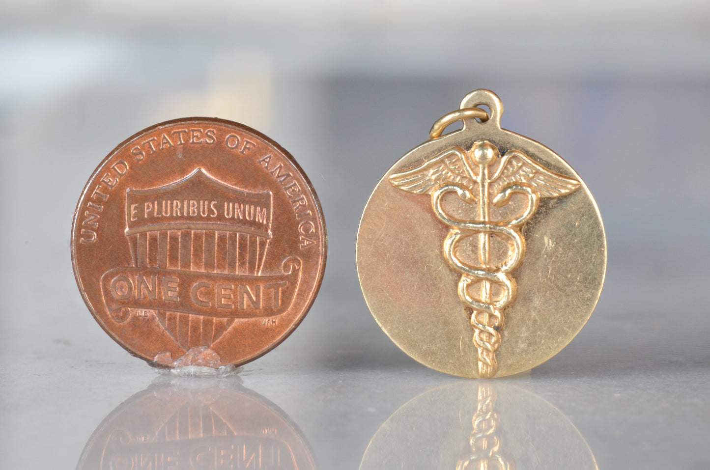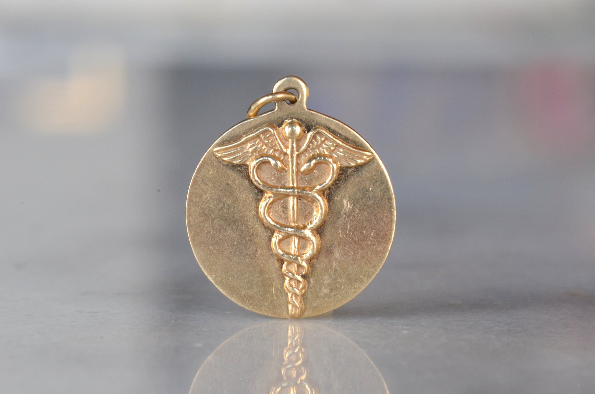 A beautiful and substantial rendition of a caduceus set upon a gold disc like a shining medallion. The caduceus has an interesting history in its association with the medical profession: historically, the caduceus - a winged rod entwined by two snakes - was the symbol of Hermes, the messenger god. The simple staff with a single snake coiling it, the Rod of Asclepius, was the symbol of the god of medicine and healing. Their similar appearance has often led to confusion, further cemented by the late 19th century adoption of the caduceus by the US Army for their medical corps, which lead to its spread (mostly in the USA) throughout medical and related fields to this day.