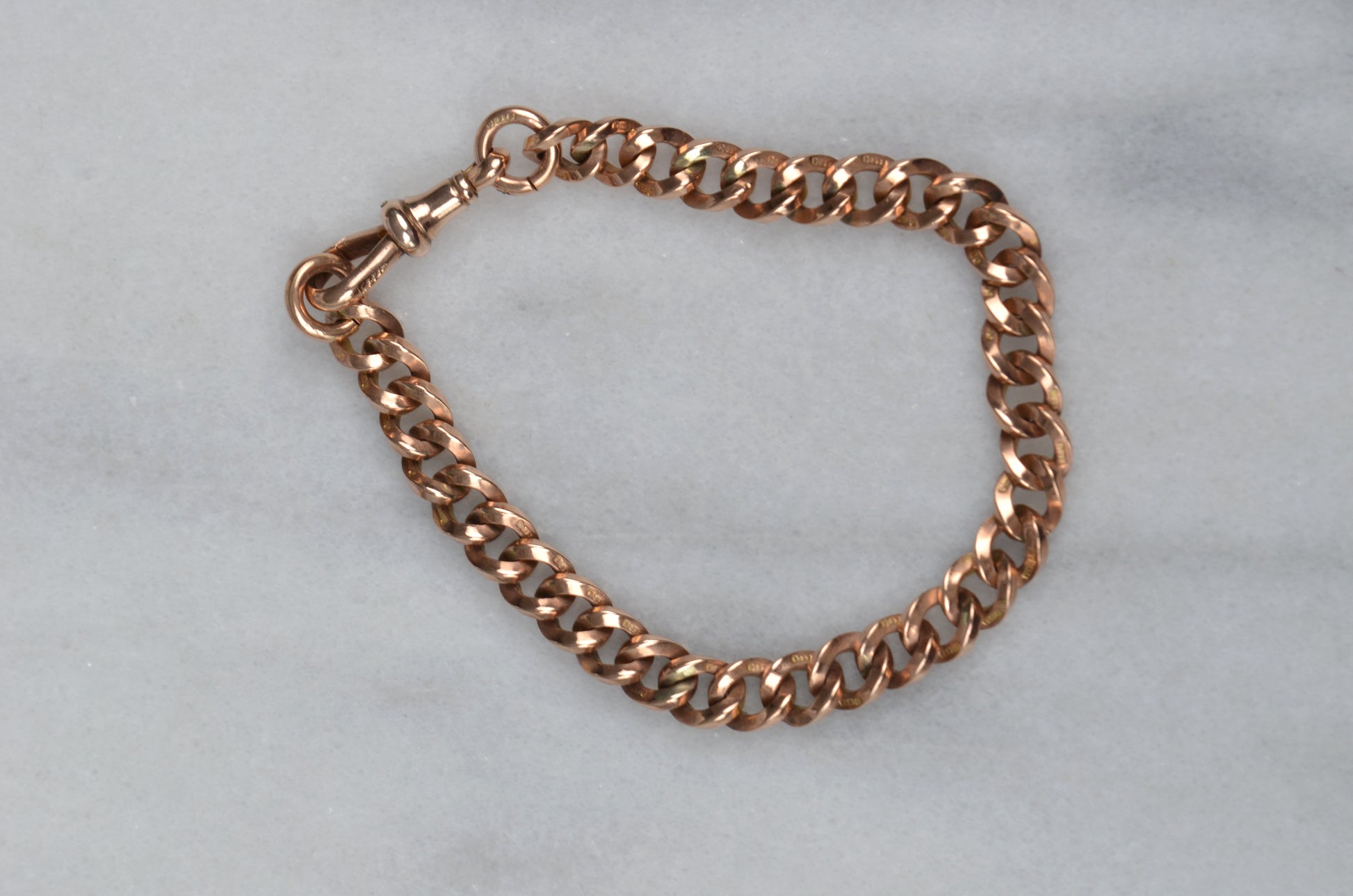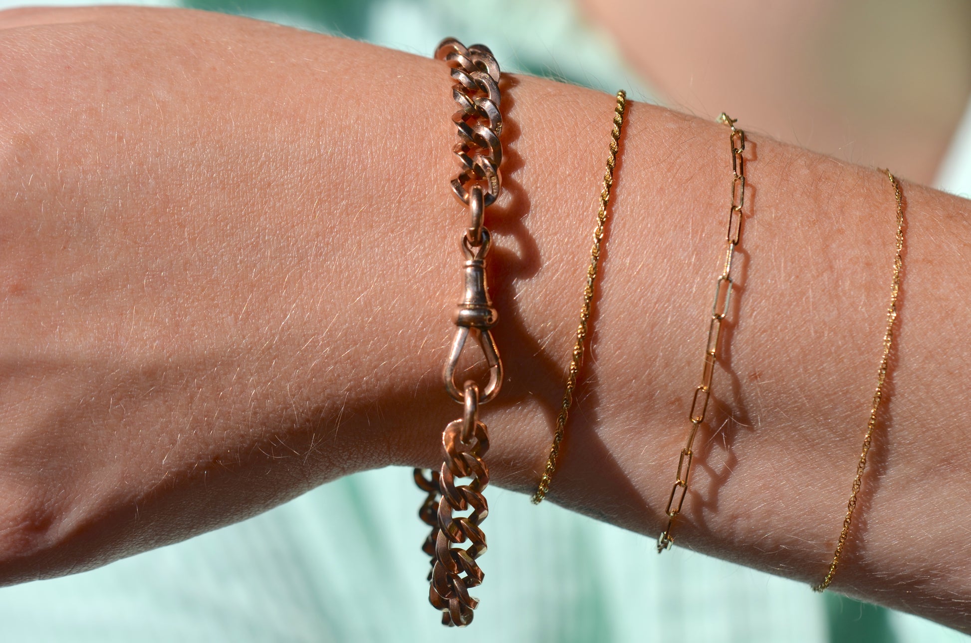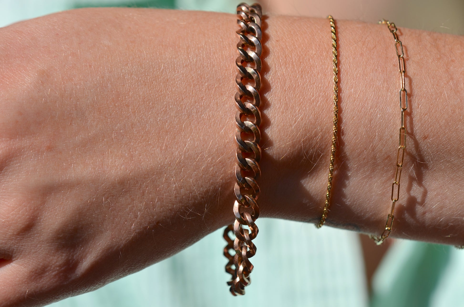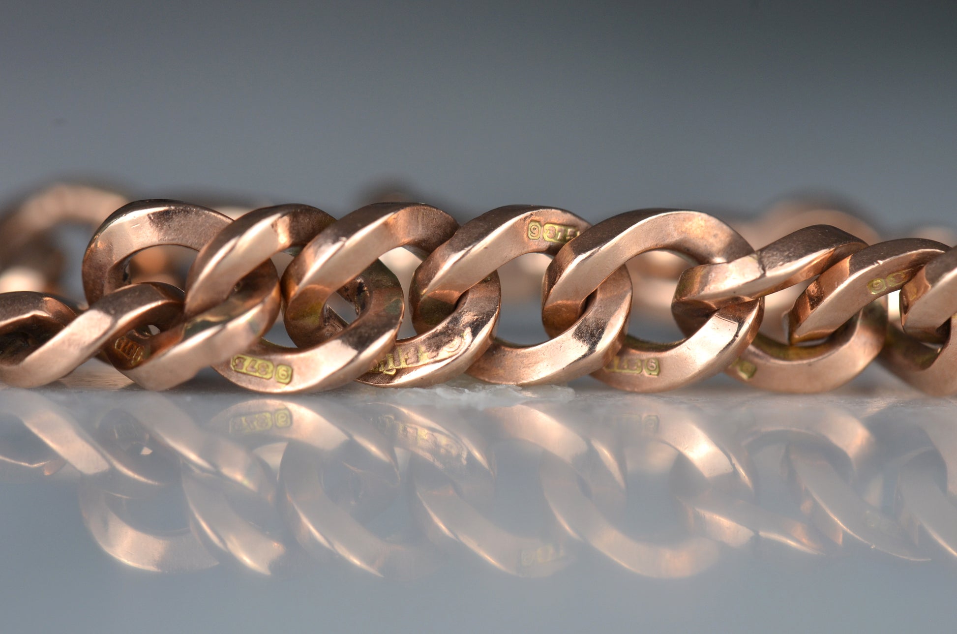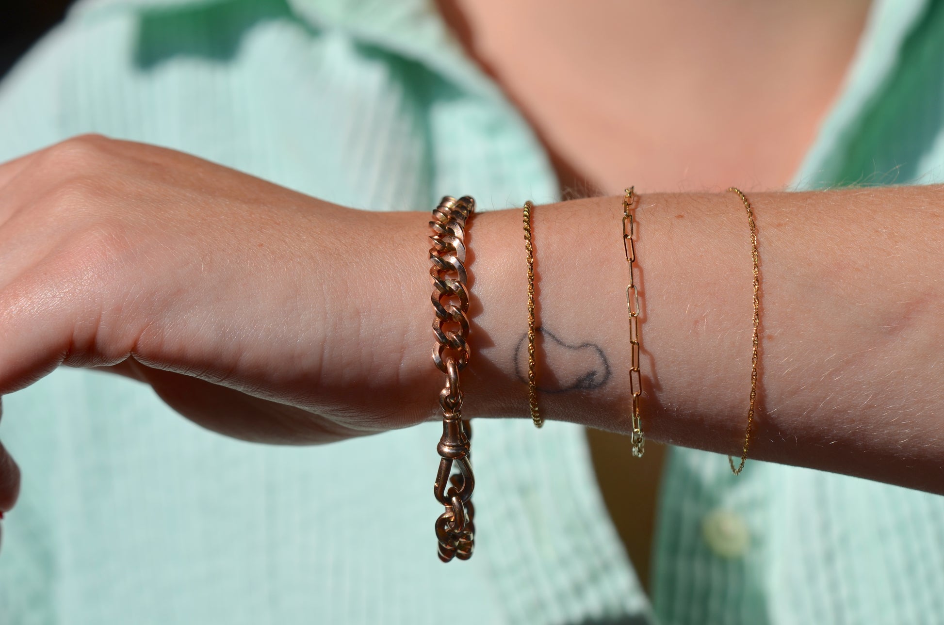 Bold and weighty, this is a bracelet you'll never forget you're wearing - in the best way possible. Rich, squared-off curb links are catch the light on the wrist while the dog clip closure allows you to easily adjust the length and fit, and easily add a charm or two. At an adjustable 7.75", this bracelet is suitable for any wrist, while the heavy form suits many styles. Crafted in solid, heavy 9k gold, this once more yellow chain has developed a beautiful patina over time, with the copper content in the gold alloy giving it a warm rosy finish.