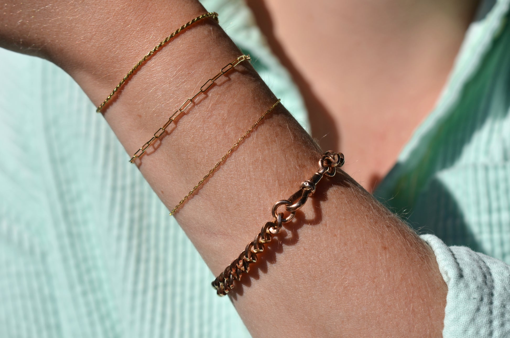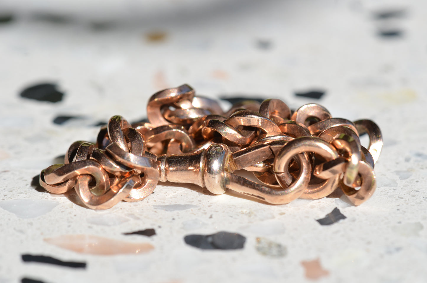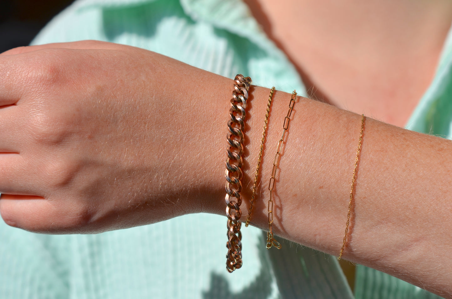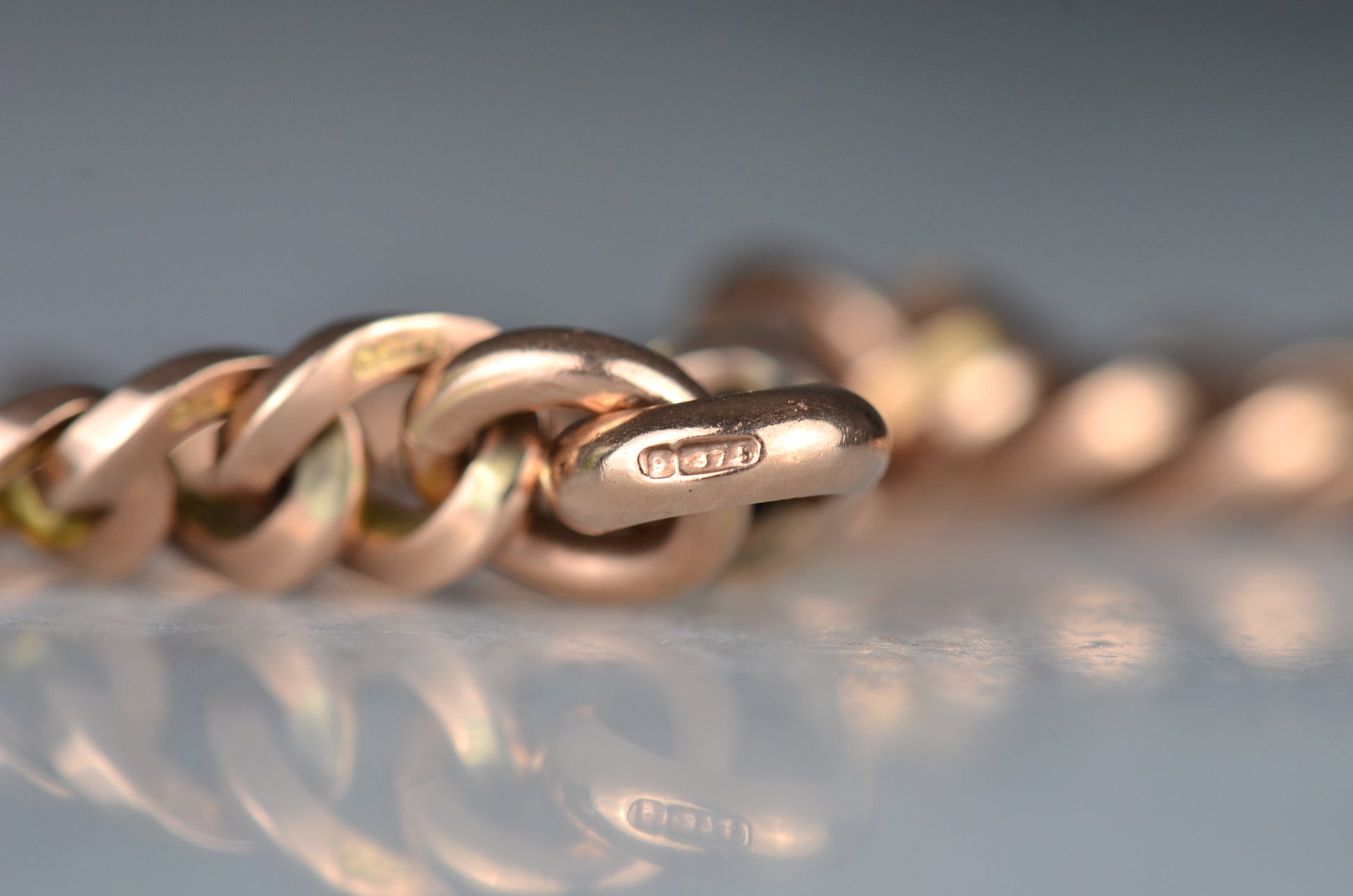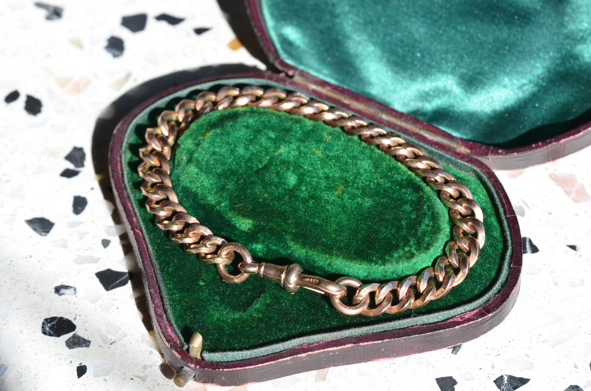Bold and weighty, this is a bracelet you'll never forget you're wearing - in the best way possible. Rich, squared-off curb links are catch the light on the wrist while the dog clip closure allows you to easily adjust the length and fit, and easily add a charm or two. At an adjustable 7.75", this bracelet is suitable for any wrist, while the heavy form suits many styles. Crafted in solid, heavy 9k gold, this once more yellow chain has developed a beautiful patina over time, with the copper content in the gold alloy giving it a warm rosy finish.