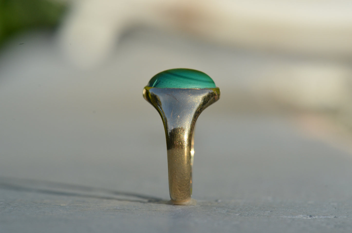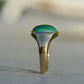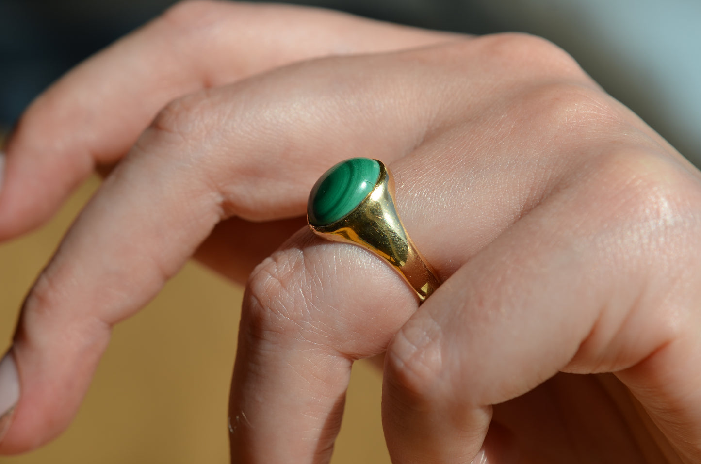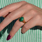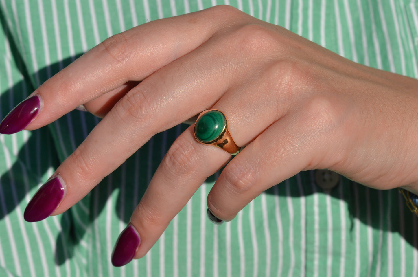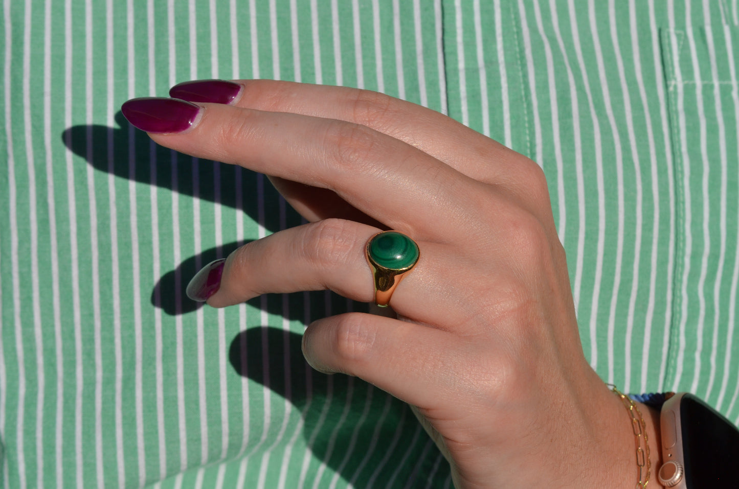 There is something so dreamy about the specific, defined banding of malachite - at once earthy and otherworldly, with an oh-so-subtle sheen. The simple gold bezel and signet-style mount make the stone the focal point of this comfortable midcentury ring.