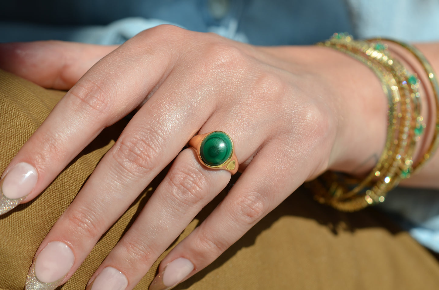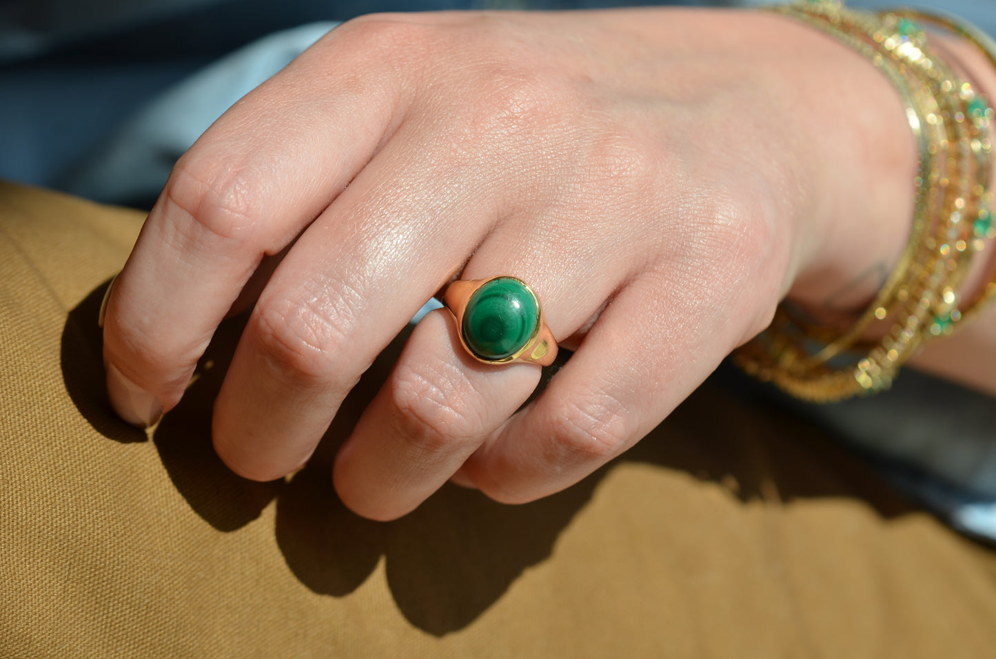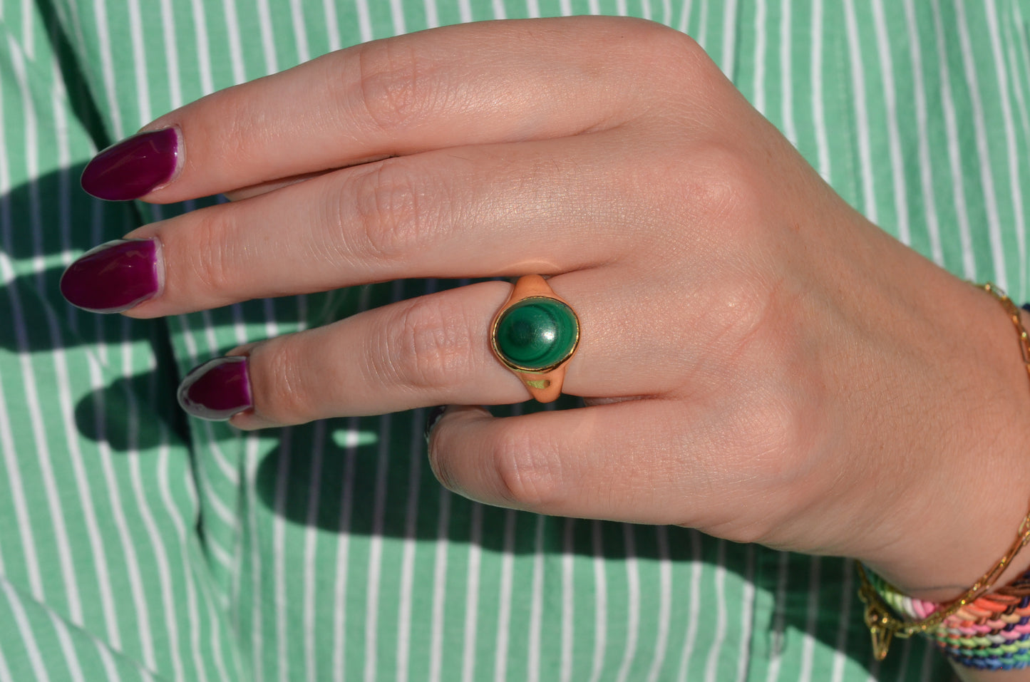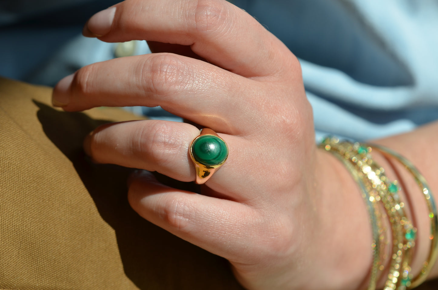 There is something so dreamy about the specific, defined banding of malachite - at once earthy and otherworldly, with an oh-so-subtle sheen. The simple gold bezel and signet-style mount make the stone the focal point of this comfortable midcentury ring.