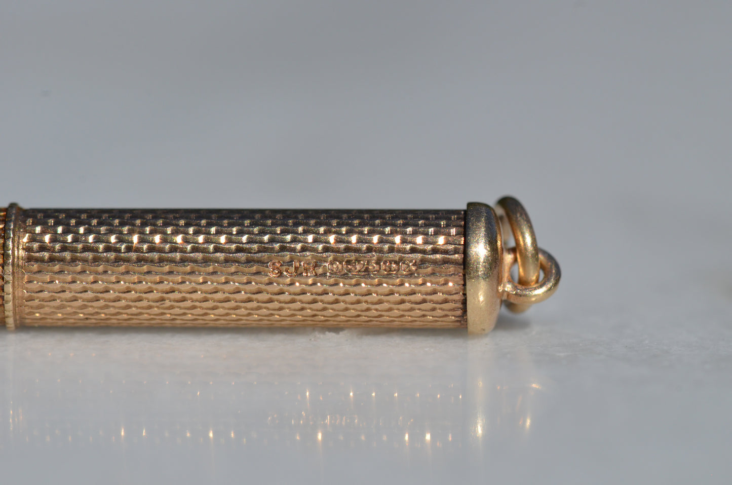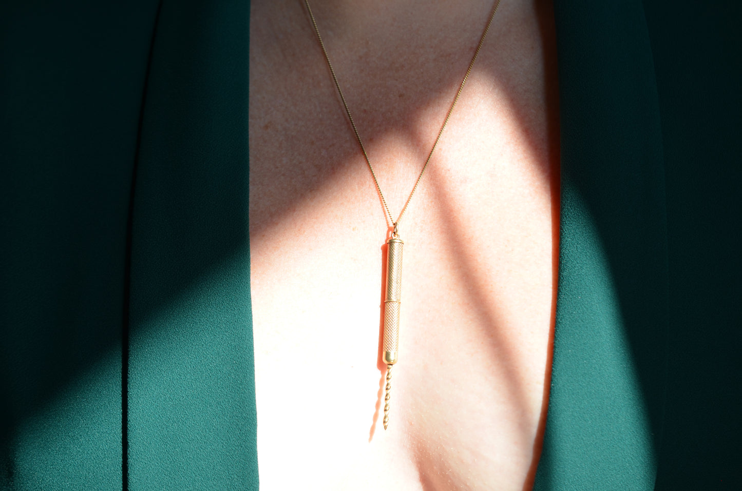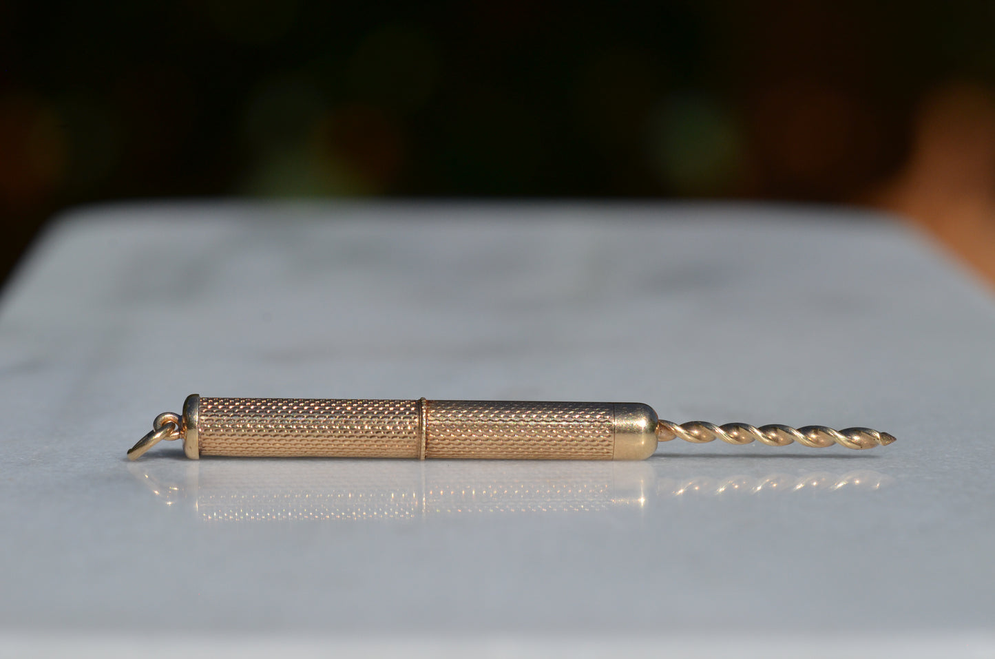 This positively glamorous object - a solid gold propelling toothpick, with a swirling, hypnotic form - calls to mind a bygone era of items built to last a lifetime, while also communicating a certain something about the style and means of their owner. Though crafted in the 1970s, this piece feels like something more than half a century older, reminiscent of the popular Edwardian era retractable pencils before it, and even midcentury cocktail swizzlers styled as pendants. This dreamy article ensures that you'll never be caught looking any less than your best.