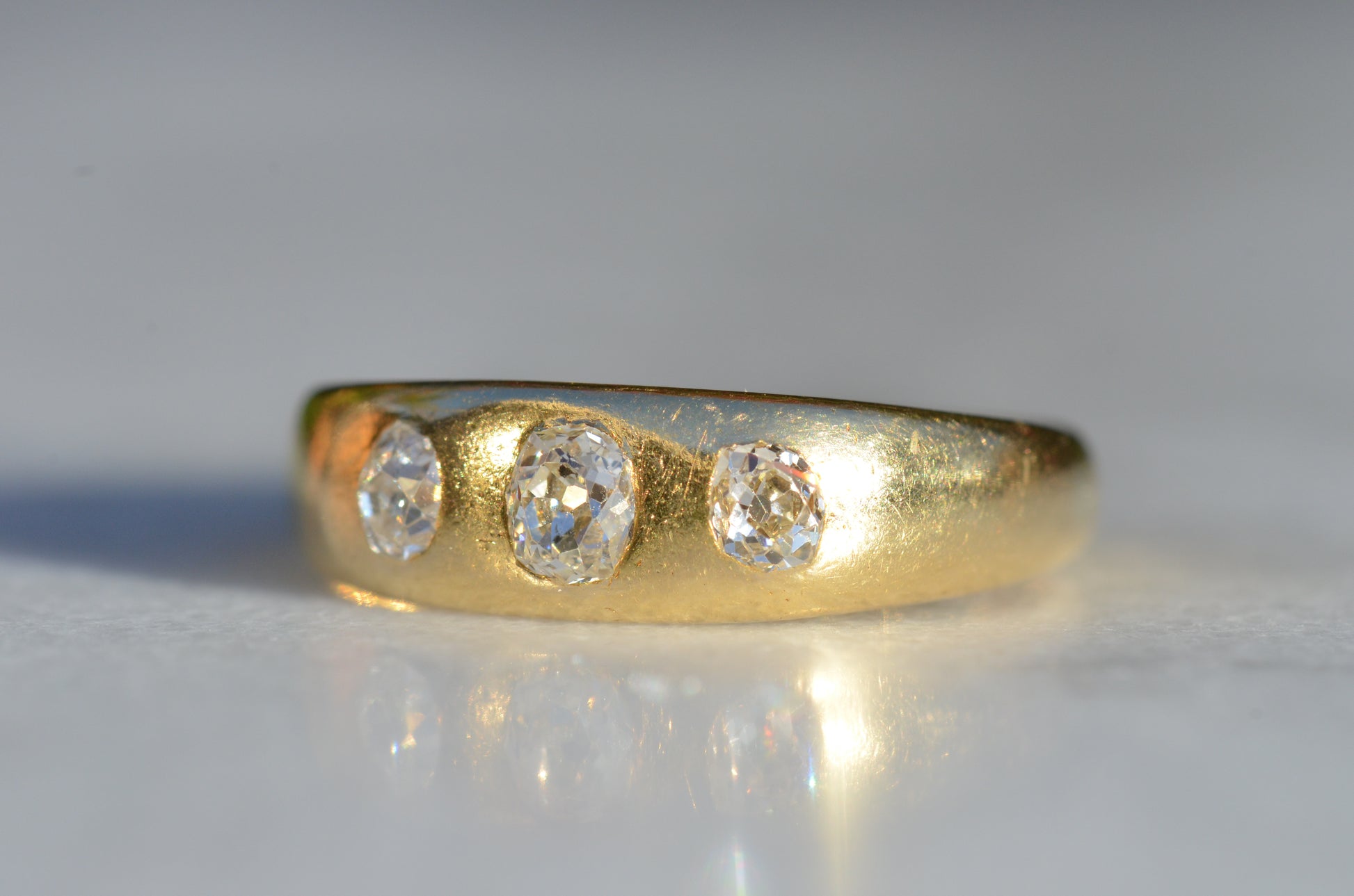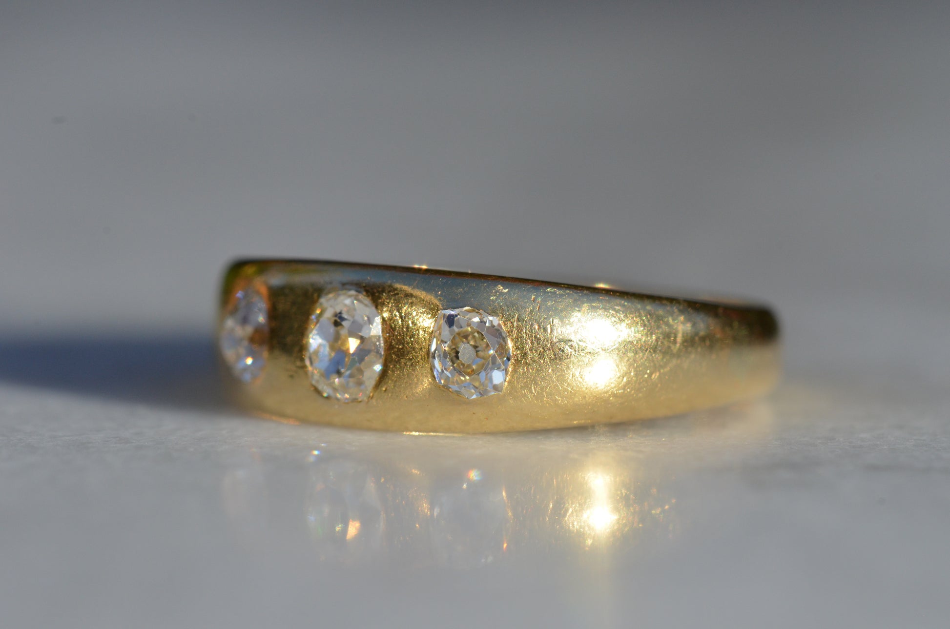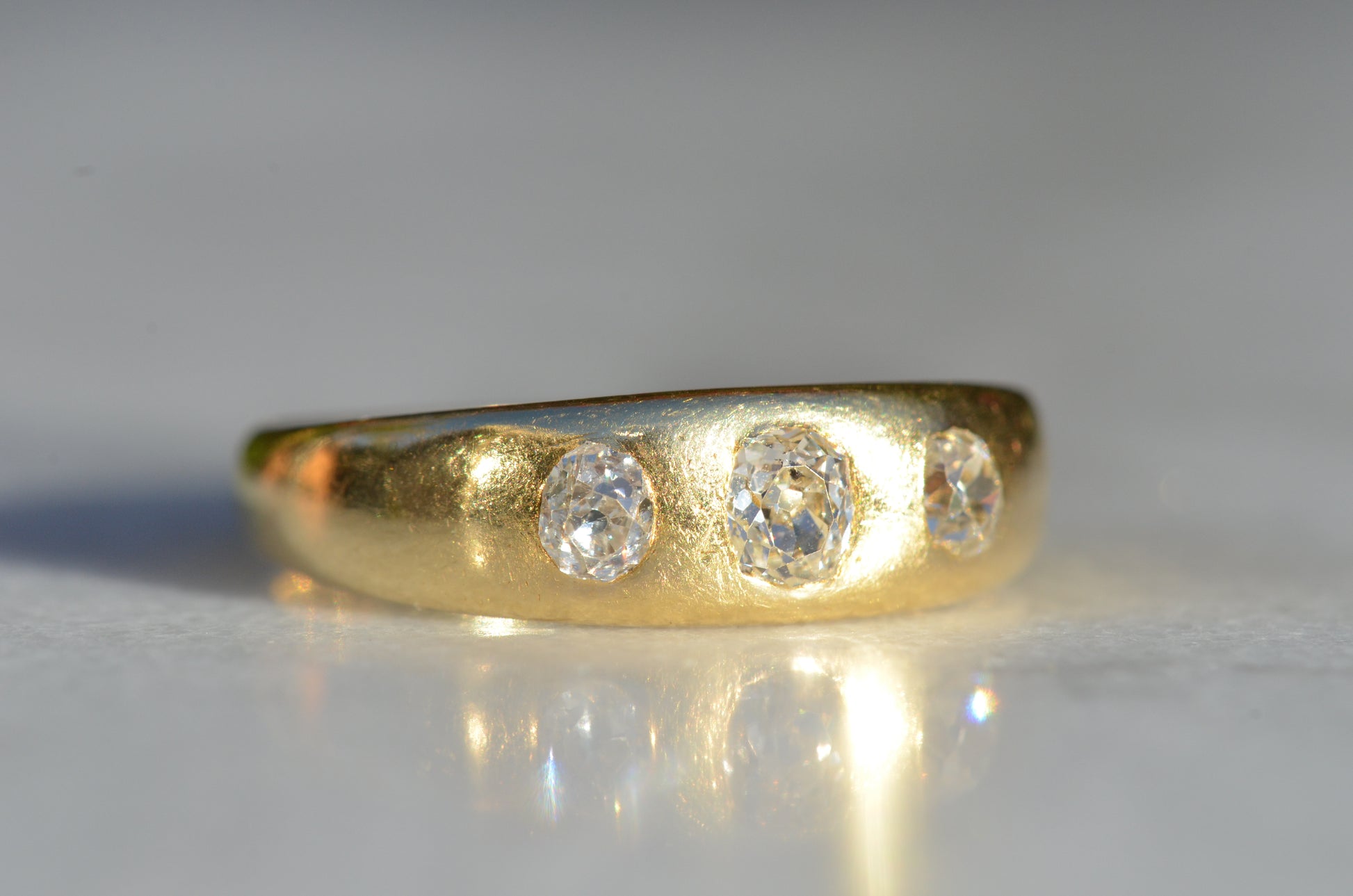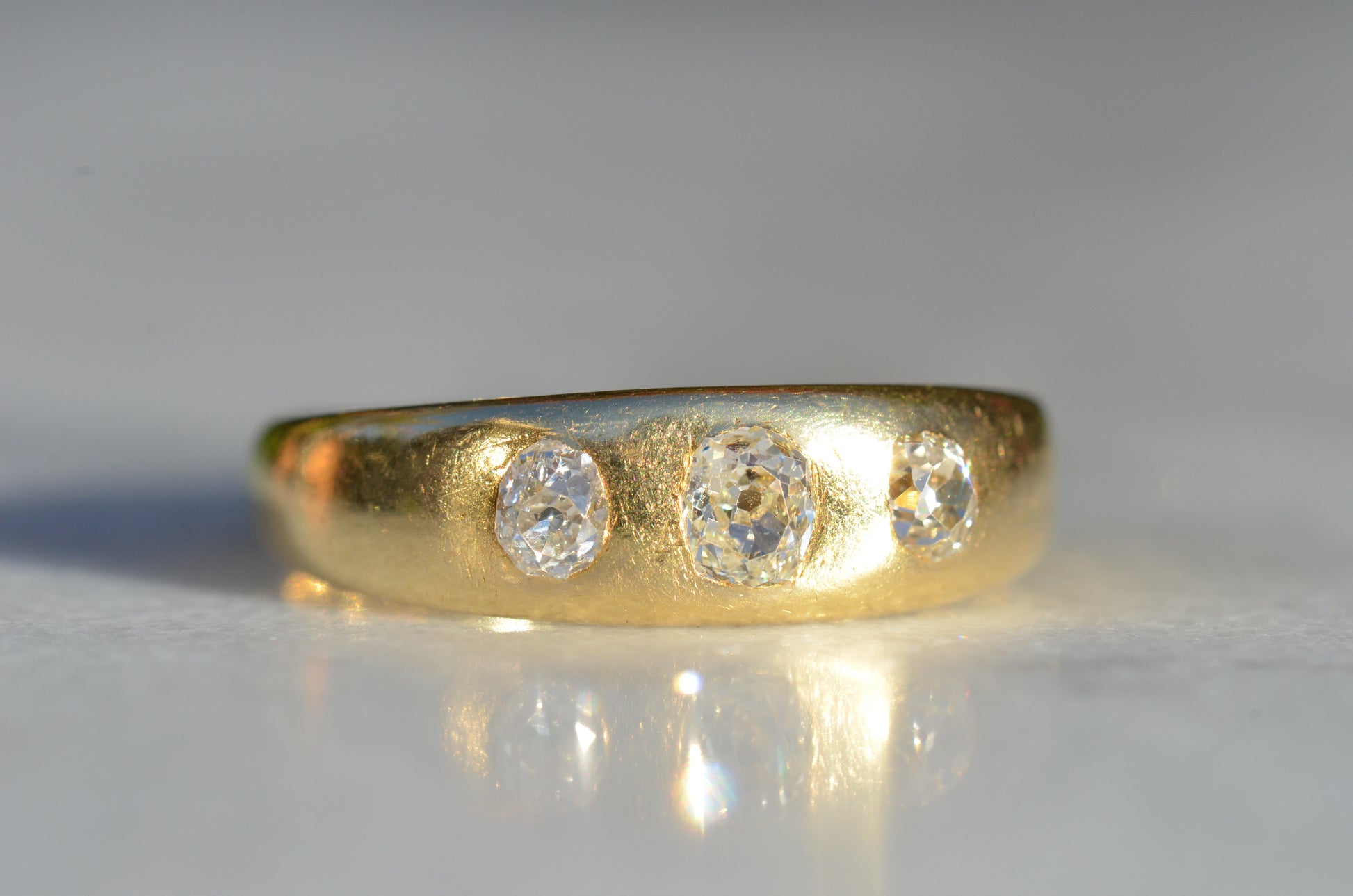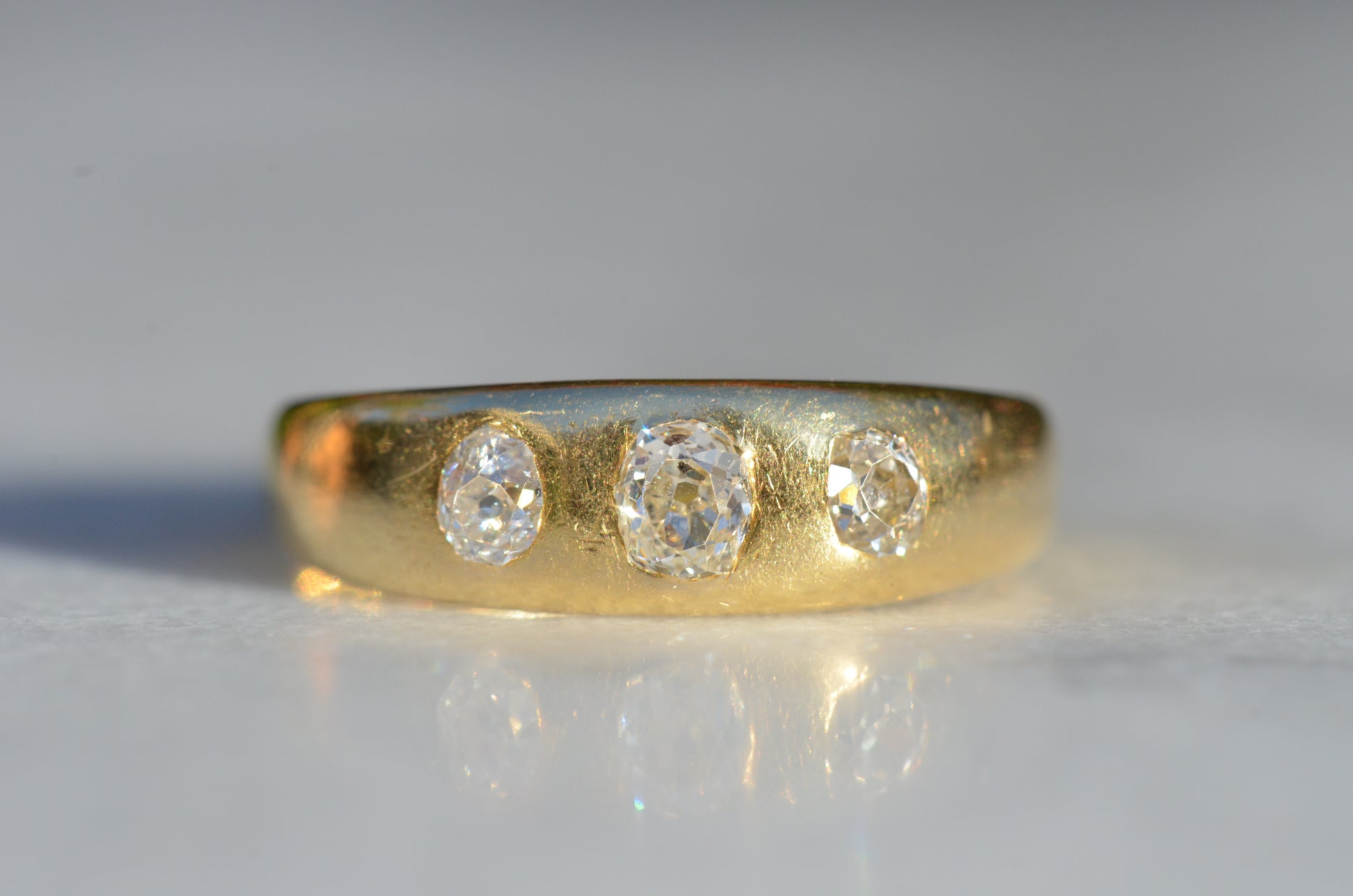 A soft and lovely ring in a classic Victorian style, featuring three old mine diamonds set flush into smooth burnished gold, wonderfully heavy yet low and slim on the finger. These flush set bands were popular among men and women alike in the later 19th and early 20th centuries, and continue to be a favourite among jewelry lovers today for their easy-wearing comfort and effortless style. Trilogy rings have likewise remained popular as romantic gifts, with each stone representing past, present, and future, but we also love them for celebrating your own milestones and achievements.