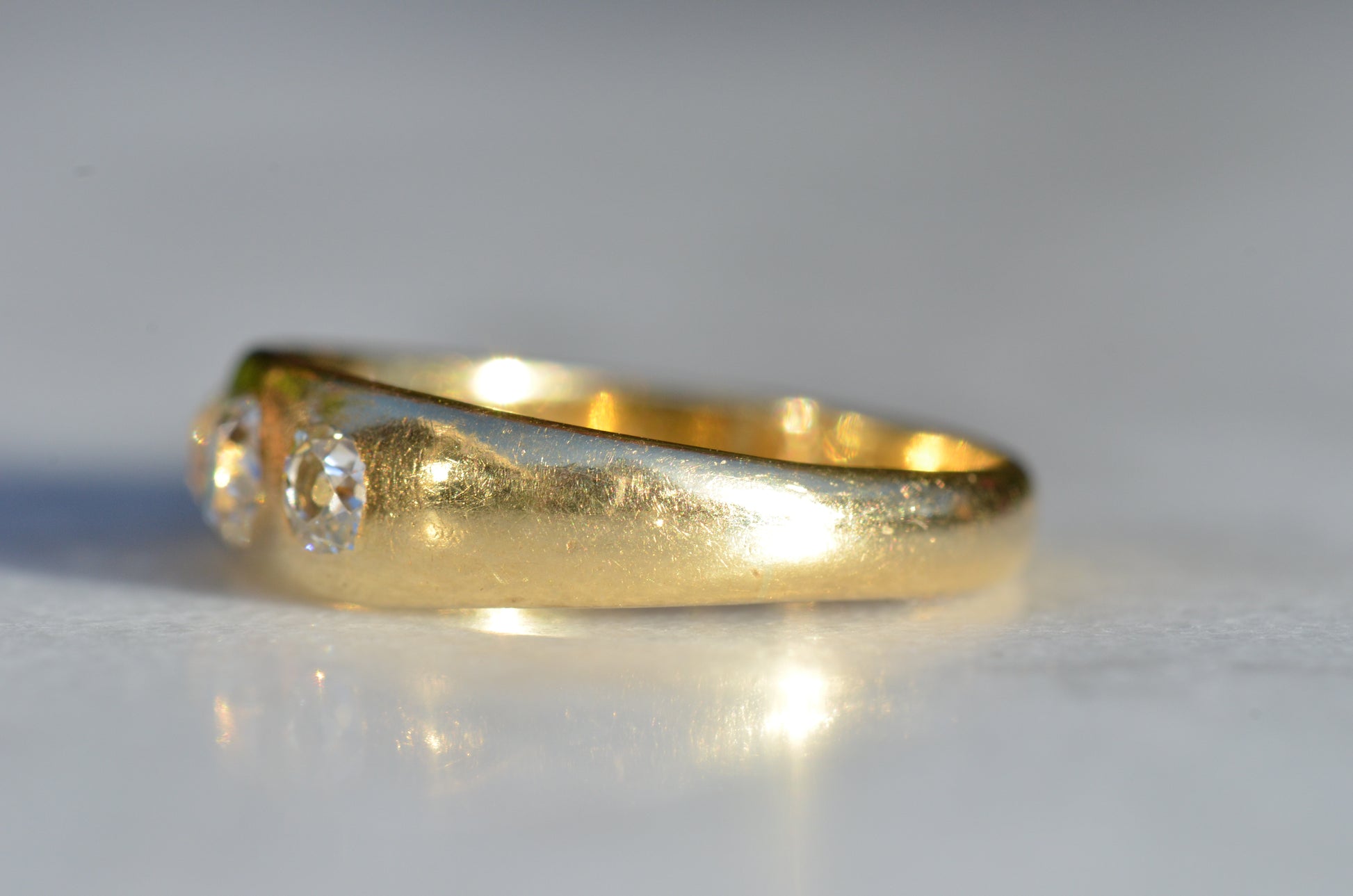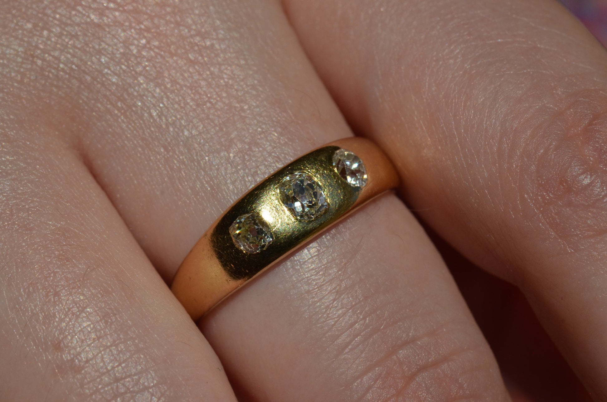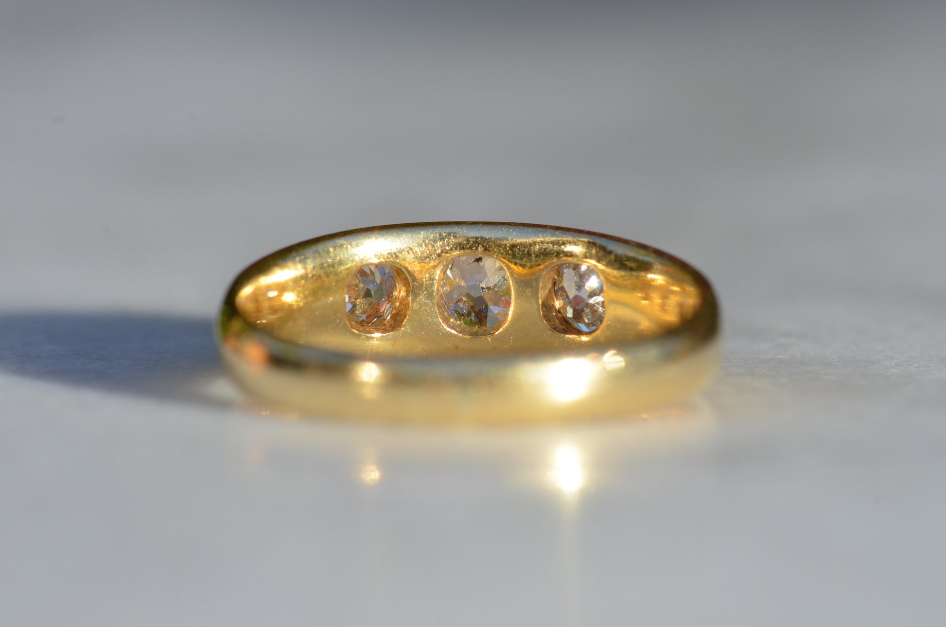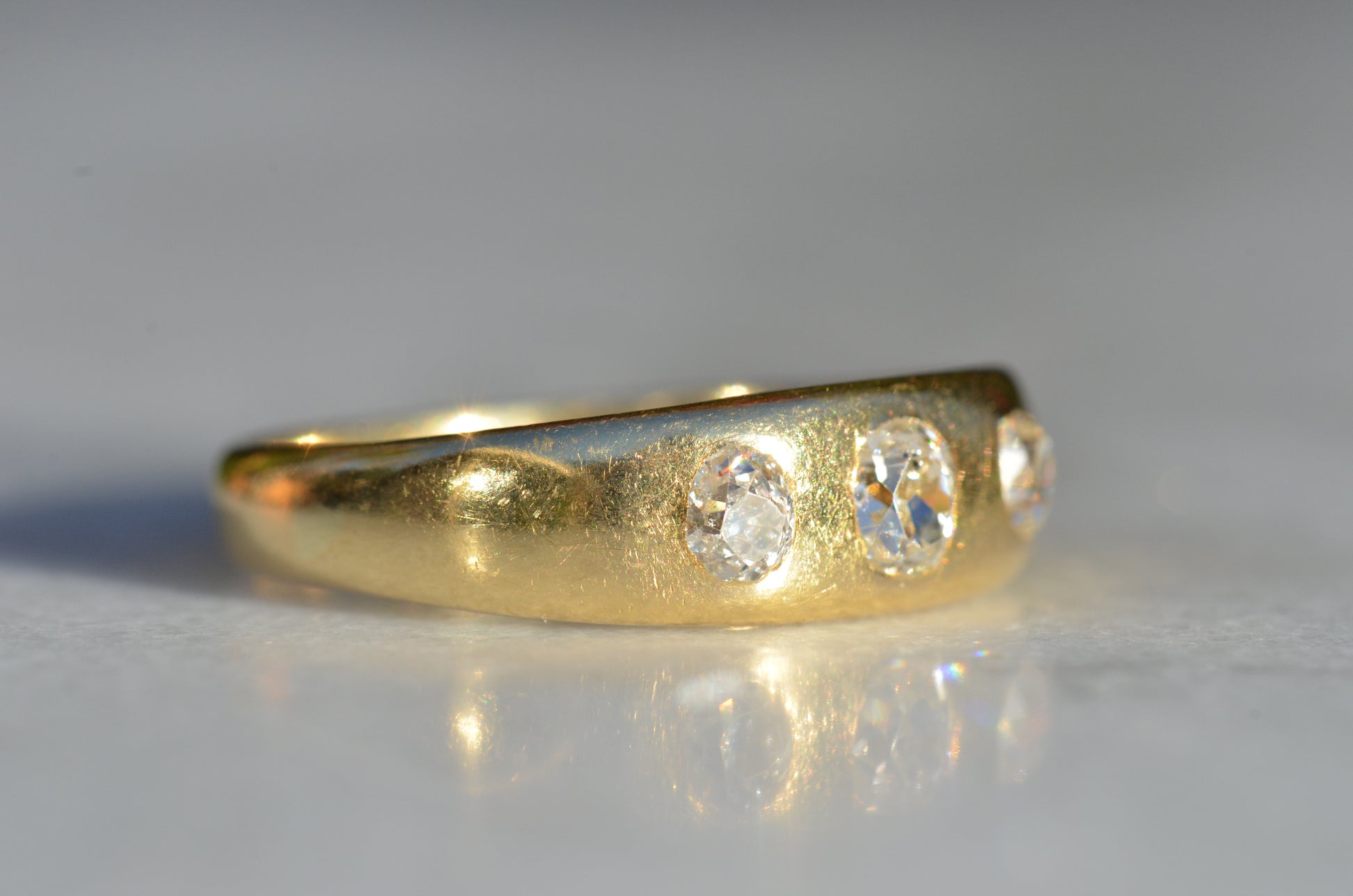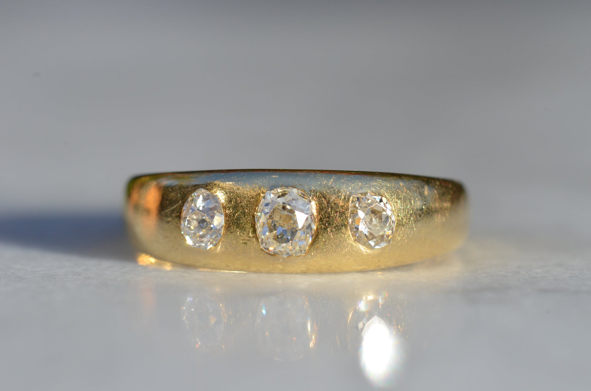 A soft and lovely ring in a classic Victorian style, featuring three old mine diamonds set flush into smooth burnished gold, wonderfully heavy yet low and slim on the finger. These flush set bands were popular among men and women alike in the later 19th and early 20th centuries, and continue to be a favourite among jewelry lovers today for their easy-wearing comfort and effortless style. Trilogy rings have likewise remained popular as romantic gifts, with each stone representing past, present, and future, but we also love them for celebrating your own milestones and achievements.