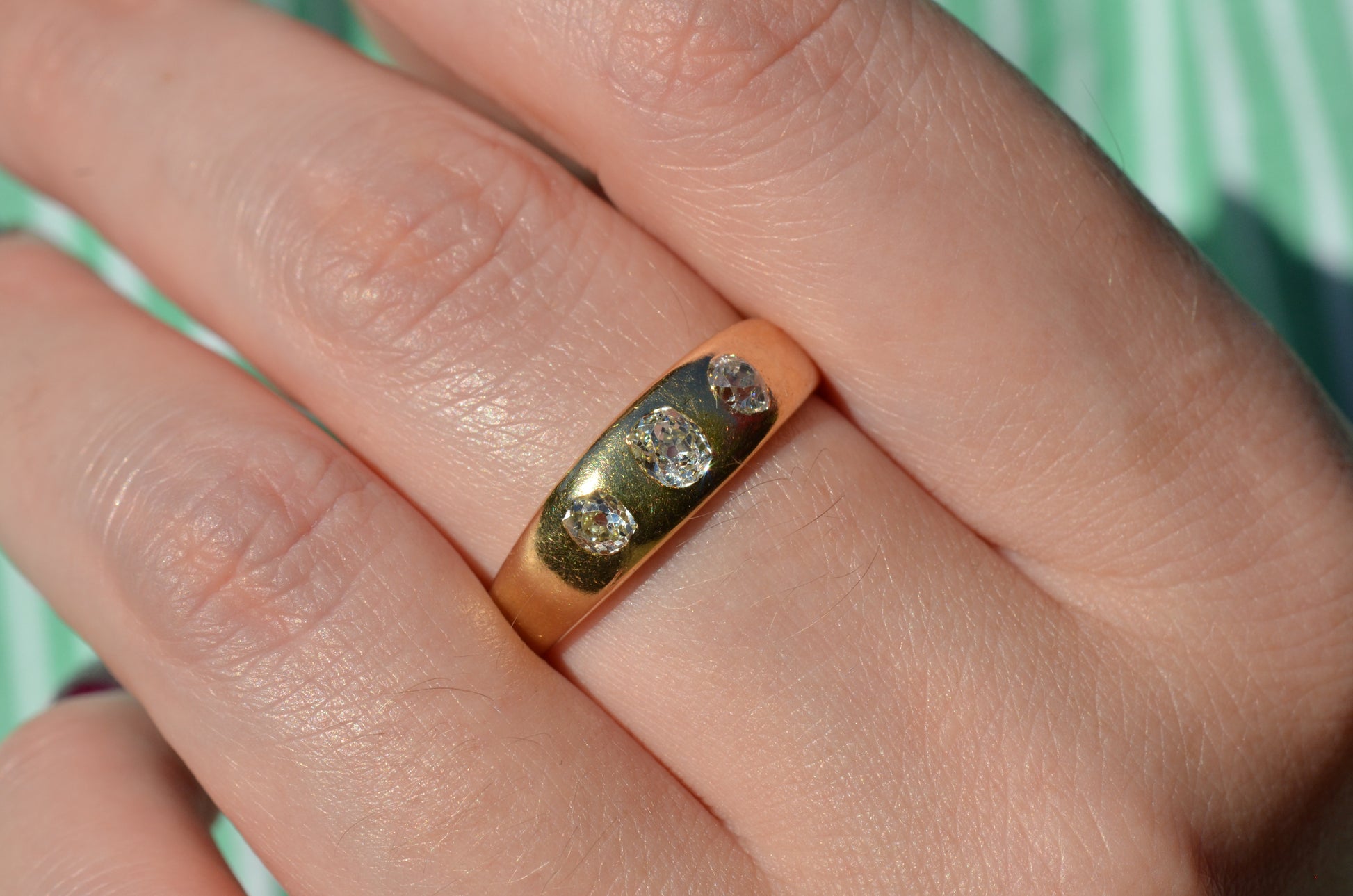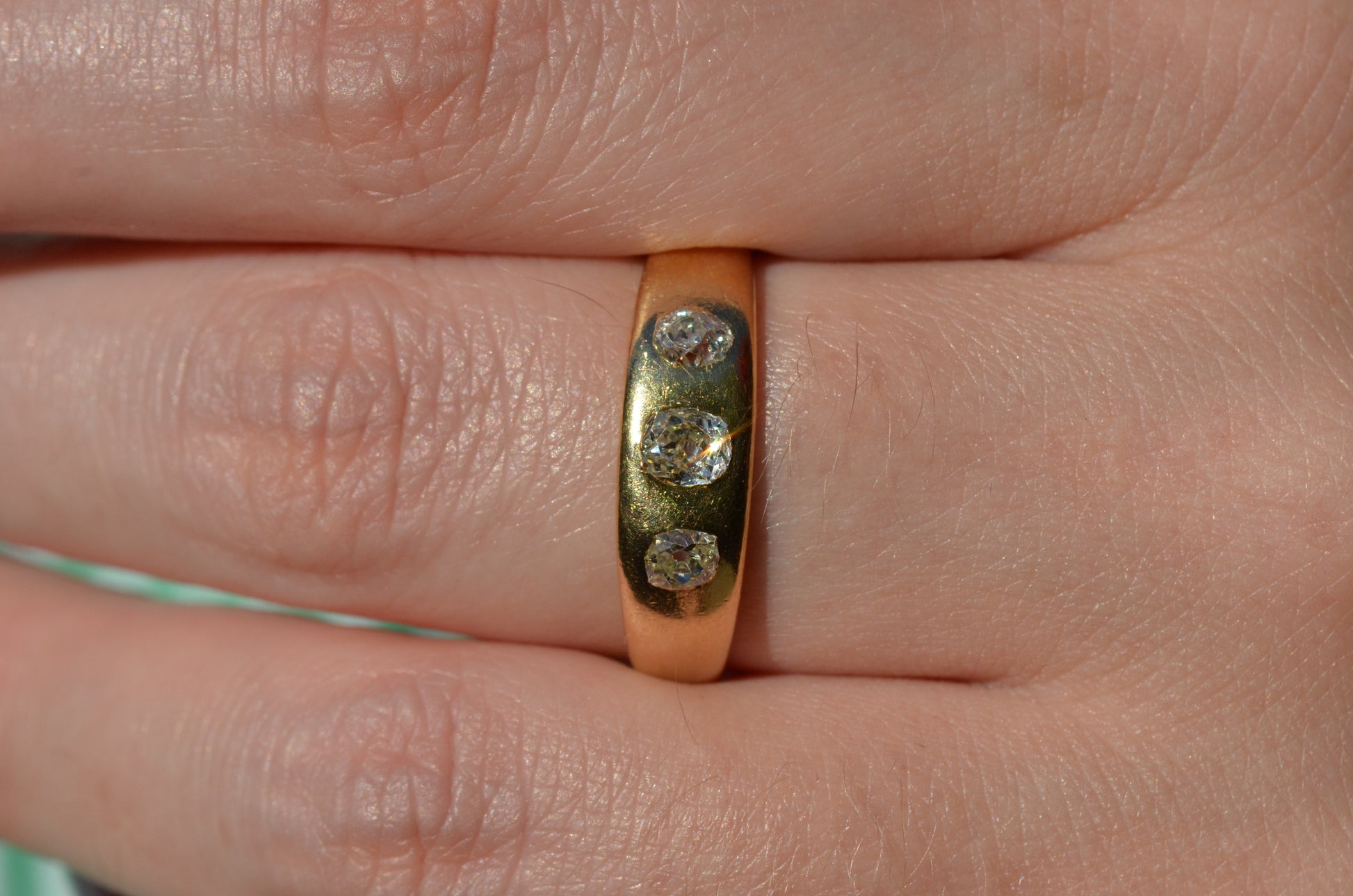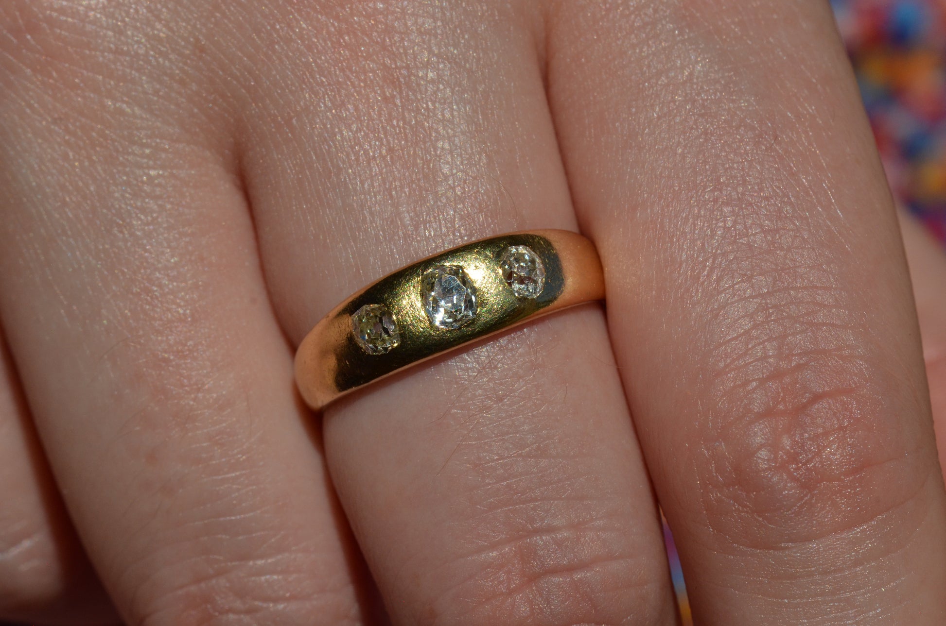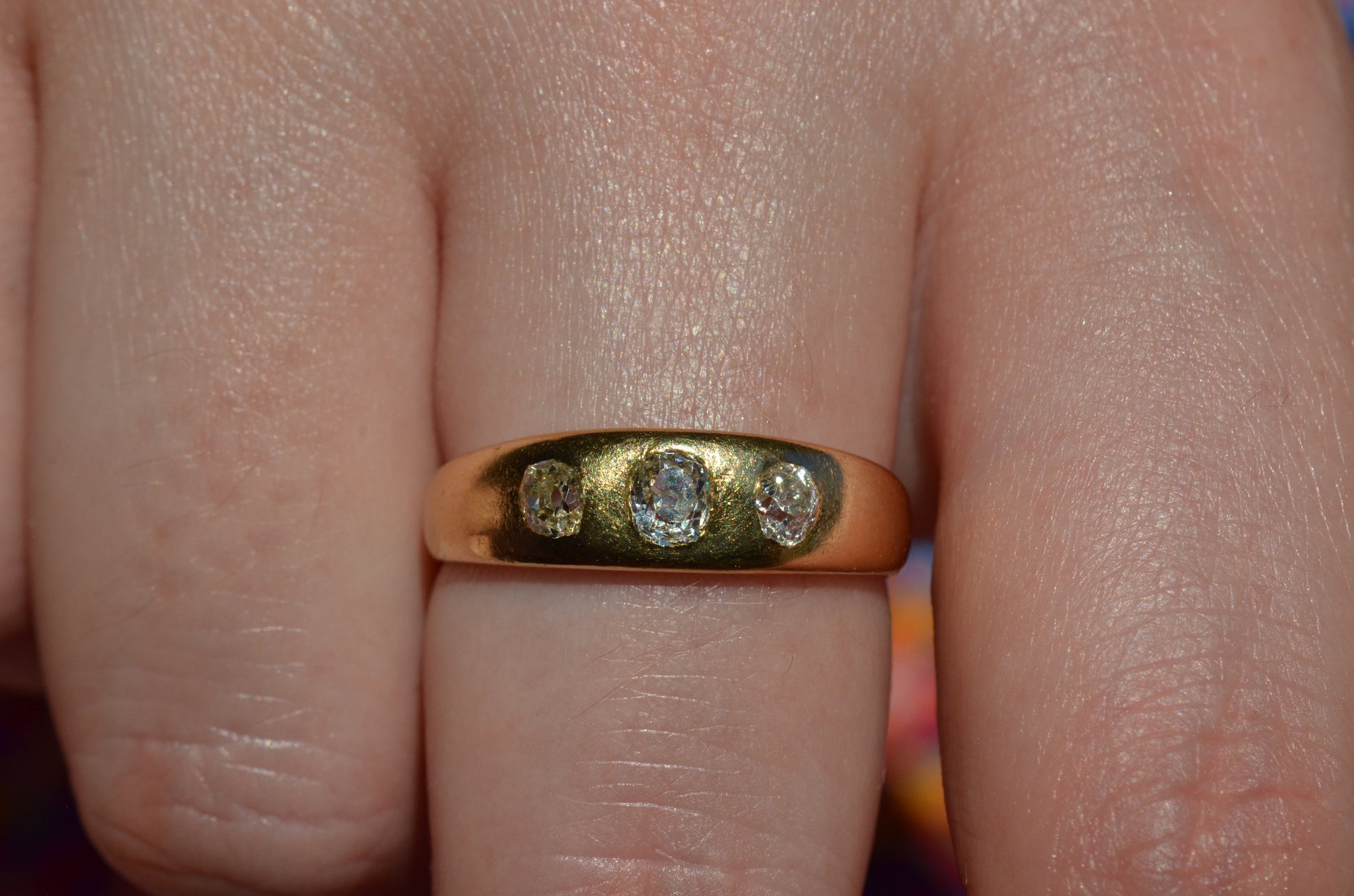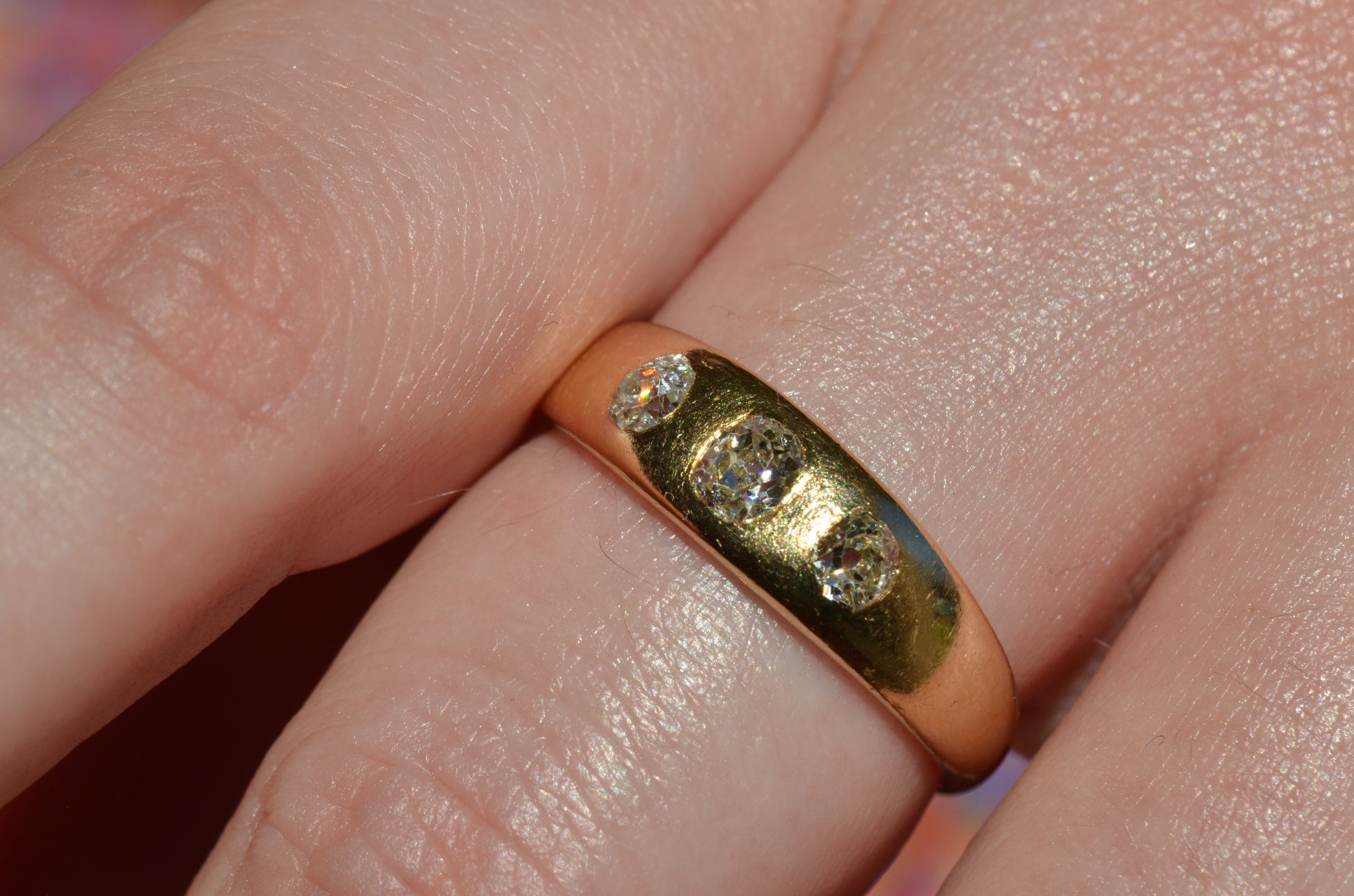 A soft and lovely ring in a classic Victorian style, featuring three old mine diamonds set flush into smooth burnished gold, wonderfully heavy yet low and slim on the finger. These flush set bands were popular among men and women alike in the later 19th and early 20th centuries, and continue to be a favourite among jewelry lovers today for their easy-wearing comfort and effortless style. Trilogy rings have likewise remained popular as romantic gifts, with each stone representing past, present, and future, but we also love them for celebrating your own milestones and achievements.