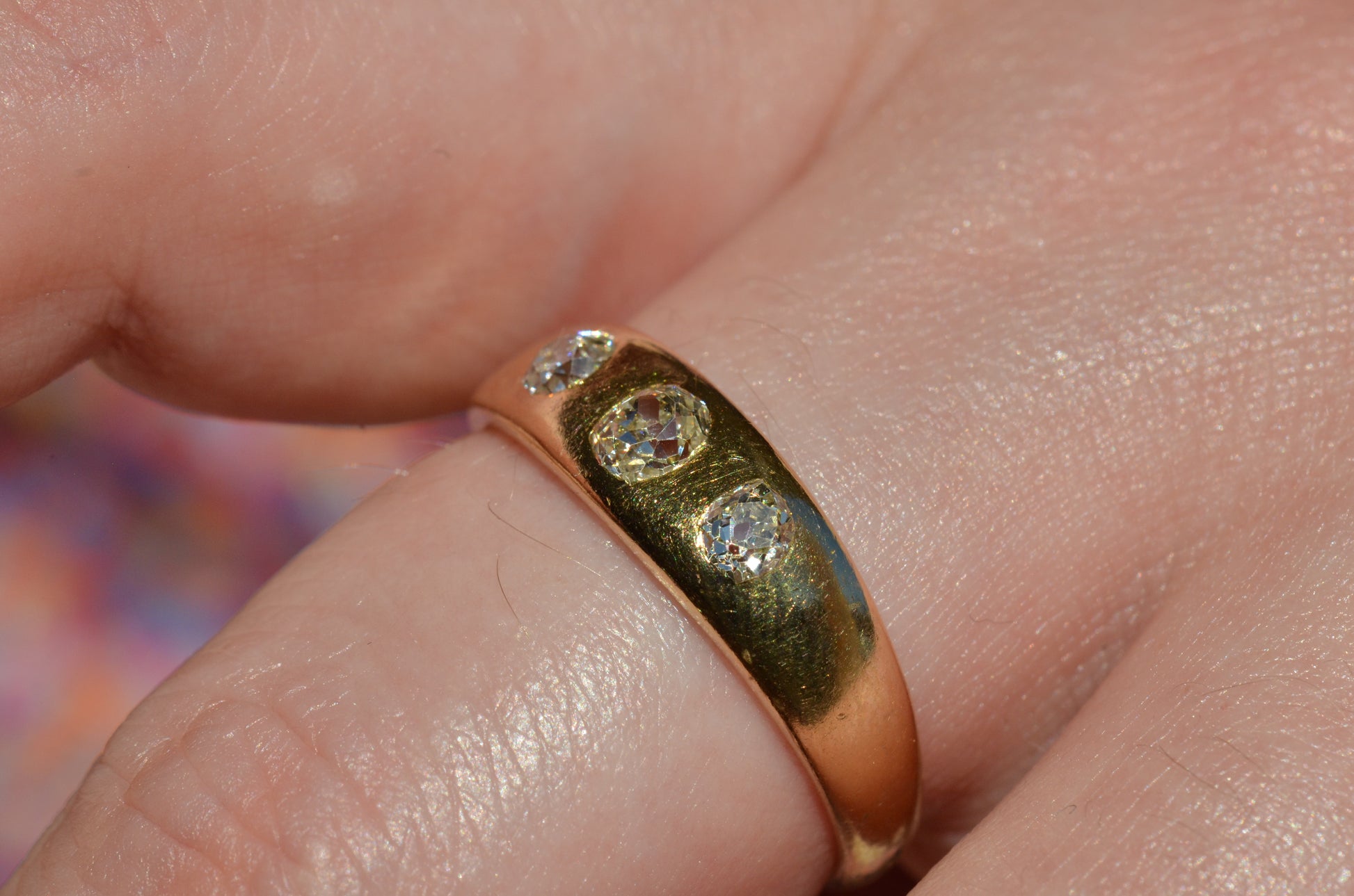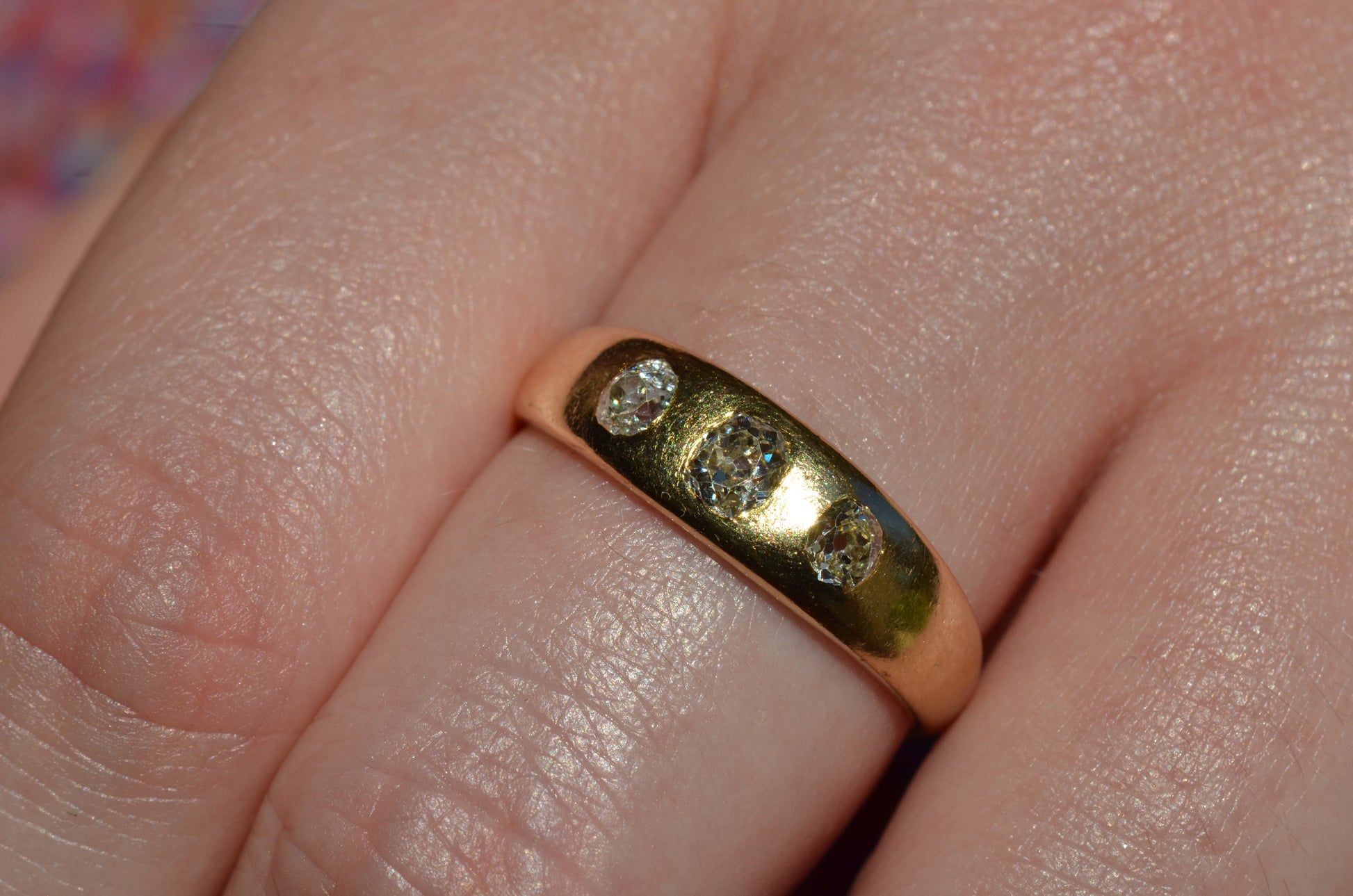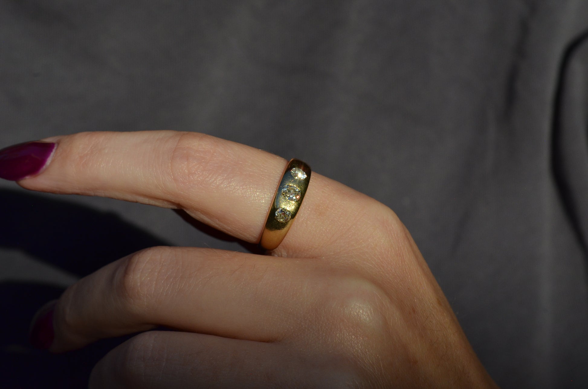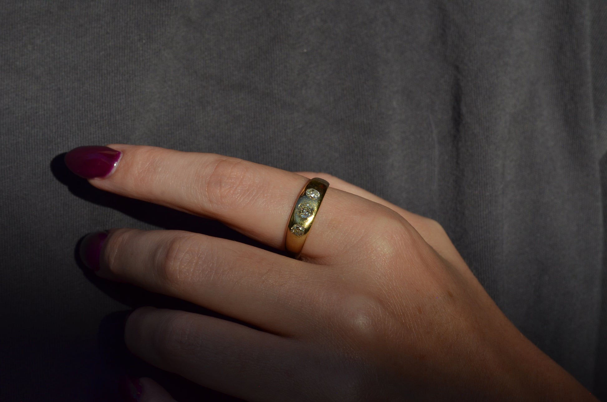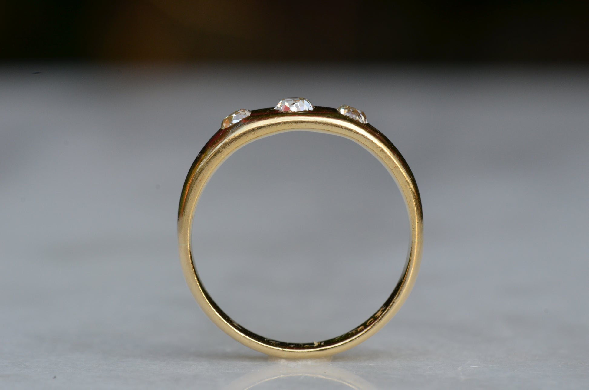 A soft and lovely ring in a classic Victorian style, featuring three old mine diamonds set flush into smooth burnished gold, wonderfully heavy yet low and slim on the finger. These flush set bands were popular among men and women alike in the later 19th and early 20th centuries, and continue to be a favourite among jewelry lovers today for their easy-wearing comfort and effortless style. Trilogy rings have likewise remained popular as romantic gifts, with each stone representing past, present, and future, but we also love them for celebrating your own milestones and achievements.