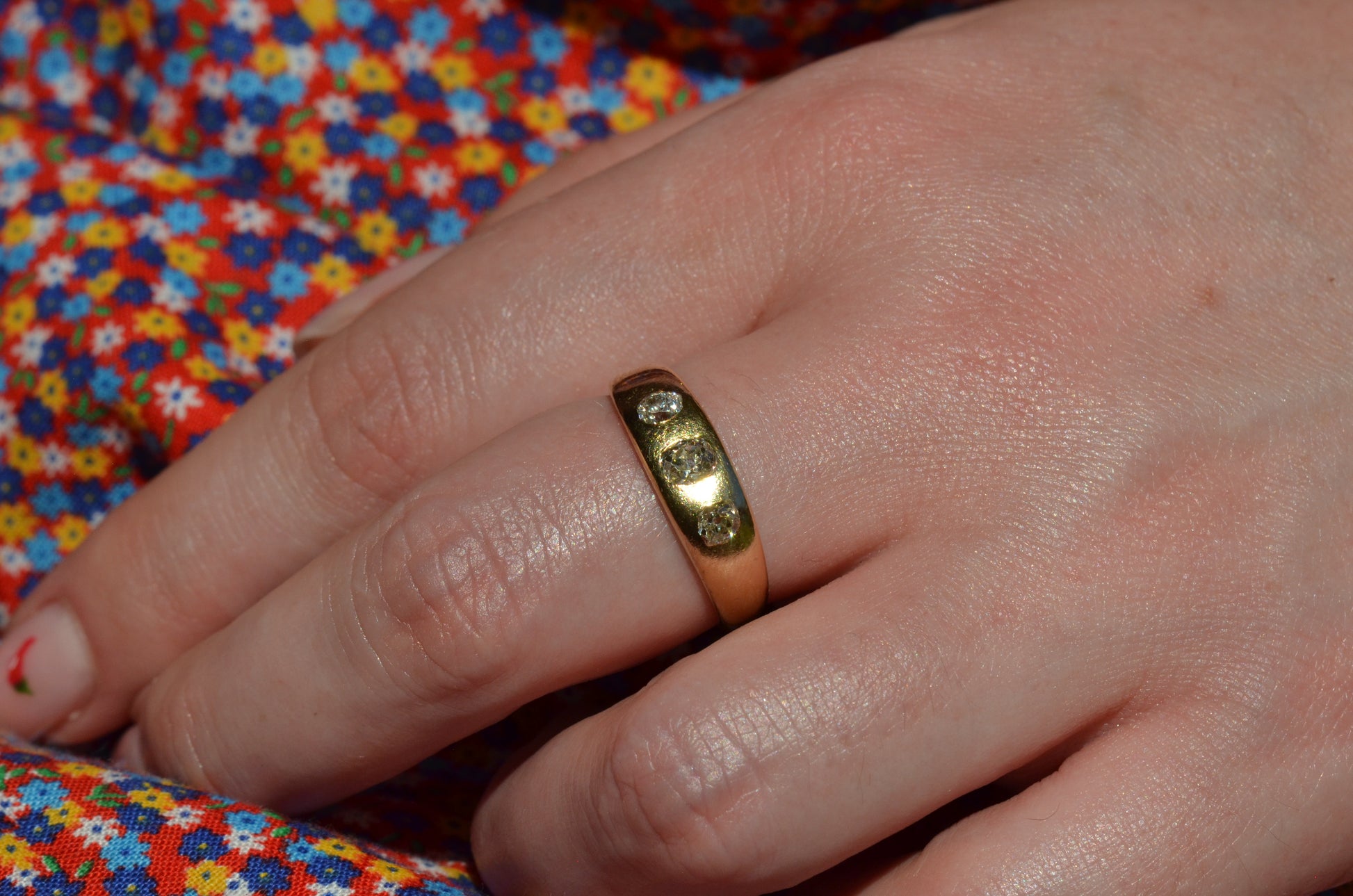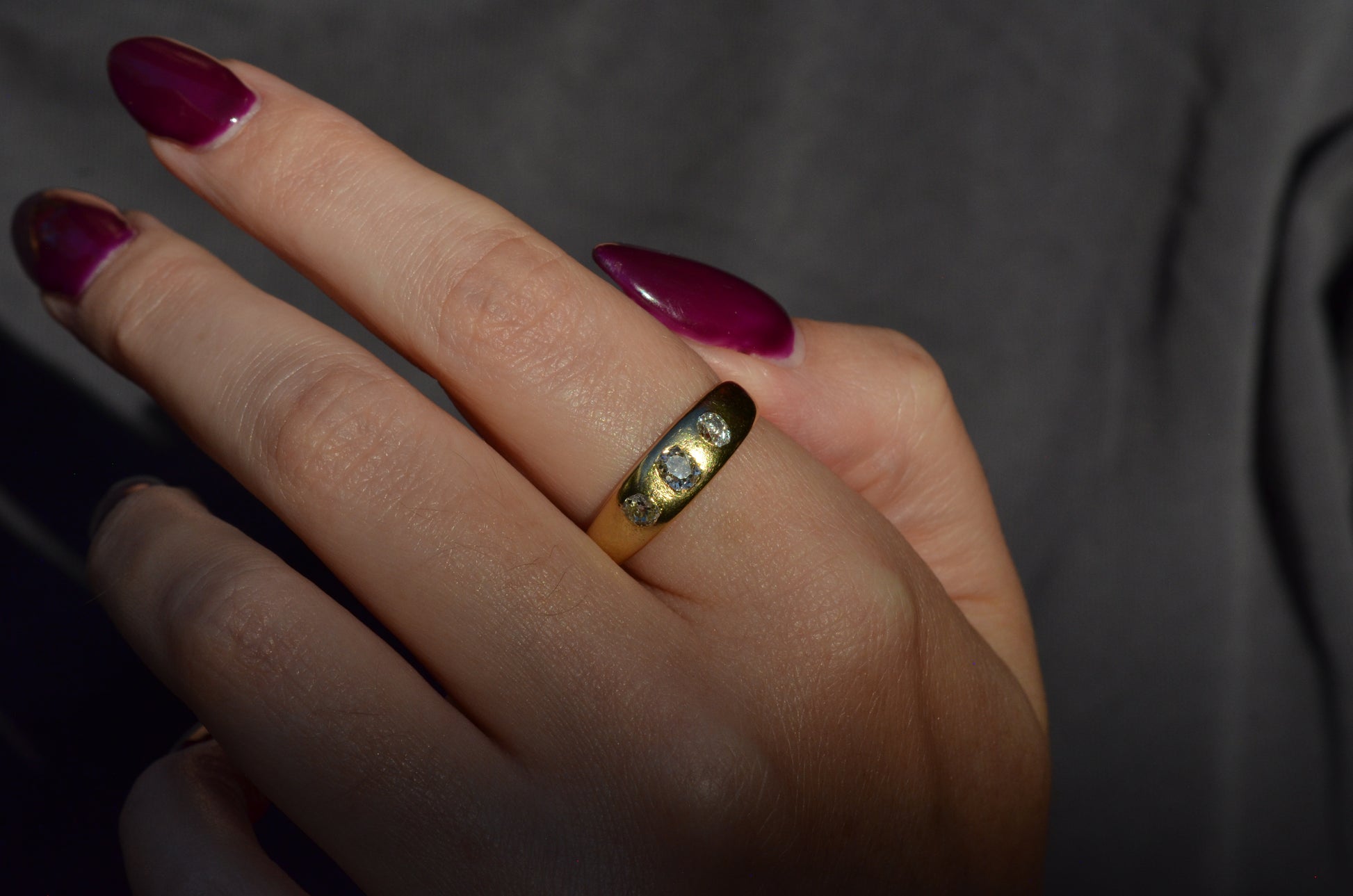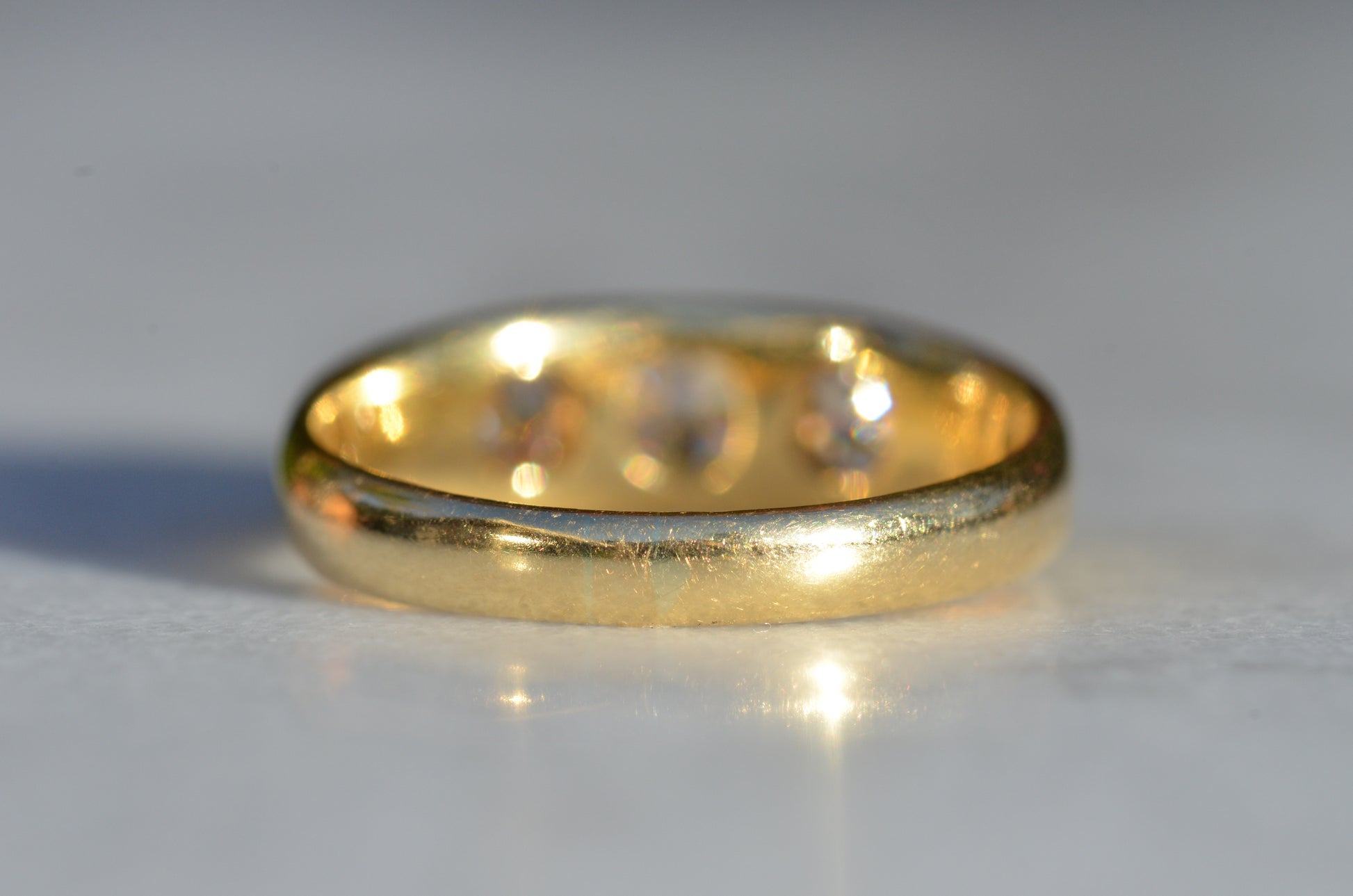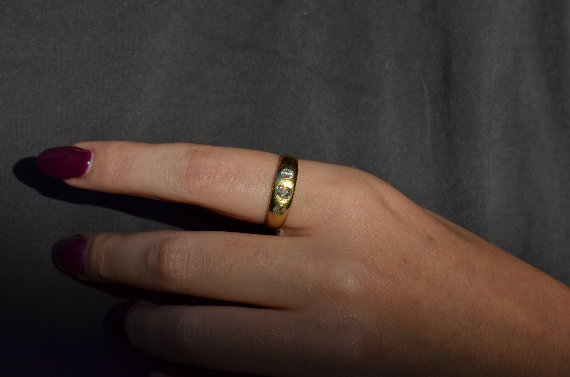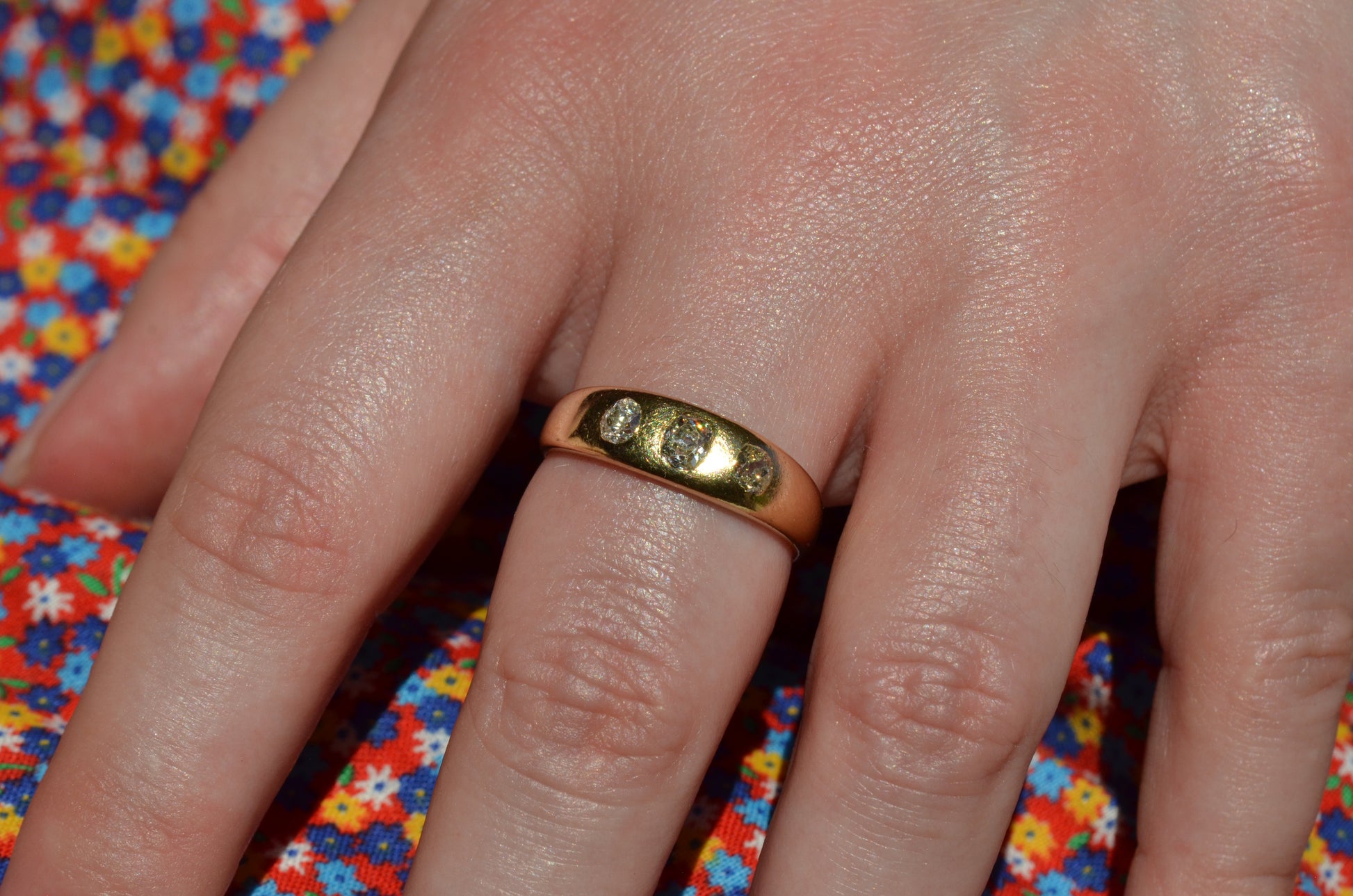 A soft and lovely ring in a classic Victorian style, featuring three old mine diamonds set flush into smooth burnished gold, wonderfully heavy yet low and slim on the finger. These flush set bands were popular among men and women alike in the later 19th and early 20th centuries, and continue to be a favourite among jewelry lovers today for their easy-wearing comfort and effortless style. Trilogy rings have likewise remained popular as romantic gifts, with each stone representing past, present, and future, but we also love them for celebrating your own milestones and achievements.