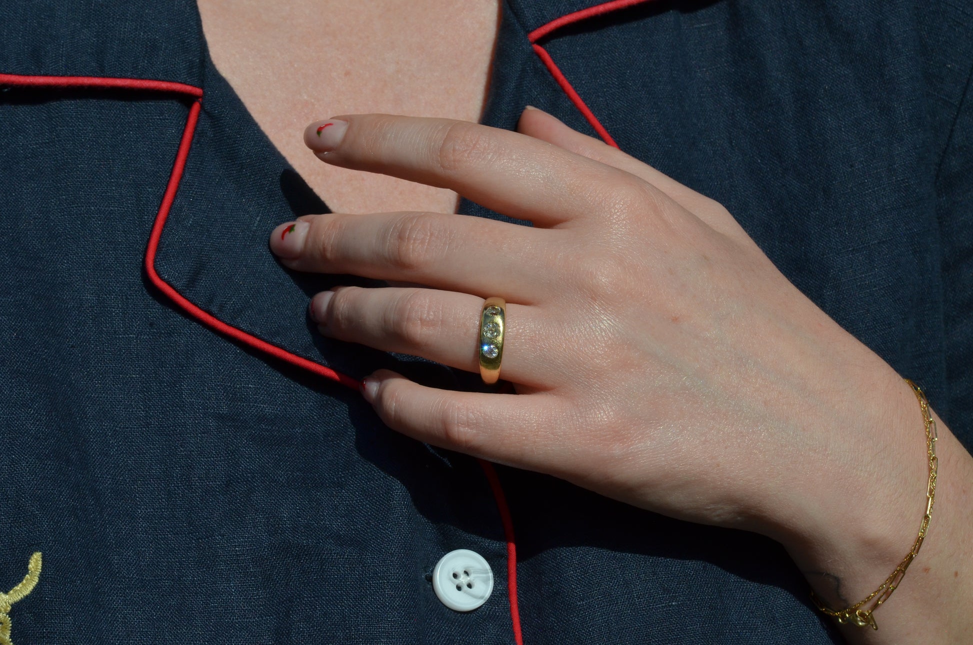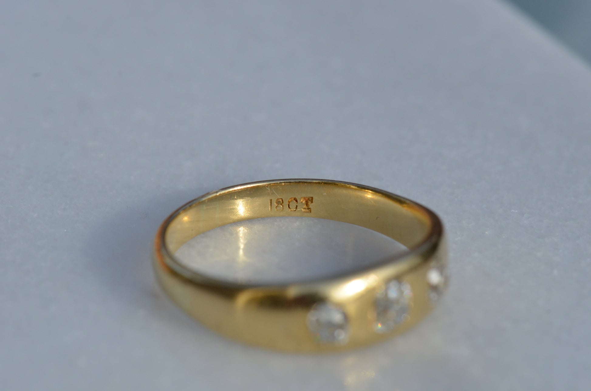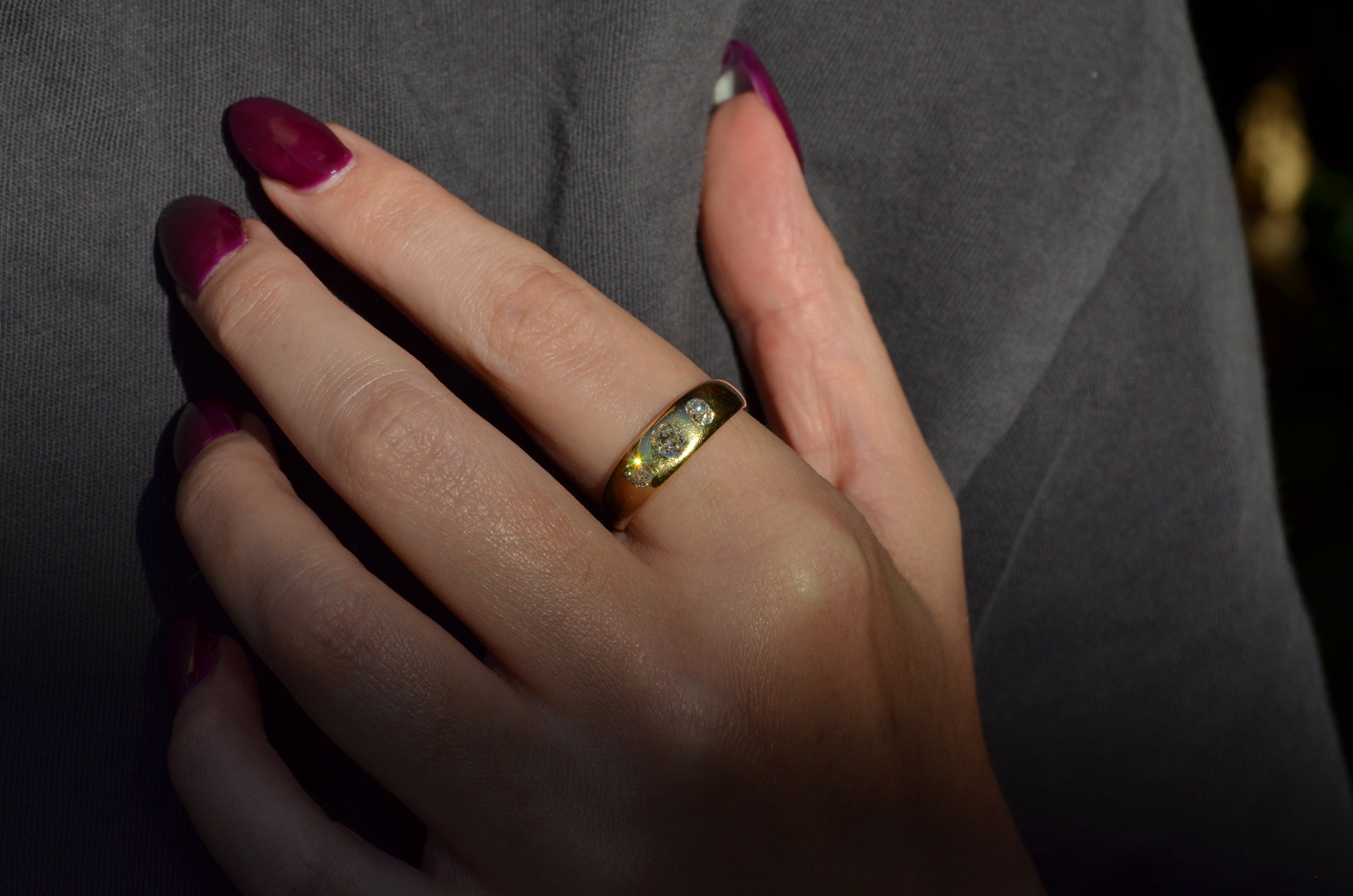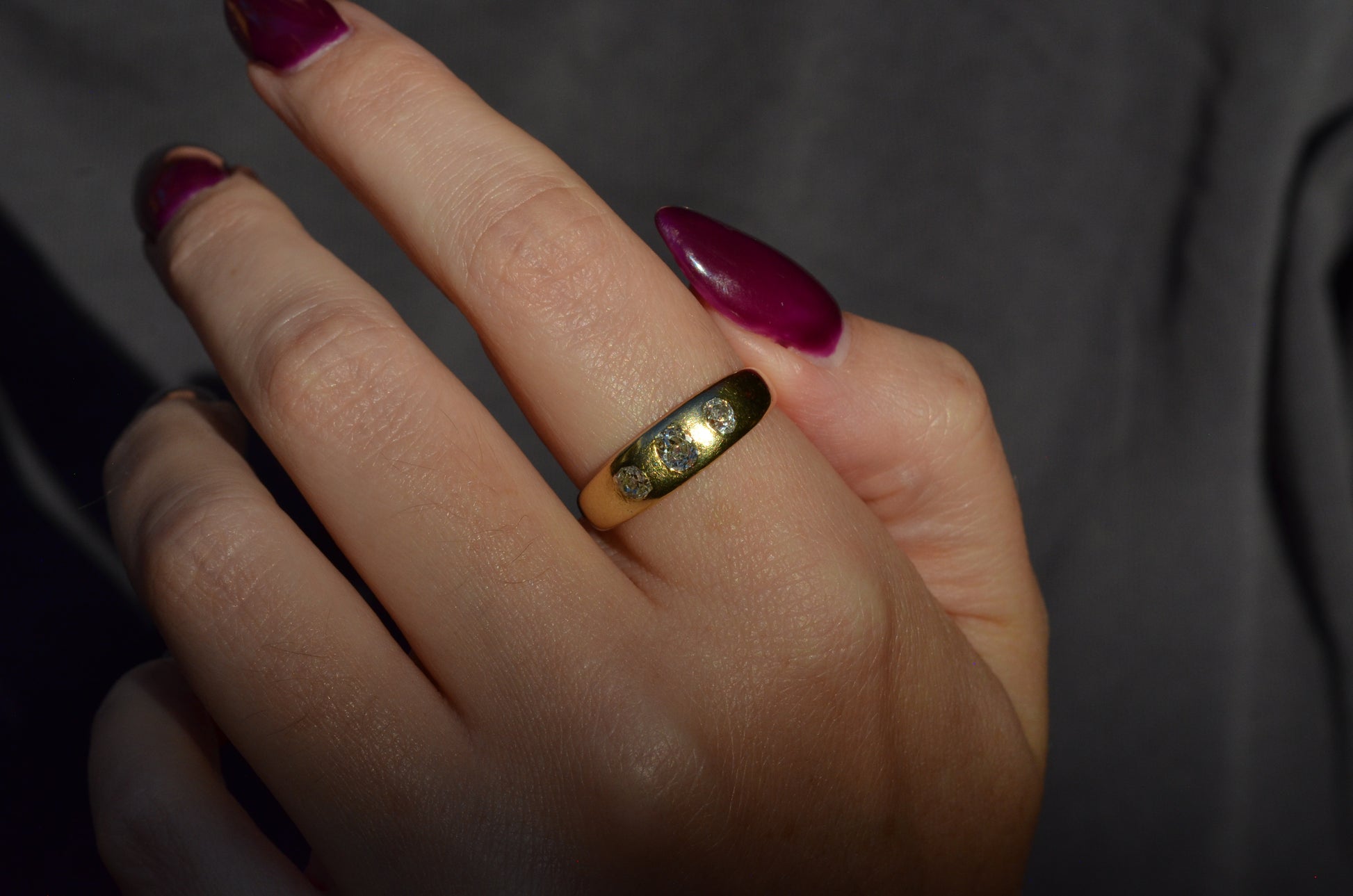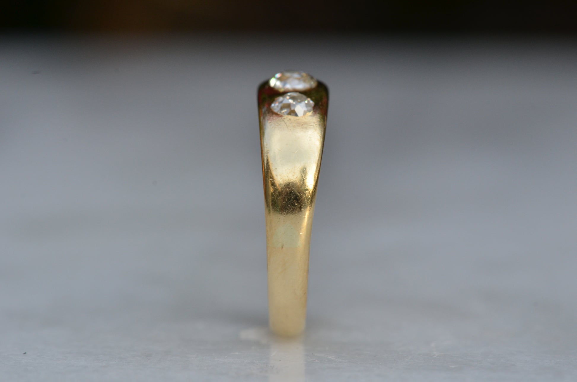A soft and lovely ring in a classic Victorian style, featuring three old mine diamonds set flush into smooth burnished gold, wonderfully heavy yet low and slim on the finger. These flush set bands were popular among men and women alike in the later 19th and early 20th centuries, and continue to be a favourite among jewelry lovers today for their easy-wearing comfort and effortless style. Trilogy rings have likewise remained popular as romantic gifts, with each stone representing past, present, and future, but we also love them for celebrating your own milestones and achievements.