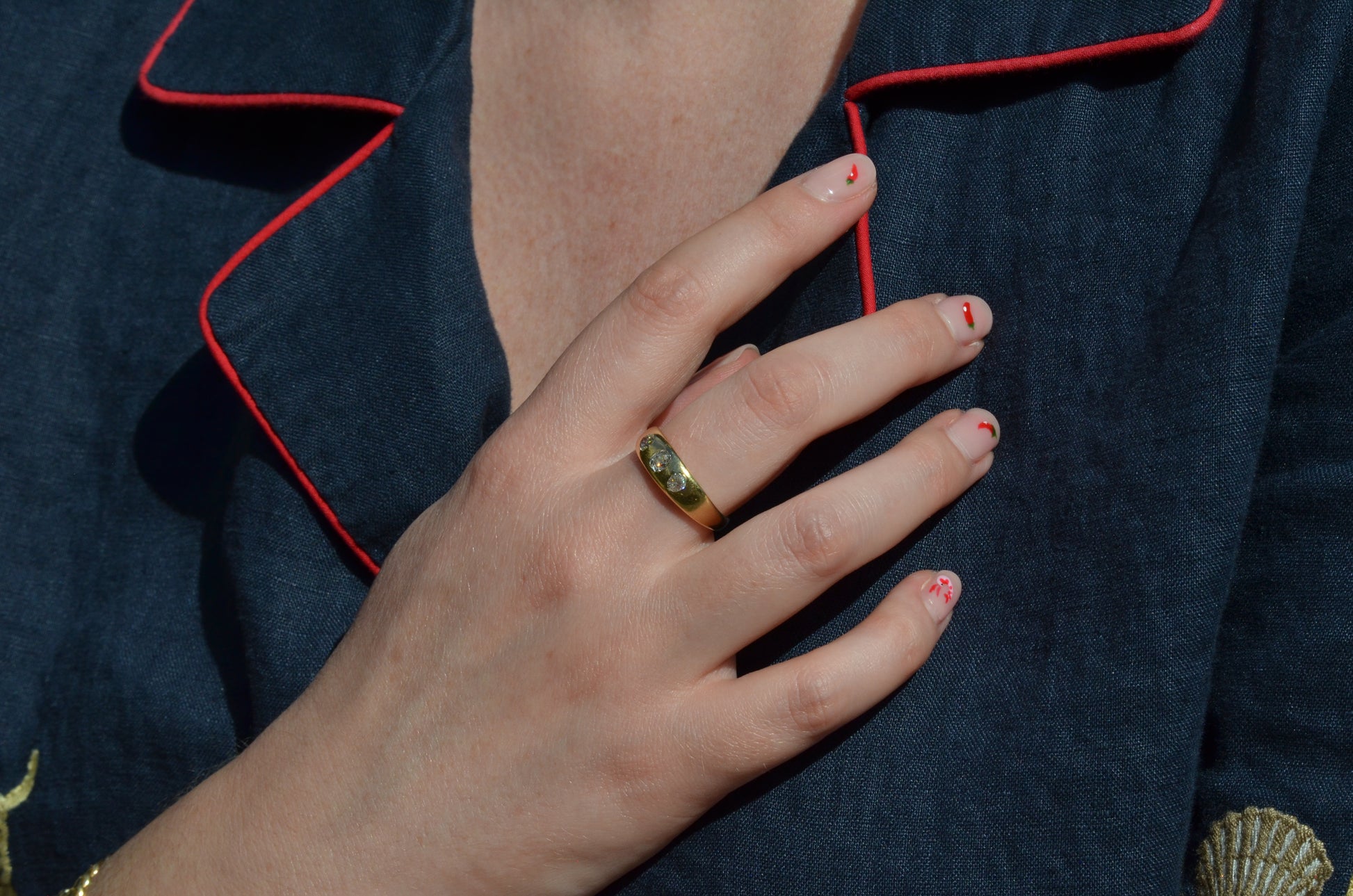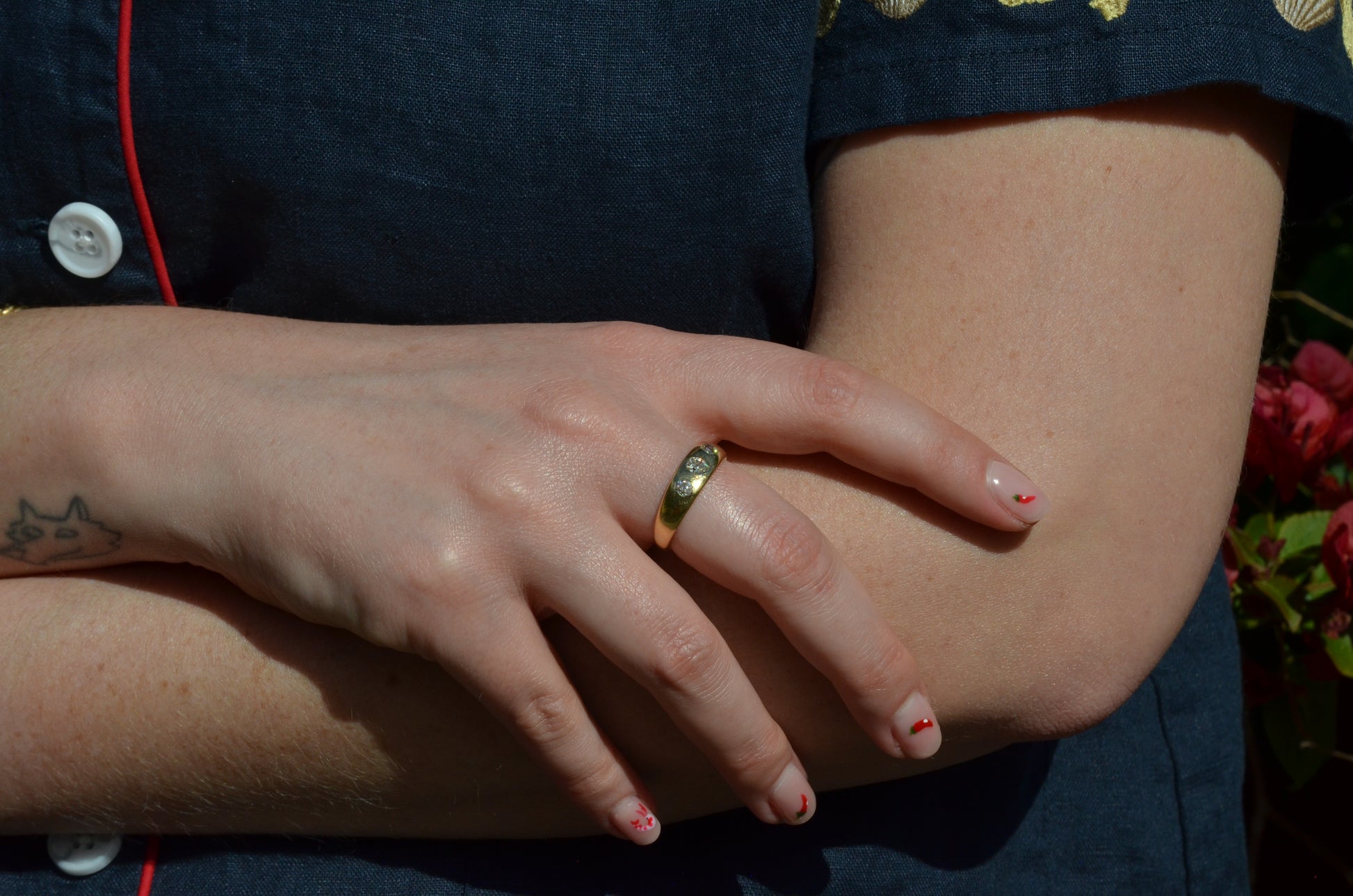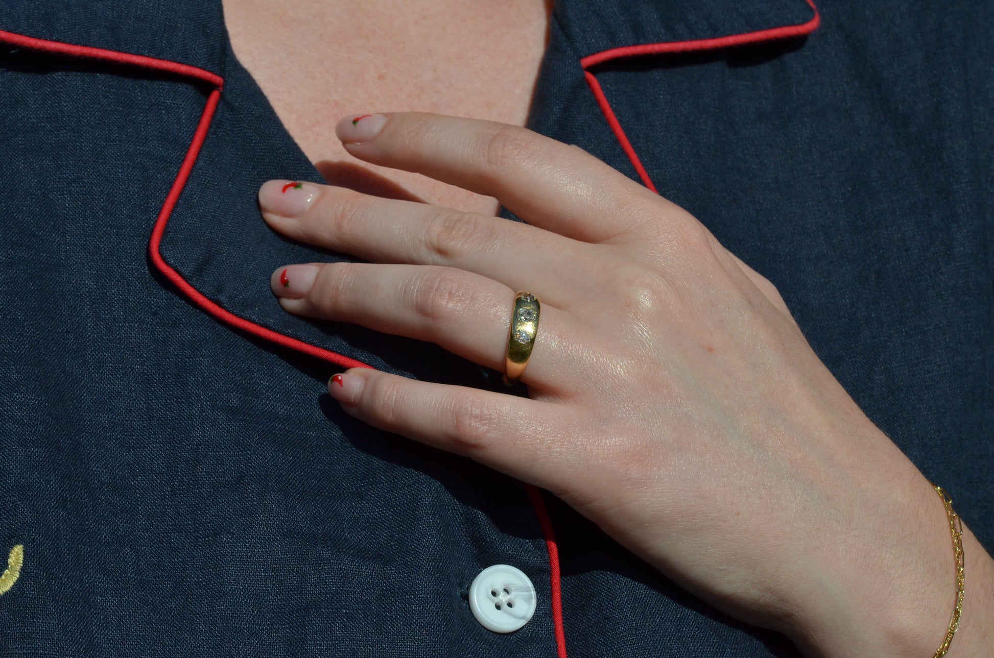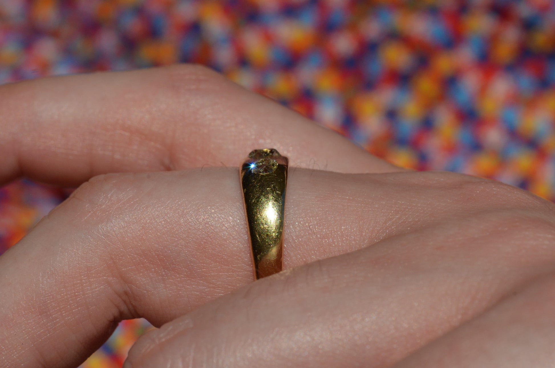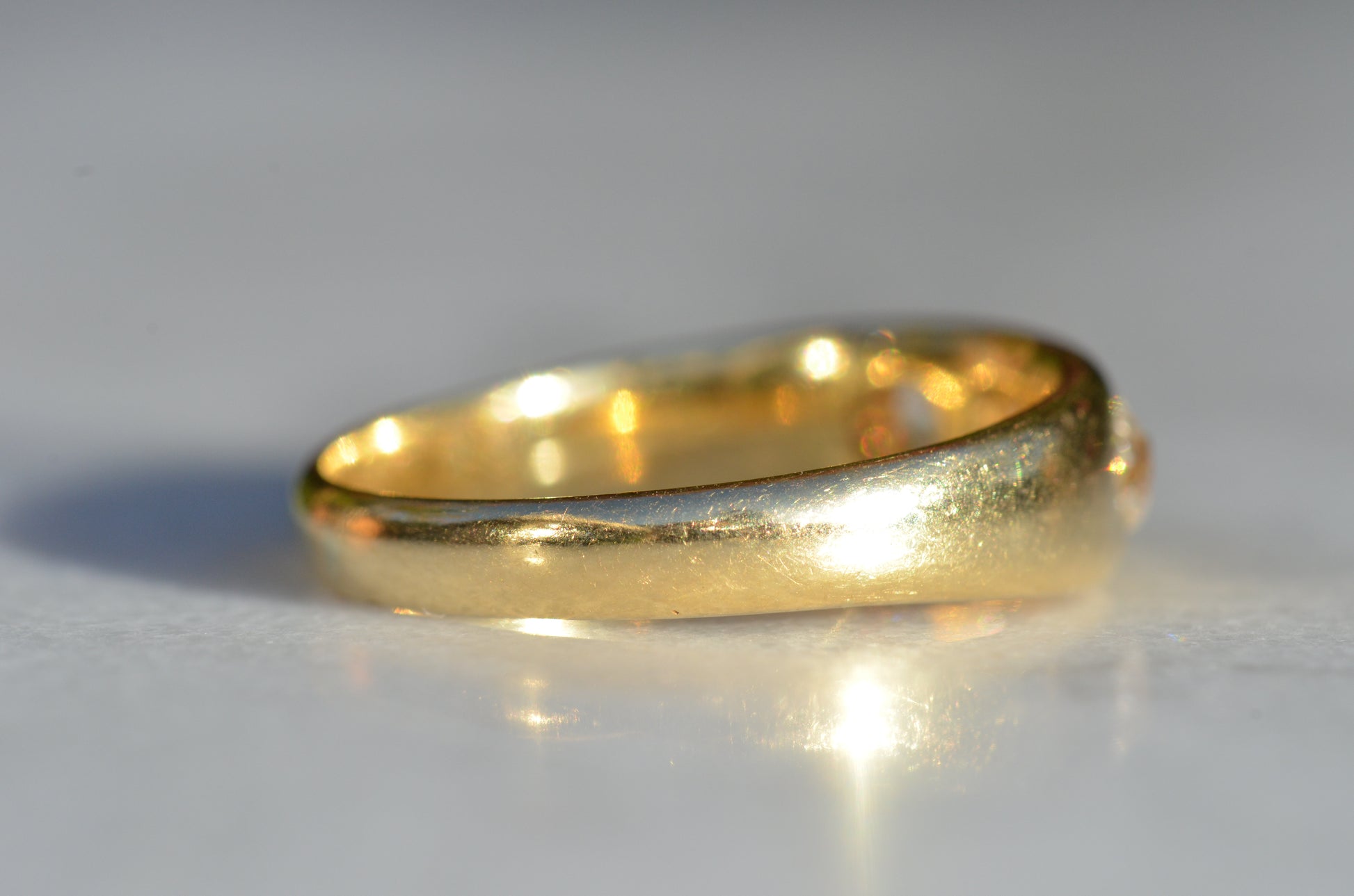 A soft and lovely ring in a classic Victorian style, featuring three old mine diamonds set flush into smooth burnished gold, wonderfully heavy yet low and slim on the finger. These flush set bands were popular among men and women alike in the later 19th and early 20th centuries, and continue to be a favourite among jewelry lovers today for their easy-wearing comfort and effortless style. Trilogy rings have likewise remained popular as romantic gifts, with each stone representing past, present, and future, but we also love them for celebrating your own milestones and achievements.