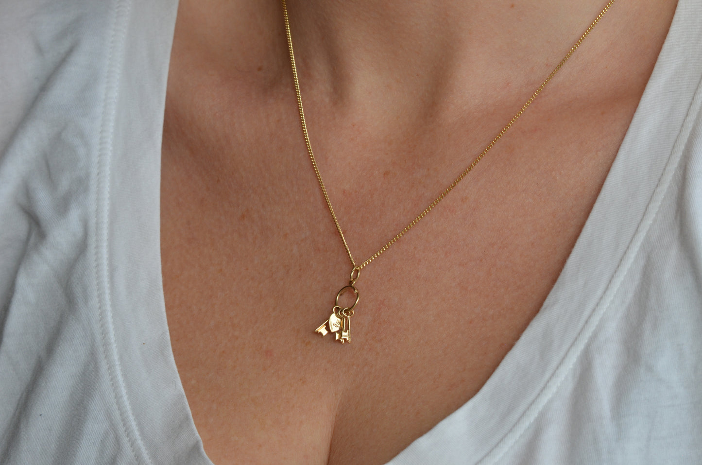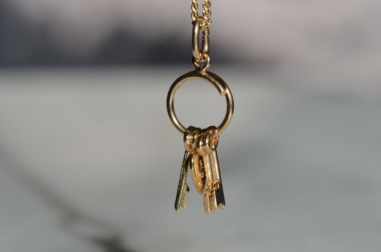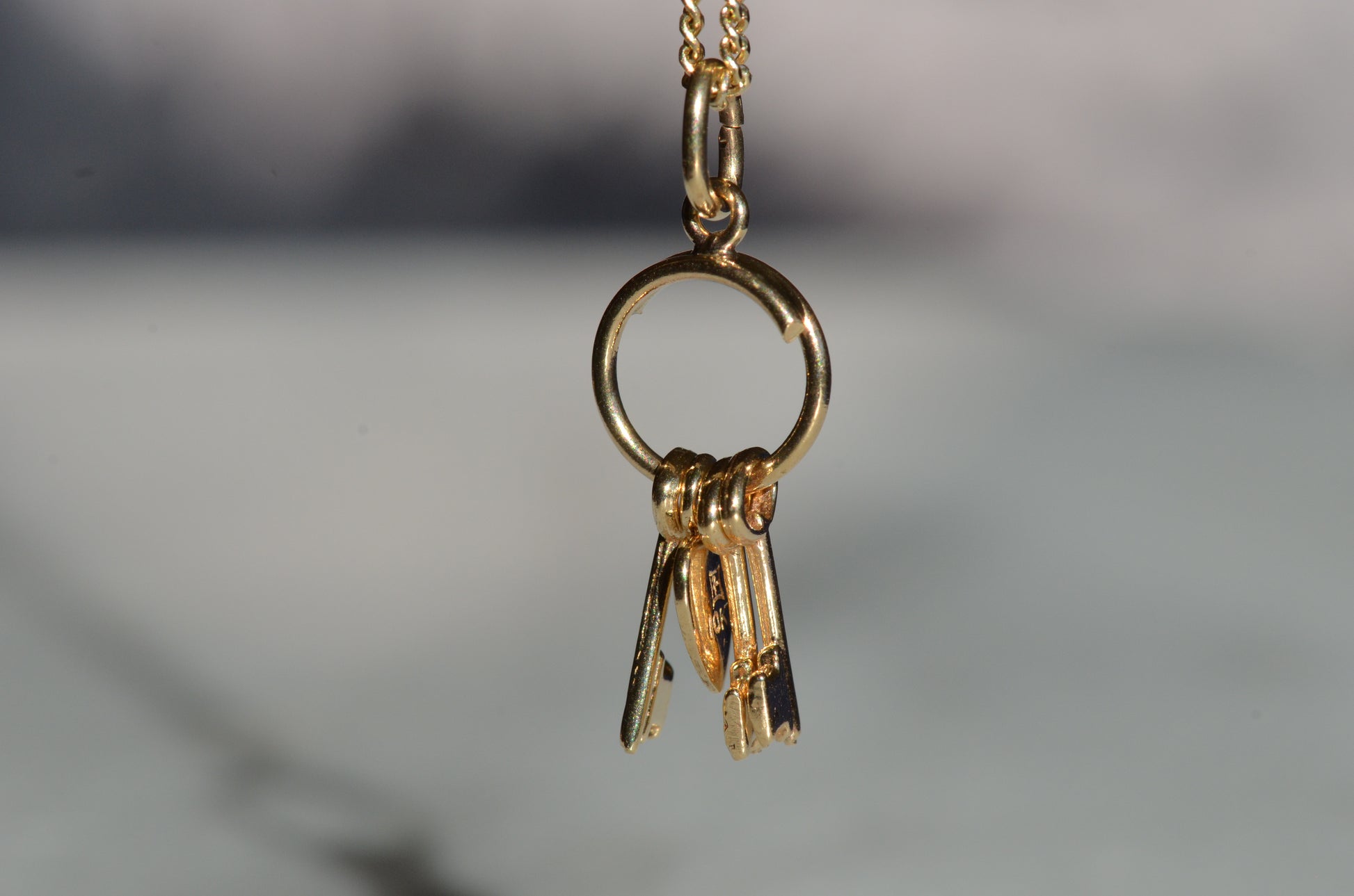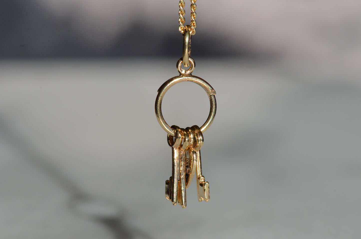 A pendant for a true romantic - a jangling key ring and teeny heart. A not-so-subtle way to let someone know they hold the key to your heart - or to convey the private core under safekeeping.