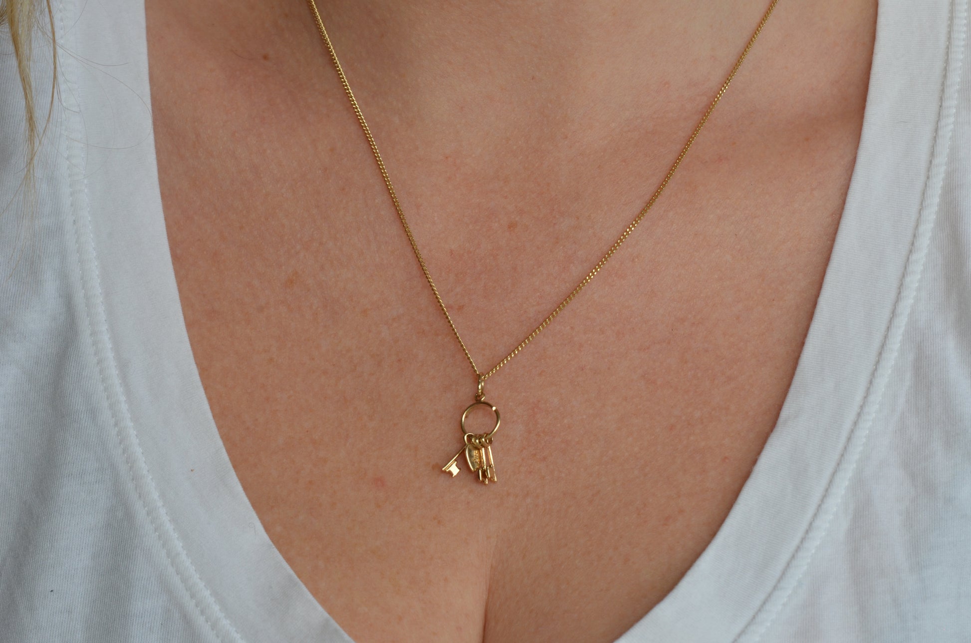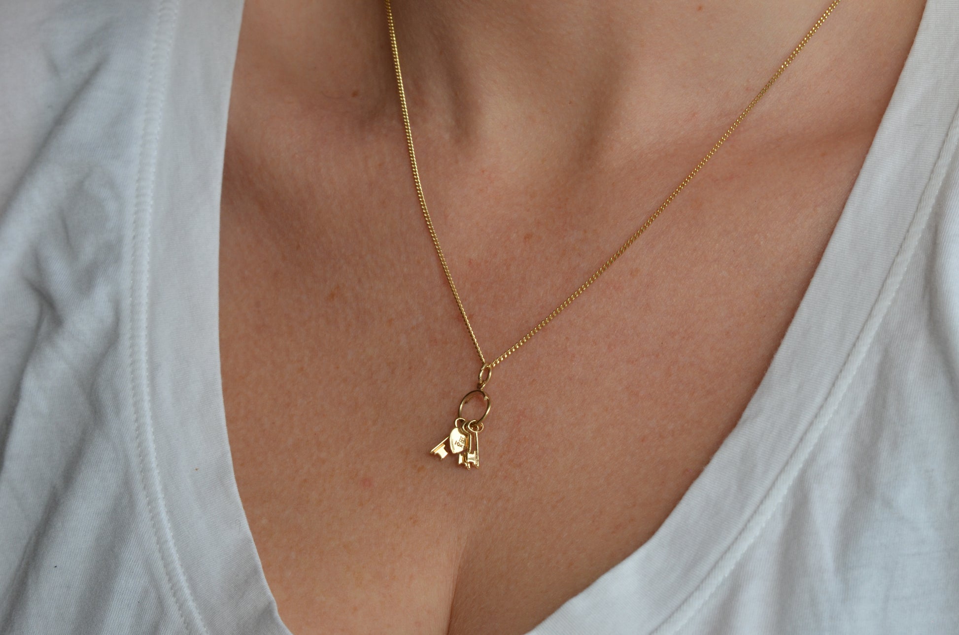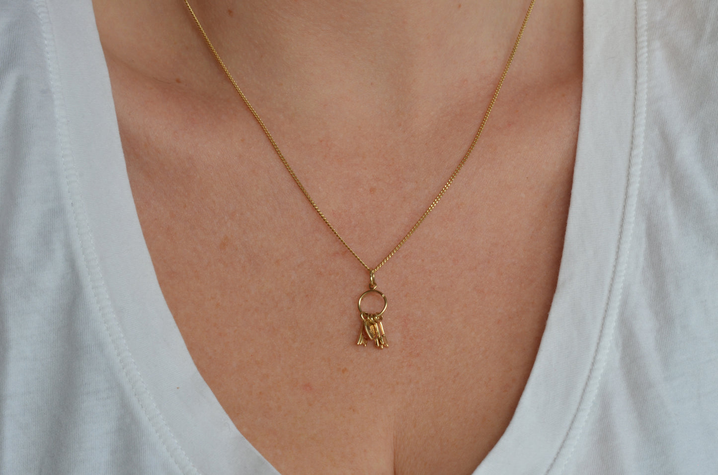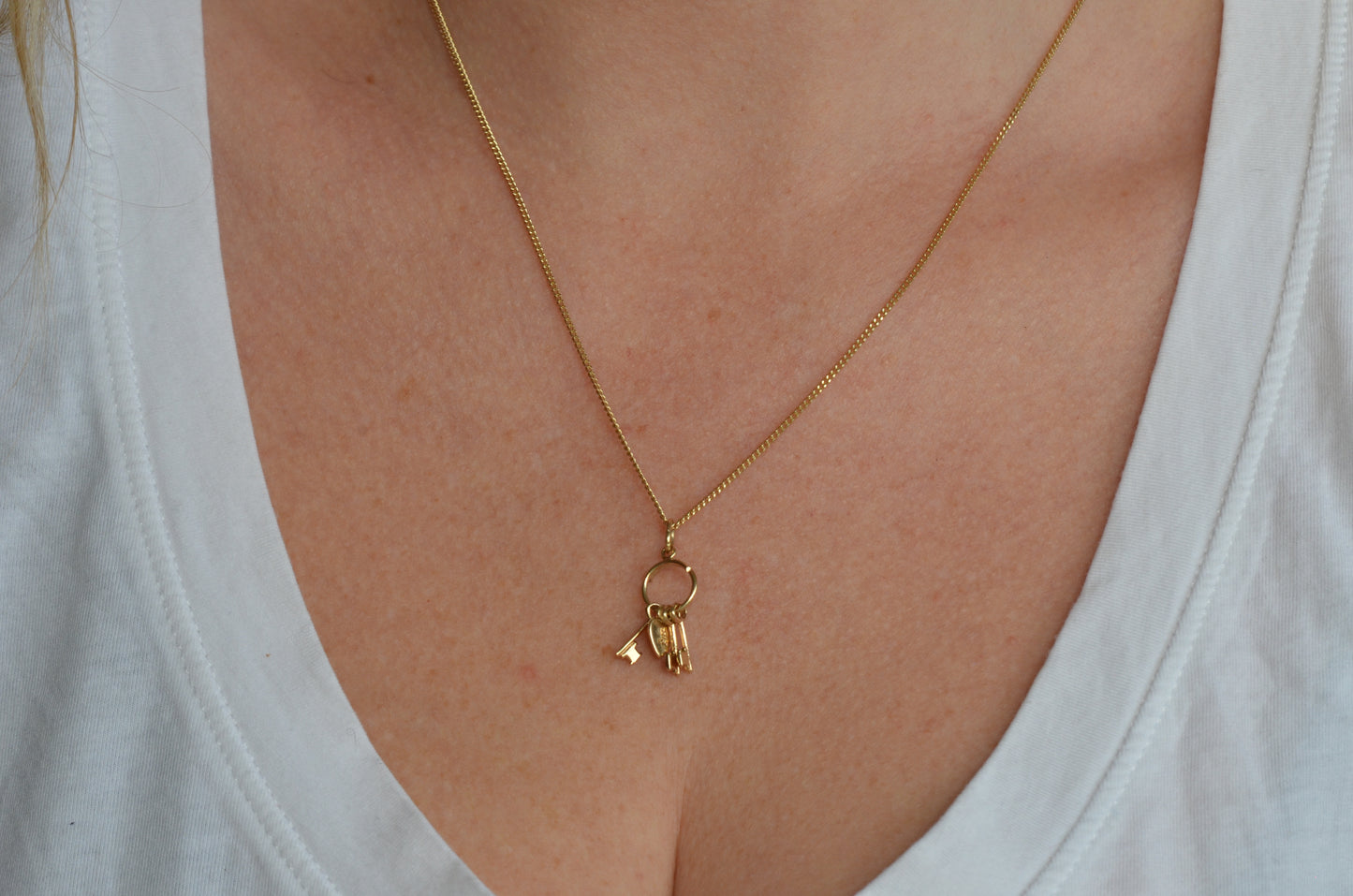 A pendant for a true romantic - a jangling key ring and teeny heart. A not-so-subtle way to let someone know they hold the key to your heart - or to convey the private core under safekeeping.