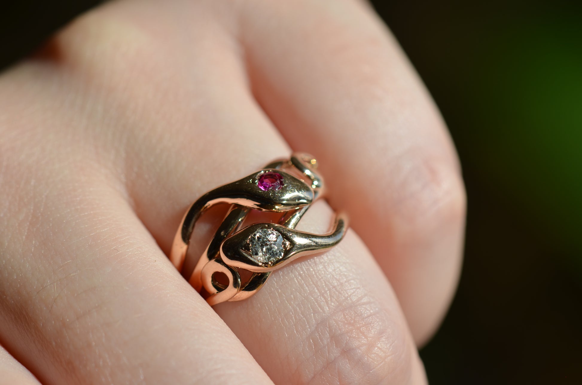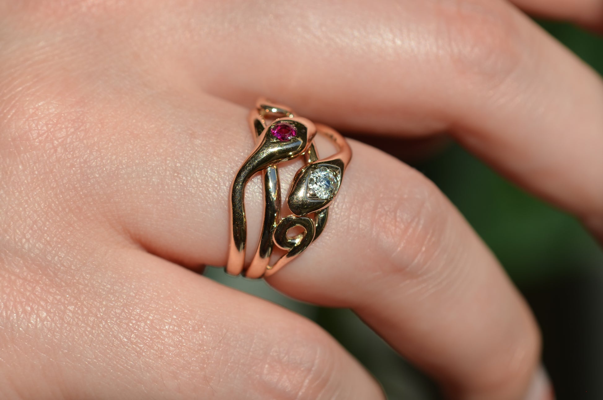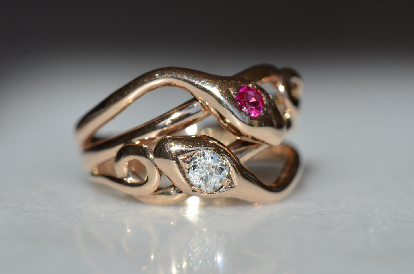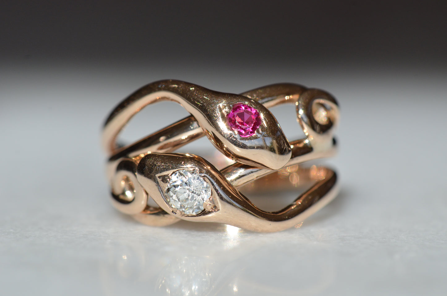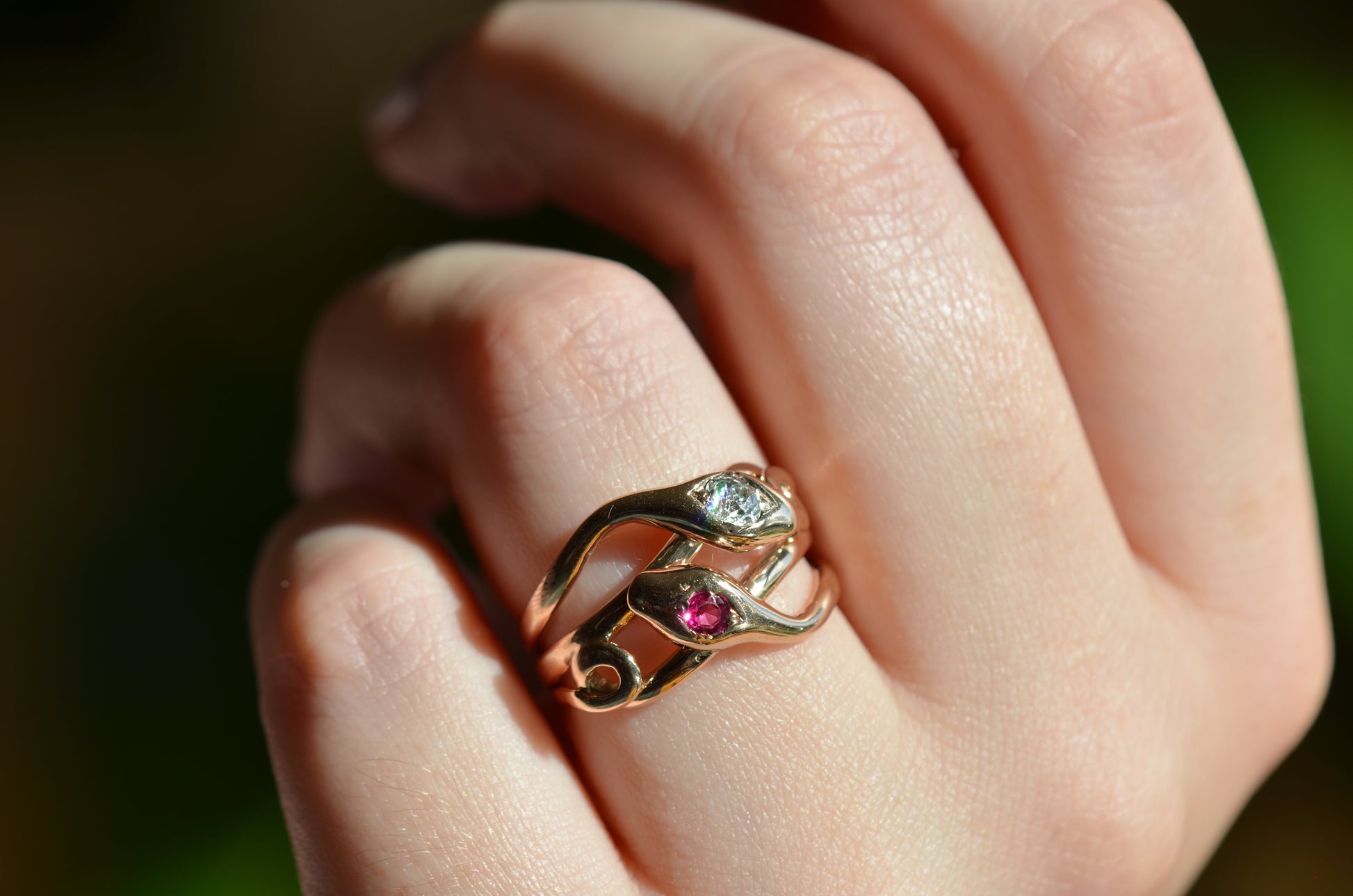 A gorgeous handmade ring with two sinuous snakes wrapped around each other, tails curling on either side. Each head has been carefully shaped and set with a bright gemstone: a vivid ruby on one and sparkling diamond on the other. Snake rings soared in popularity in the 1800s when Queen Victoria and Prince Albert were engaged with one, but their use in jewelry dates back to ancient times. Representing power and passion, we love them as a gift to yourself or as a token between lovers.