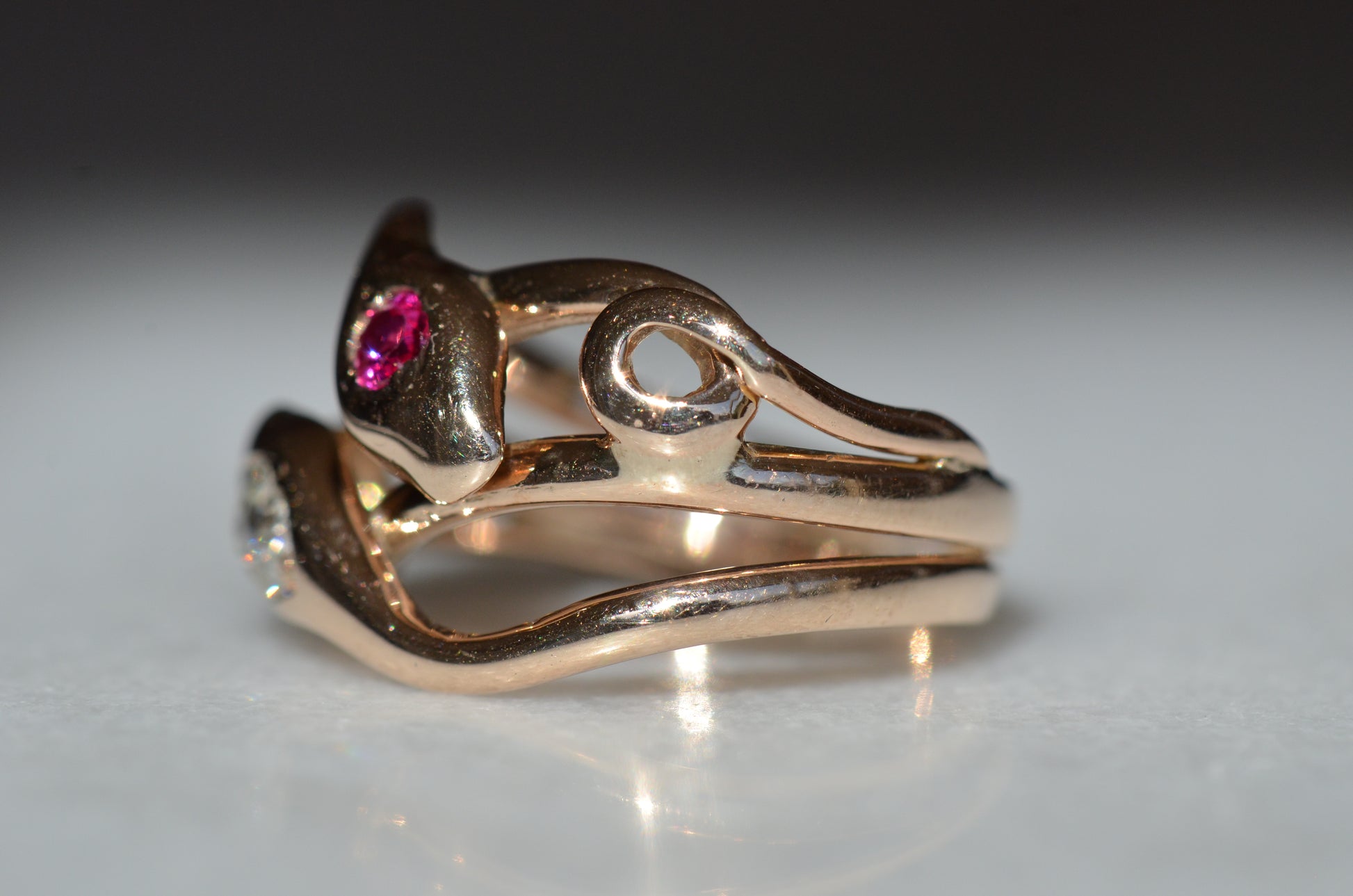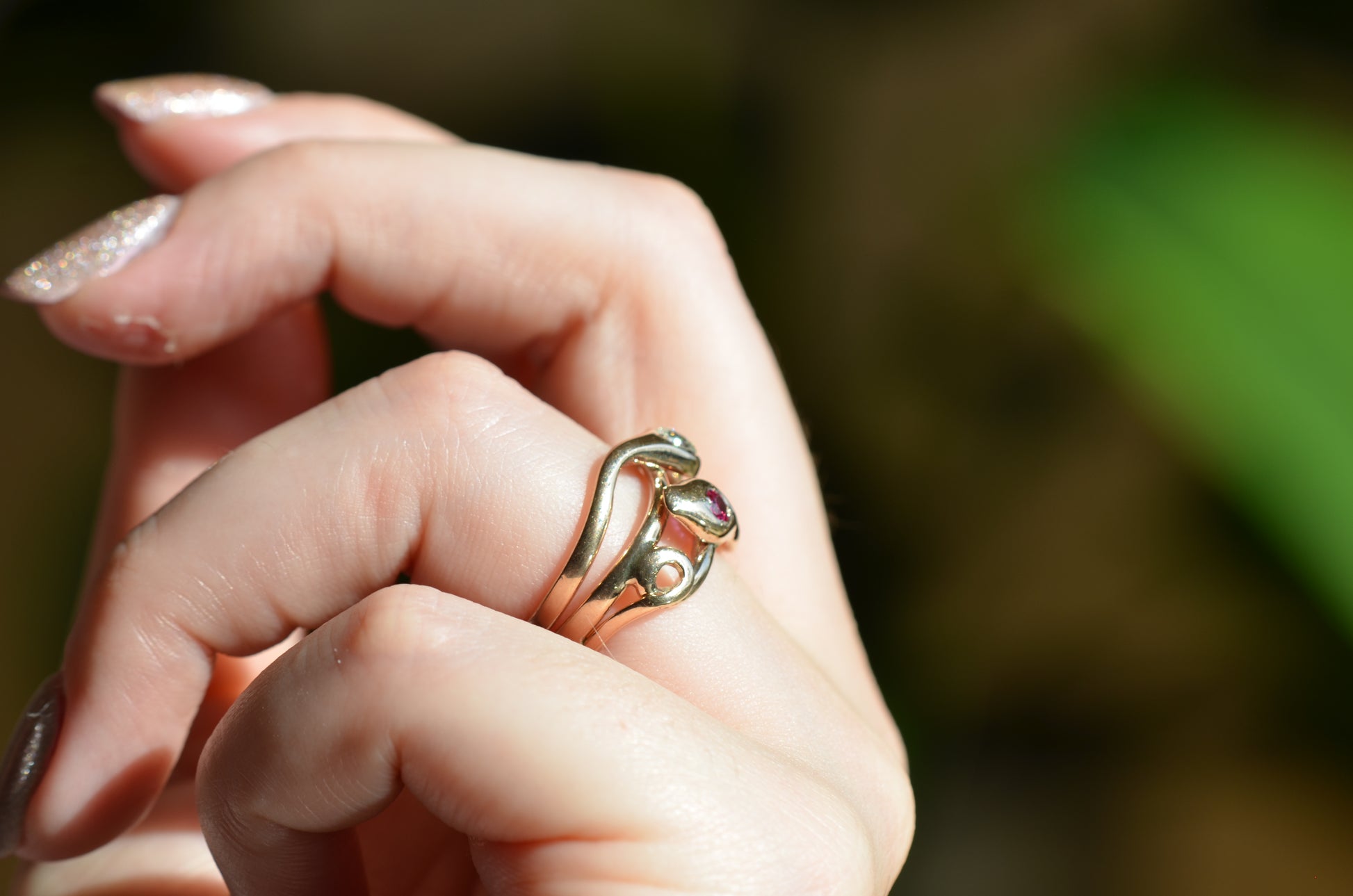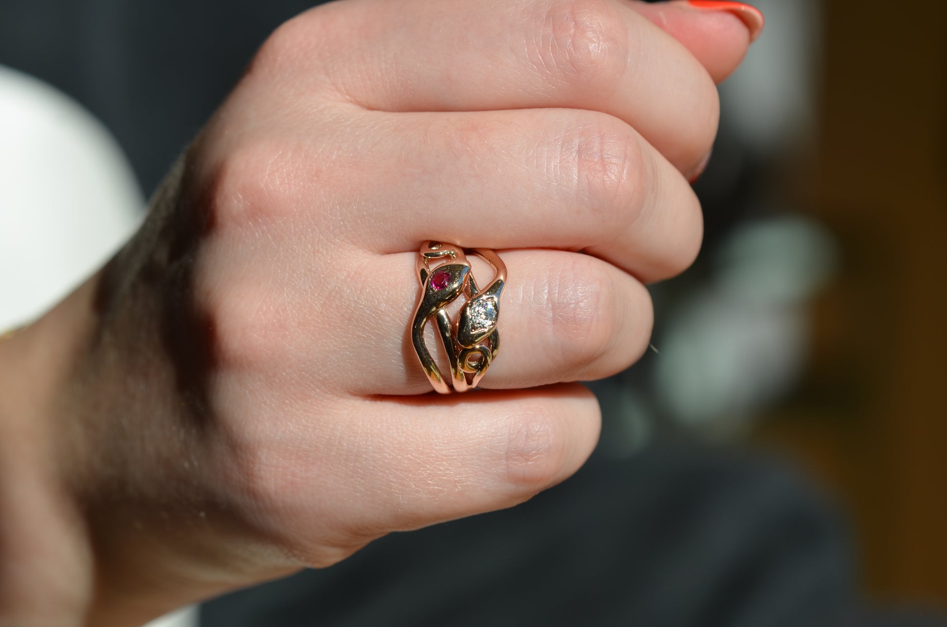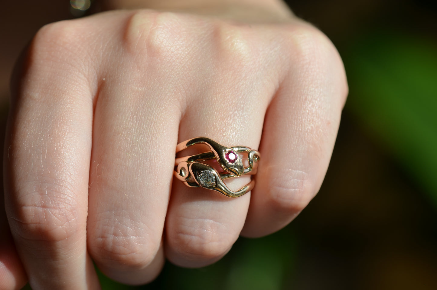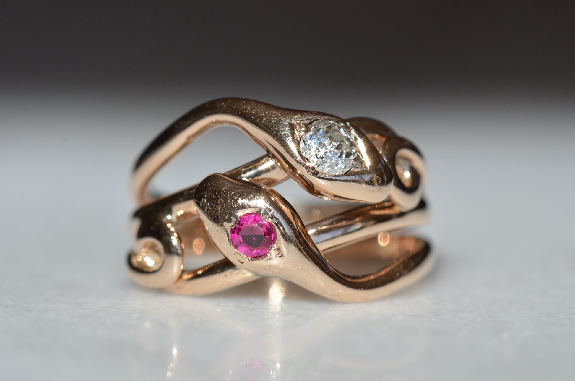 A gorgeous handmade ring with two sinuous snakes wrapped around each other, tails curling on either side. Each head has been carefully shaped and set with a bright gemstone: a vivid ruby on one and sparkling diamond on the other. Snake rings soared in popularity in the 1800s when Queen Victoria and Prince Albert were engaged with one, but their use in jewelry dates back to ancient times. Representing power and passion, we love them as a gift to yourself or as a token between lovers.