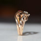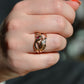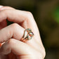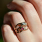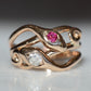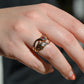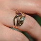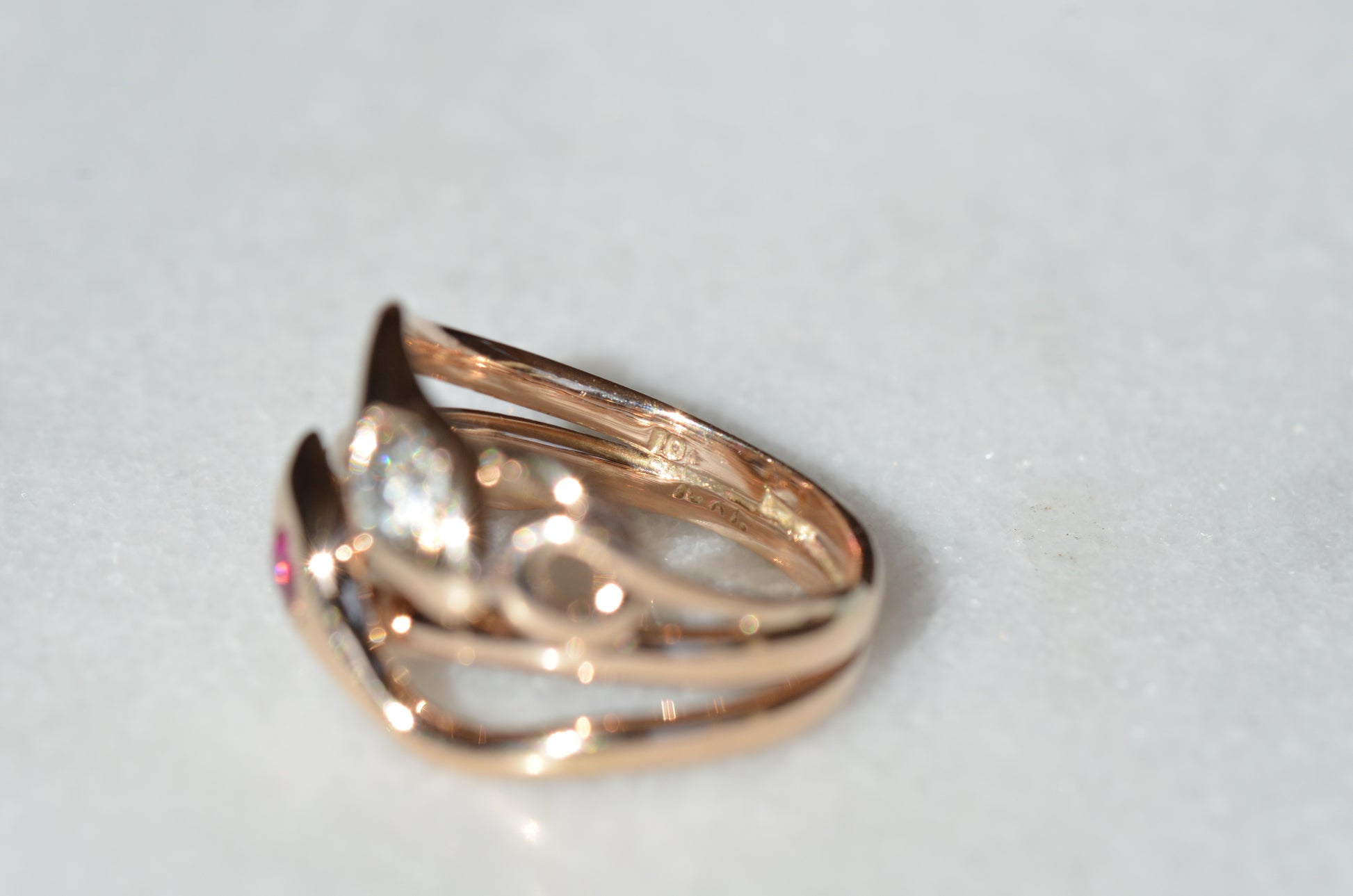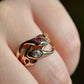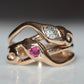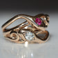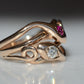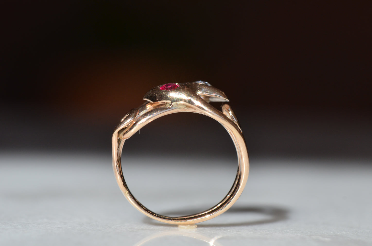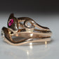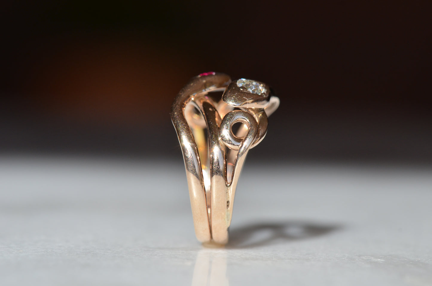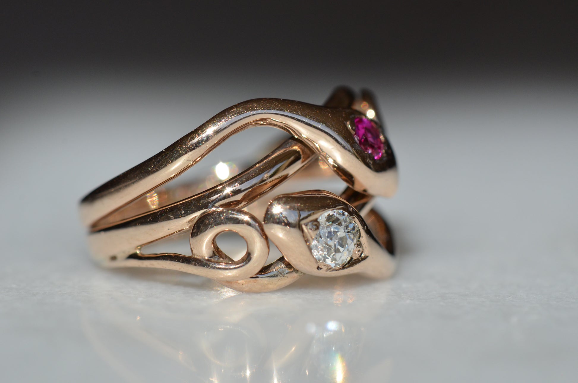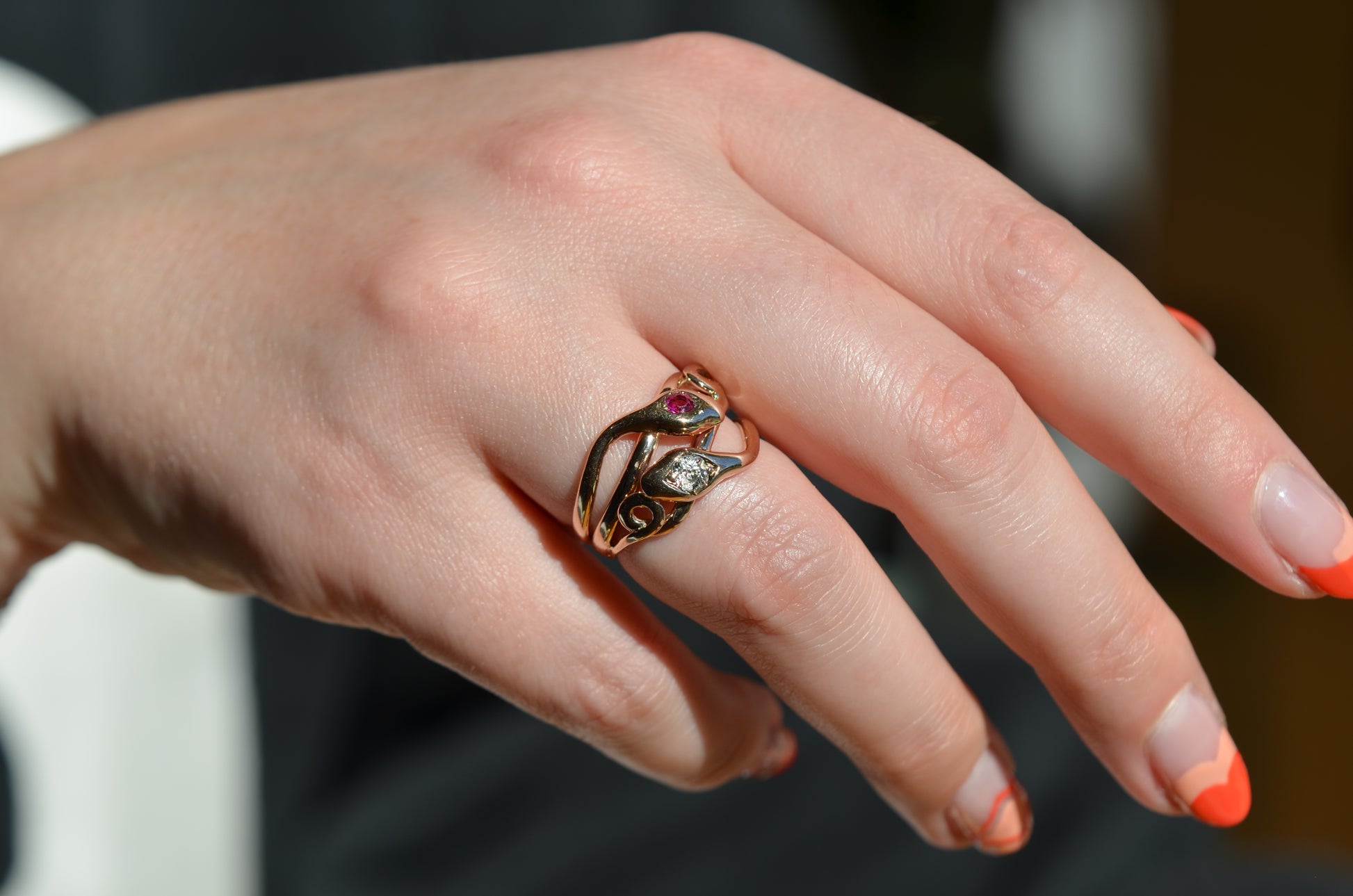 A gorgeous handmade ring with two sinuous snakes wrapped around each other, tails curling on either side. Each head has been carefully shaped and set with a bright gemstone: a vivid ruby on one and sparkling diamond on the other. Snake rings soared in popularity in the 1800s when Queen Victoria and Prince Albert were engaged with one, but their use in jewelry dates back to ancient times. Representing power and passion, we love them as a gift to yourself or as a token between lovers.