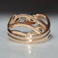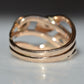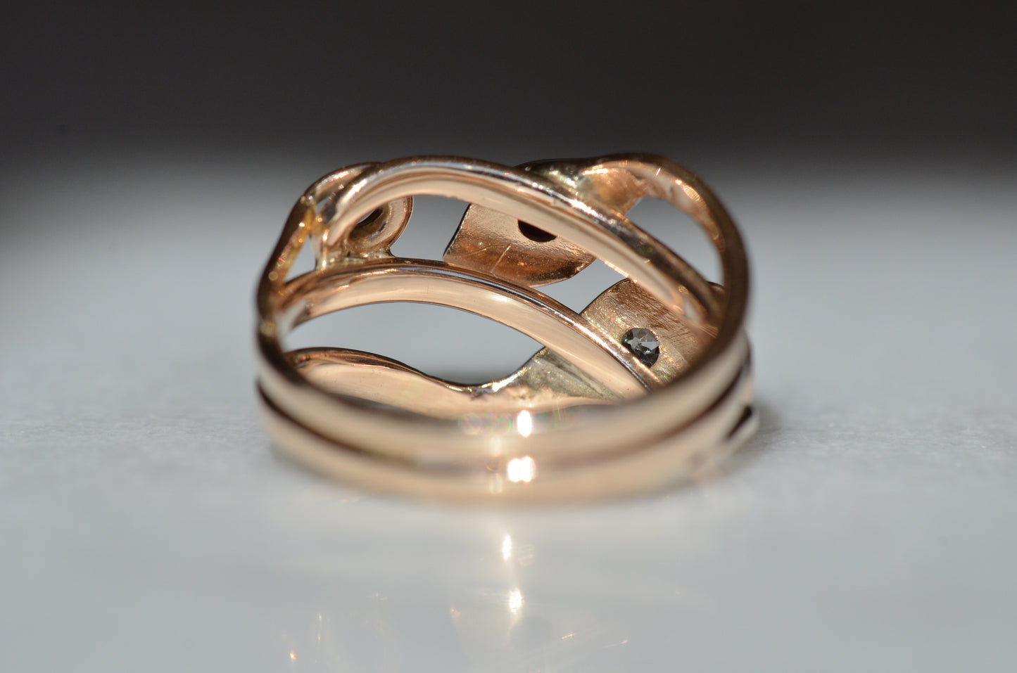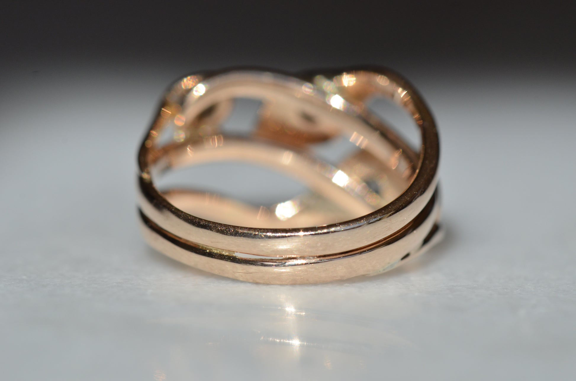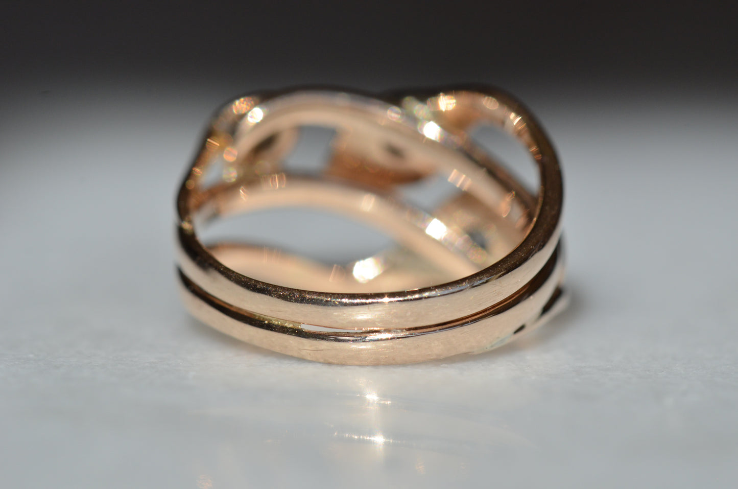 • Face of ring measures 13mm wide, 12.5mm across from outer edges of heads, with a rise of 4mm; back of band measures 3.6mm wide and 0.8mm thick