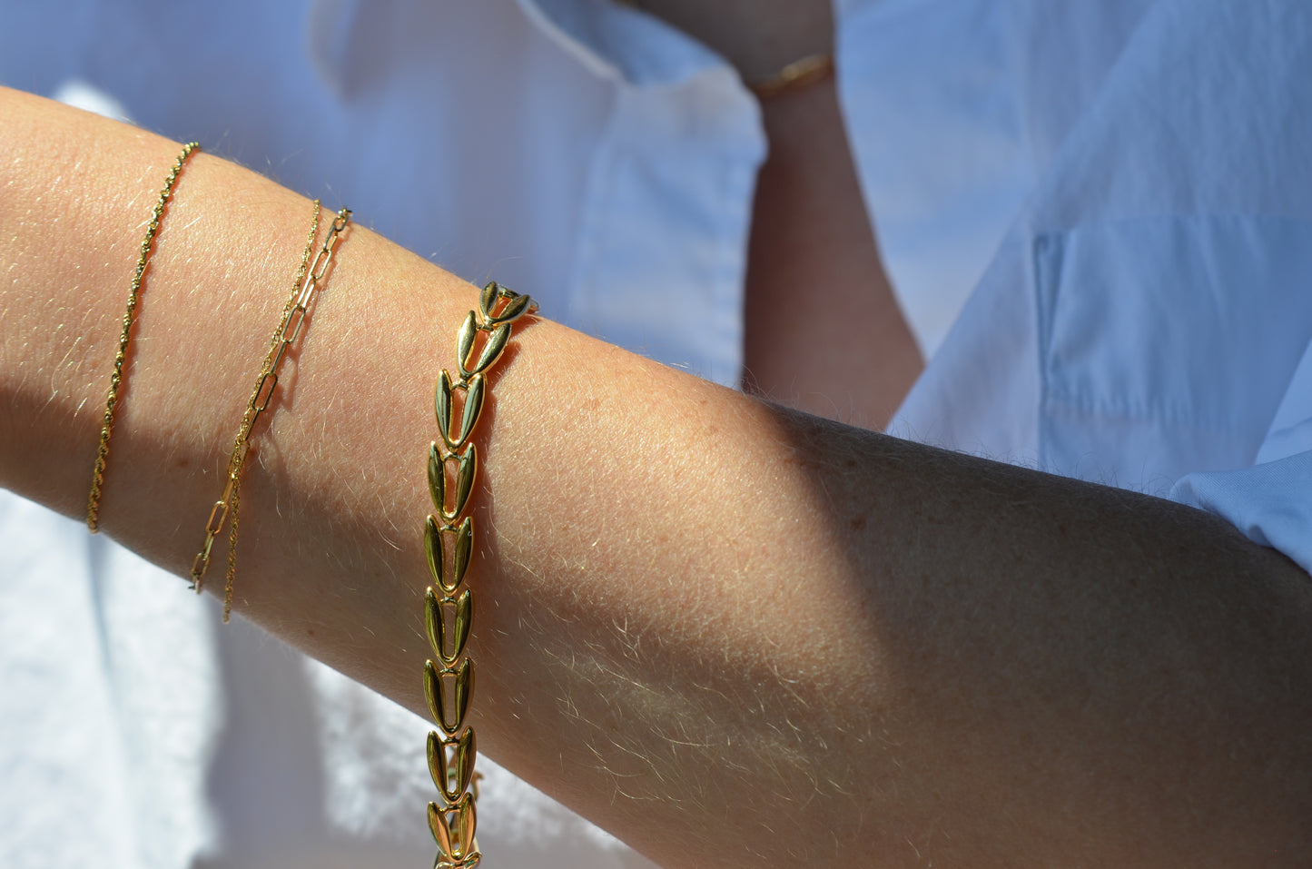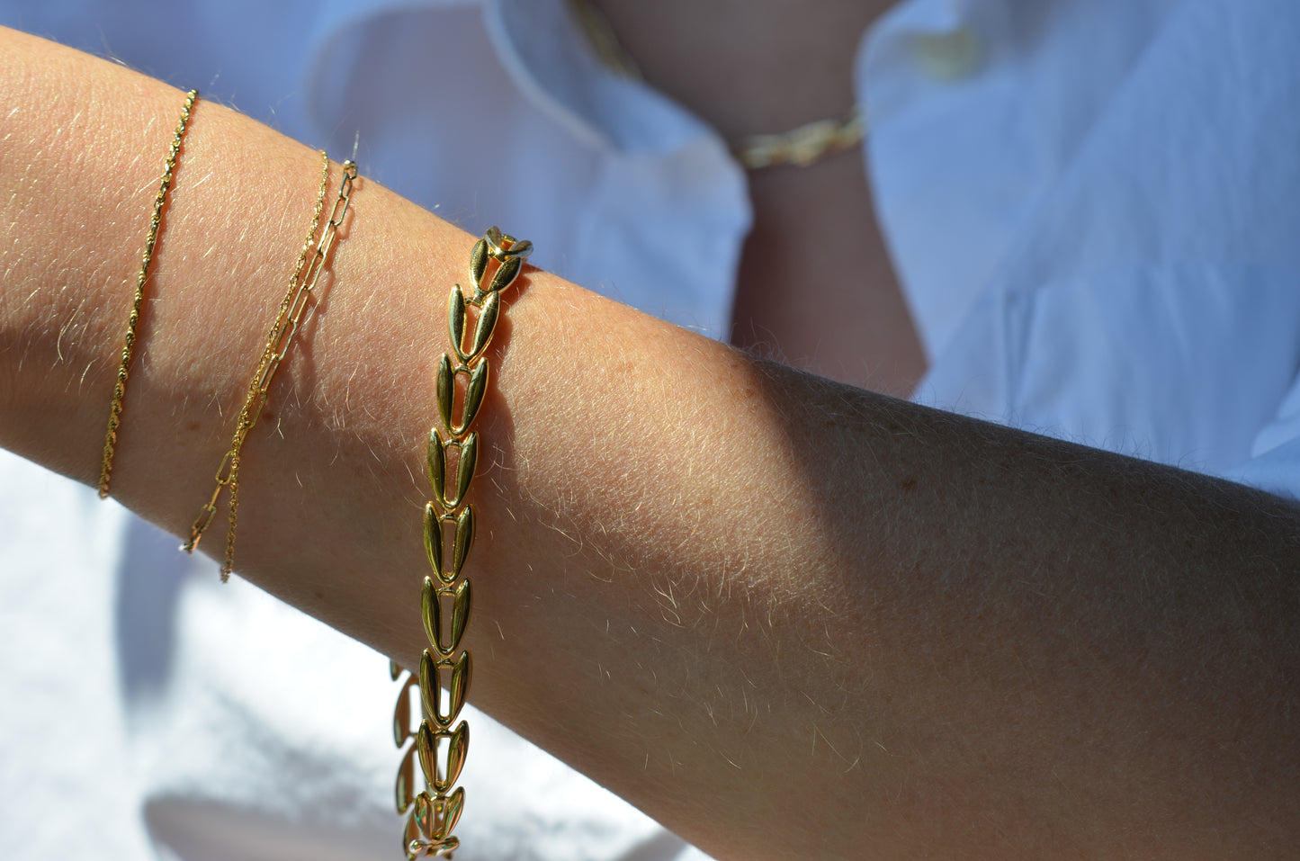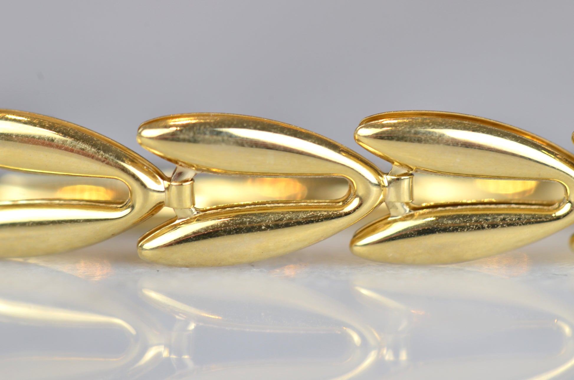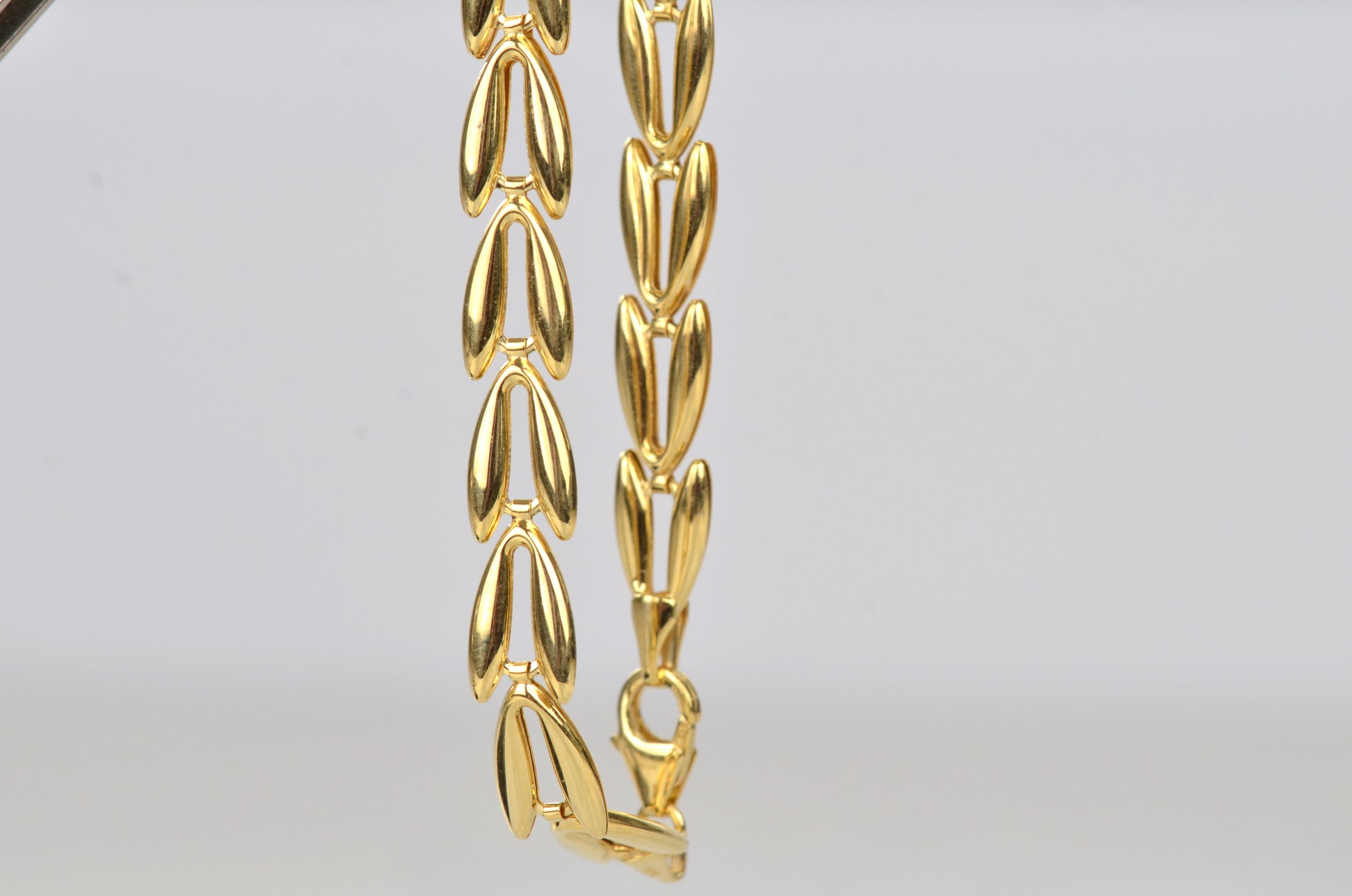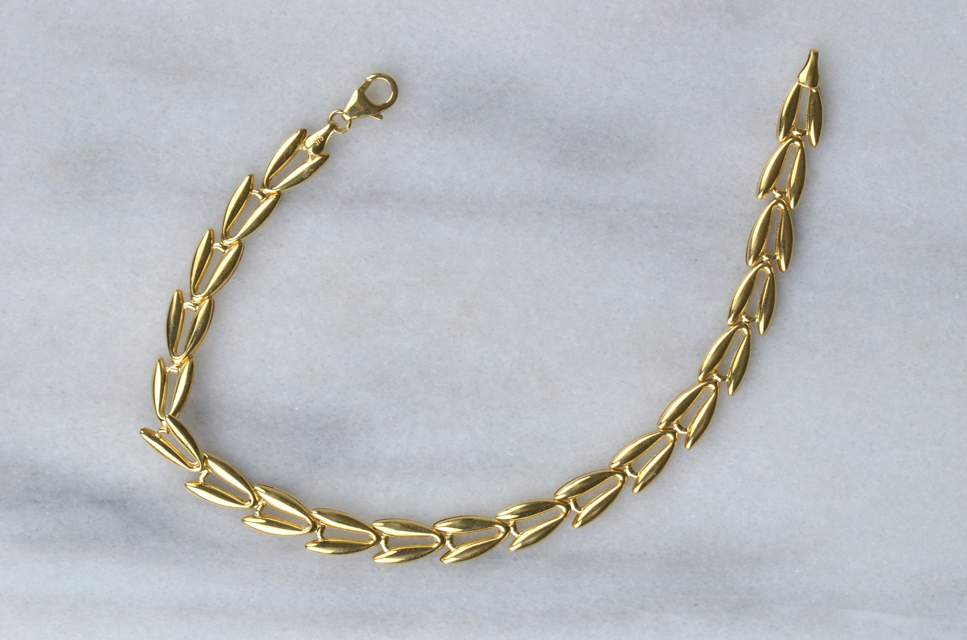 There's something we just love about this unique bracelet - the links, thought lightly geometric and symmetric in form, manage to have a hint of a natural inspiration: we're instantly reminded of the jewelry motif favourite of wheat patterns, and the bounty and prosperity they represent. Hollow-formed links impart volume and a smooth, curved shine with beautiful movement.