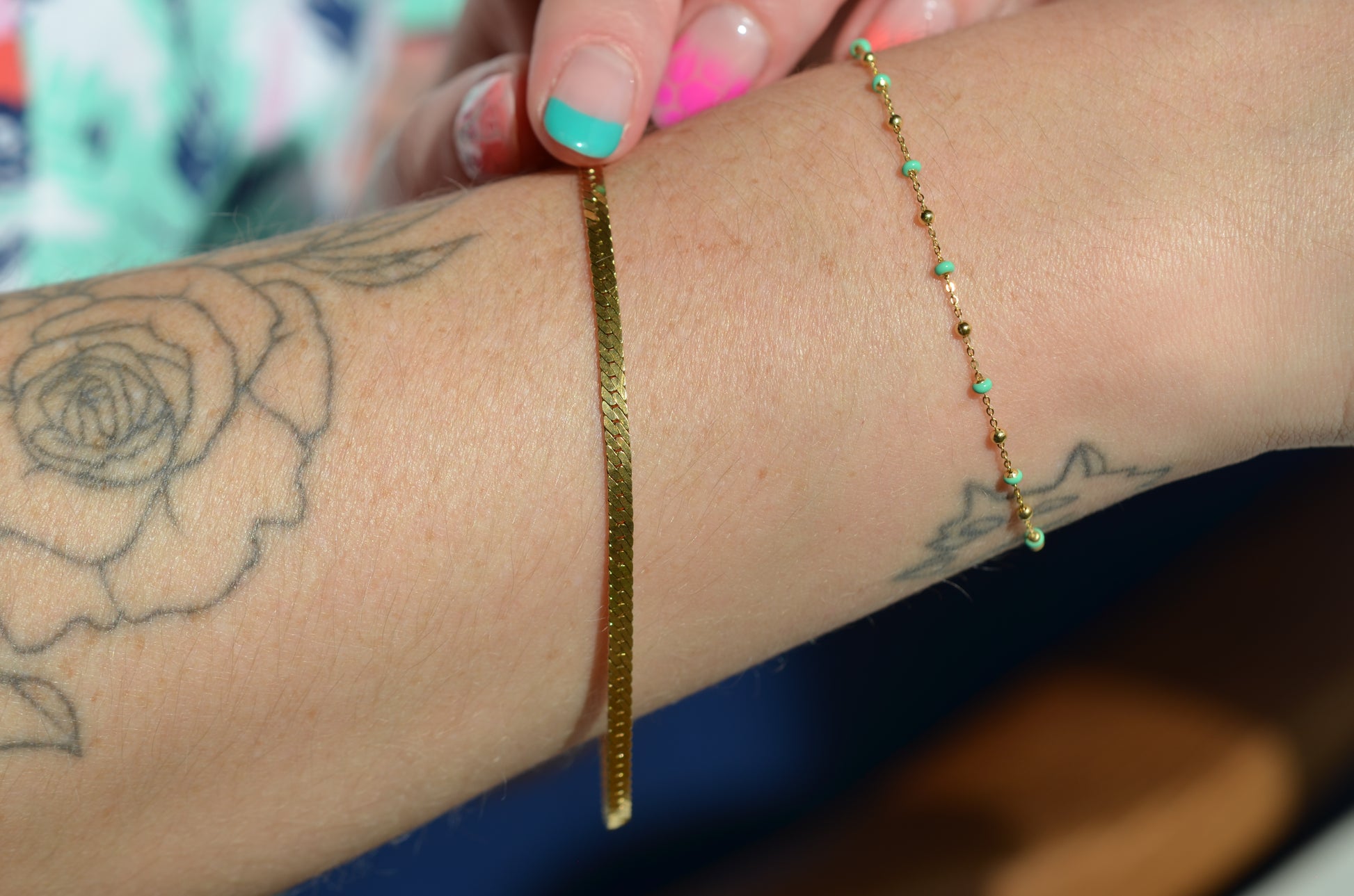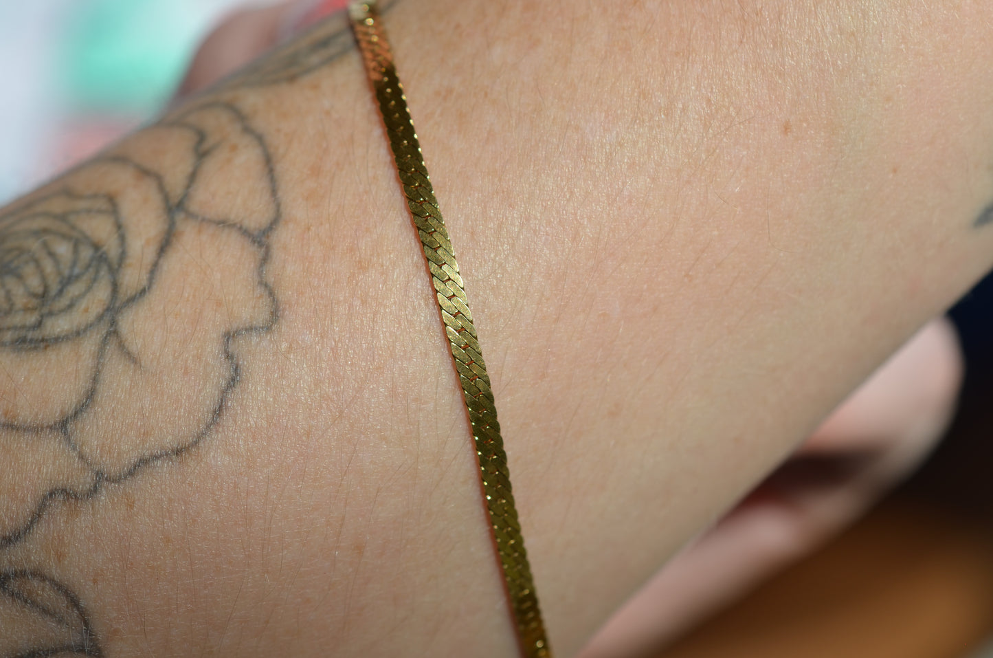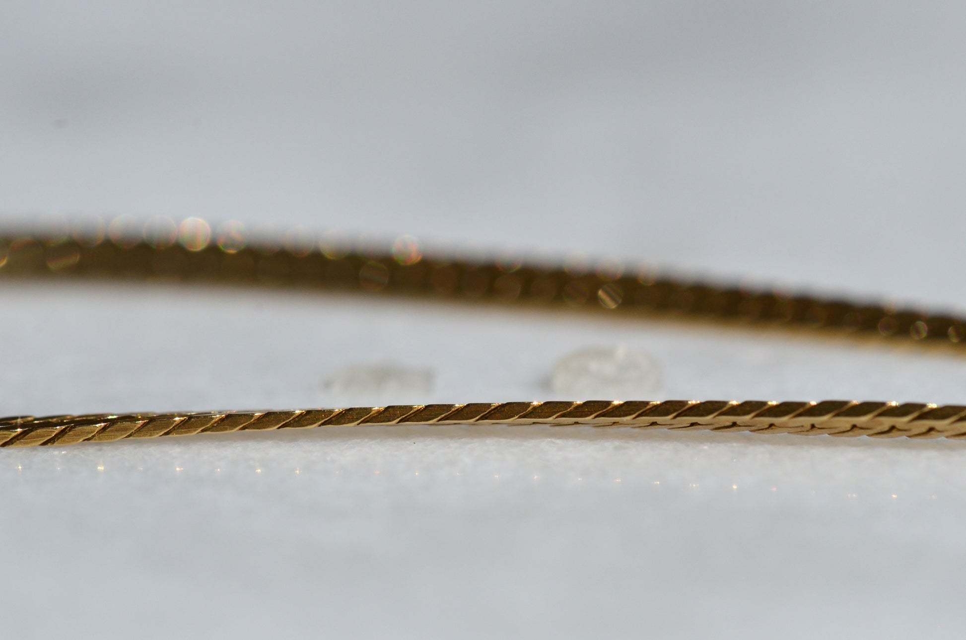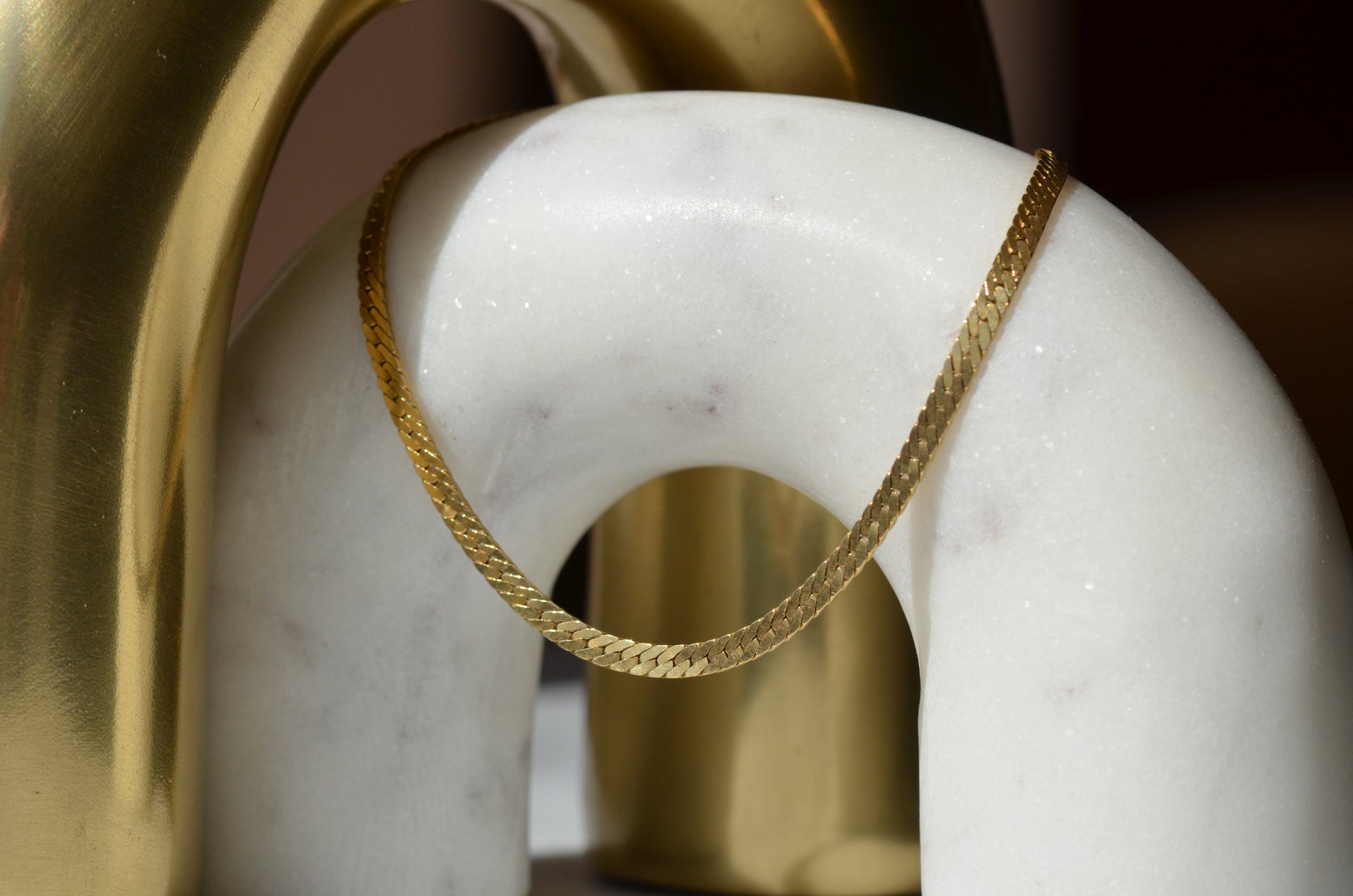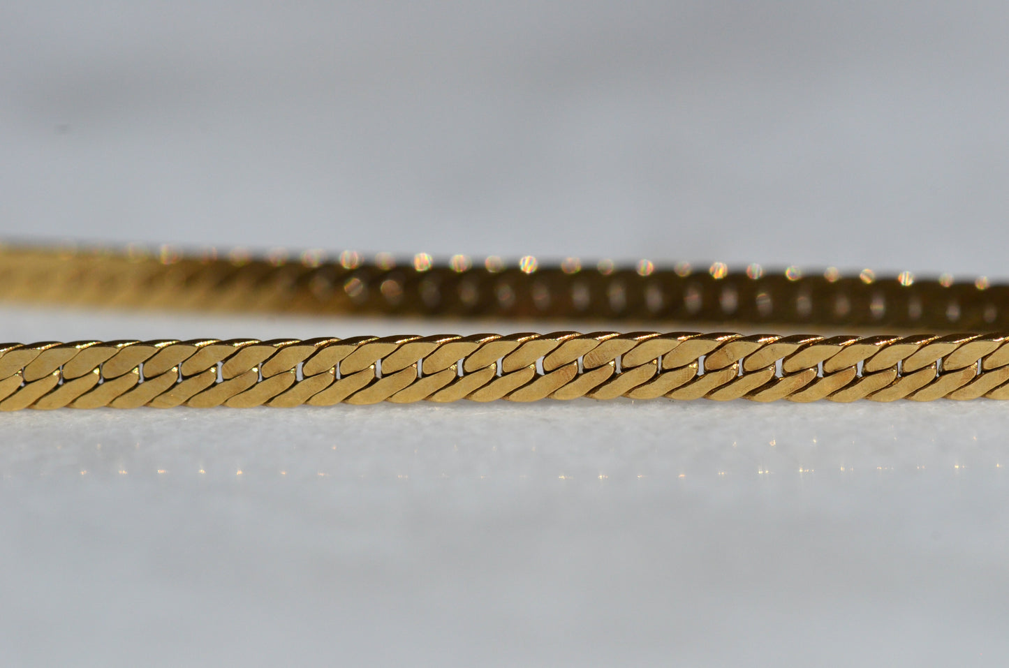 Herringbone chains have caused many a jeweller grief as they can easily bend out of shape and "kink," leaving it near impossible to repair to the former smoothness. This bracelet is in beautiful, sleek condition without any kinks, and can stay that way with a little TLC: be sure to take it off when sleeping, showering, or during physical activities (like swimming or the gym), and always lay it flat to store rather than tossing it into your jewelry box.