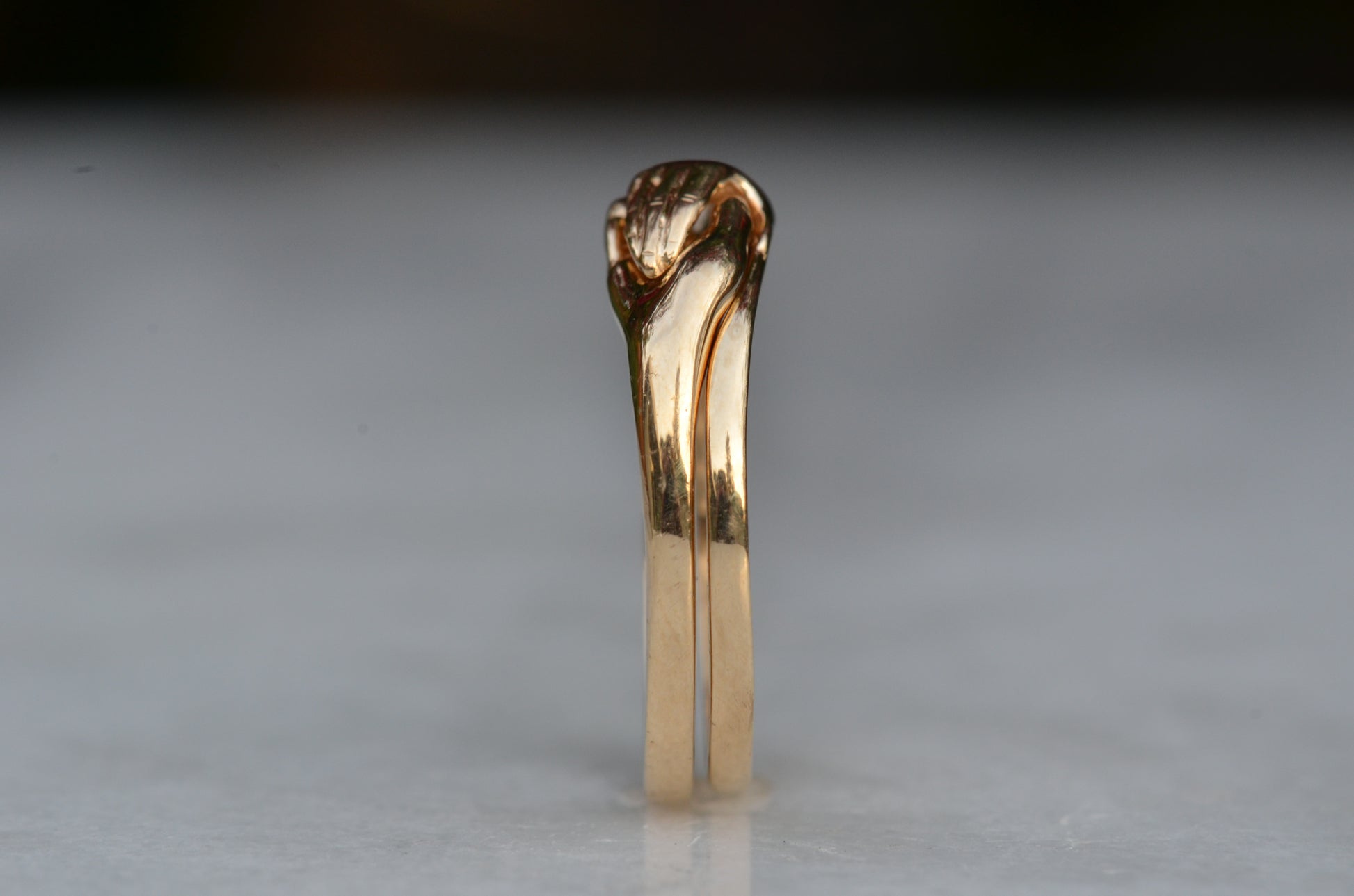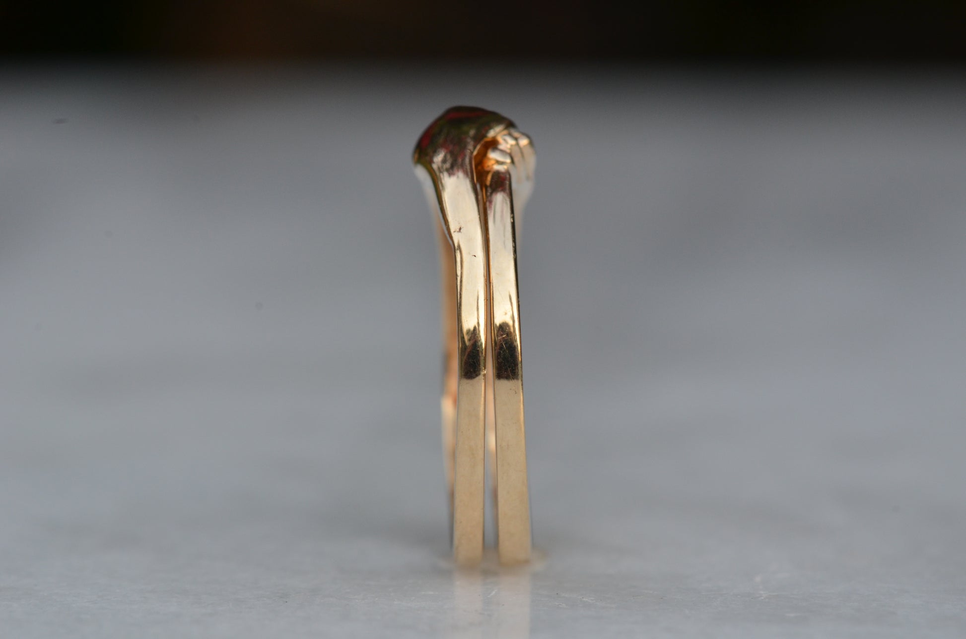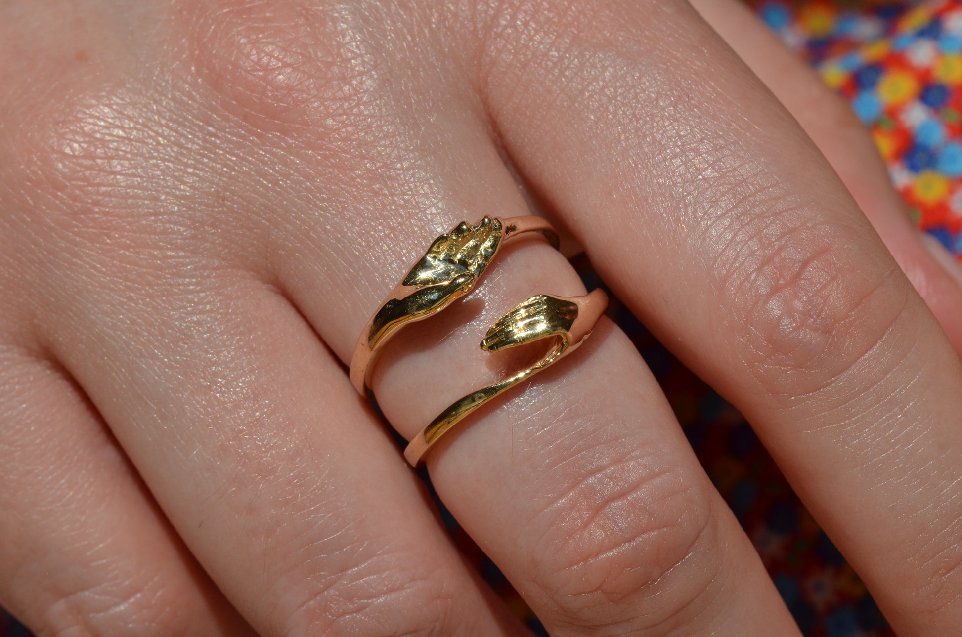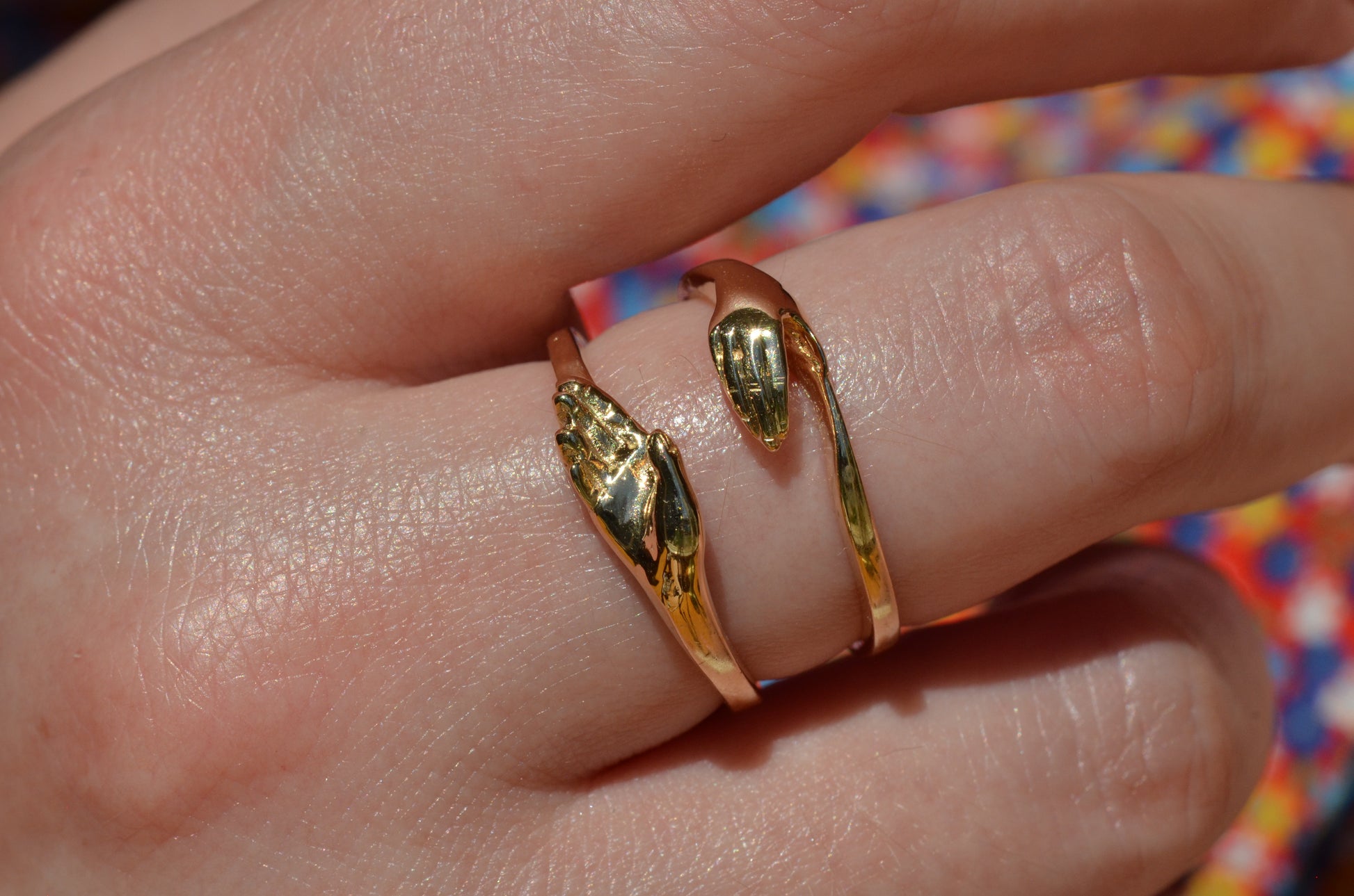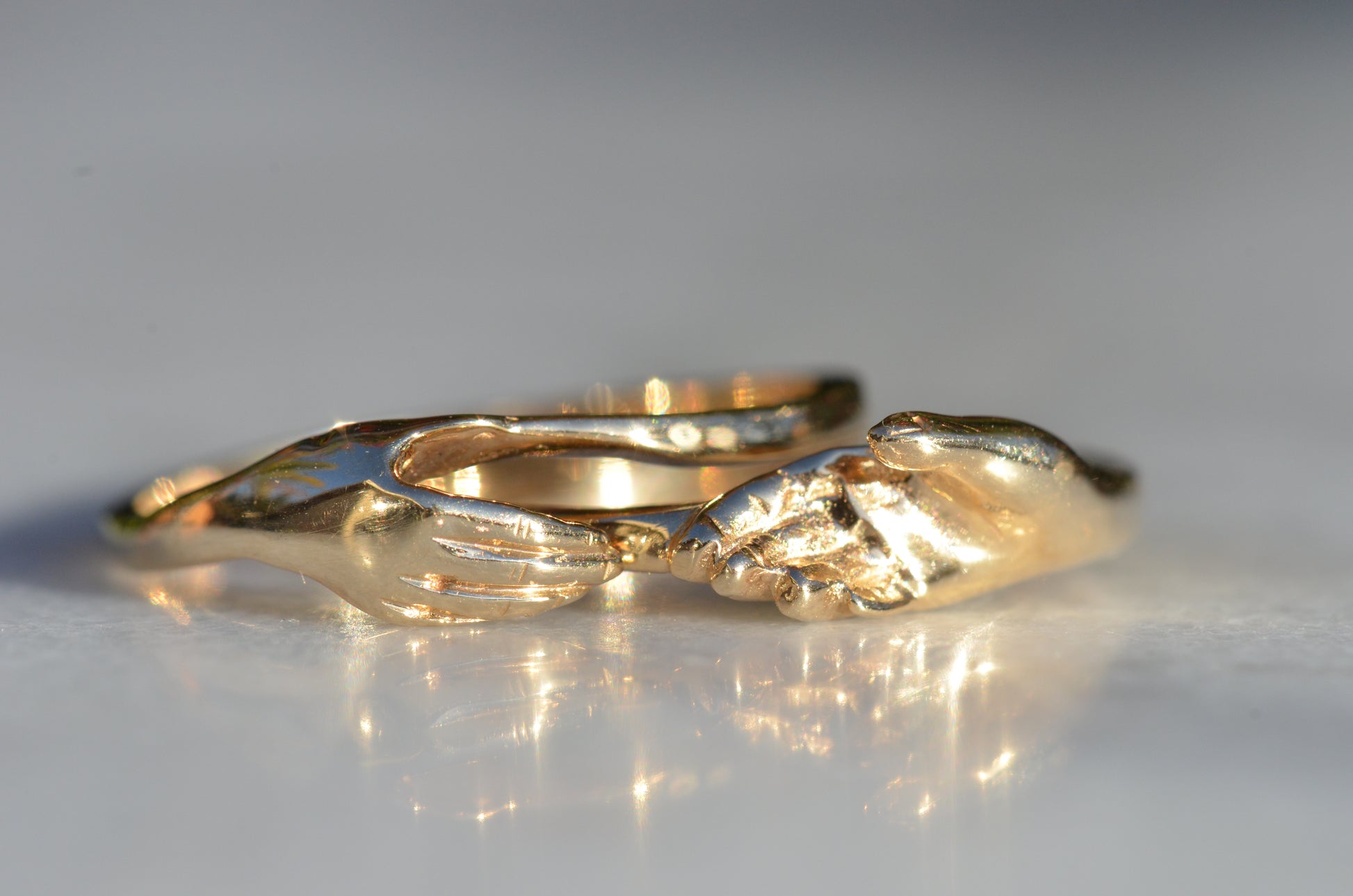 The early fede ring enjoyed many iterations and evolved into the modern claddagh ring where the hands clasp a crowned heart. While many folks tend to use the terms fede and gimmel interchangeably for these handsy styles, gimmel - from the Latin gemellus, or twin - actually refers to a pair of entwined bands. A fede with fixed hands isn't a gimmel, and a pair of locking bands can be a gimmel but not a fede.