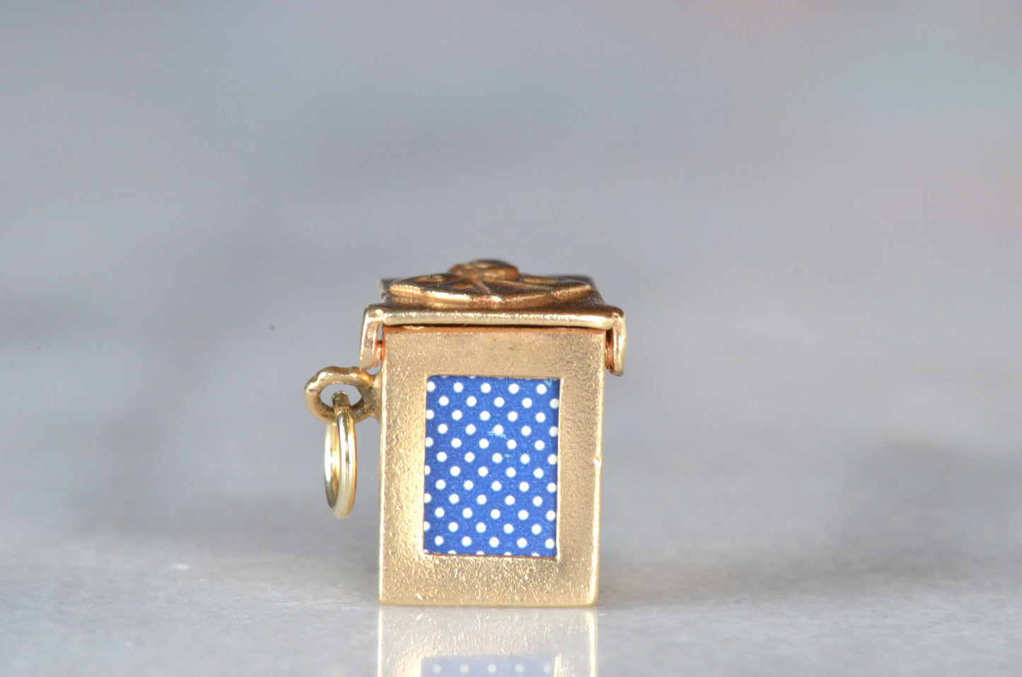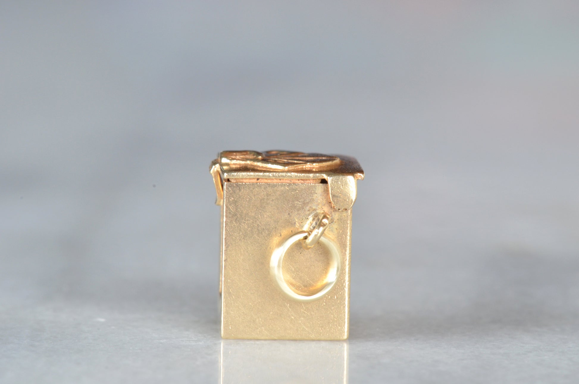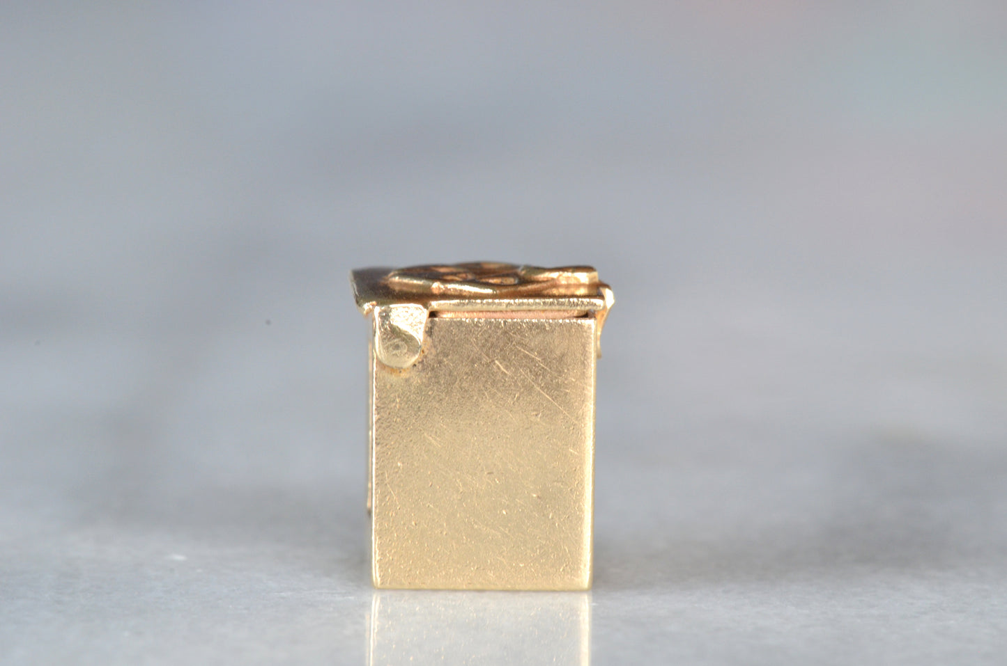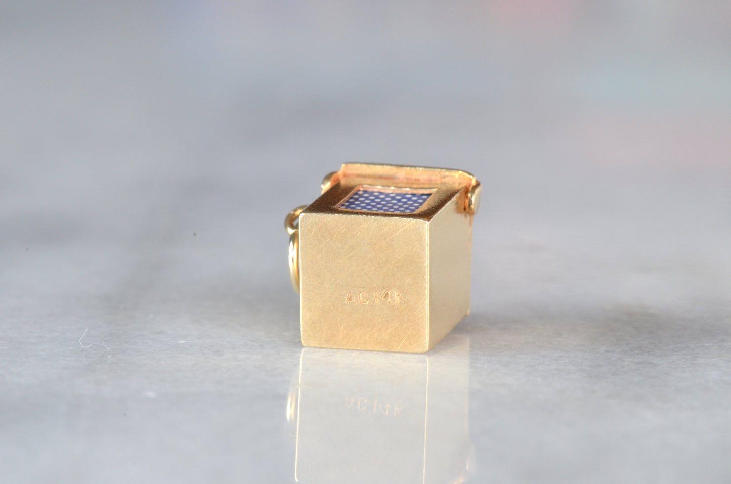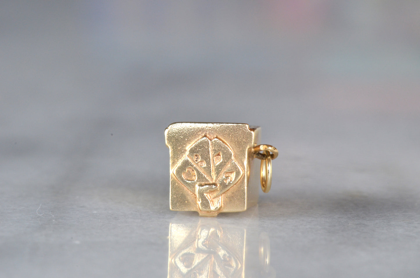 A perfect little mechanical charm, a speciality of the American Charm Company in the 1950s and 1960s, this gold cube opens up to reveal a full deck of cards scaled way down. We love the deck as a reminder that so much of what we do in life is a fine balance between skill and luck - and that it never hurts to have a secret card in your back pocket.