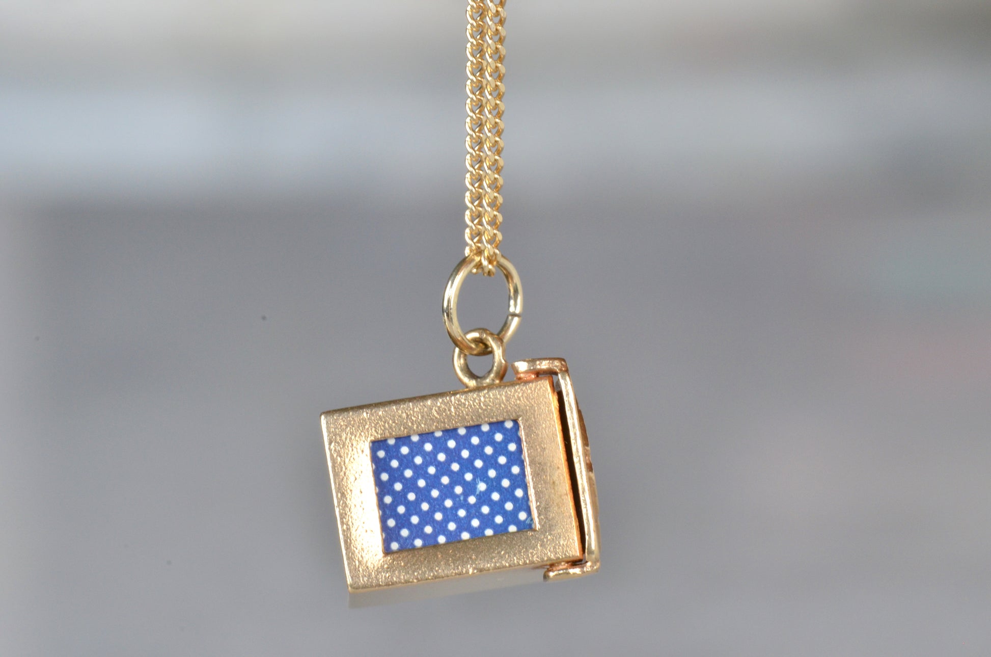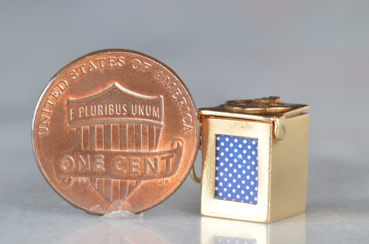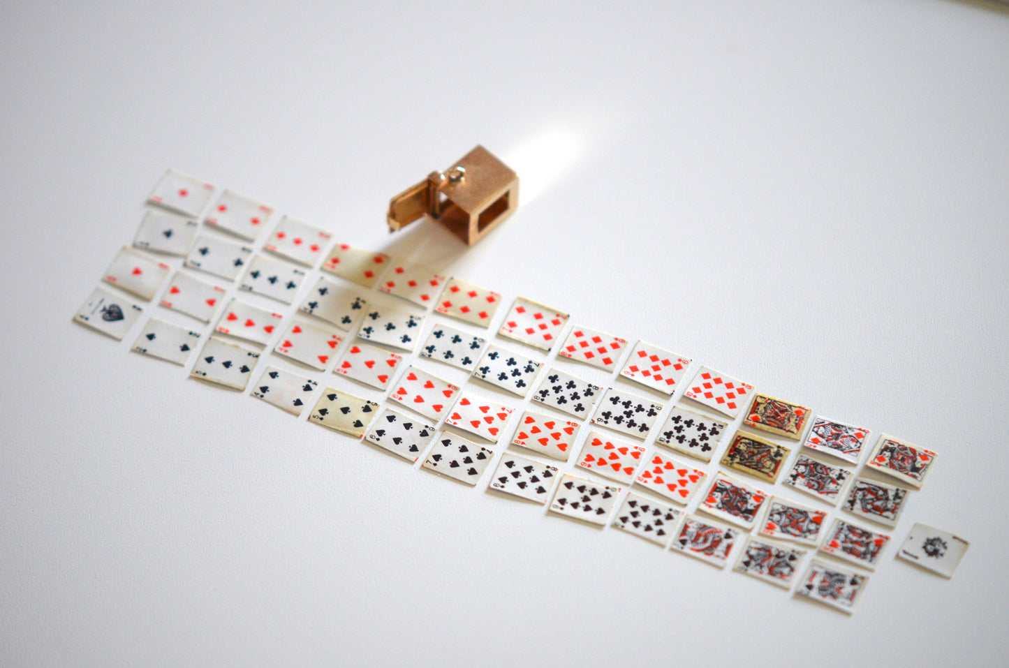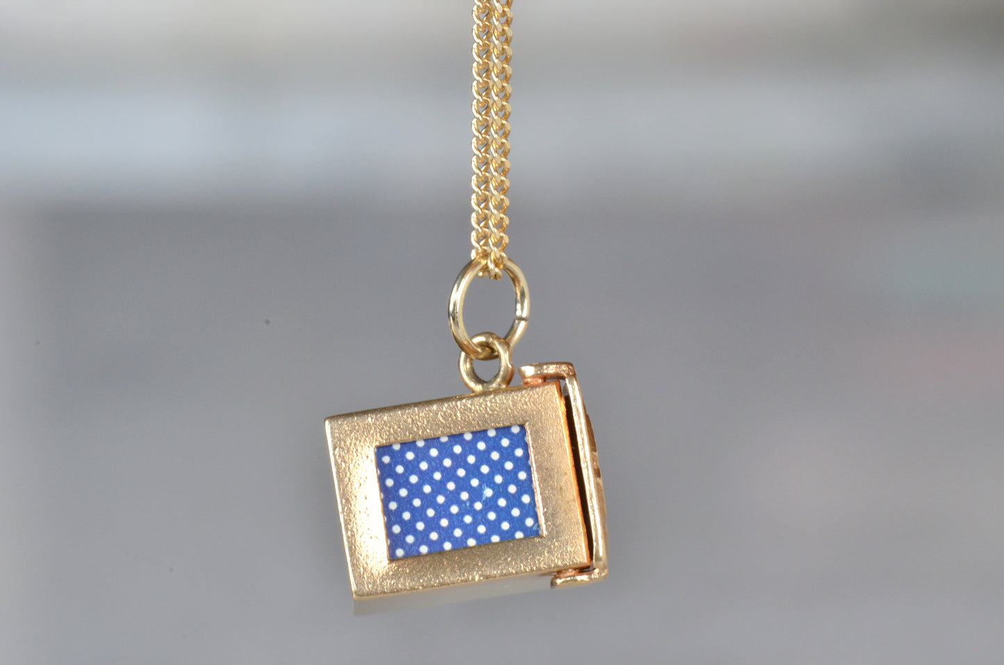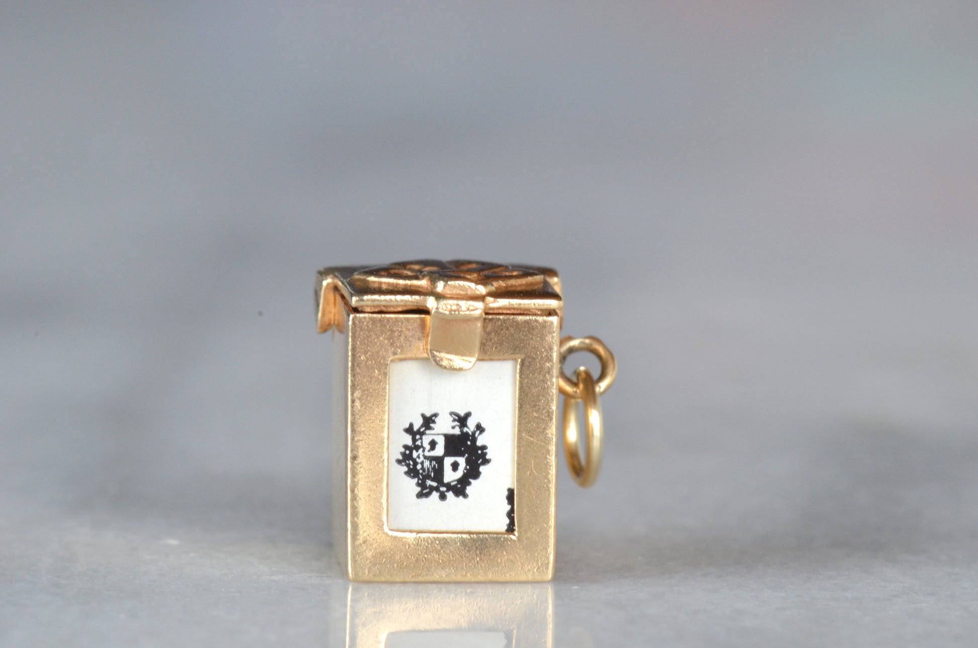 A perfect little mechanical charm, a speciality of the American Charm Company in the 1950s and 1960s, this gold cube opens up to reveal a full deck of cards scaled way down. We love the deck as a reminder that so much of what we do in life is a fine balance between skill and luck - and that it never hurts to have a secret card in your back pocket.