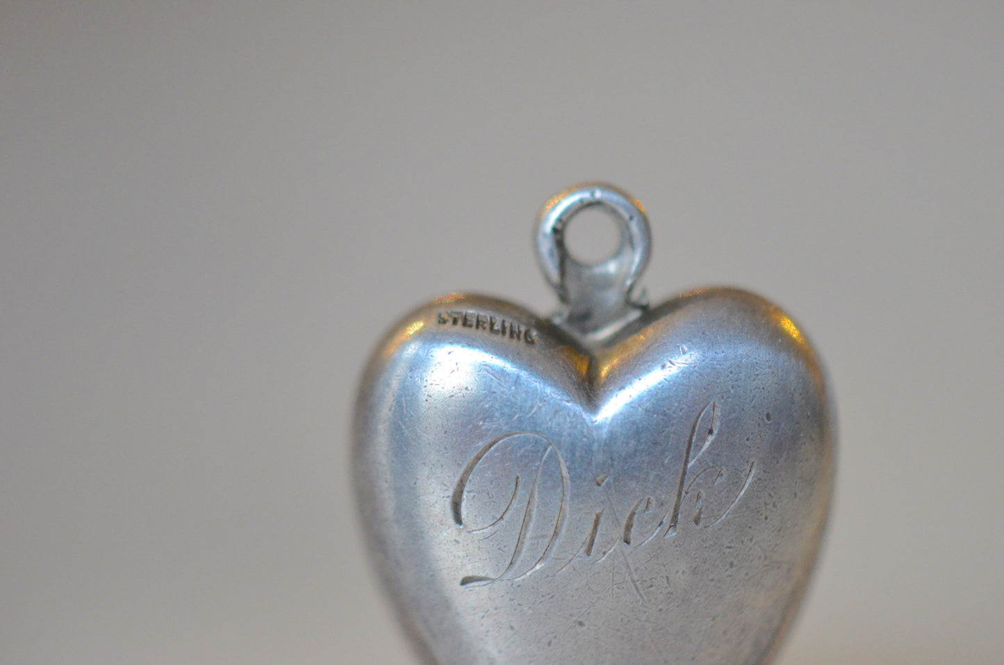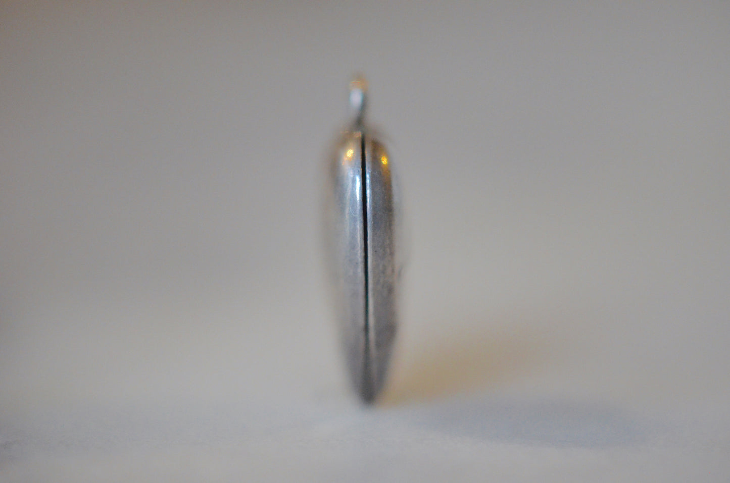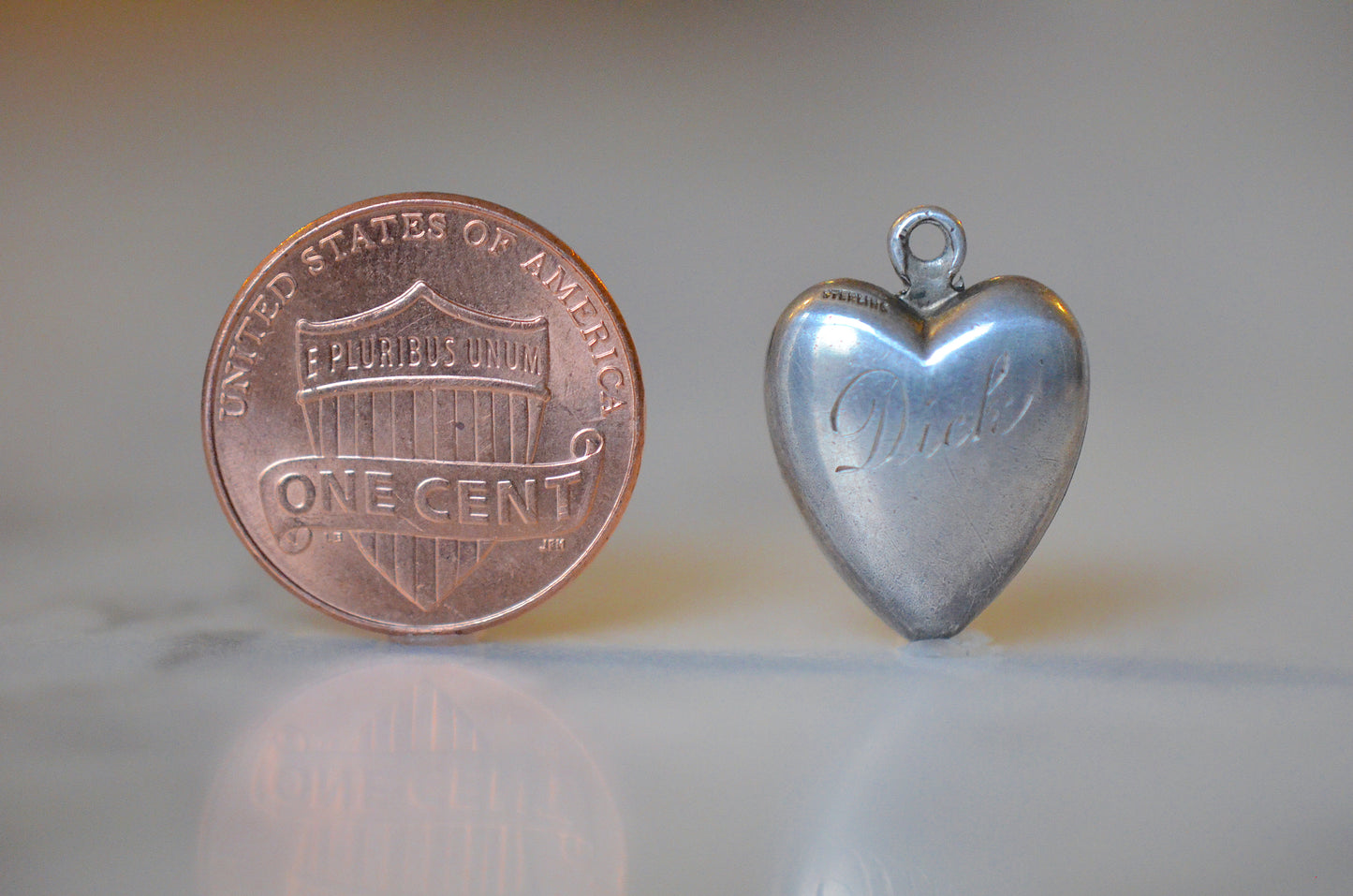 The warm patina on this retro silver charm is like a soft embrace, and we love to imagine the sweet couple who committed their love to metal on this charm. The soft puff of the heart looks almost like a locket, but was die struck and folded together to create a hollow, lightweight volume that catches the light just right.
