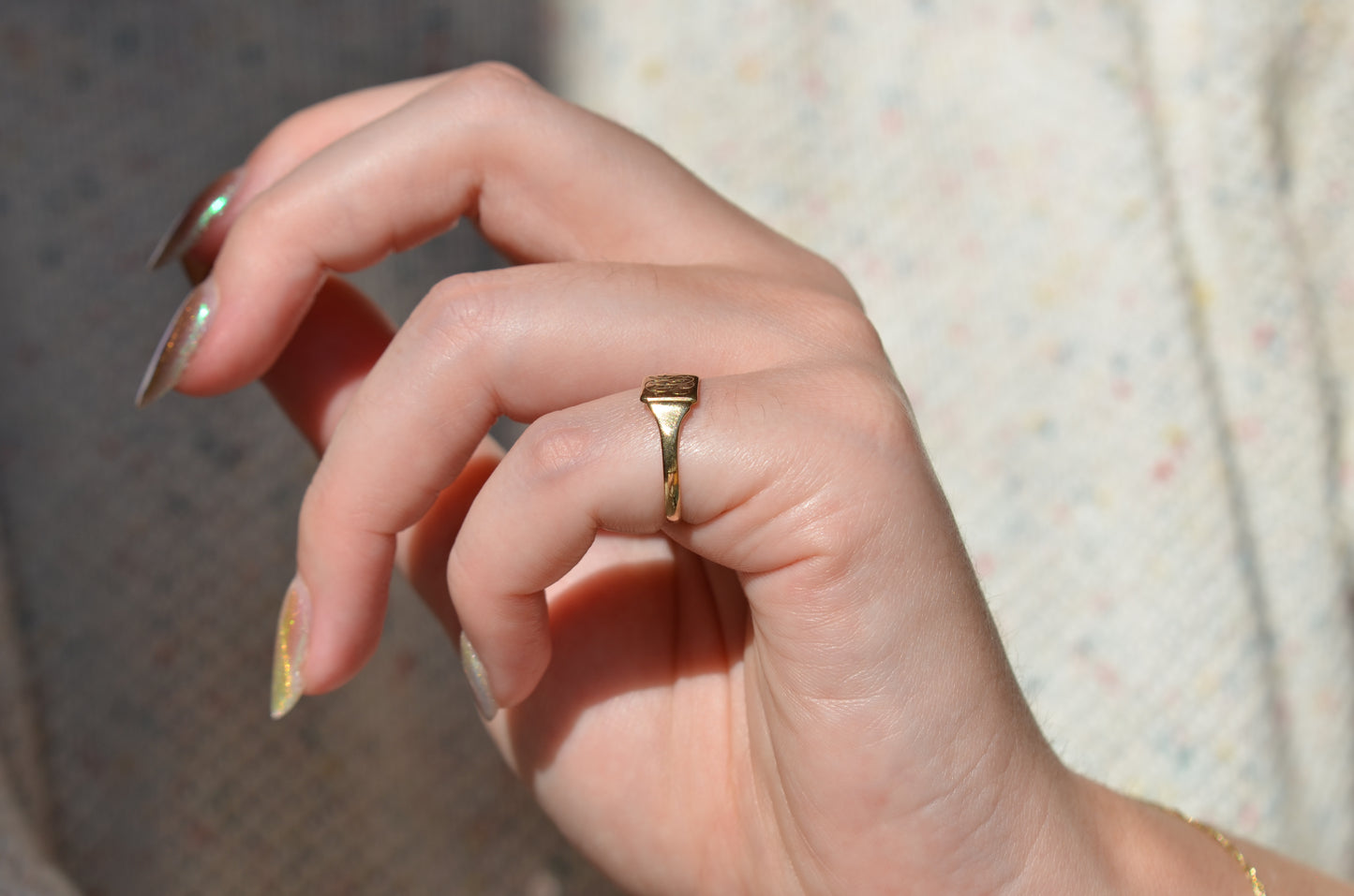 • Face of ring measures 6.8mm x 7.7mm with a rise of 0.3mm; back of band measures 1.9mm wide and 0.5mm thick
