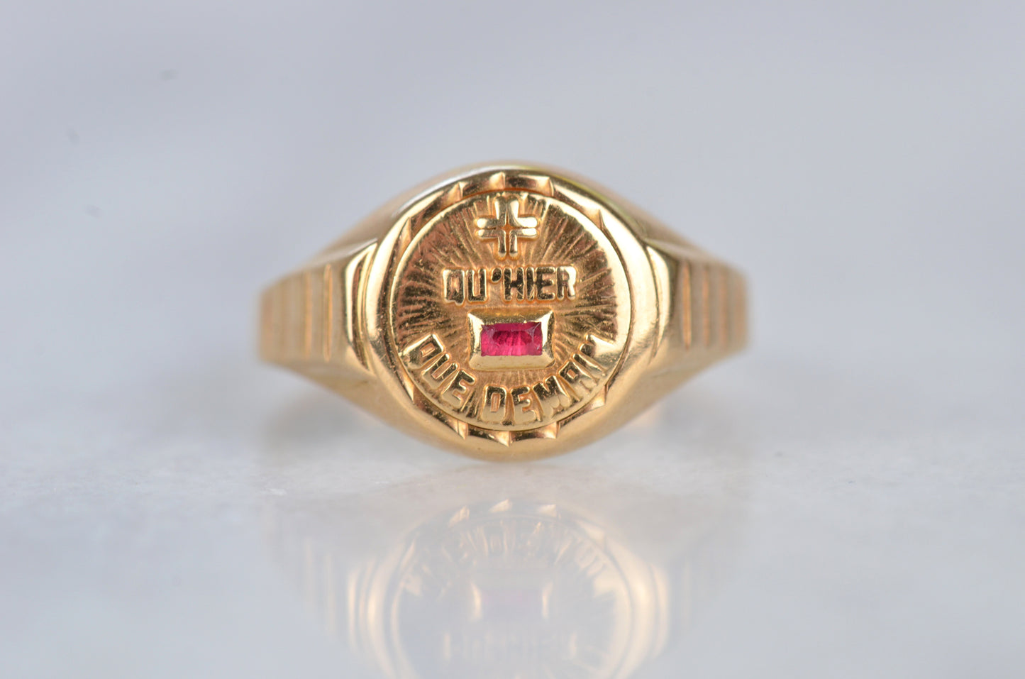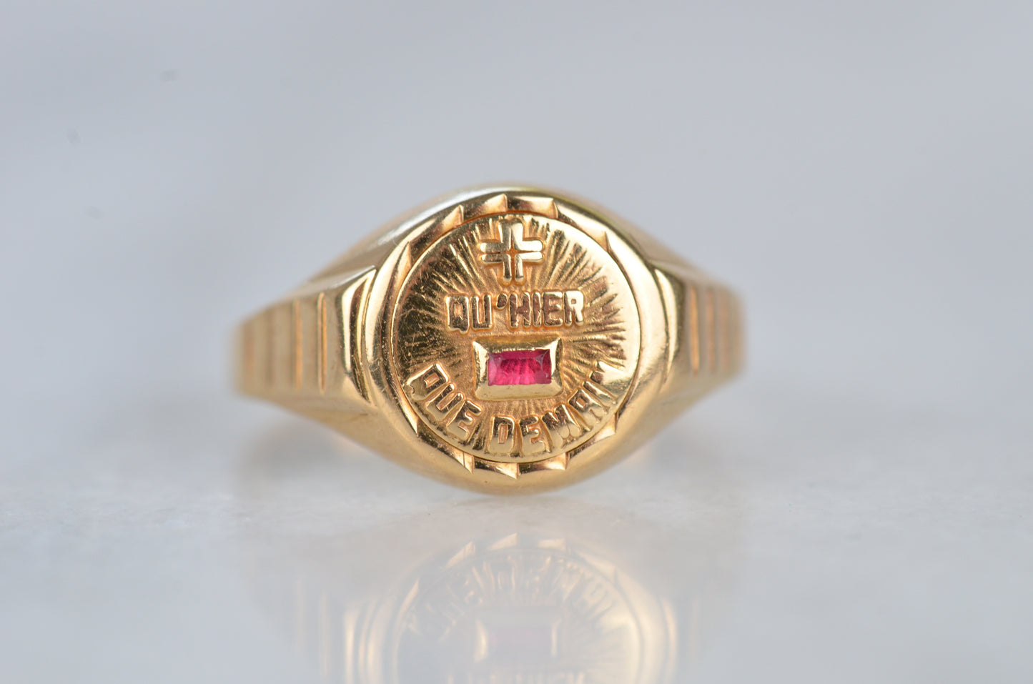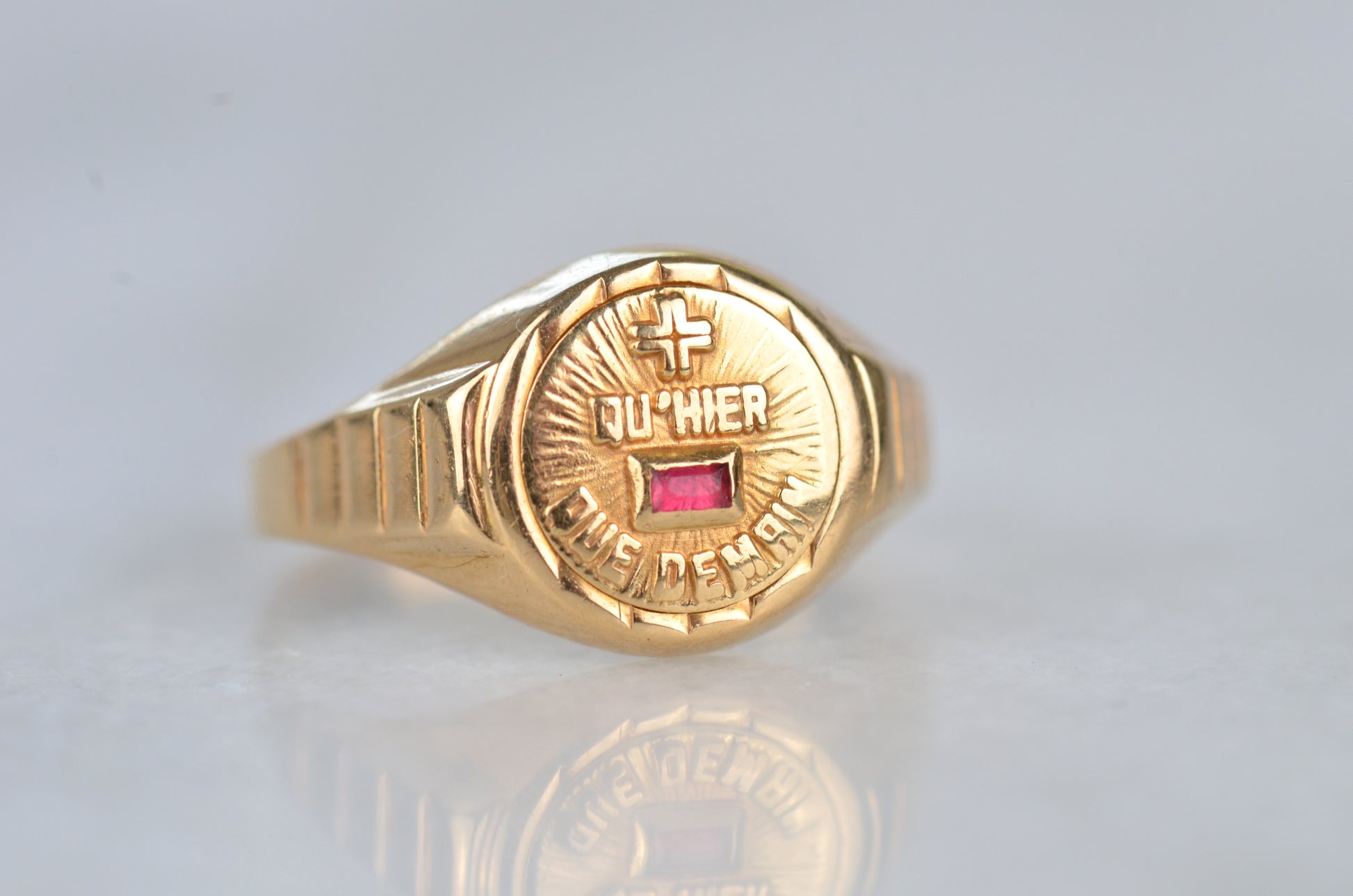 Beautiful vintage French love token, in a perfectly-proportioned ring version. Created by Alphonse Augis and inspired by a letter poet Rosemonde Gérard wrote to her husband, the writer Edmond Rostand, the pendant features a rebus reading "+ qu'hier - que demain" for the lines,
