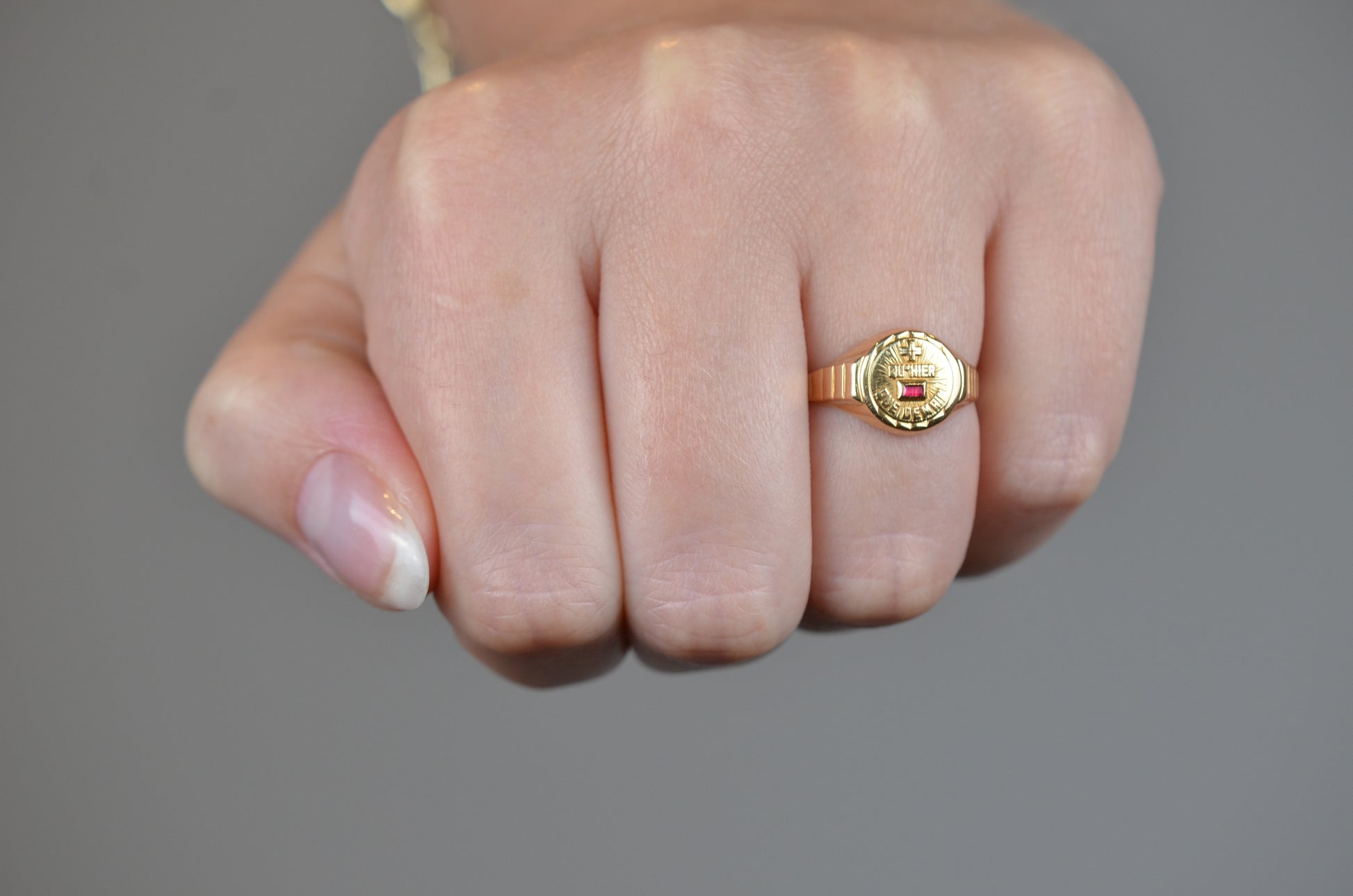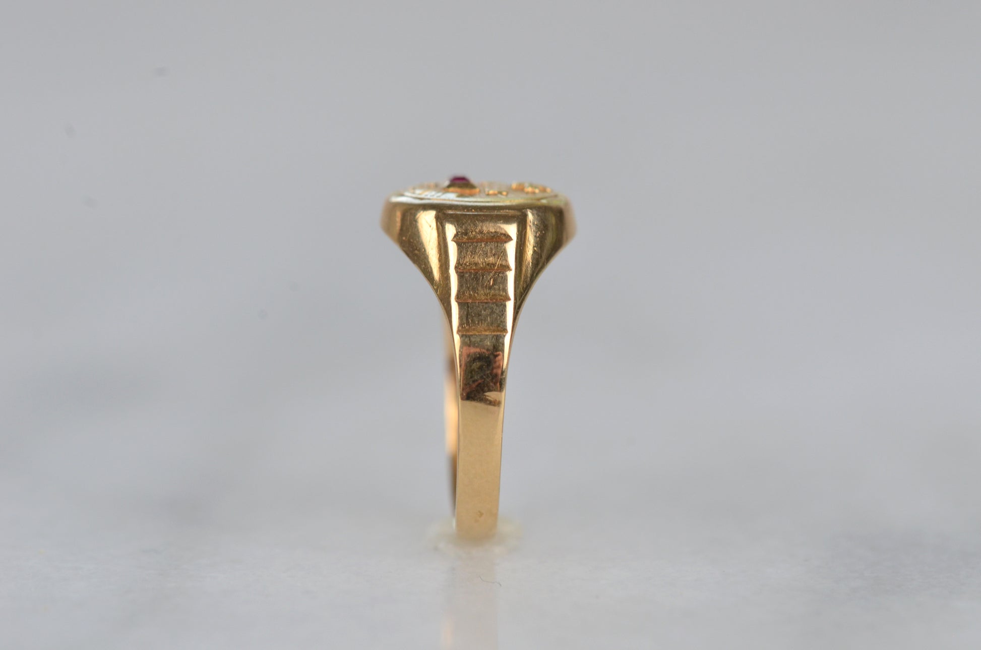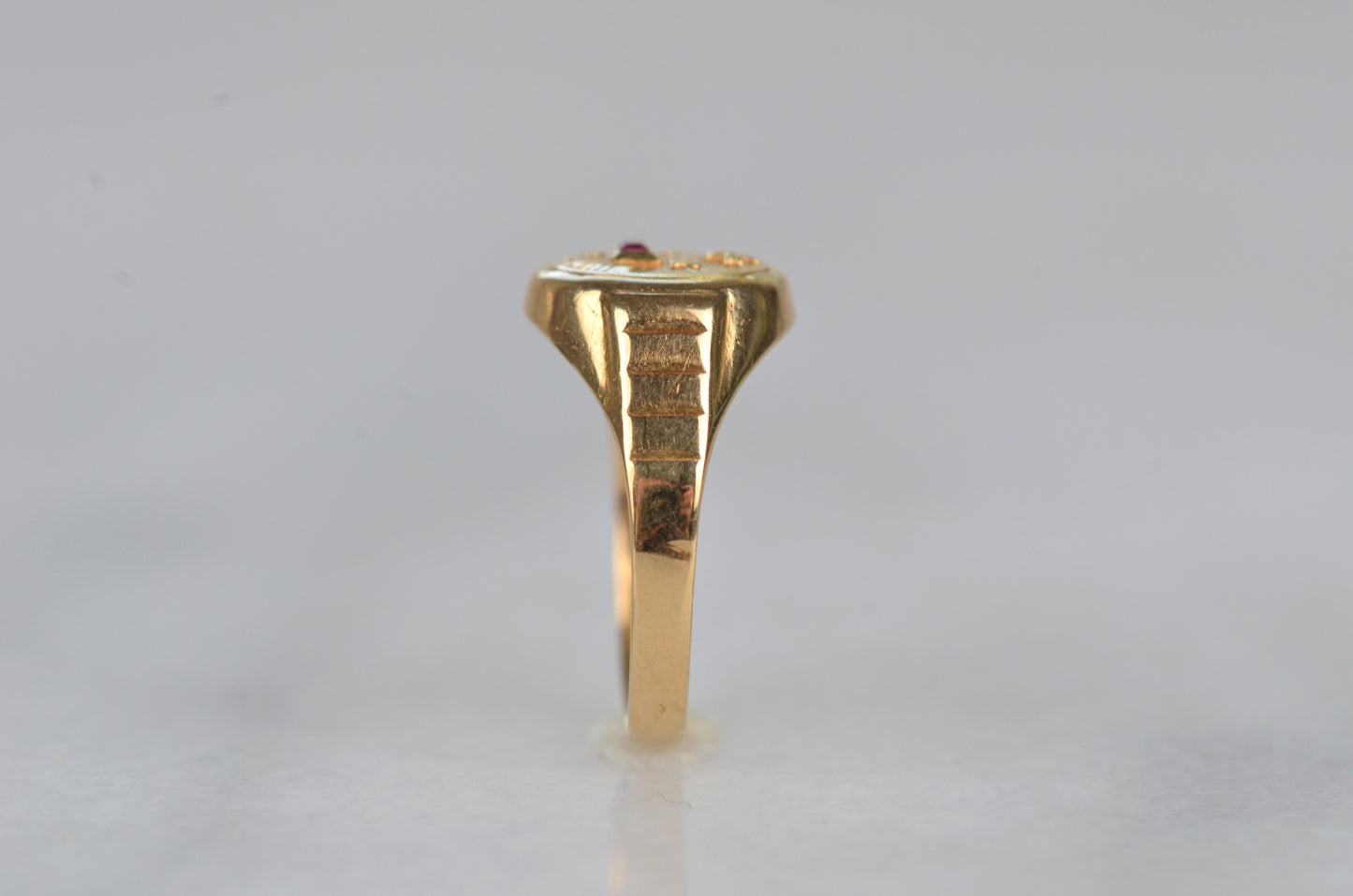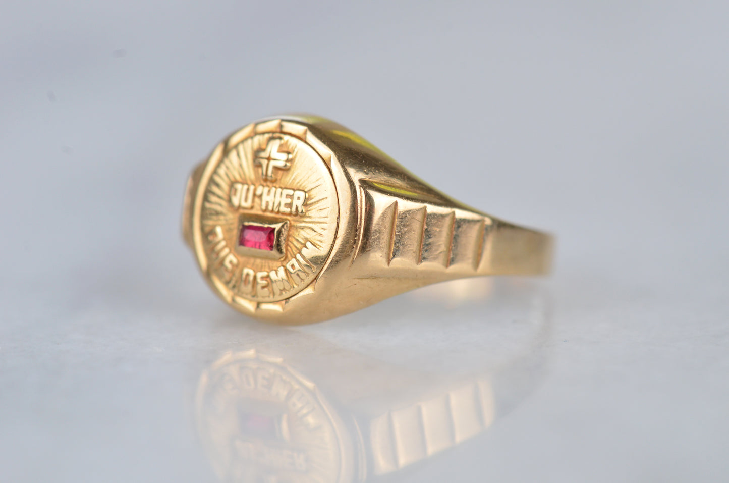 This ring is possibly a conversion, with a custom ring mount built for the token. It is in good vintage condition, and the most comfortable and wearable ring version we've come across - slim, low profile, and perfect for every day. Minor evidence of resizing (along with thinning in the back), and wear to the face and shoulders.