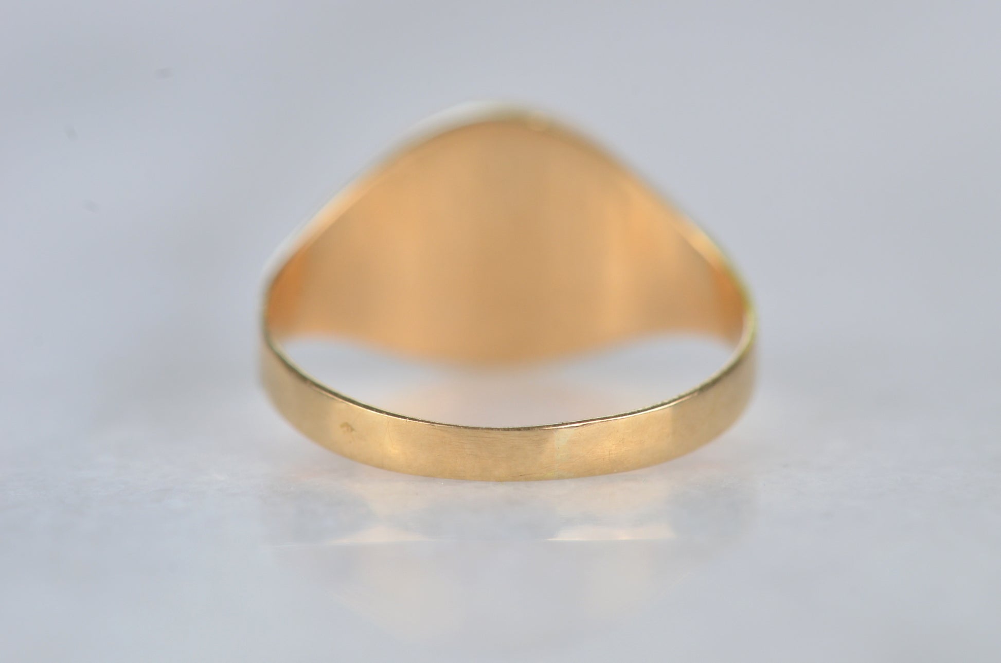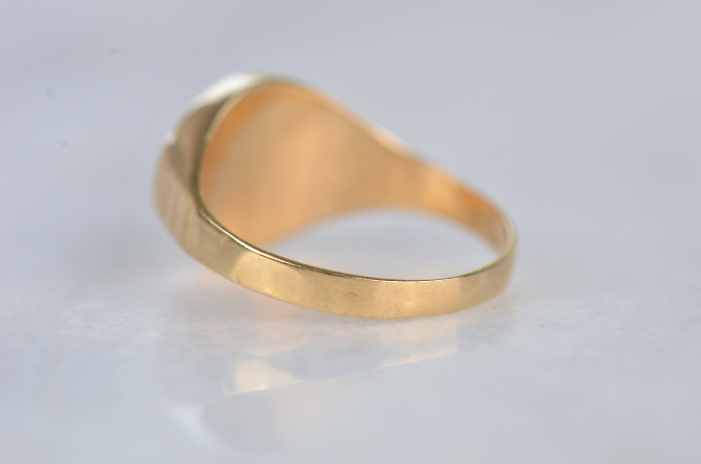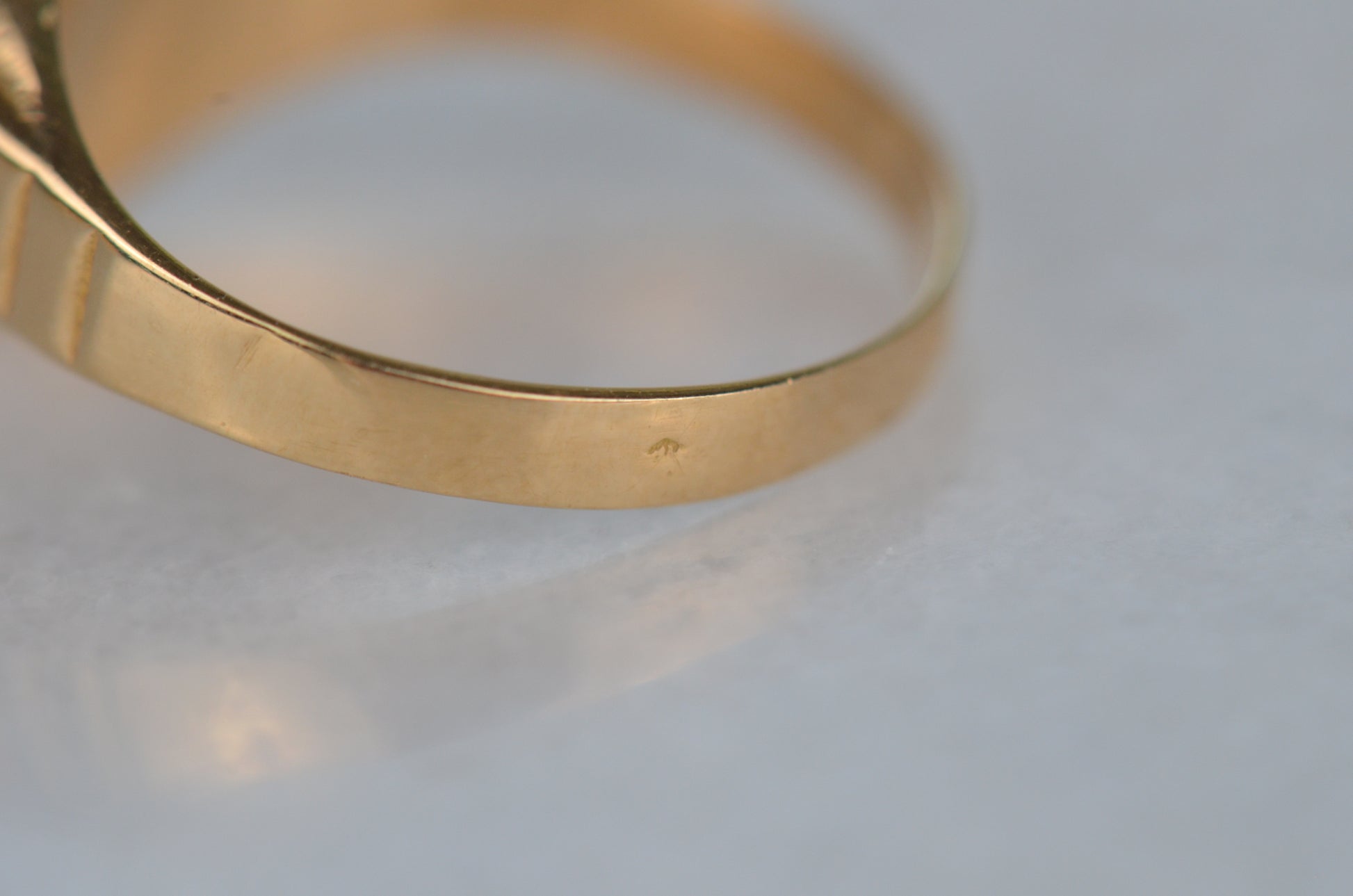 • 18k yellow gold, with faintest stamp that appear to be a French maker's mark on the exterior of the band, and tested