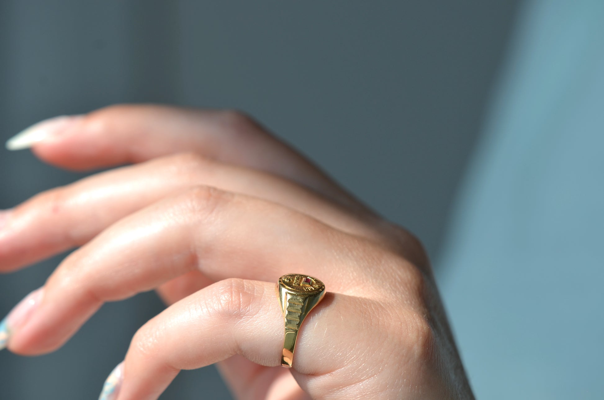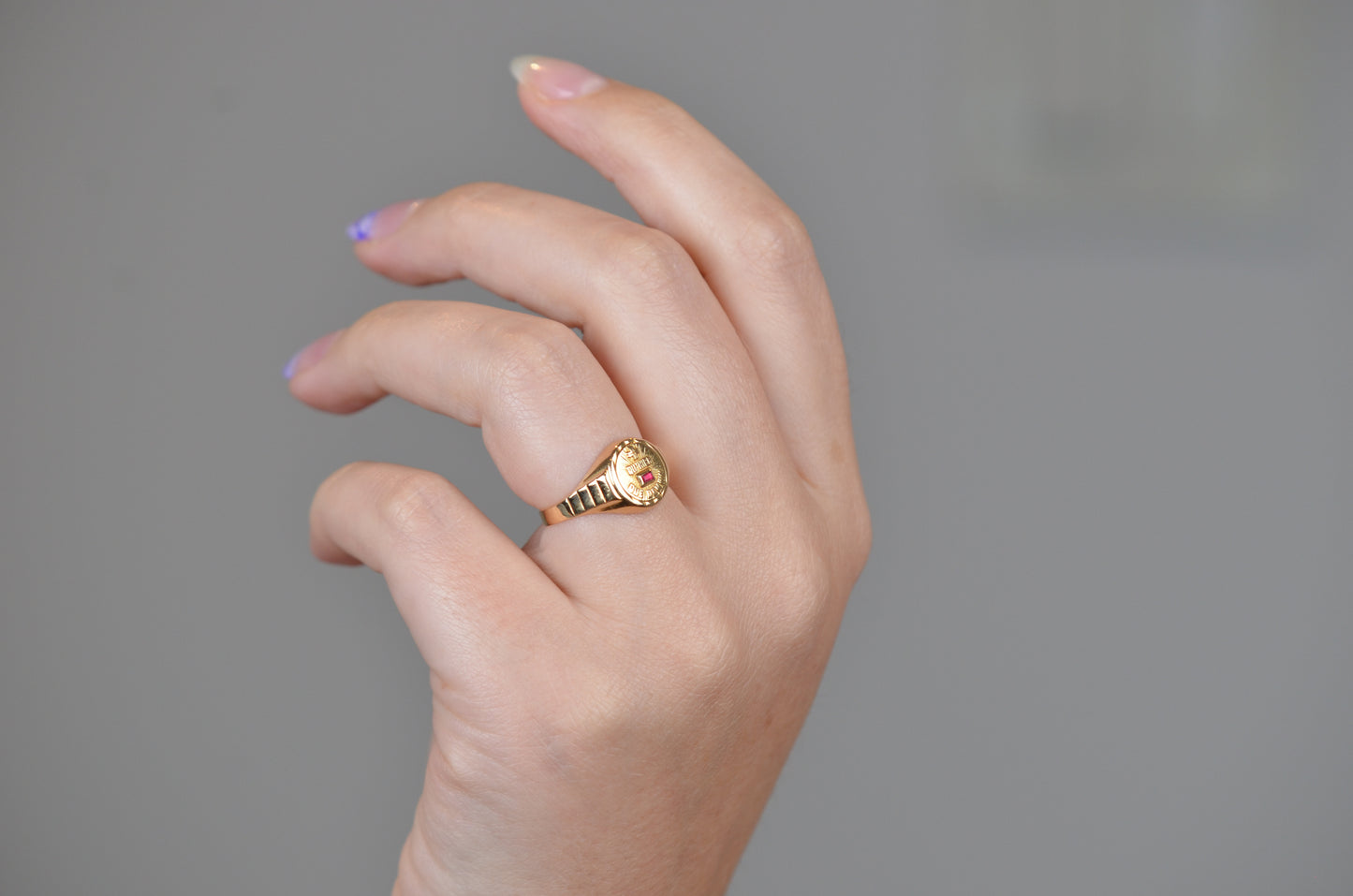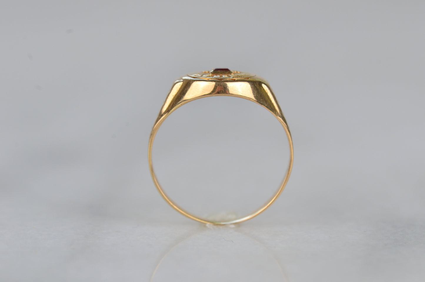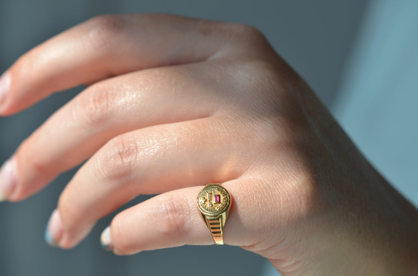 • 18k yellow gold, with faintest stamp that appear to be a French maker's mark on the exterior of the band, and tested