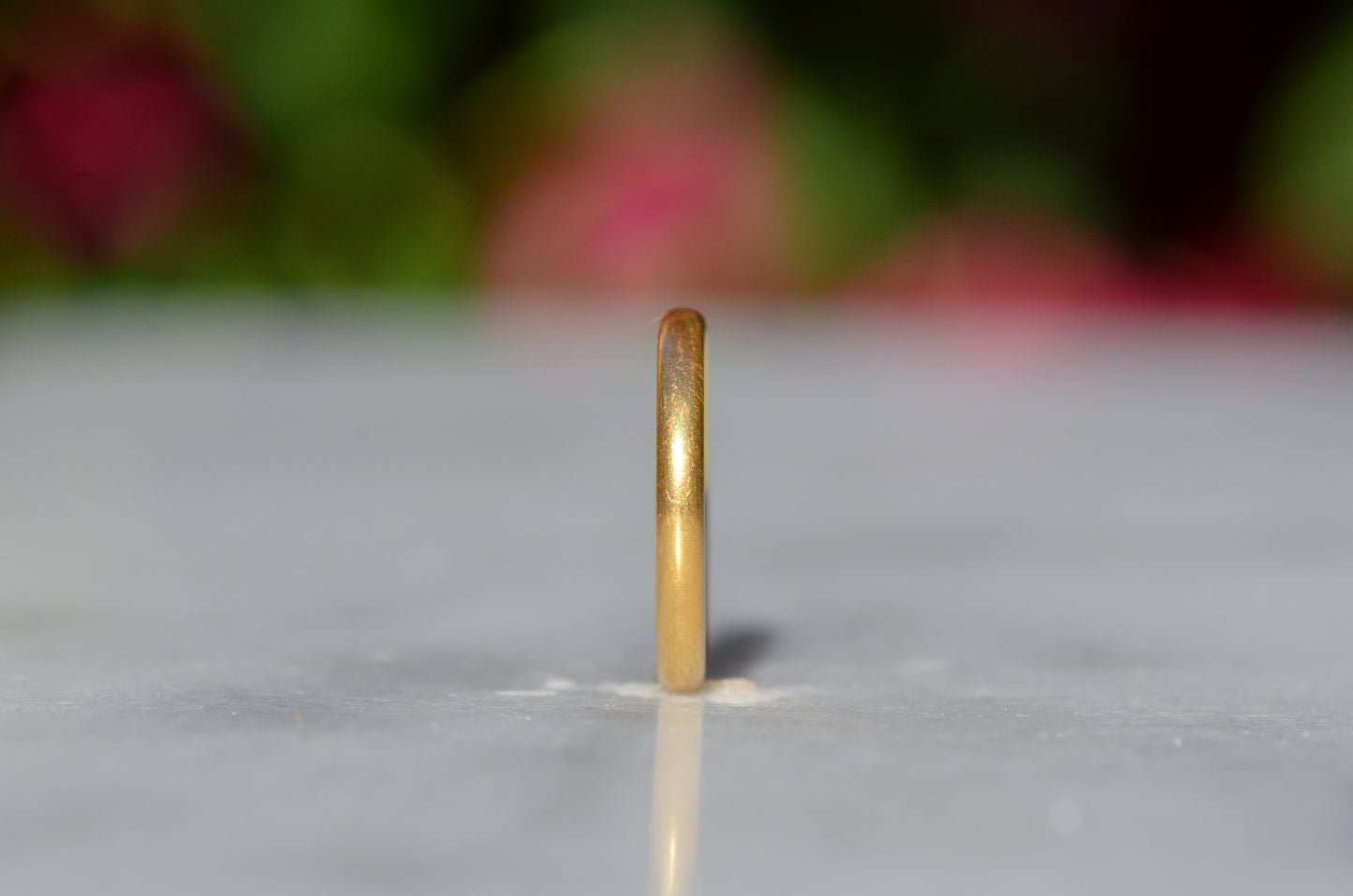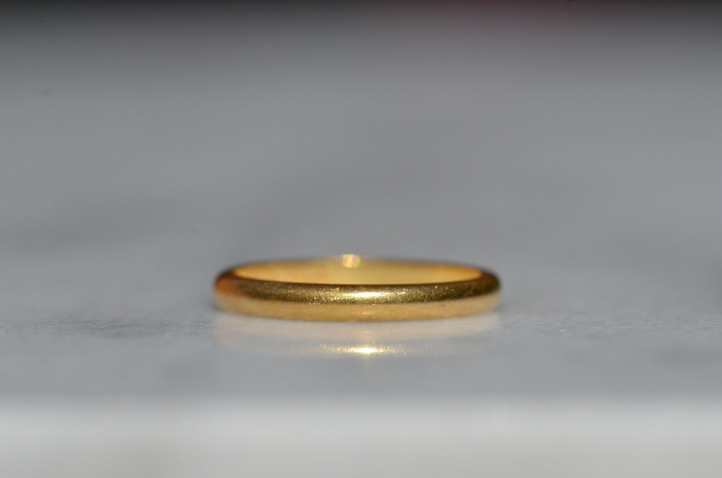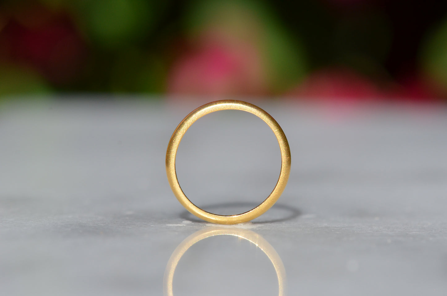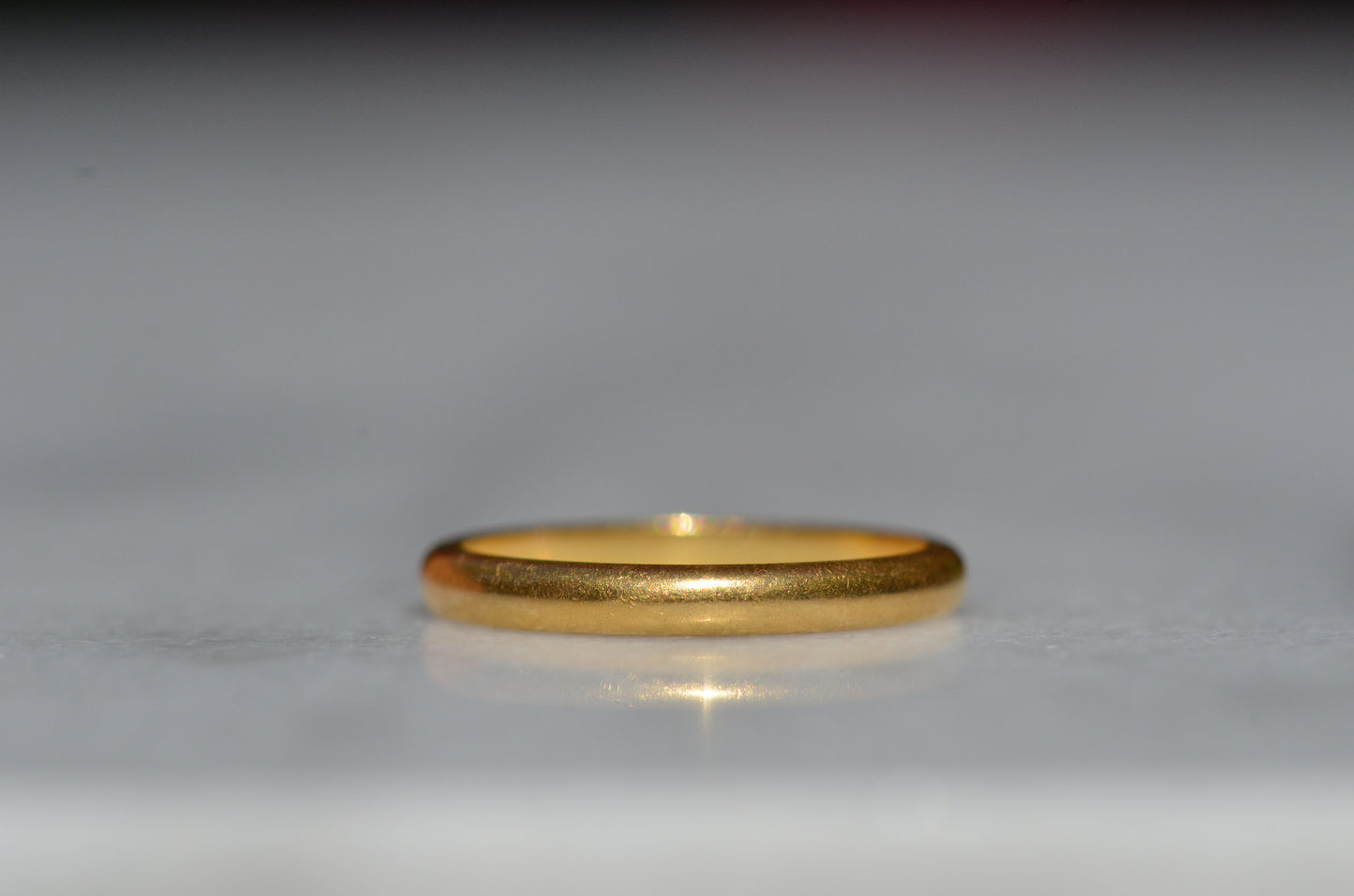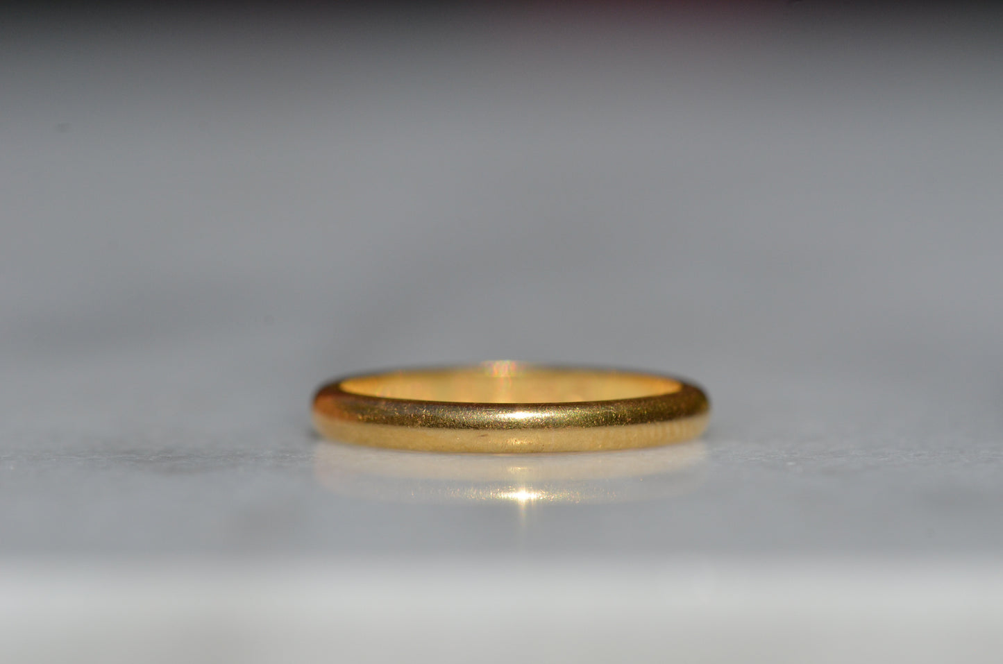 Gold alloys are softer in higher karats, so this old ring has developed some lovely wear over its lifetime with all the little scratches and dings that can't be replicated in a modern piece. While band rings are easy to resize, and often bear evidence of past resizing, we don't recommend it for this ring as that beautiful patina would be lost.