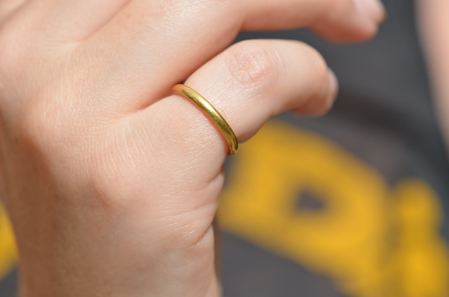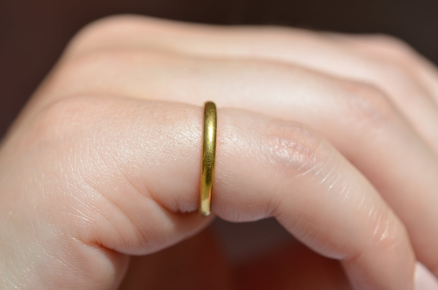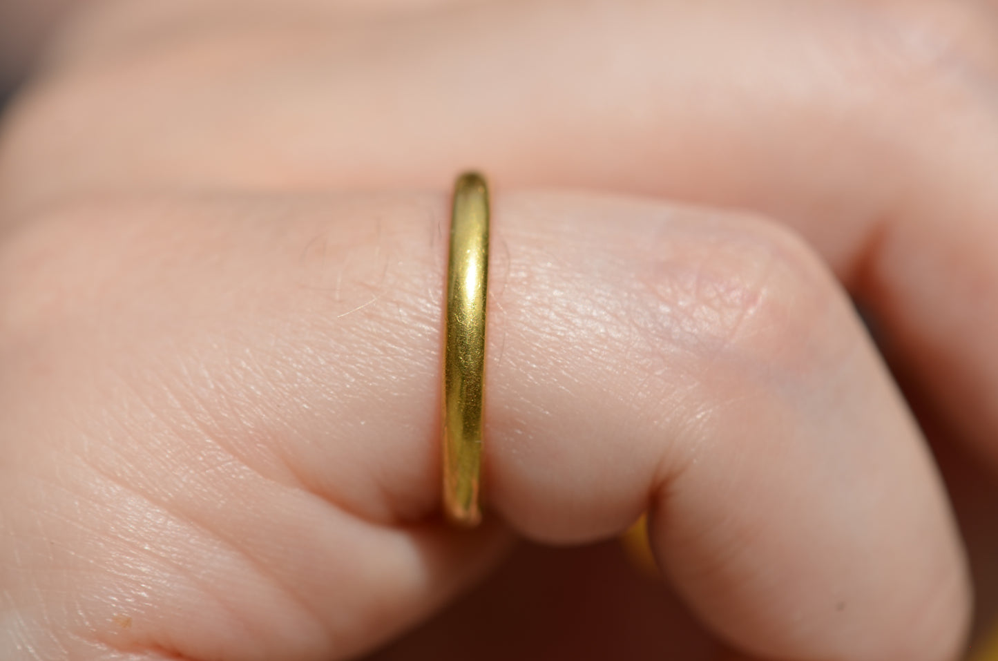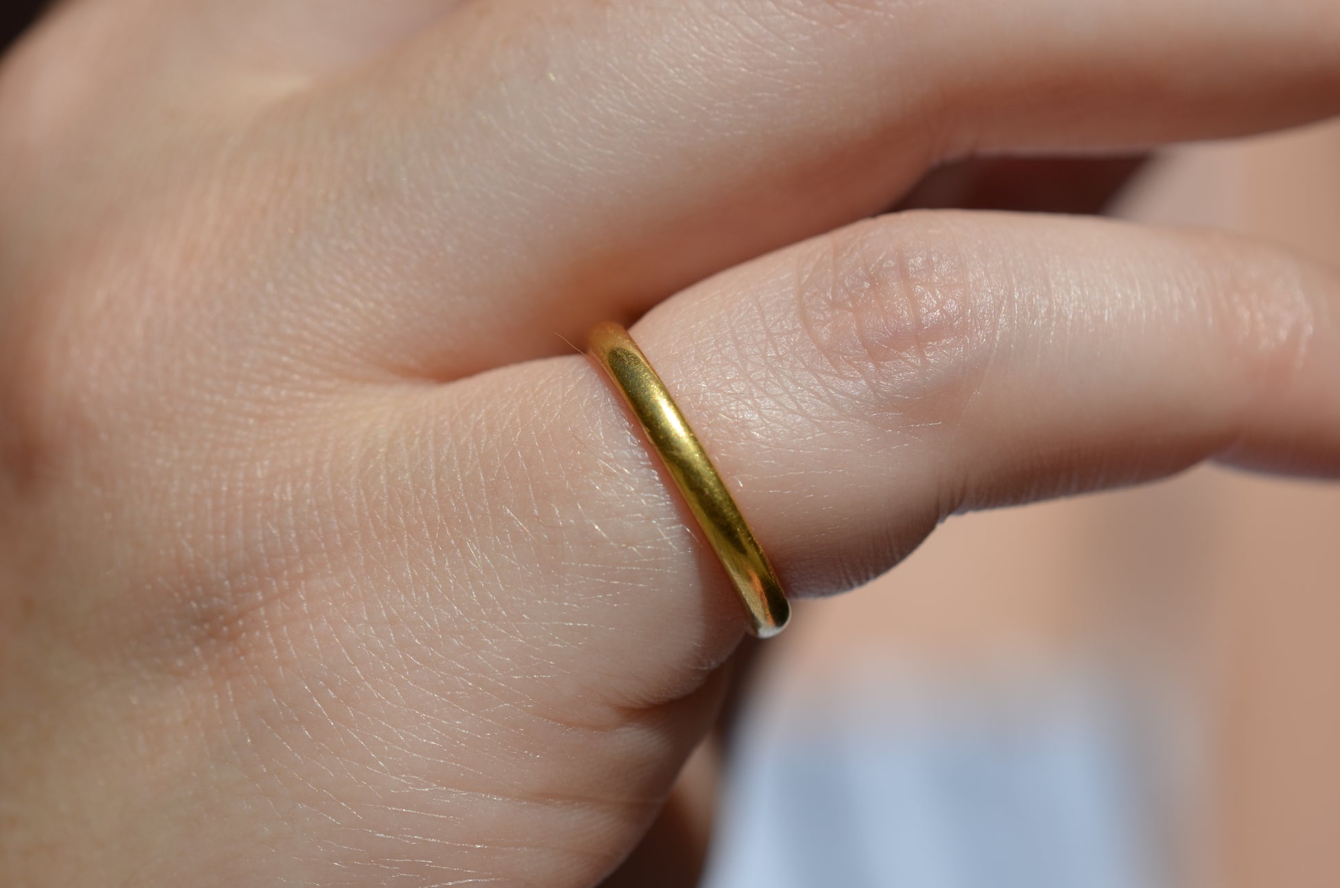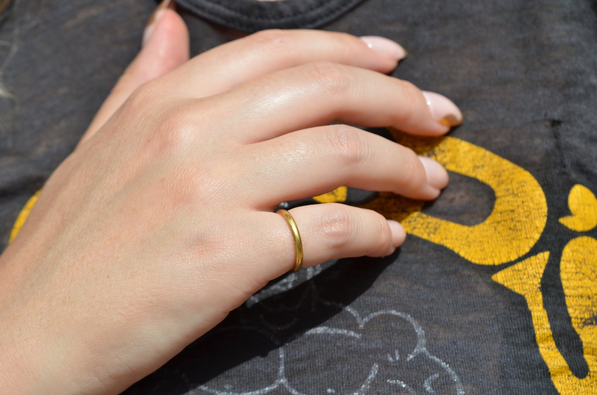 Gold alloys are softer in higher karats, so this old ring has developed some lovely wear over its lifetime with all the little scratches and dings that can't be replicated in a modern piece. While band rings are easy to resize, and often bear evidence of past resizing, we don't recommend it for this ring as that beautiful patina would be lost.