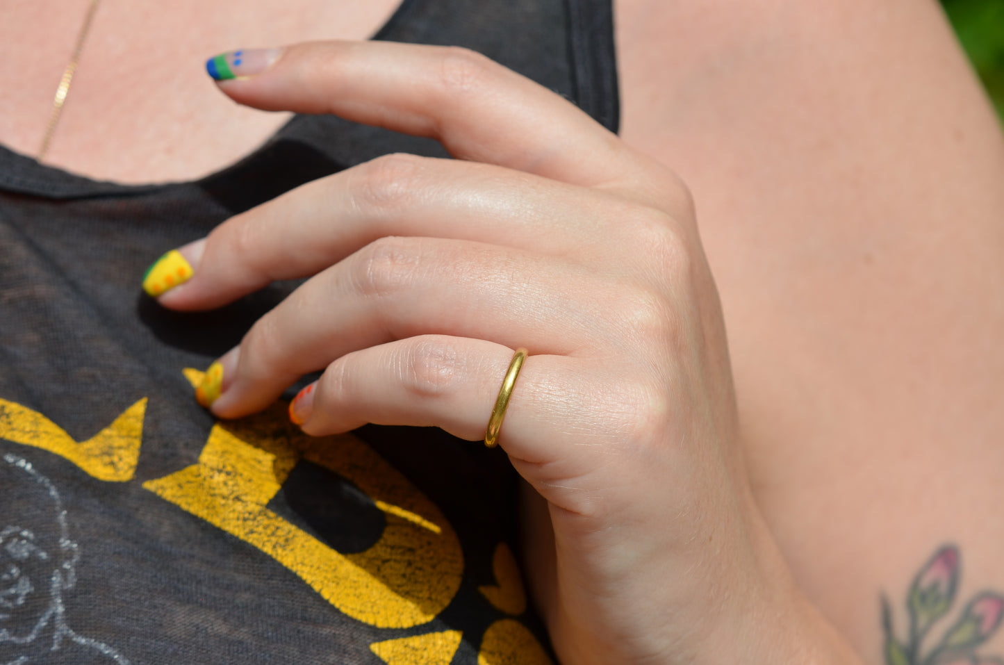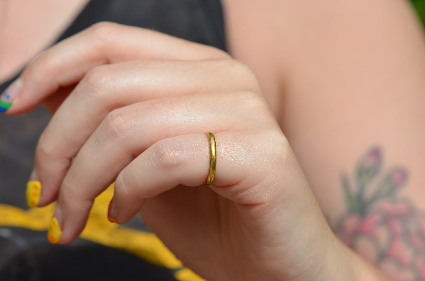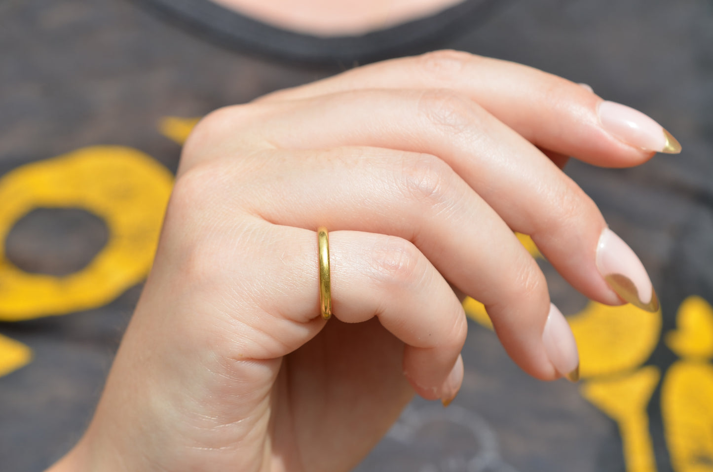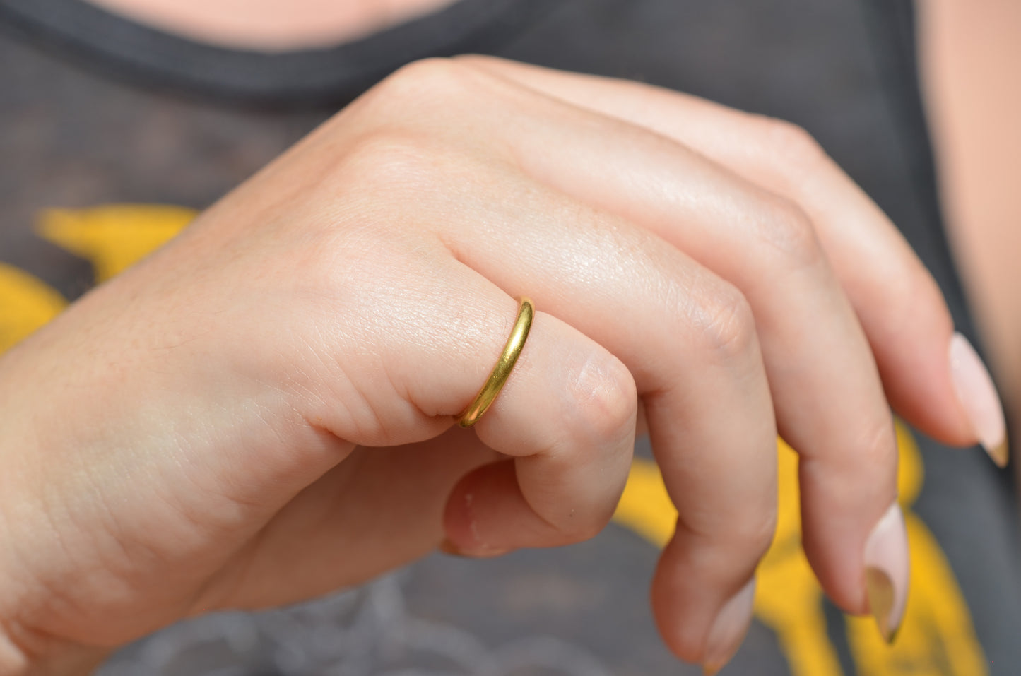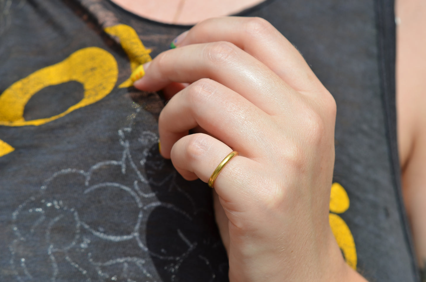 Gold alloys are softer in higher karats, so this old ring has developed some lovely wear over its lifetime with all the little scratches and dings that can't be replicated in a modern piece. While band rings are easy to resize, and often bear evidence of past resizing, we don't recommend it for this ring as that beautiful patina would be lost.