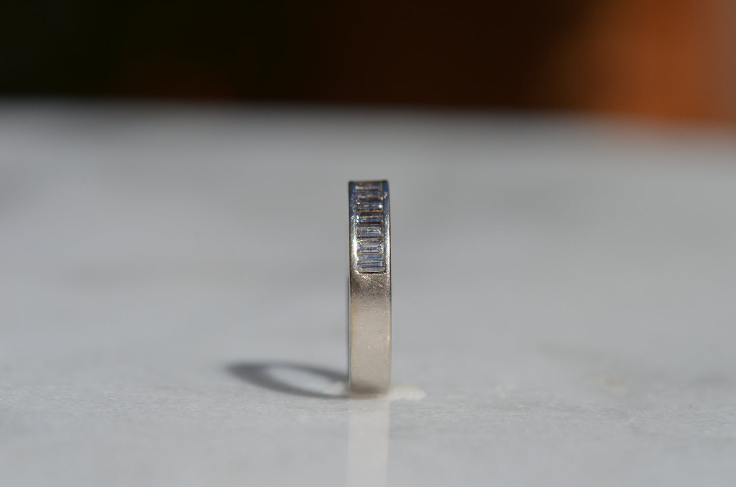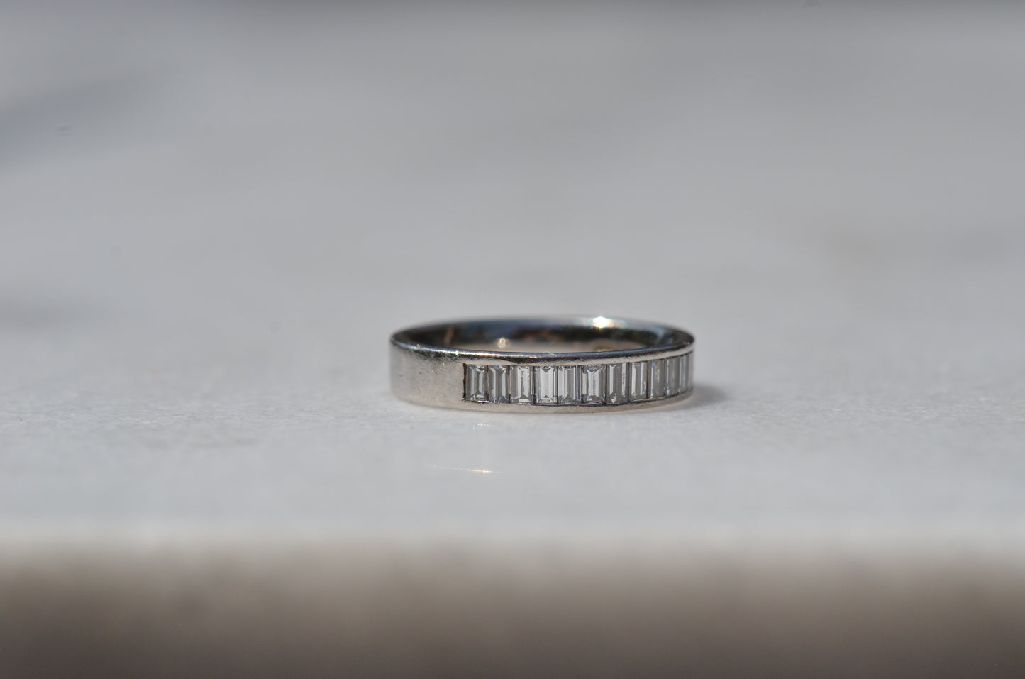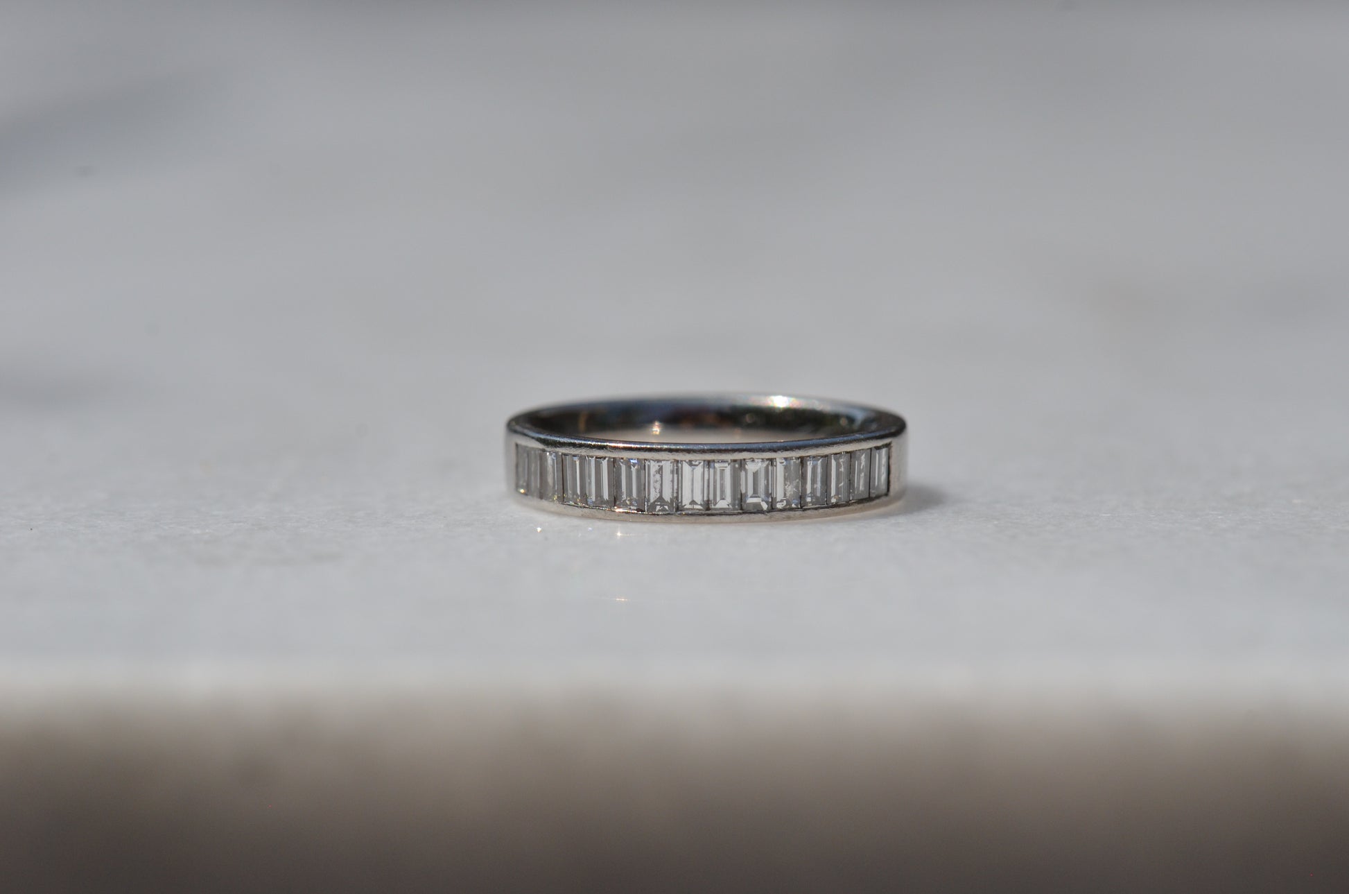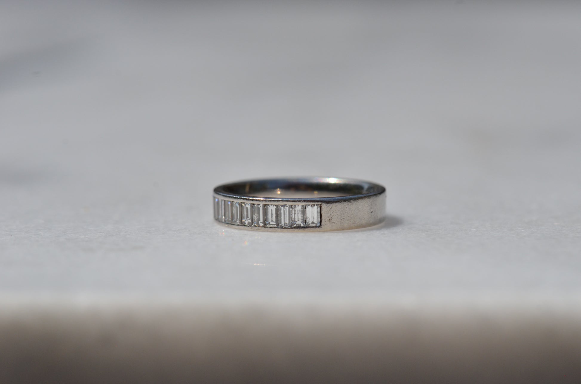 This ring is an icy dream: broken-in platinum, leggy baguette diamonds, and slim lines for easy stacking make it a breeze to add to your jewelry wardrobe, while the elegance of the mirror-like step cut diamonds make a statement all on their own.