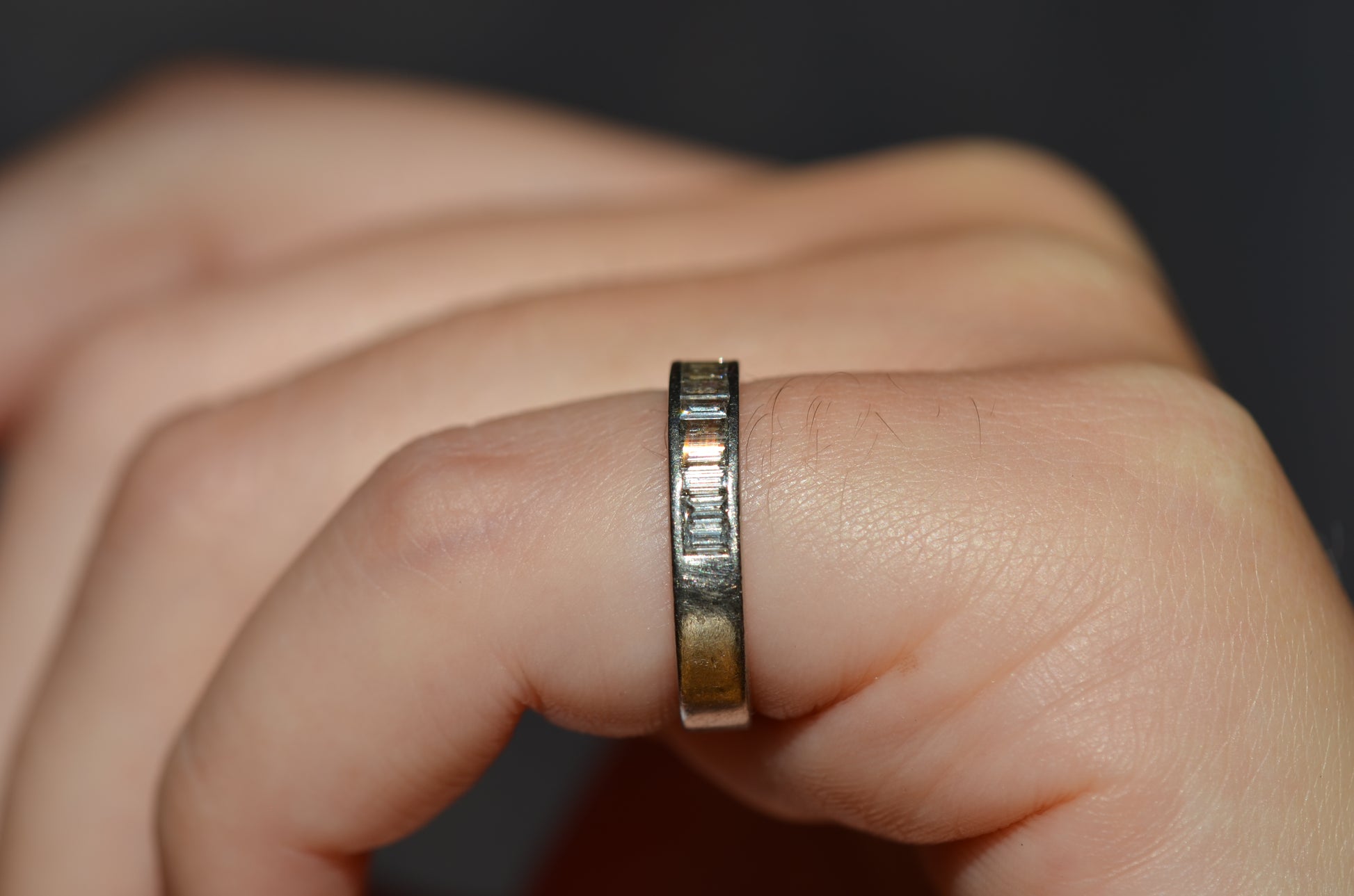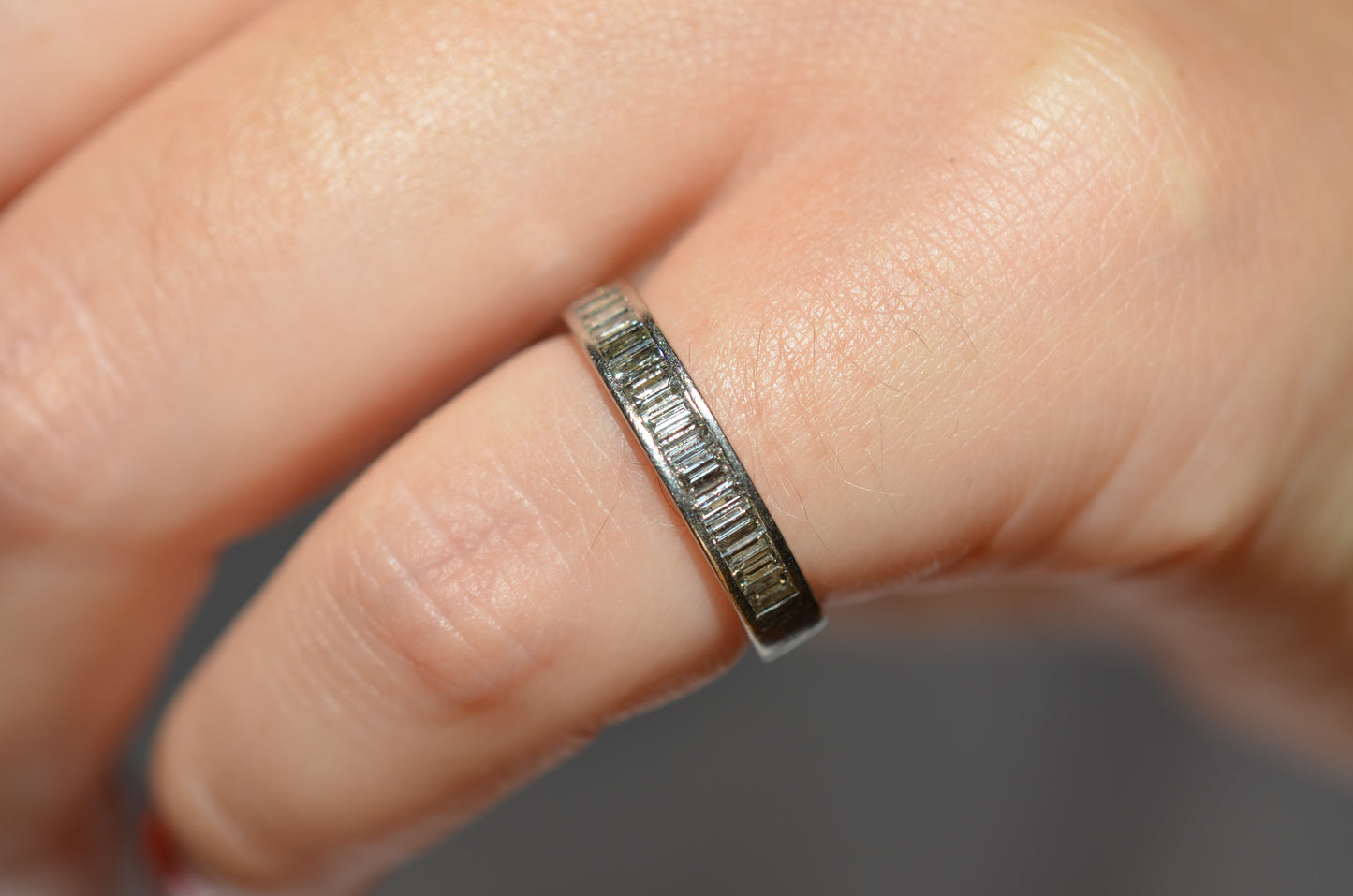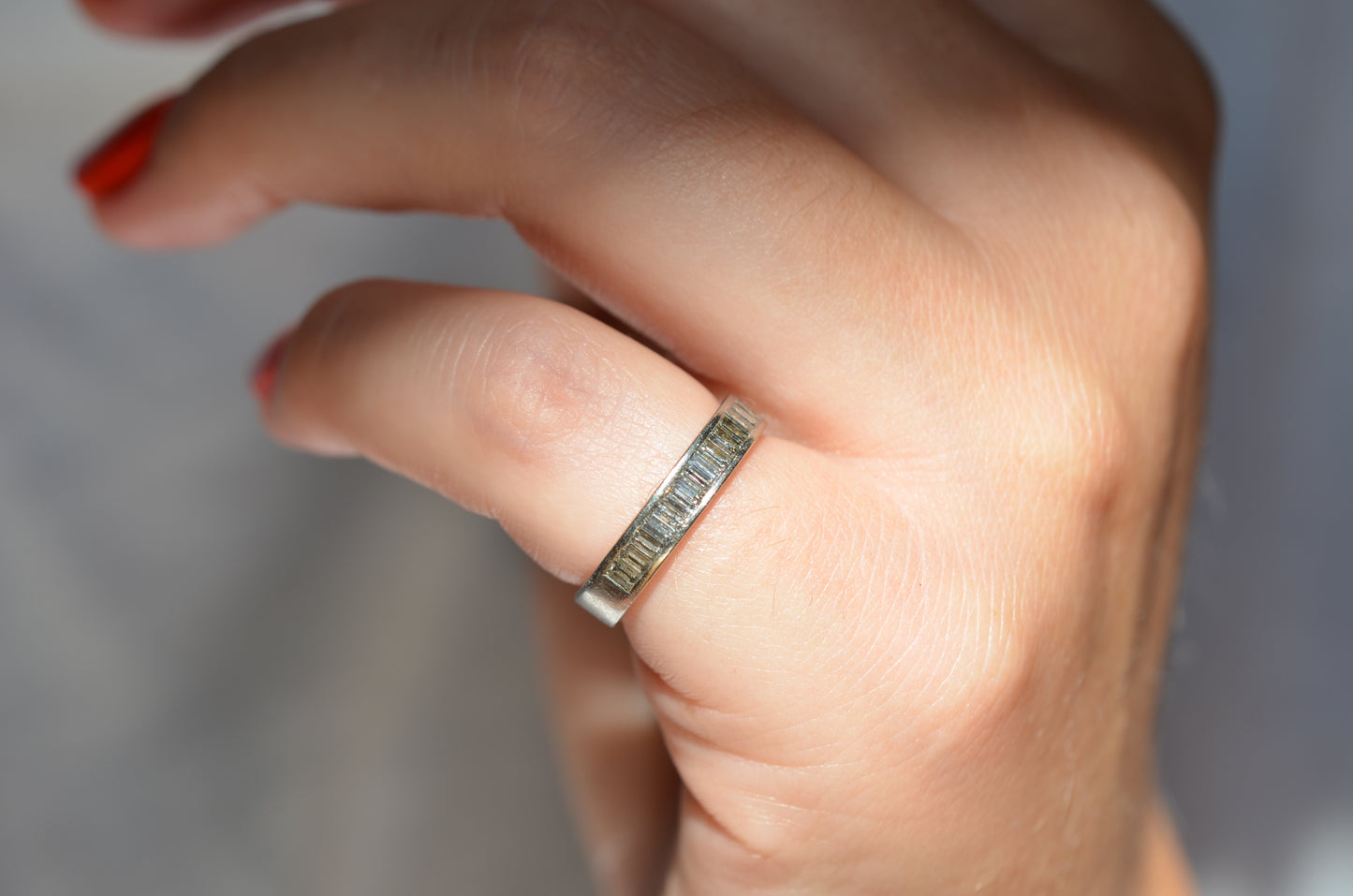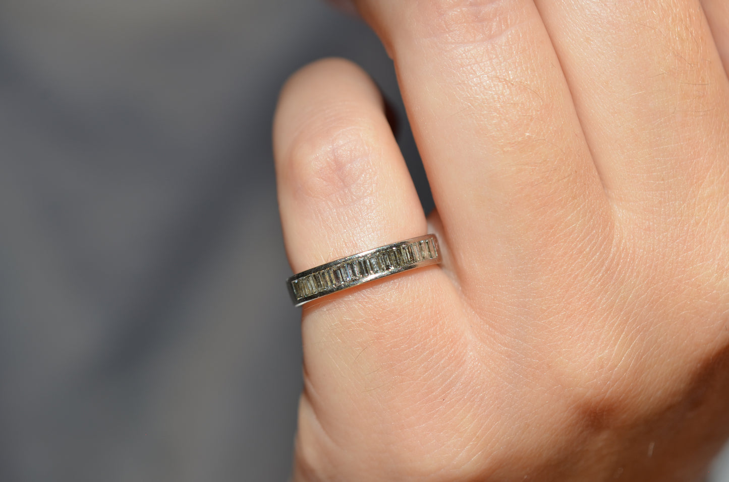 This ring is an icy dream: broken-in platinum, leggy baguette diamonds, and slim lines for easy stacking make it a breeze to add to your jewelry wardrobe, while the elegance of the mirror-like step cut diamonds make a statement all on their own.