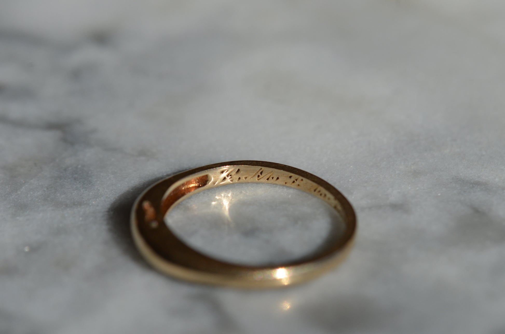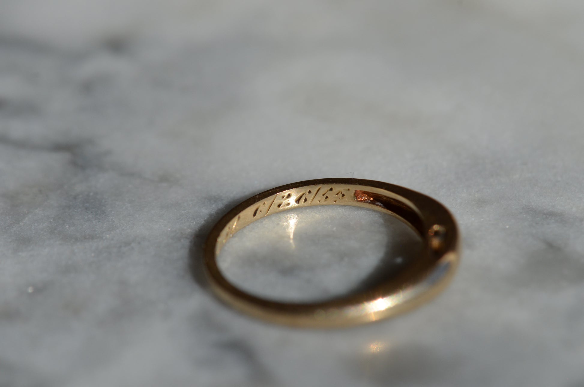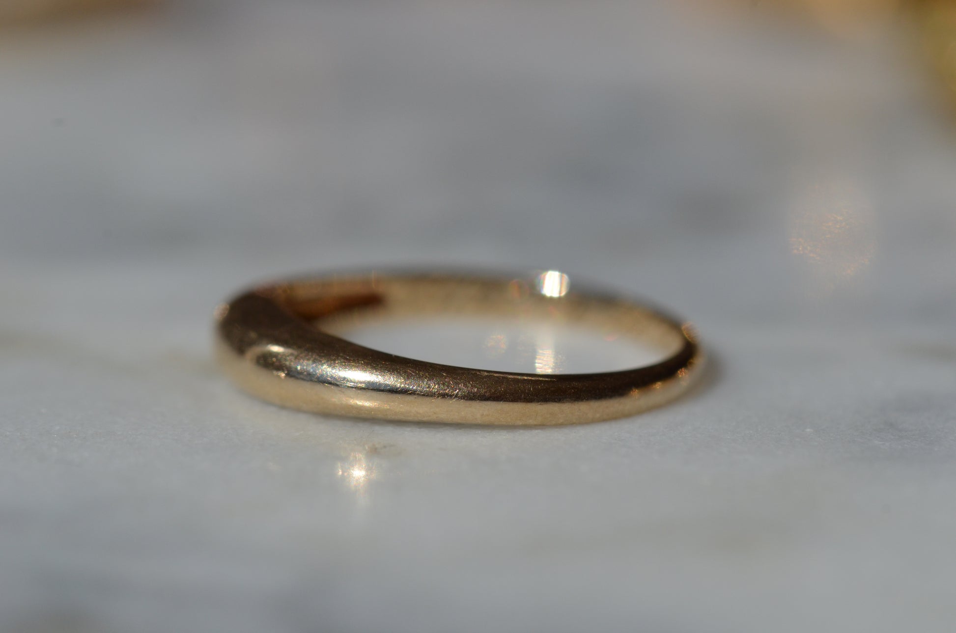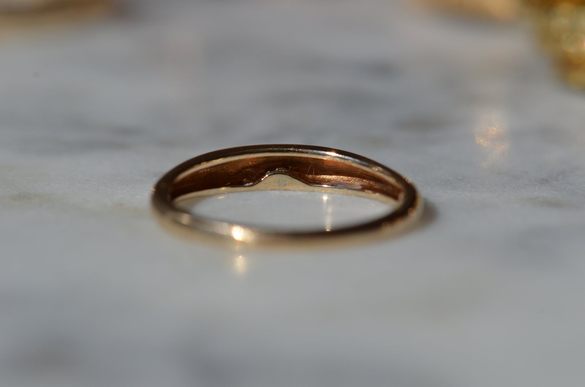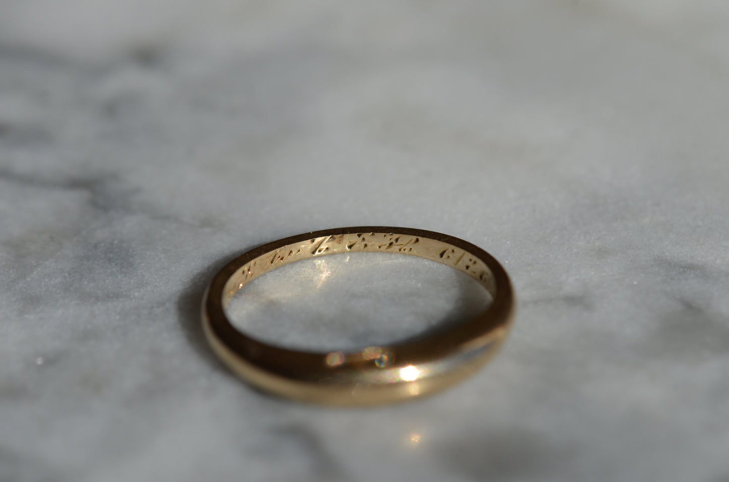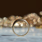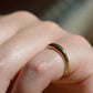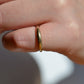 A darling and unique little band, this ring was crafted as a wedding band with a small mechanical latch that hooked into the gallery of the engagement ring in order to keep them affixed together. The smooth dome of the ring creates volume despite the slim lines, and we love the way this ring looks alone or stacked (and with another ring against it, the leftover piece of latch, while not functional, becomes invisible). Inside is a little engraving from the couple in love, a quiet secret against your skin.